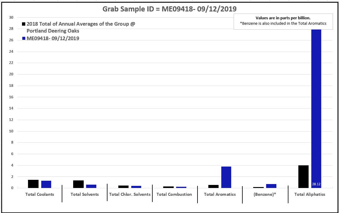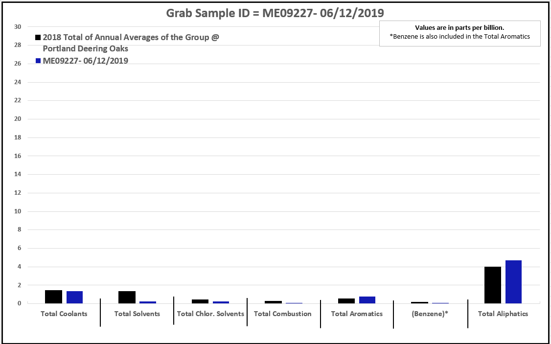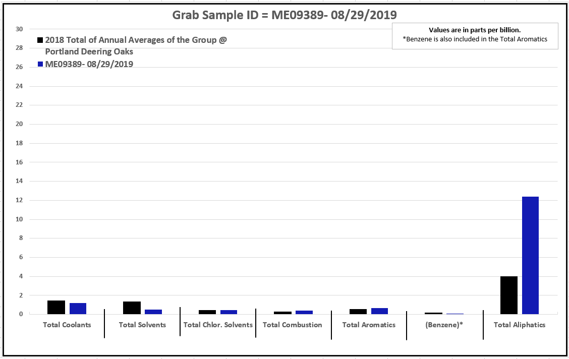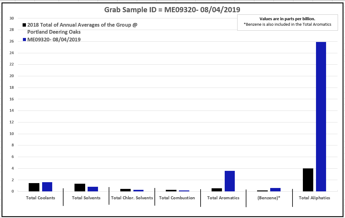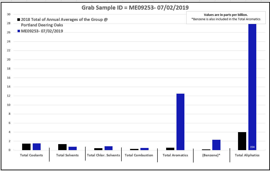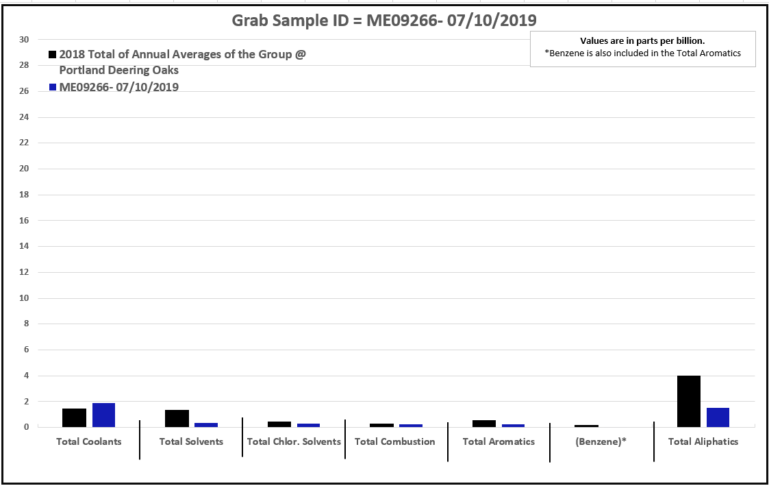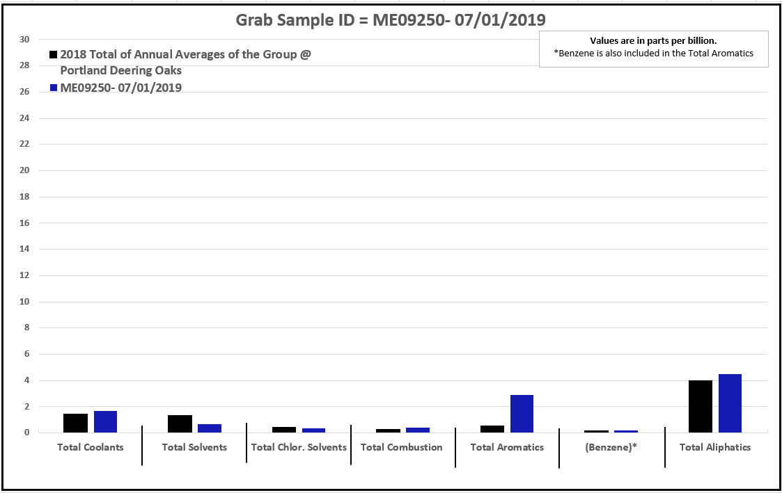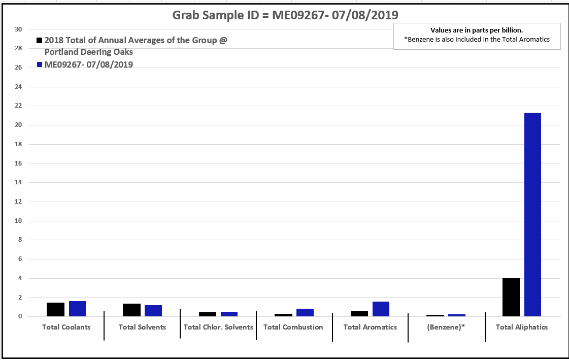 CAUTION to grab sampling data users: It is not appropriate to use grab sample data for any comparison to longer term average (e.g. annual) levels, guidelines or standards for health assessment purposes. Staff from the Maine Center for Disease Control (CDC) gave a presentation (PDF) to the South Portland City Council on November 26, 2019 that describes and illustrates their approach to interpreting this data from a health perspective. The grab sample data charts we’ve created here are intended to simply be a visualization of each sample’s results from an air quality perspective, comparing them to the 2018 annual averages from our Portland Deering Oaks site, which for this purpose are being used as reference or background concentrations for the area.