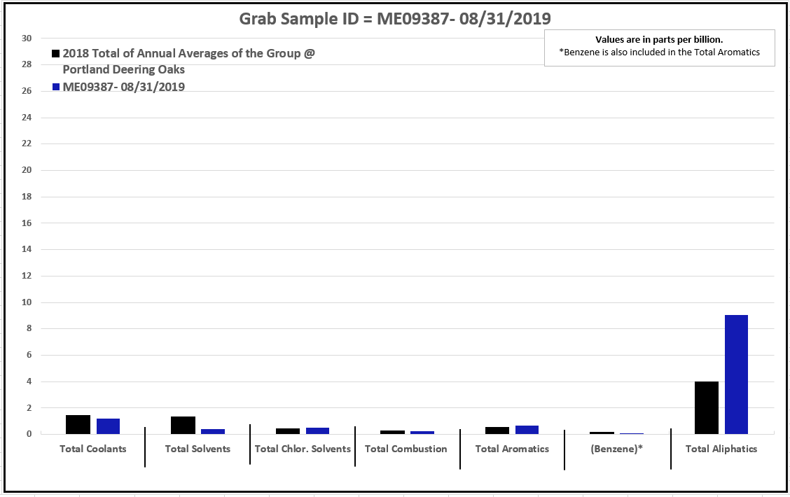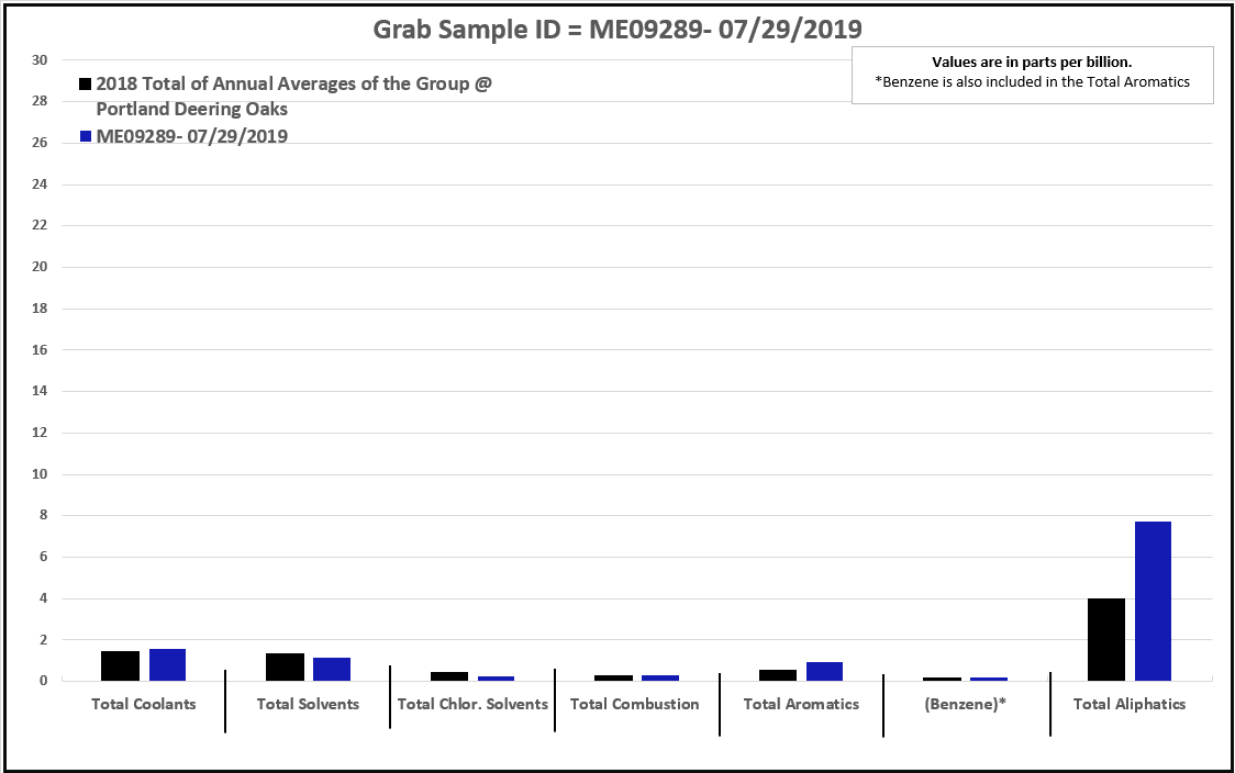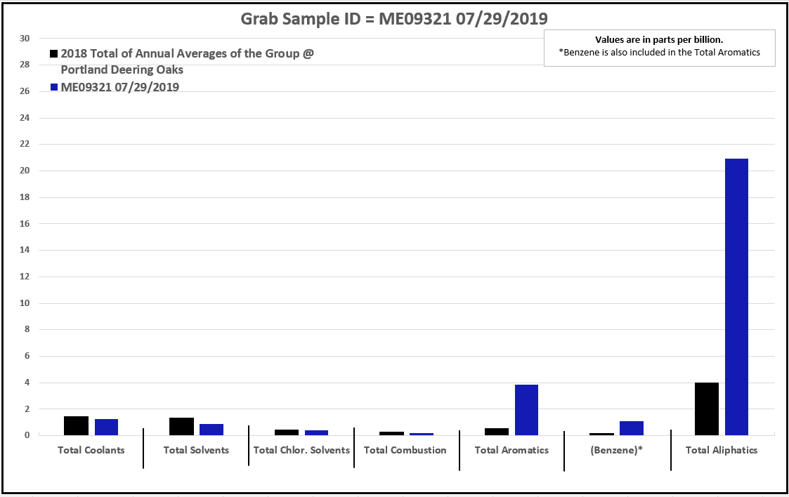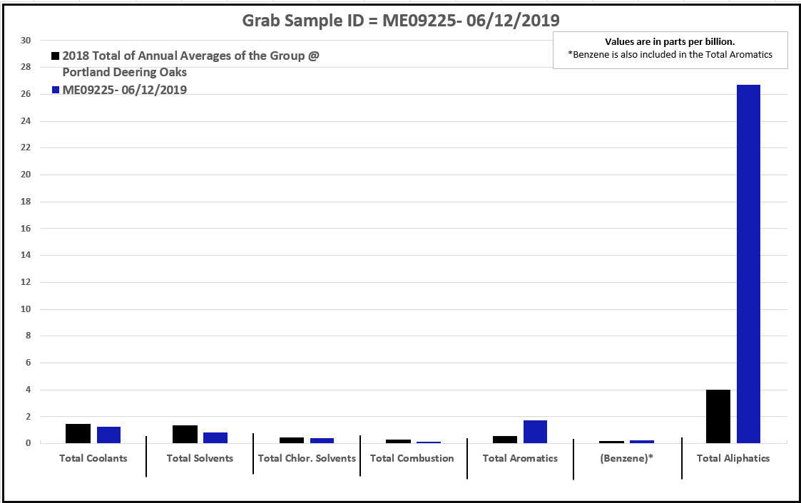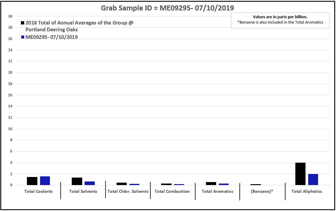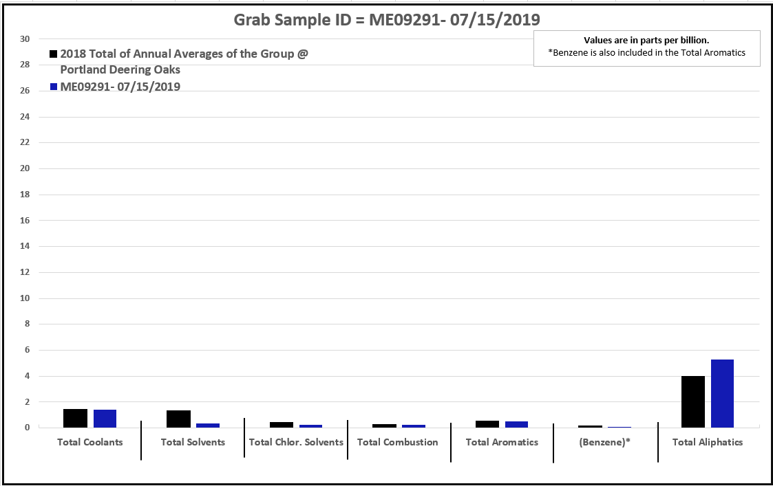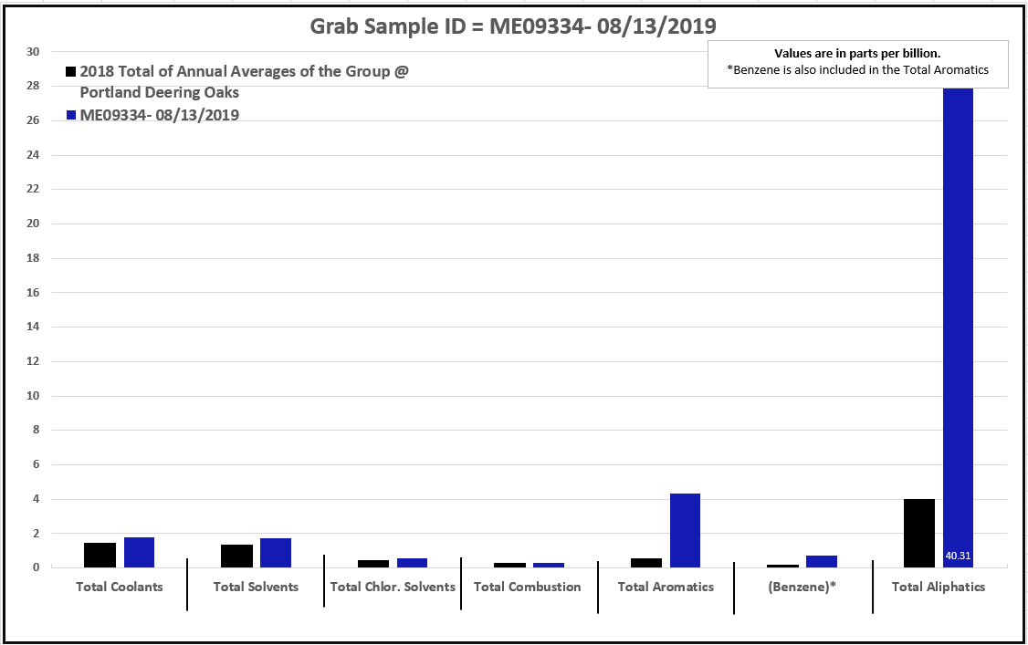 CAUTION to grab sampling data users: It is not appropriate to use grab sample data for any comparison to longer term average (e.g. annual) levels, guidelines or standards for health assessment purposes. Staff from the Maine Center for Disease Control (CDC) gave a presentation (PDF) to the South Portland City Council on November 26, 2019 that describes and illustrates their approach to interpreting this data from a health perspective. The grab sample data charts we’ve created here are intended to simply be a visualization of each sample’s results from an air quality perspective, comparing them to the 2018 annual averages from our Portland Deering Oaks site, which for this purpose are being used as reference or background concentrations for the area.