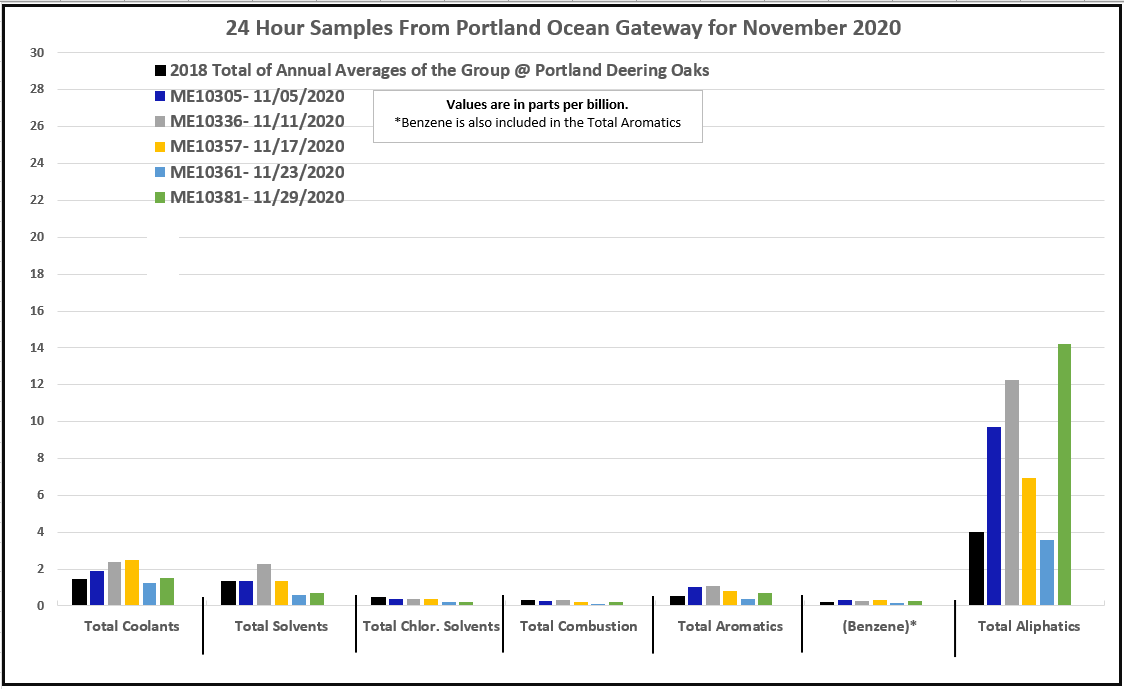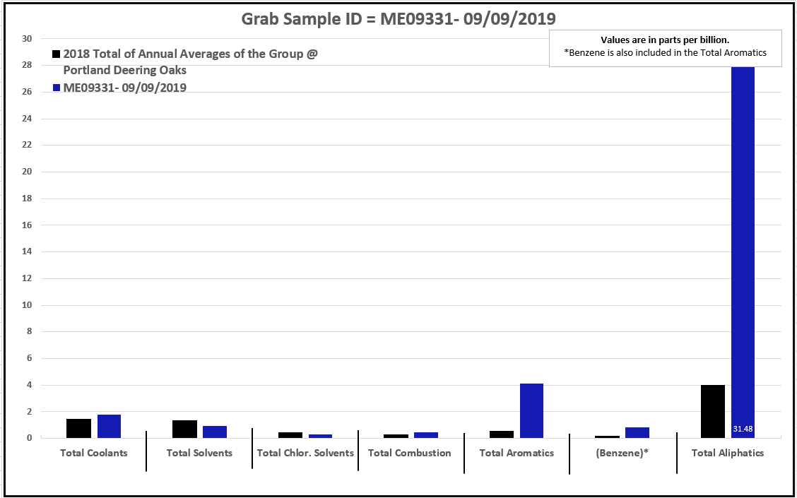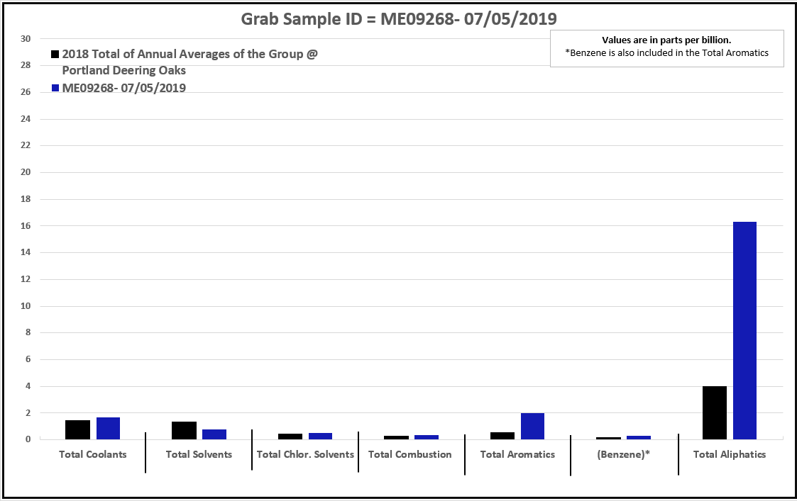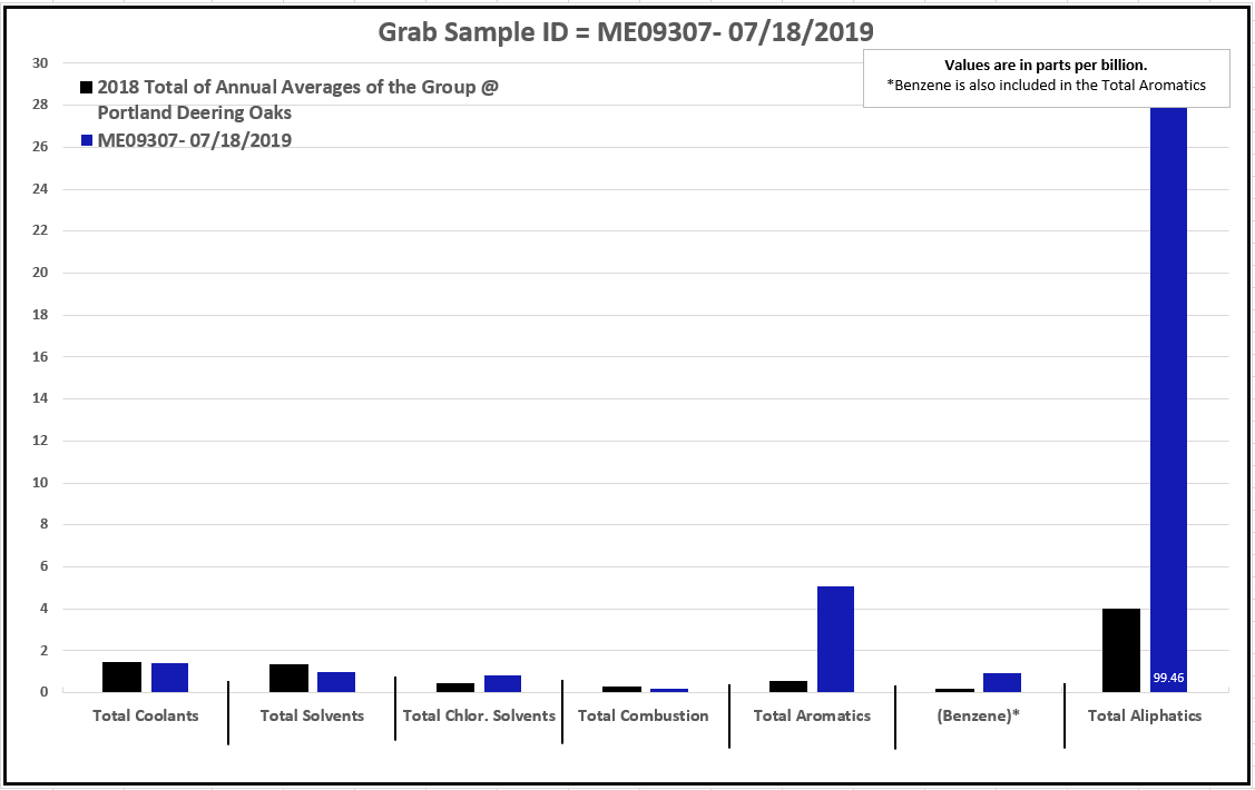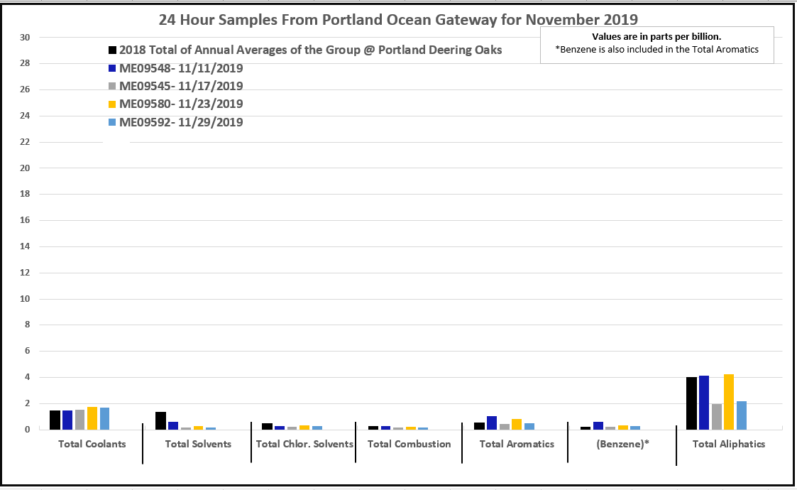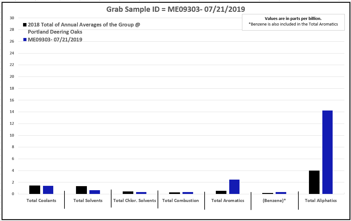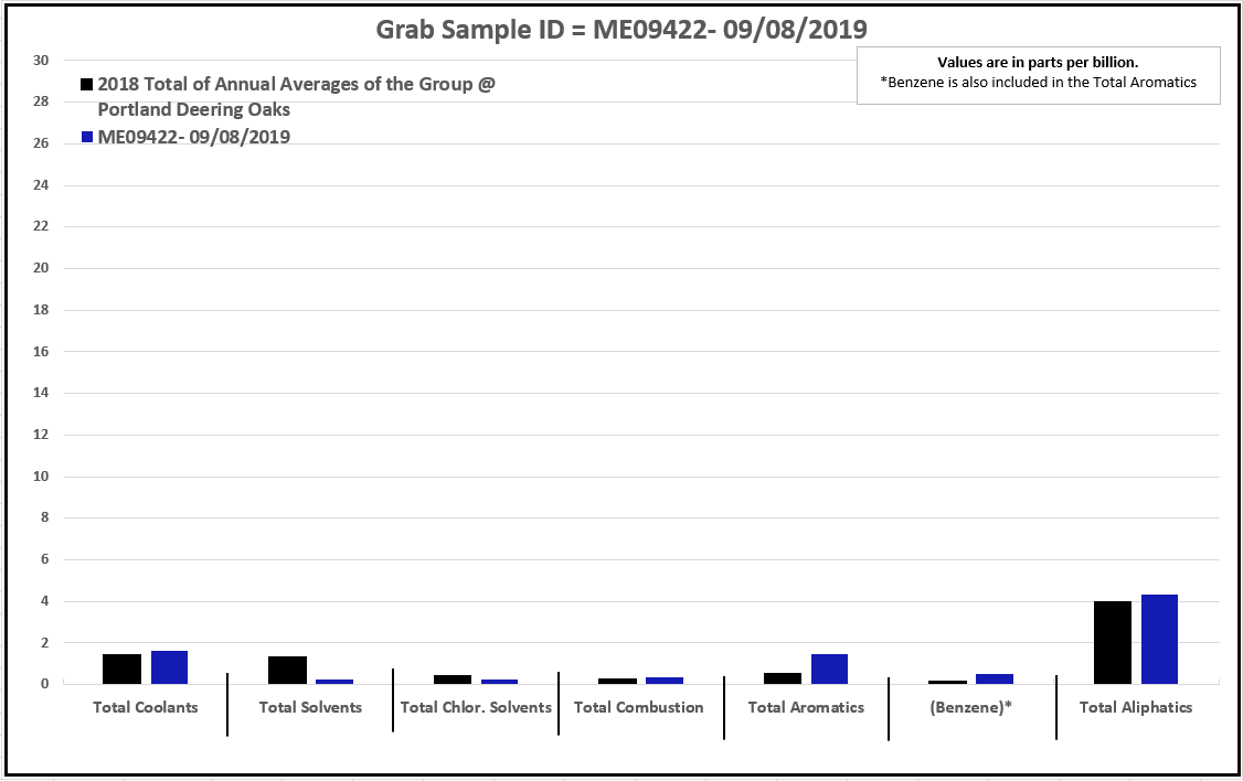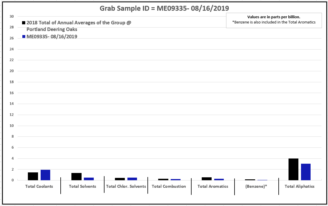 CAUTION to grab sampling data users: It is not appropriate to use grab sample data for any comparison to longer term average (e.g. annual) levels, guidelines or standards for health assessment purposes. Staff from the Maine Center for Disease Control (CDC) gave a presentation (PDF) to the South Portland City Council on November 26, 2019 that describes and illustrates their approach to interpreting this data from a health perspective. The grab sample data charts we’ve created here are intended to simply be a visualization of each sample’s results from an air quality perspective, comparing them to the 2018 annual averages from our Portland Deering Oaks site, which for this purpose are being used as reference or background concentrations for the area.