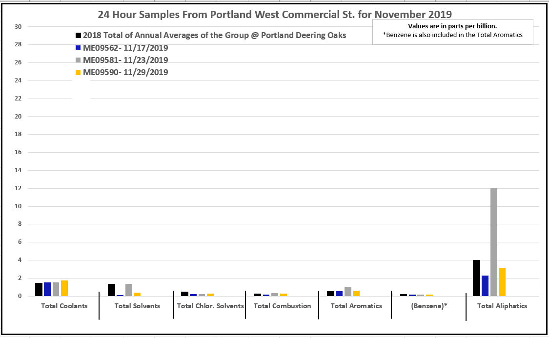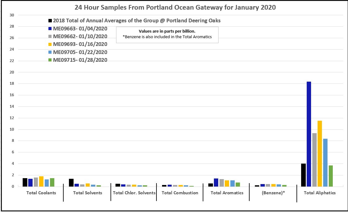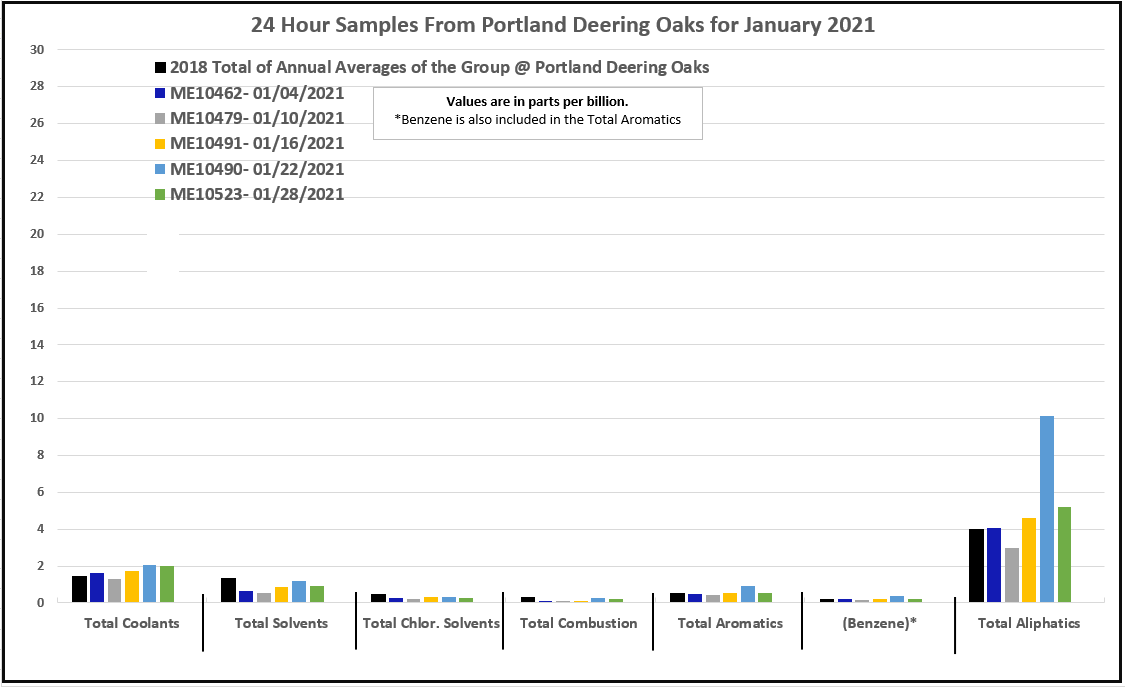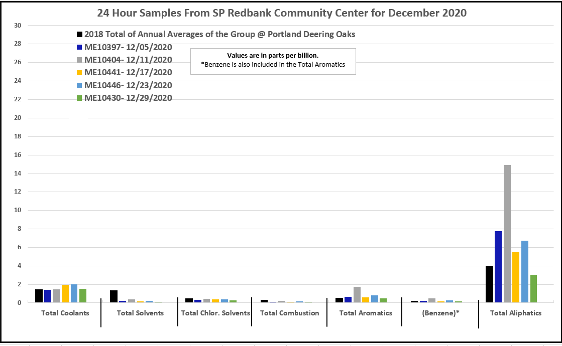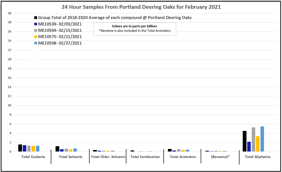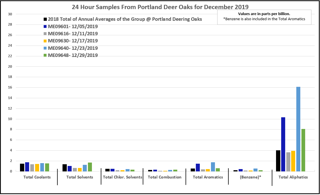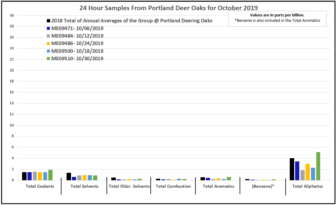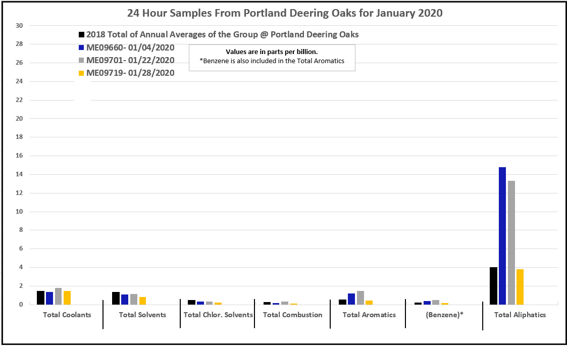 CAUTION to grab sampling data users: It is not appropriate to use grab sample data for any comparison to longer term average (e.g. annual) levels, guidelines or standards for health assessment purposes. Staff from the Maine Center for Disease Control (CDC) gave a presentation (PDF) to the South Portland City Council on November 26, 2019 that describes and illustrates their approach to interpreting this data from a health perspective. The grab sample data charts we’ve created here are intended to simply be a visualization of each sample’s results from an air quality perspective, comparing them to the 2018 annual averages from our Portland Deering Oaks site, which for this purpose are being used as reference or background concentrations for the area.