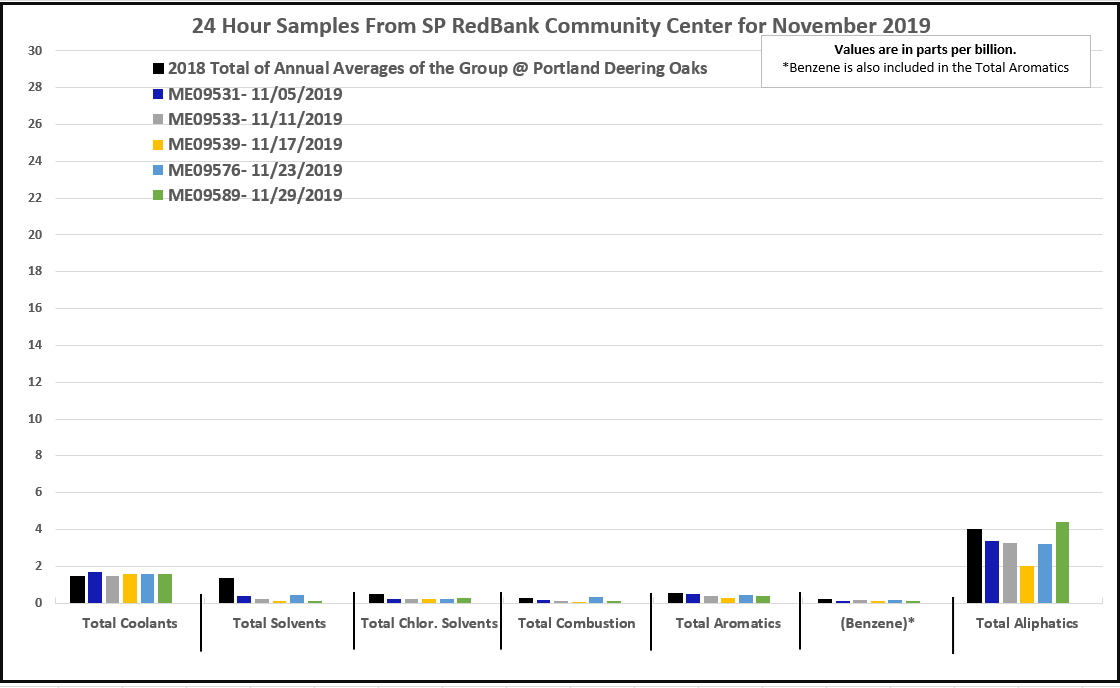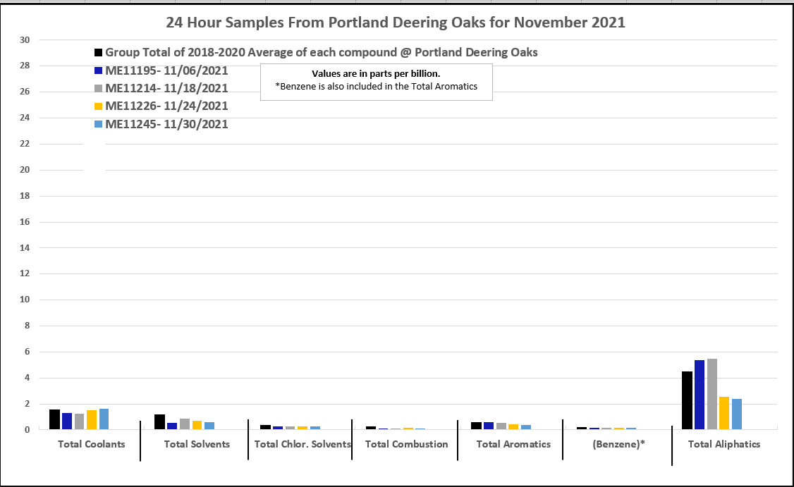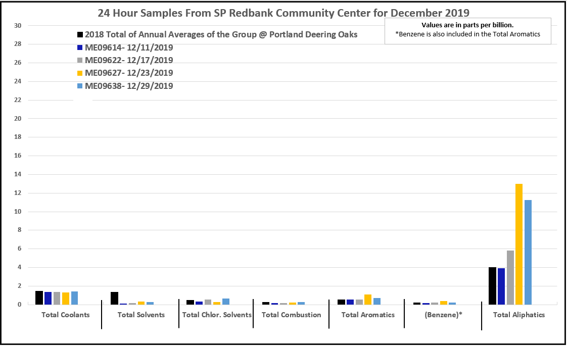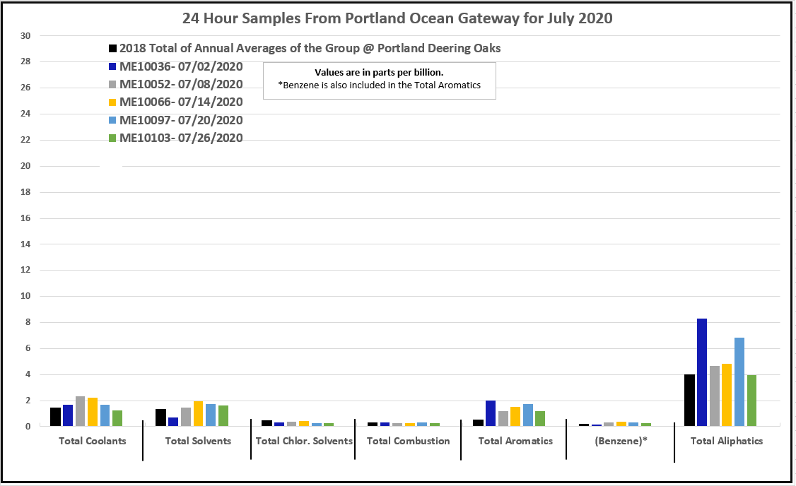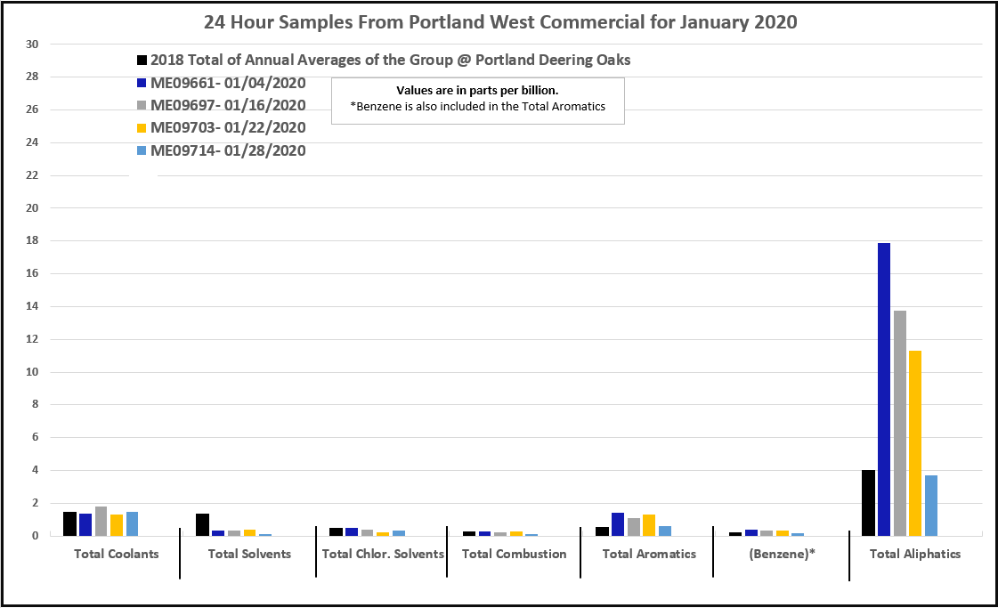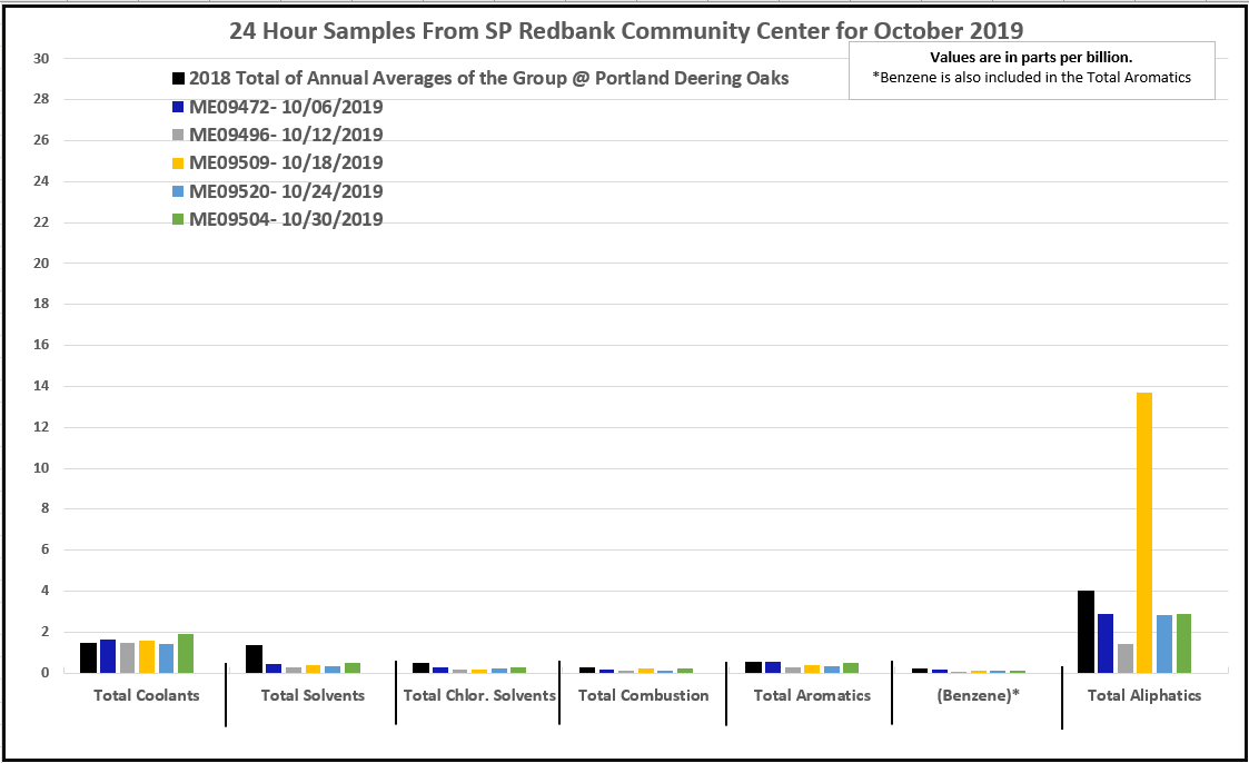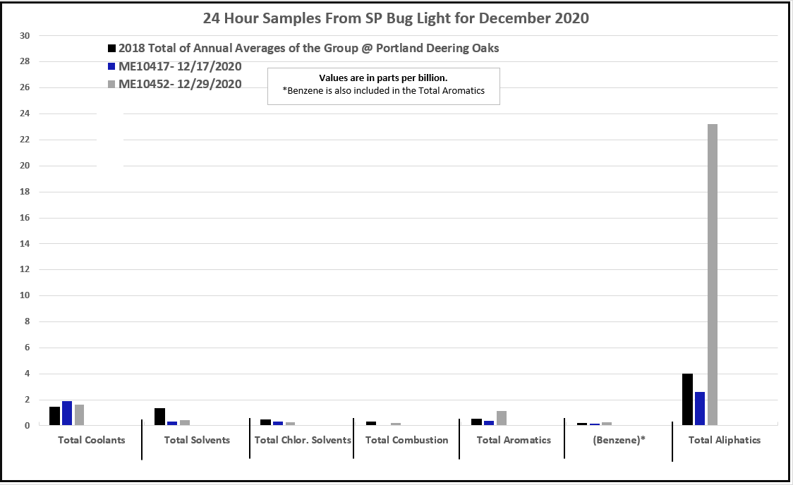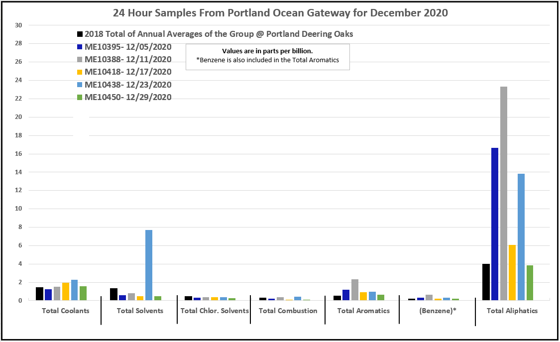 CAUTION to grab sampling data users: It is not appropriate to use grab sample data for any comparison to longer term average (e.g. annual) levels, guidelines or standards for health assessment purposes. Staff from the Maine Center for Disease Control (CDC) gave a presentation (PDF) to the South Portland City Council on November 26, 2019 that describes and illustrates their approach to interpreting this data from a health perspective. The grab sample data charts we’ve created here are intended to simply be a visualization of each sample’s results from an air quality perspective, comparing them to the 2018 annual averages from our Portland Deering Oaks site, which for this purpose are being used as reference or background concentrations for the area.
