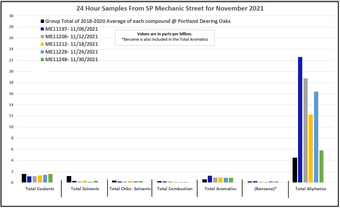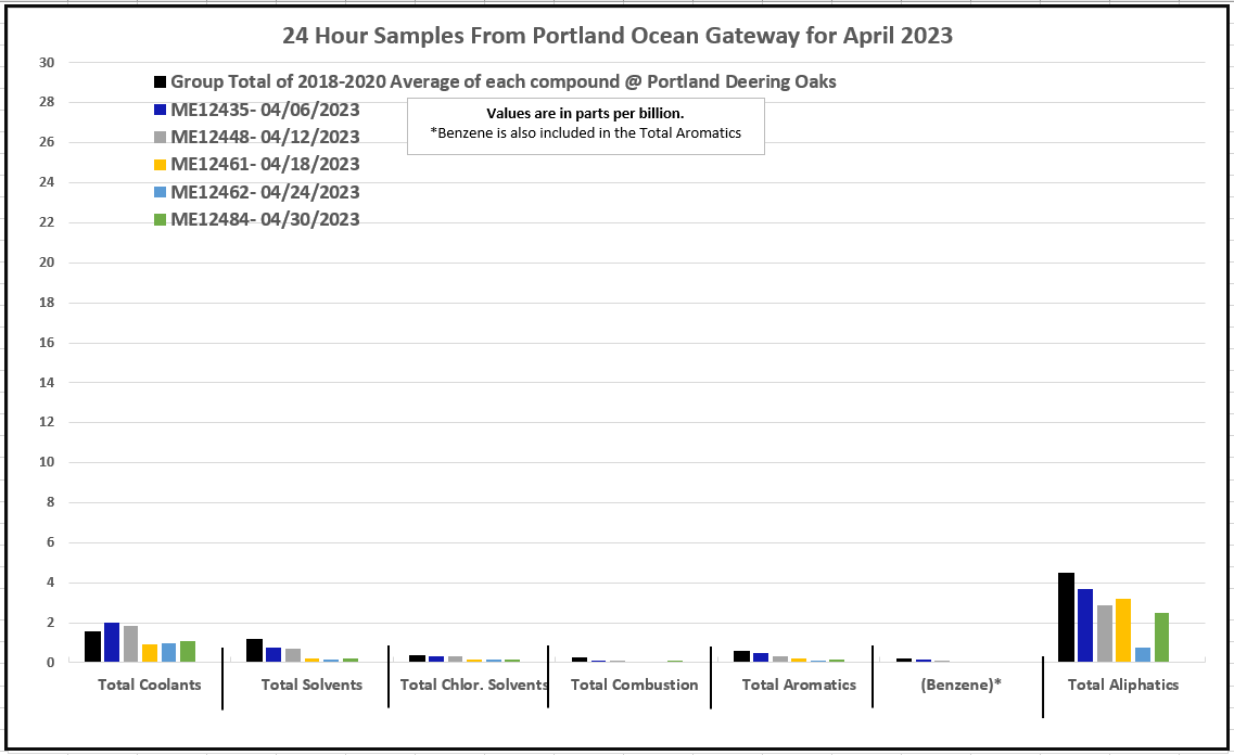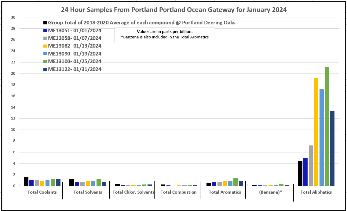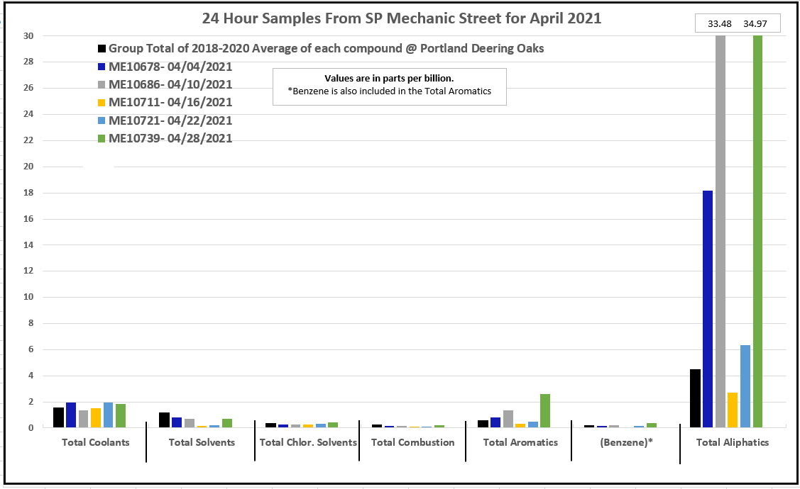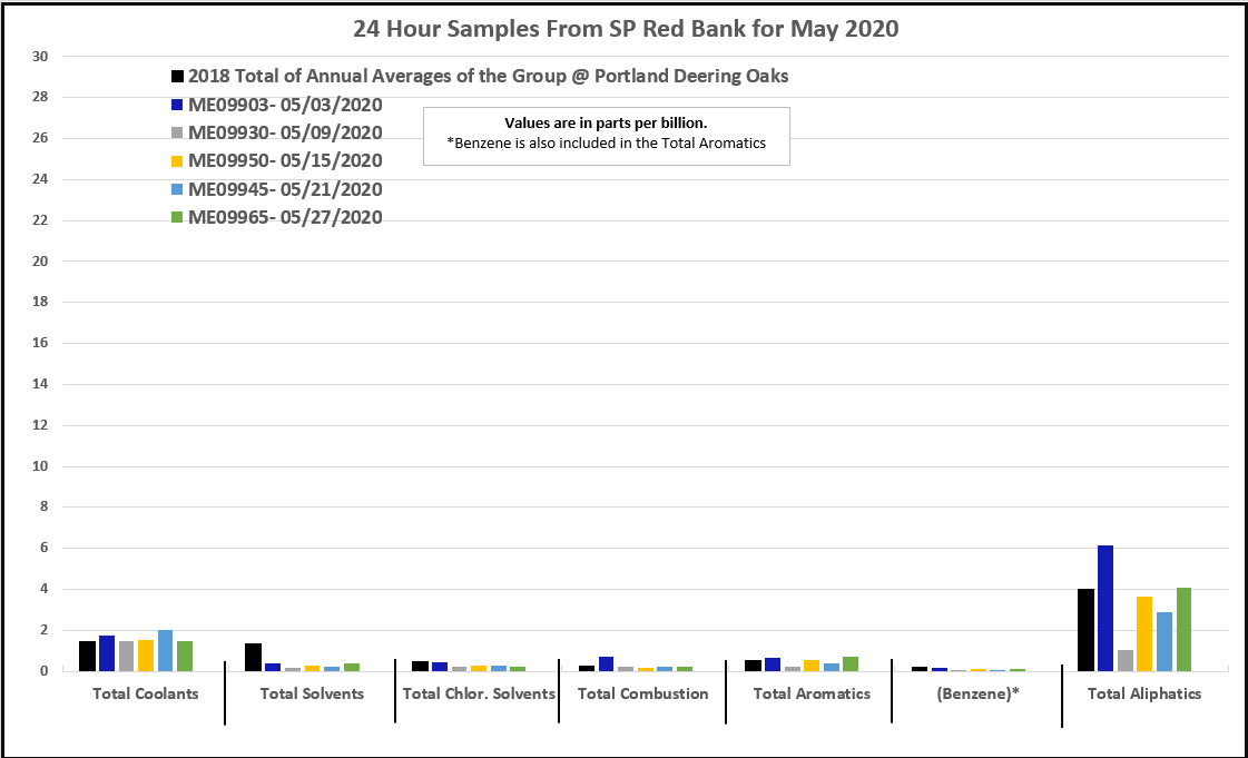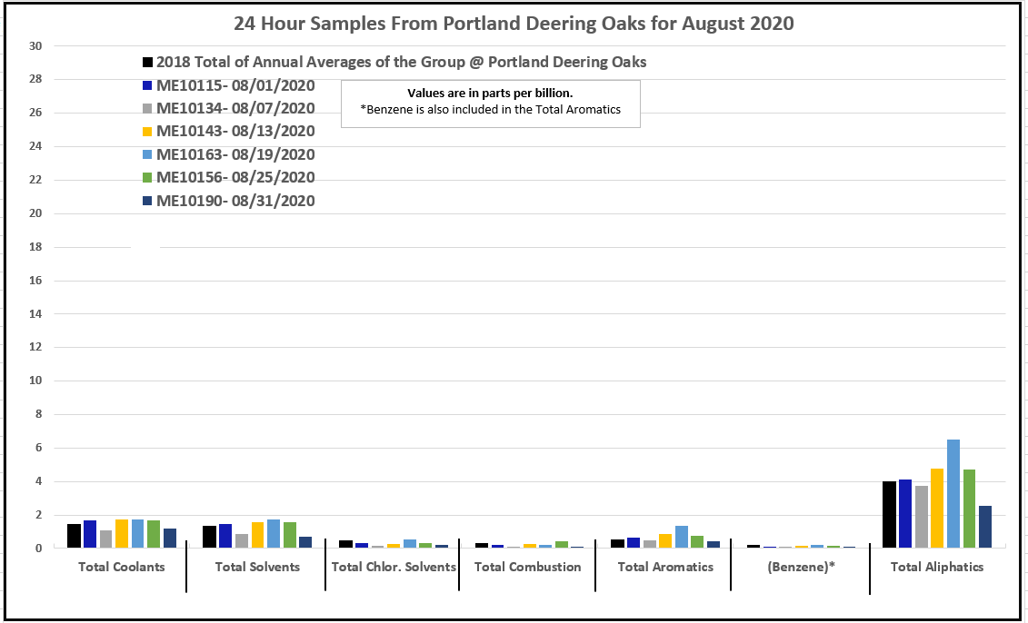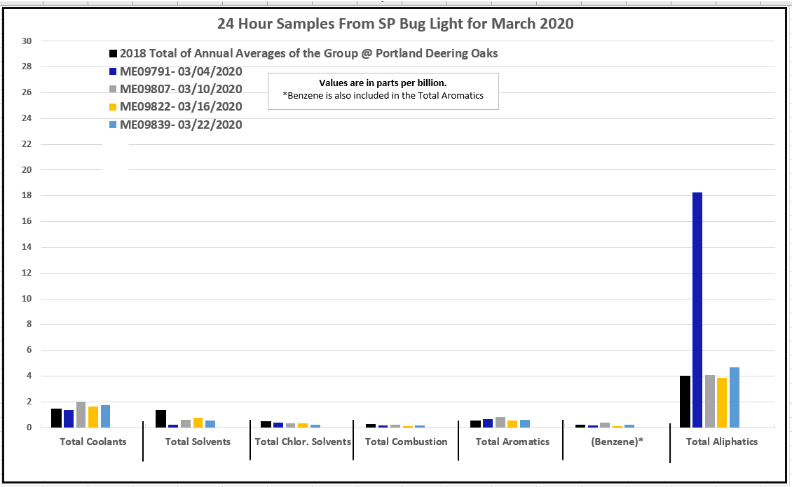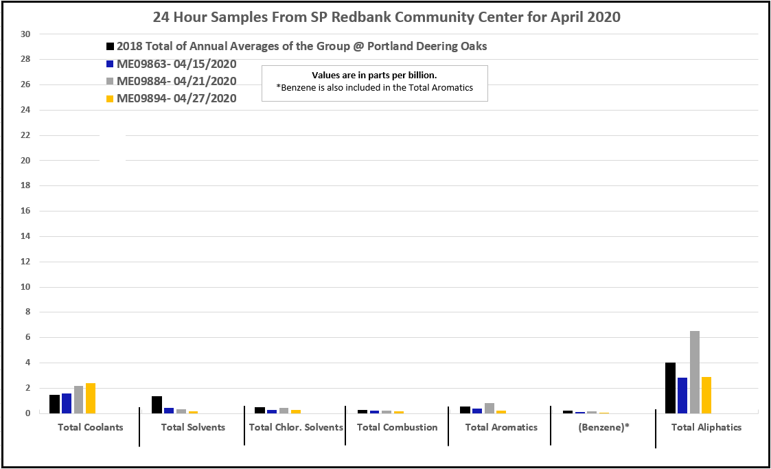 CAUTION to grab sampling data users: It is not appropriate to use grab sample data for any comparison to longer term average (e.g. annual) levels, guidelines or standards for health assessment purposes. Staff from the Maine Center for Disease Control (CDC) gave a presentation (PDF) to the South Portland City Council on November 26, 2019 that describes and illustrates their approach to interpreting this data from a health perspective. The grab sample data charts we’ve created here are intended to simply be a visualization of each sample’s results from an air quality perspective, comparing them to the 2018 annual averages from our Portland Deering Oaks site, which for this purpose are being used as reference or background concentrations for the area.
