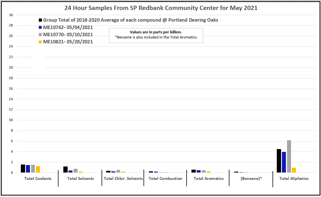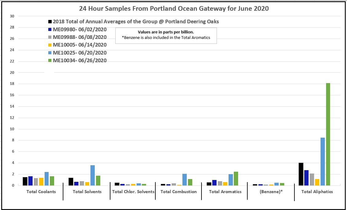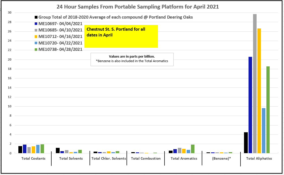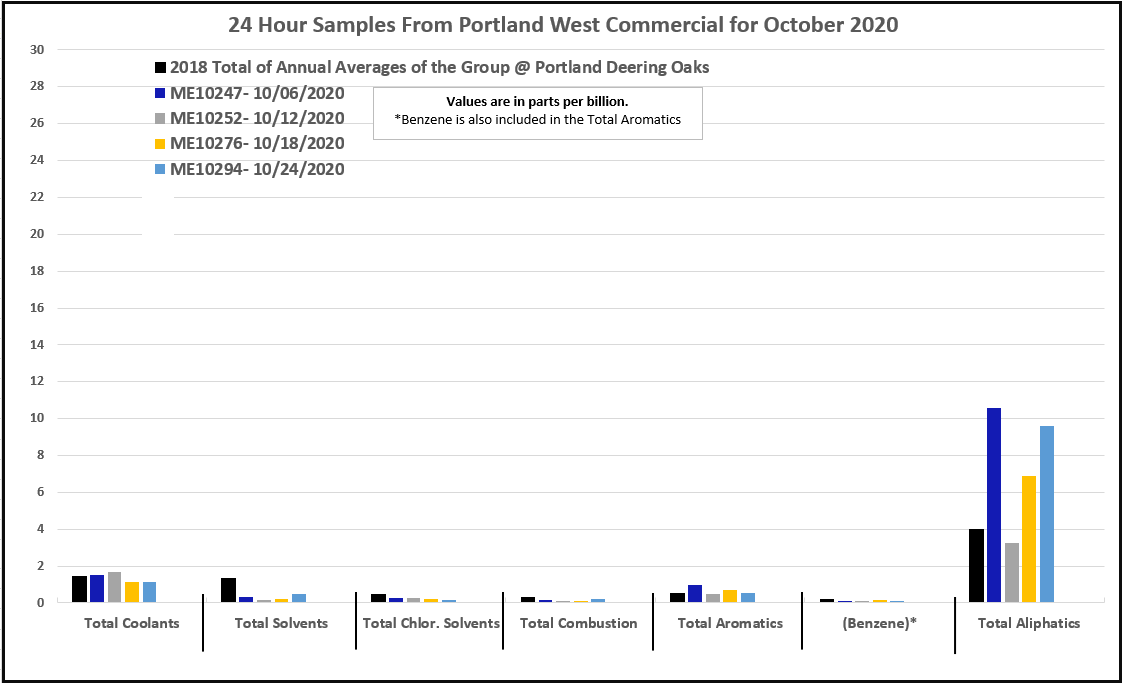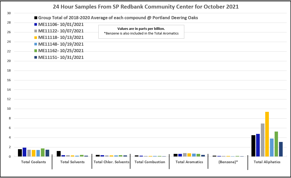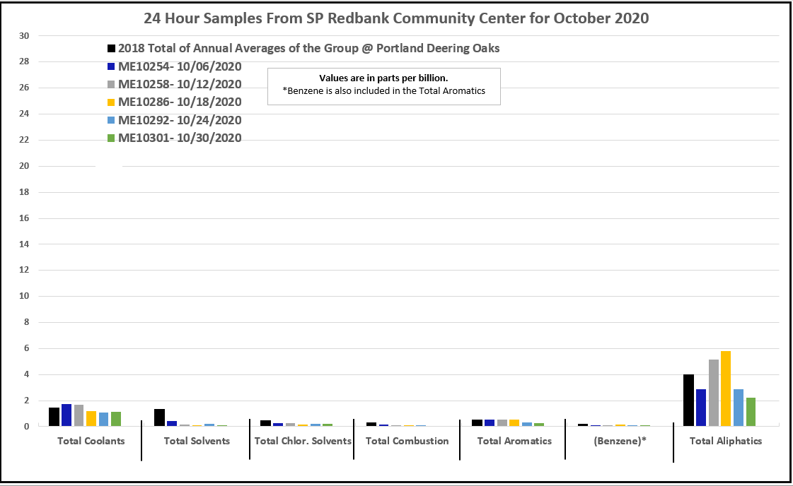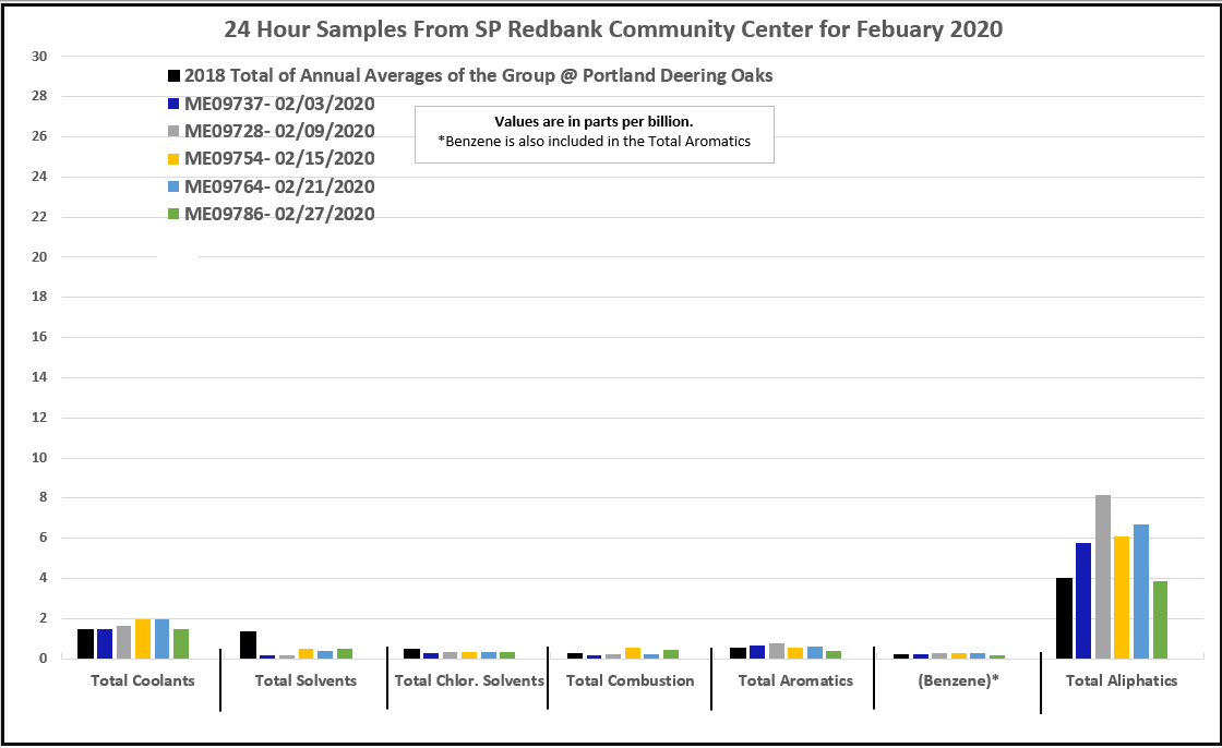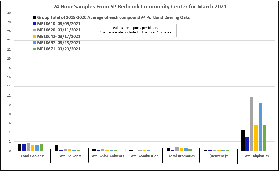 CAUTION to grab sampling data users: It is not appropriate to use grab sample data for any comparison to longer term average (e.g. annual) levels, guidelines or standards for health assessment purposes. Staff from the Maine Center for Disease Control (CDC) gave a presentation (PDF) to the South Portland City Council on November 26, 2019 that describes and illustrates their approach to interpreting this data from a health perspective. The grab sample data charts we’ve created here are intended to simply be a visualization of each sample’s results from an air quality perspective, comparing them to the 2018 annual averages from our Portland Deering Oaks site, which for this purpose are being used as reference or background concentrations for the area.