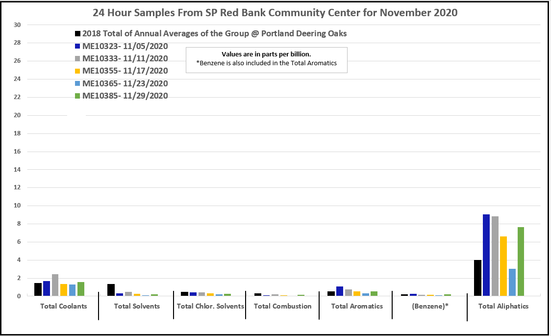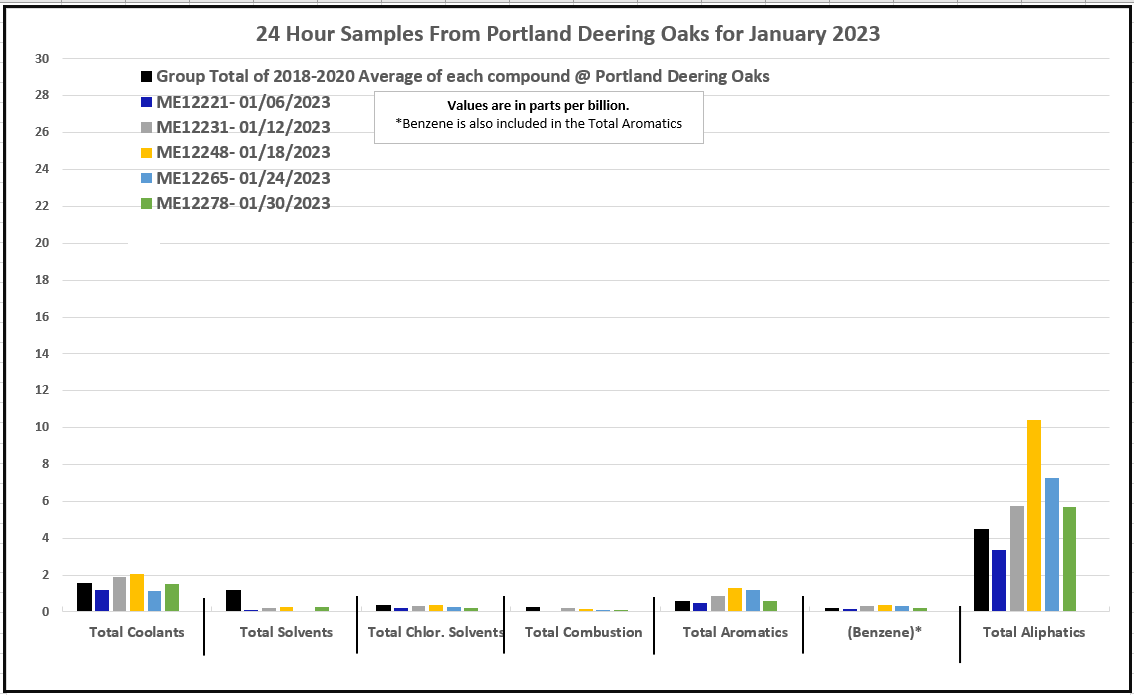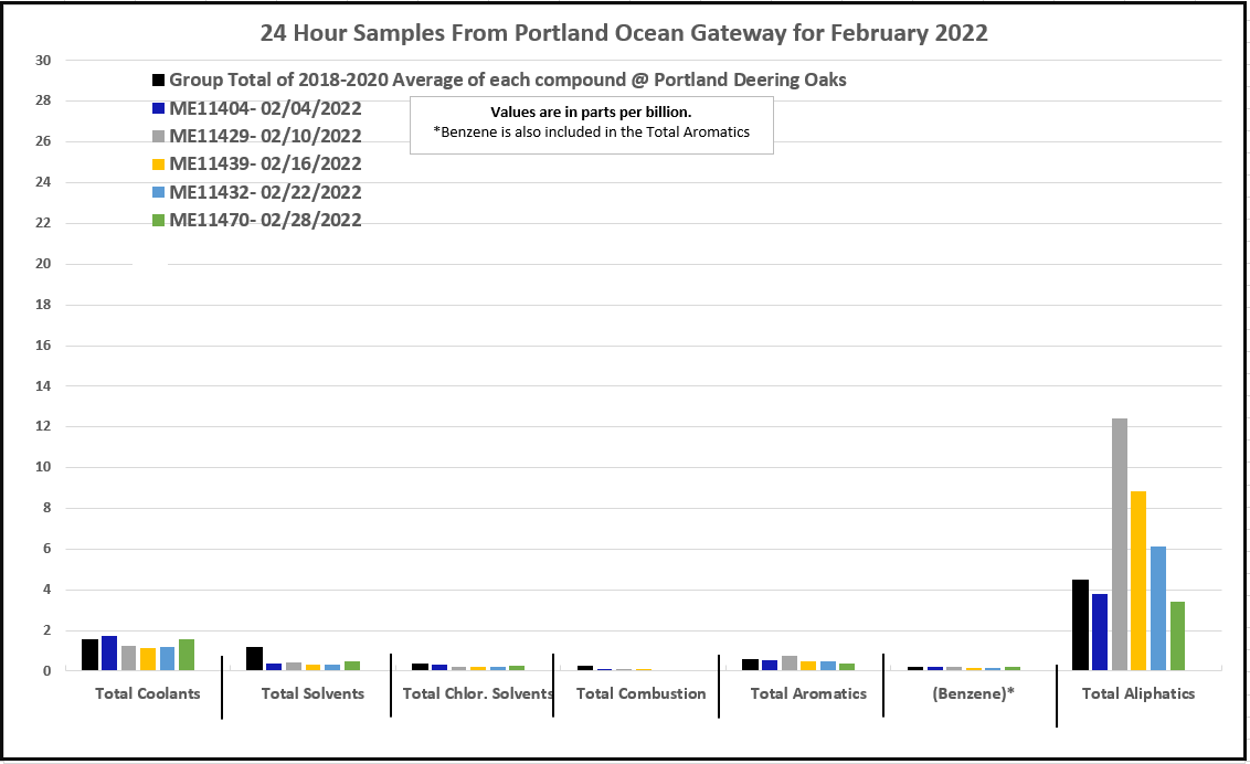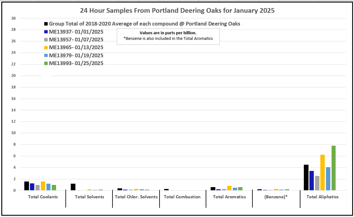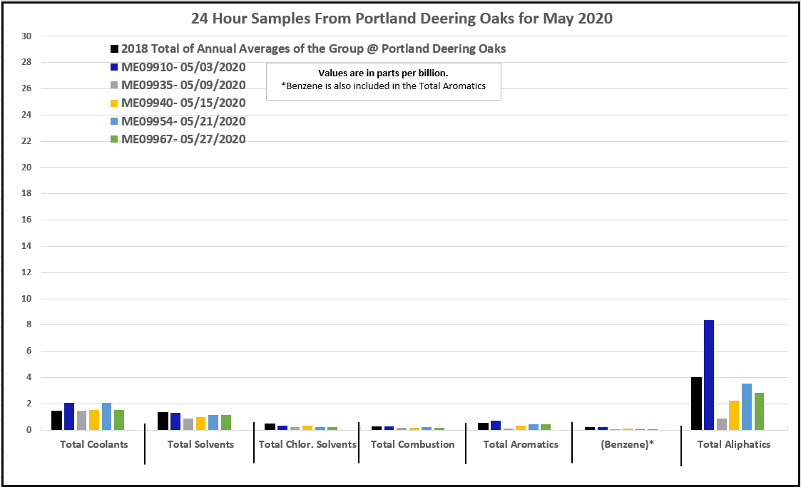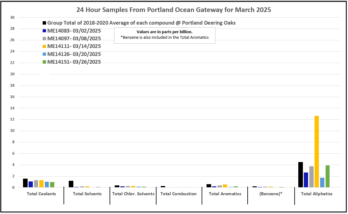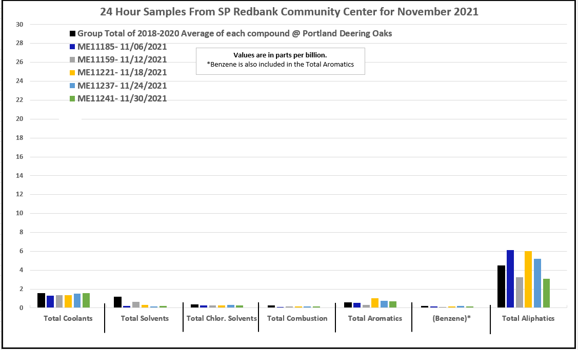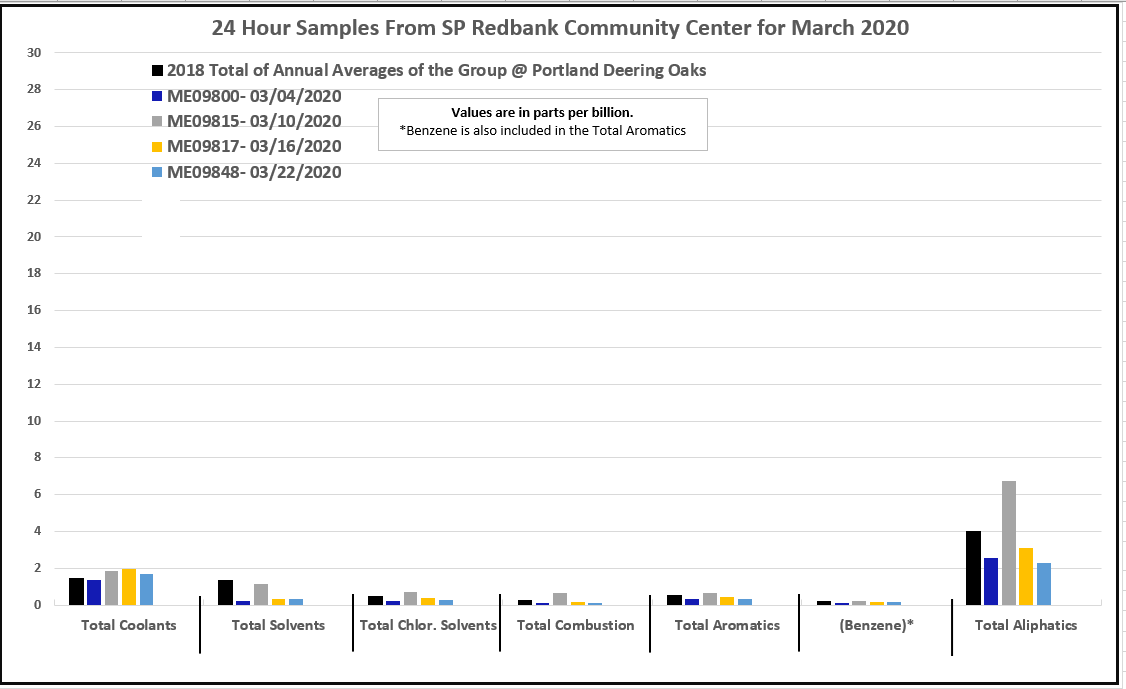 CAUTION to grab sampling data users: It is not appropriate to use grab sample data for any comparison to longer term average (e.g. annual) levels, guidelines or standards for health assessment purposes. Staff from the Maine Center for Disease Control (CDC) gave a presentation (PDF) to the South Portland City Council on November 26, 2019 that describes and illustrates their approach to interpreting this data from a health perspective. The grab sample data charts we’ve created here are intended to simply be a visualization of each sample’s results from an air quality perspective, comparing them to the 2018 annual averages from our Portland Deering Oaks site, which for this purpose are being used as reference or background concentrations for the area.