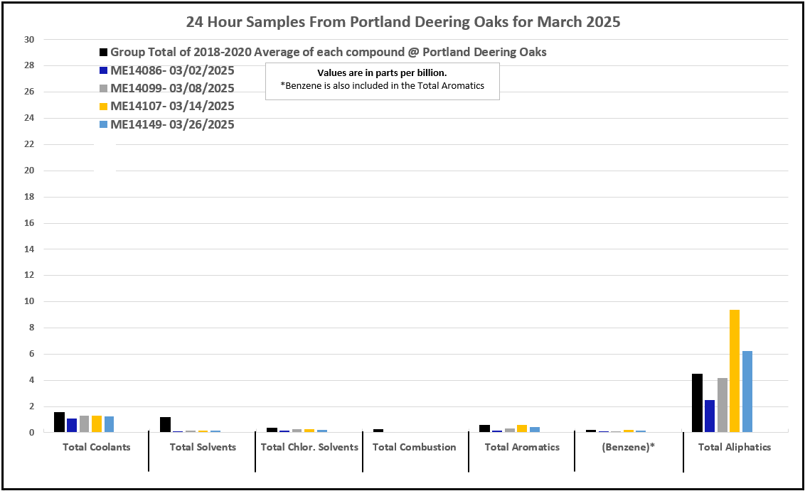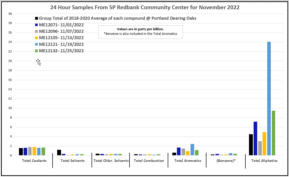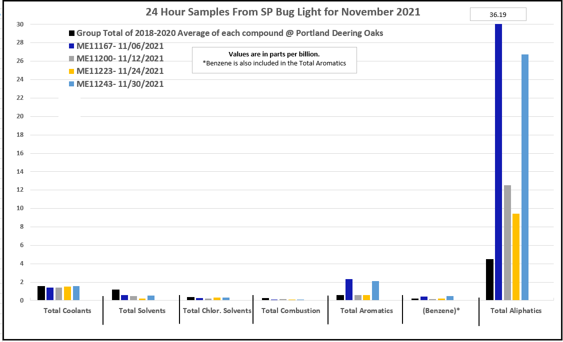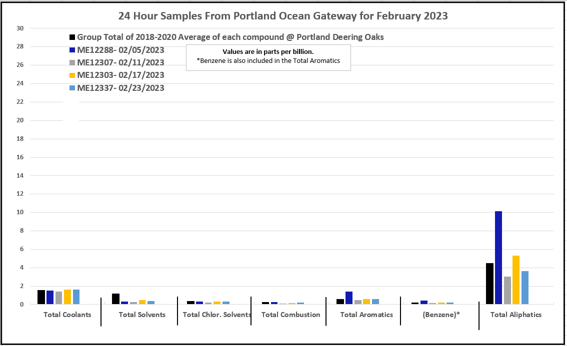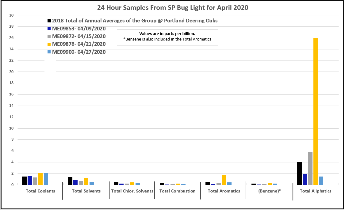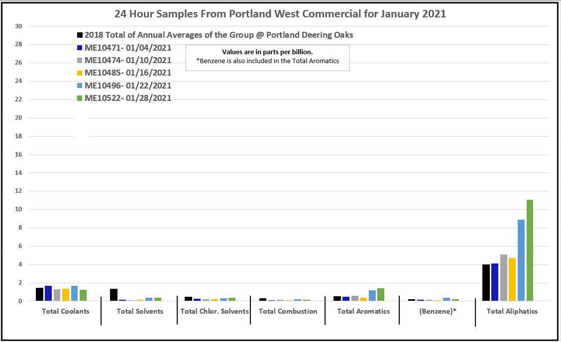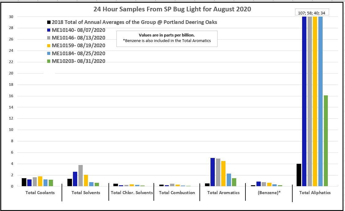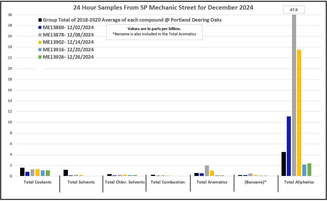 CAUTION to grab sampling data users: It is not appropriate to use grab sample data for any comparison to longer term average (e.g. annual) levels, guidelines or standards for health assessment purposes. Staff from the Maine Center for Disease Control (CDC) gave a presentation (PDF) to the South Portland City Council on November 26, 2019 that describes and illustrates their approach to interpreting this data from a health perspective. The grab sample data charts we’ve created here are intended to simply be a visualization of each sample’s results from an air quality perspective, comparing them to the 2018 annual averages from our Portland Deering Oaks site, which for this purpose are being used as reference or background concentrations for the area.