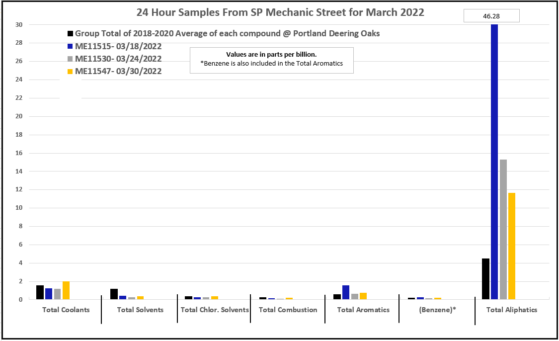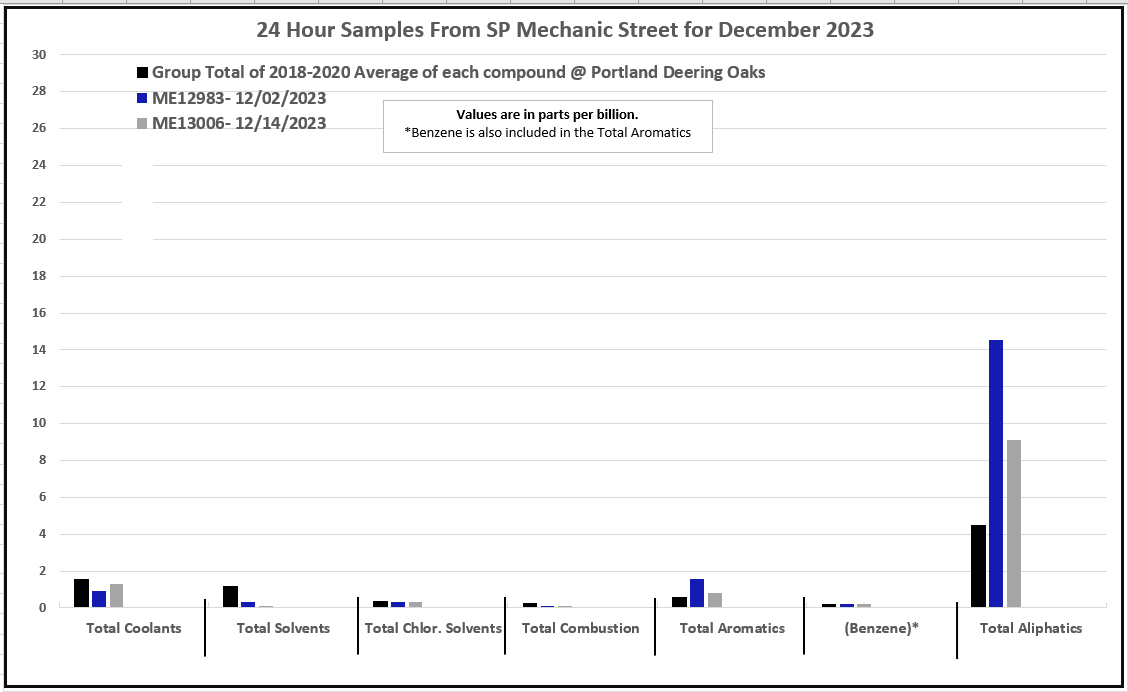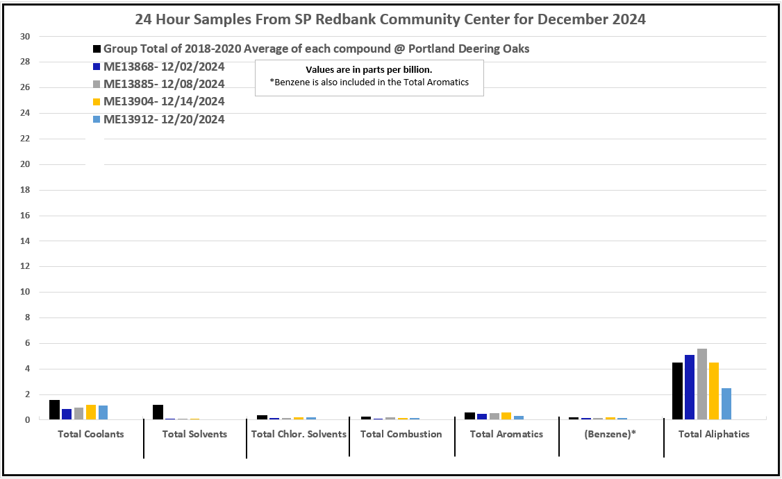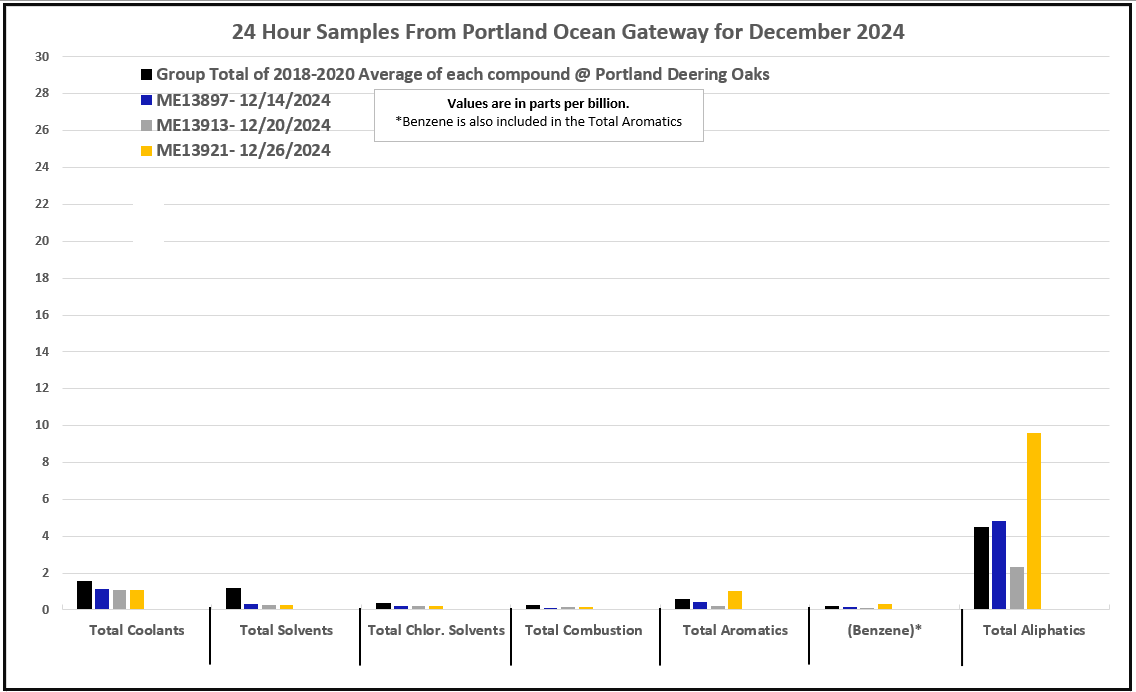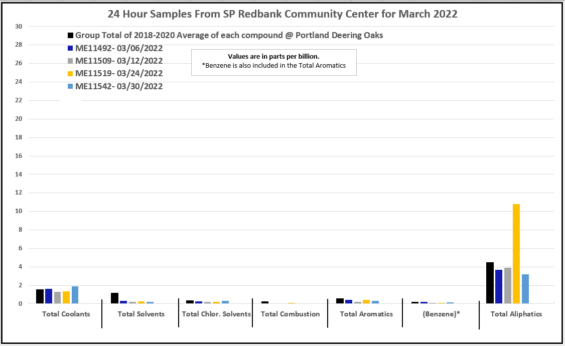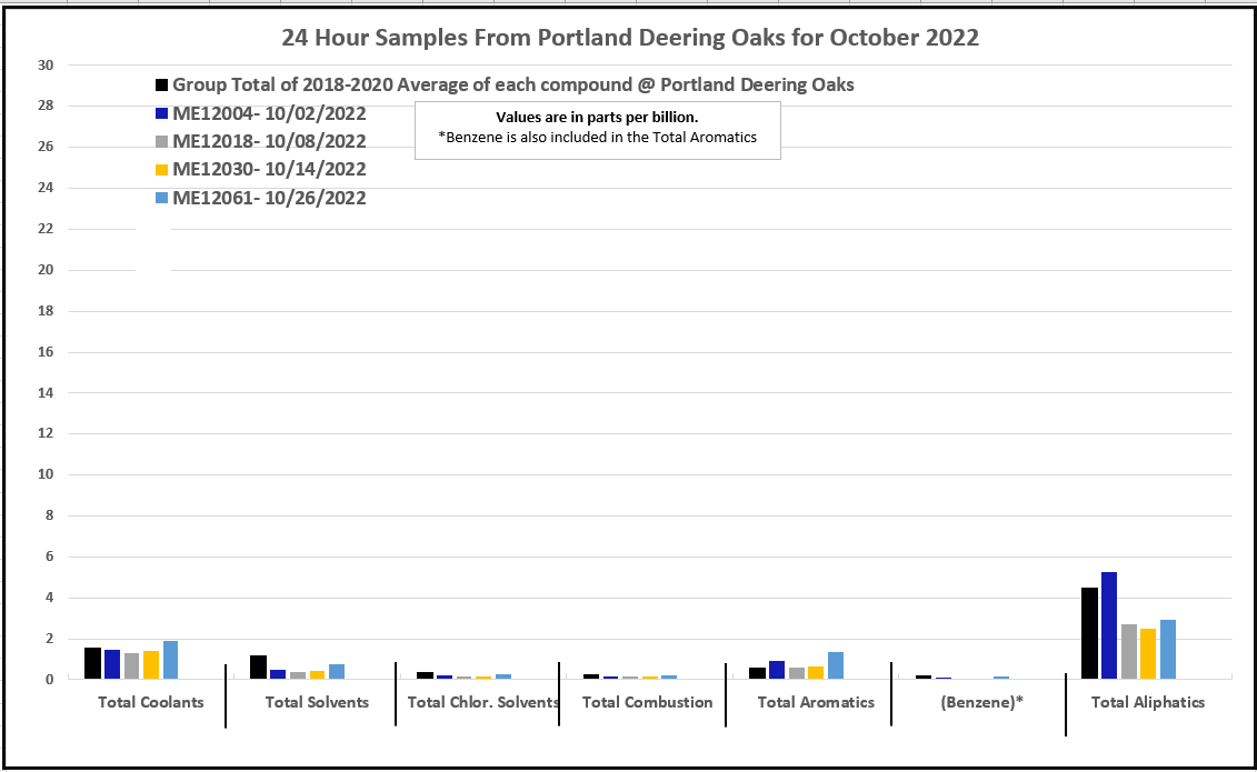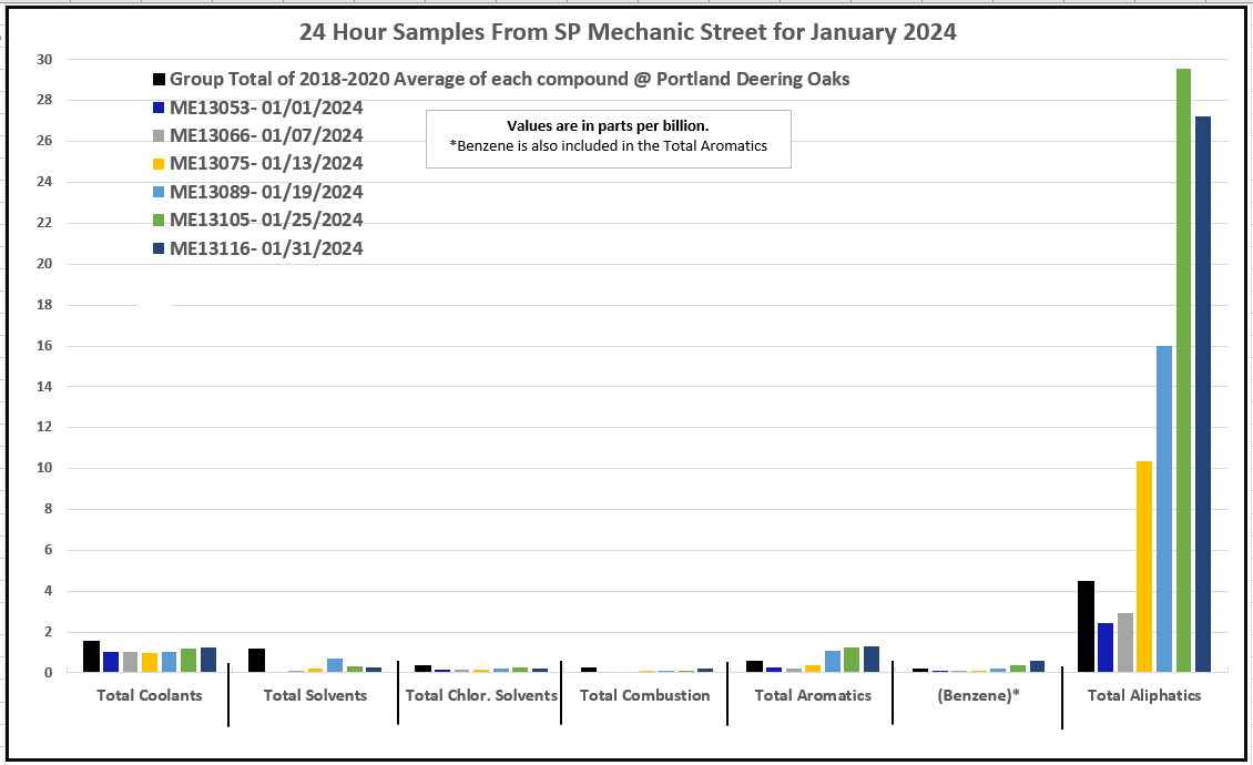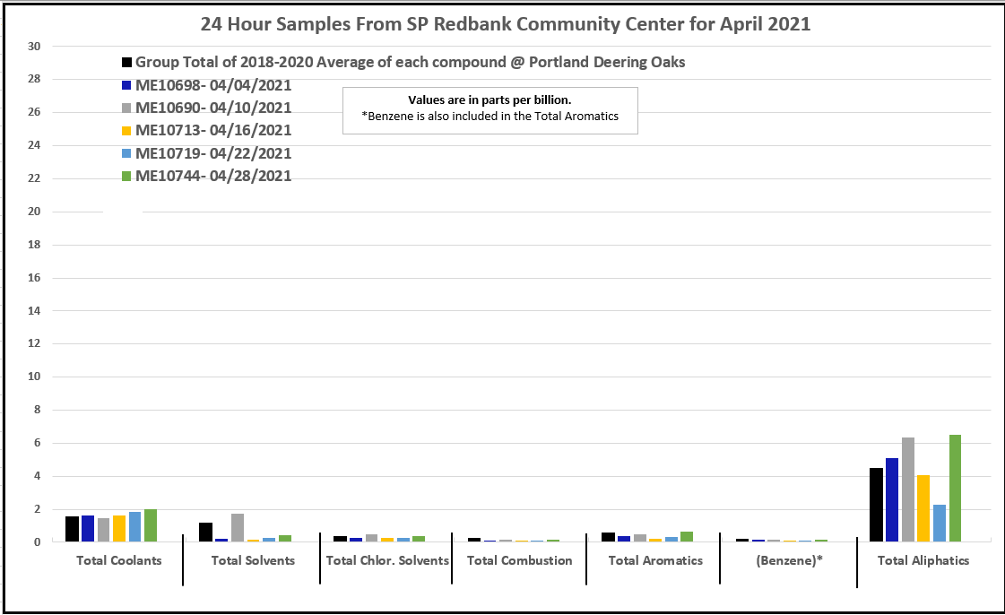 CAUTION to grab sampling data users: It is not appropriate to use grab sample data for any comparison to longer term average (e.g. annual) levels, guidelines or standards for health assessment purposes. Staff from the Maine Center for Disease Control (CDC) gave a presentation (PDF) to the South Portland City Council on November 26, 2019 that describes and illustrates their approach to interpreting this data from a health perspective. The grab sample data charts we’ve created here are intended to simply be a visualization of each sample’s results from an air quality perspective, comparing them to the 2018 annual averages from our Portland Deering Oaks site, which for this purpose are being used as reference or background concentrations for the area.