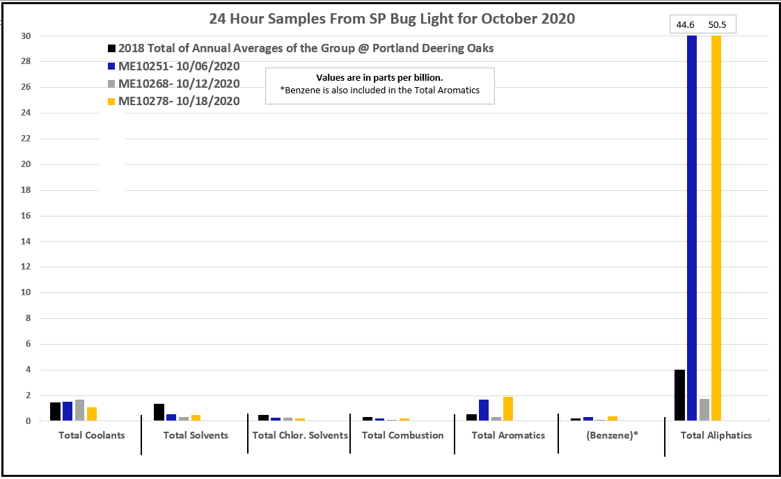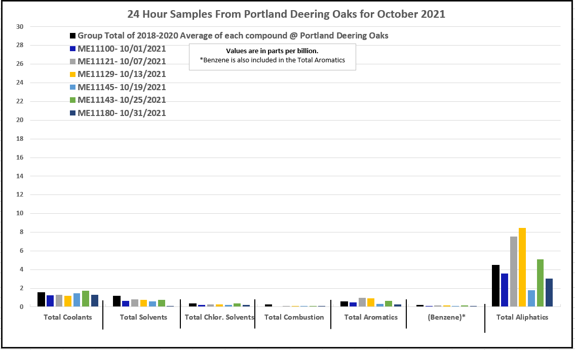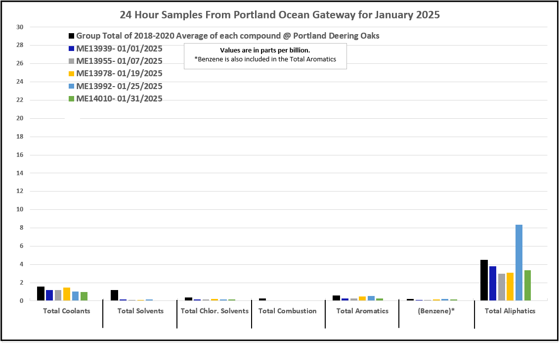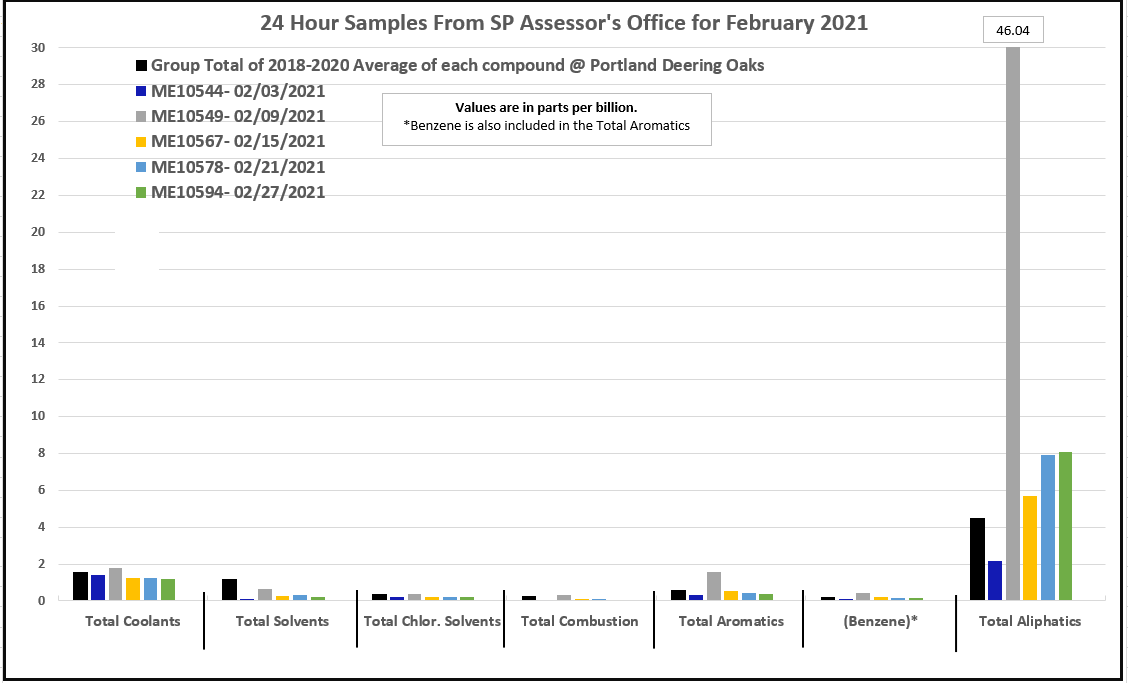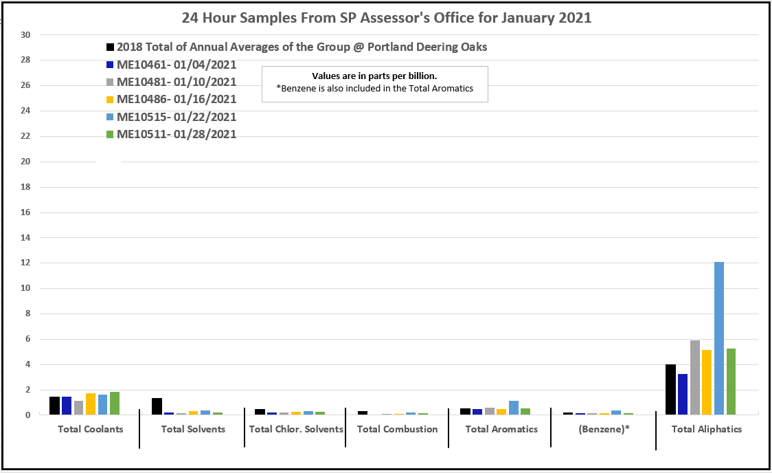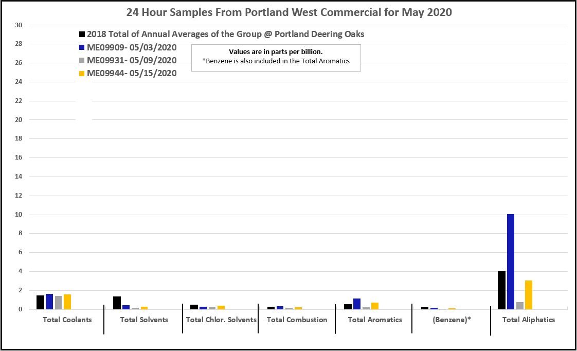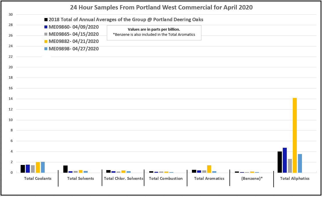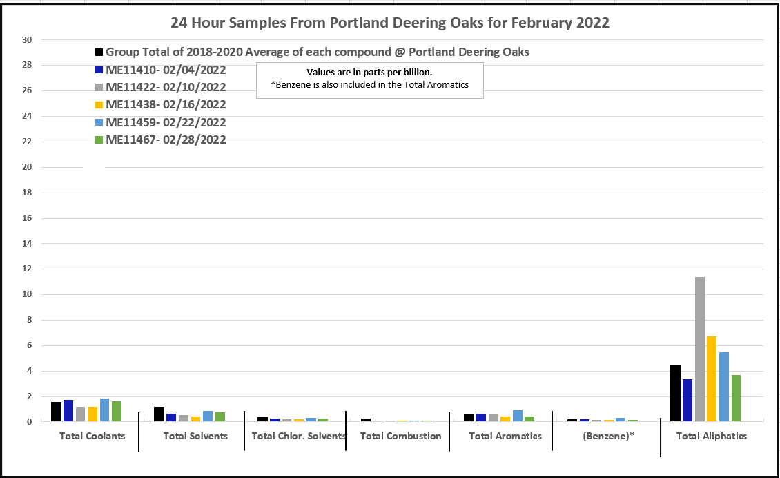 CAUTION to grab sampling data users: It is not appropriate to use grab sample data for any comparison to longer term average (e.g. annual) levels, guidelines or standards for health assessment purposes. Staff from the Maine Center for Disease Control (CDC) gave a presentation (PDF) to the South Portland City Council on November 26, 2019 that describes and illustrates their approach to interpreting this data from a health perspective. The grab sample data charts we’ve created here are intended to simply be a visualization of each sample’s results from an air quality perspective, comparing them to the 2018 annual averages from our Portland Deering Oaks site, which for this purpose are being used as reference or background concentrations for the area.
