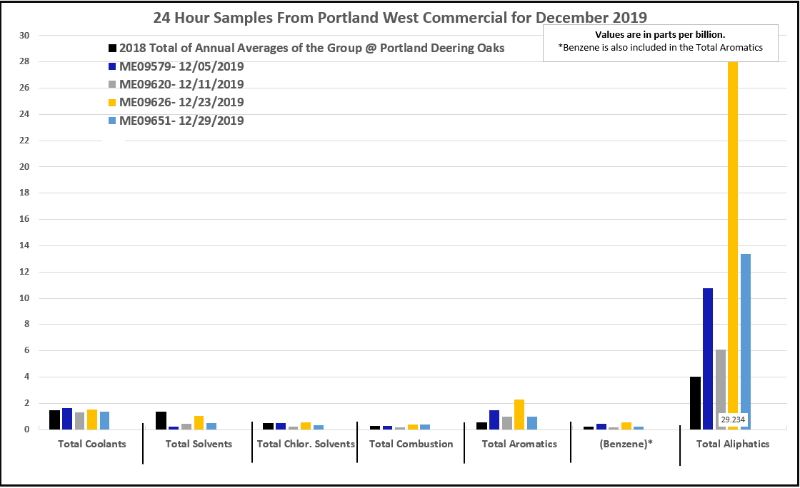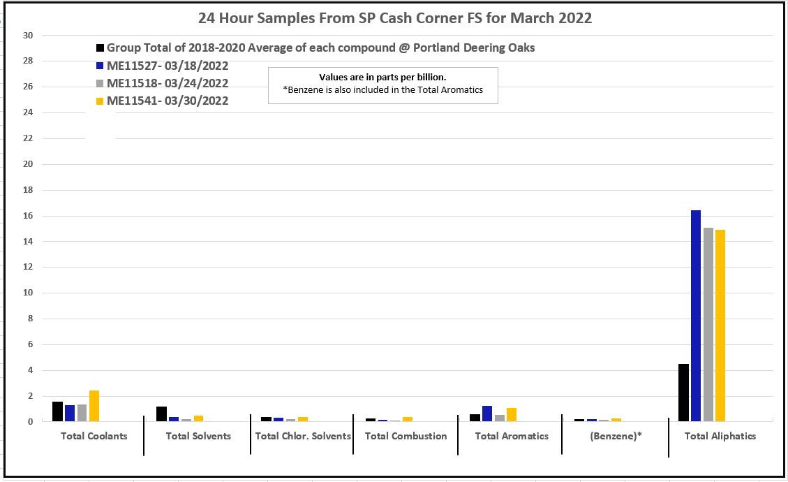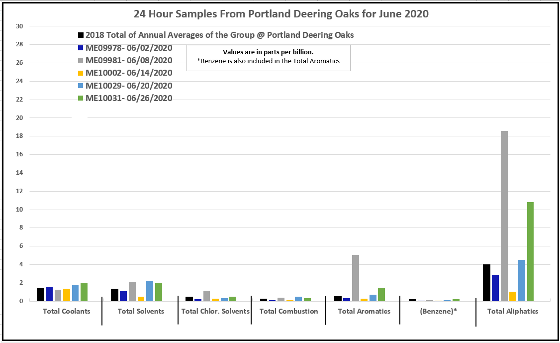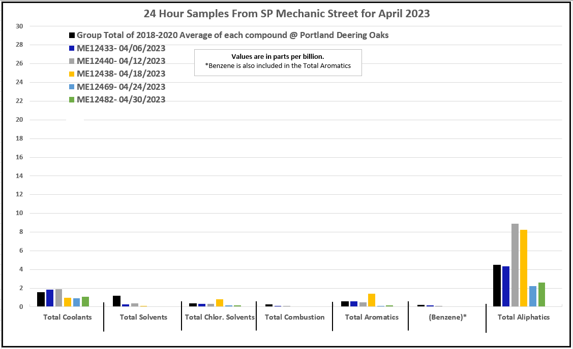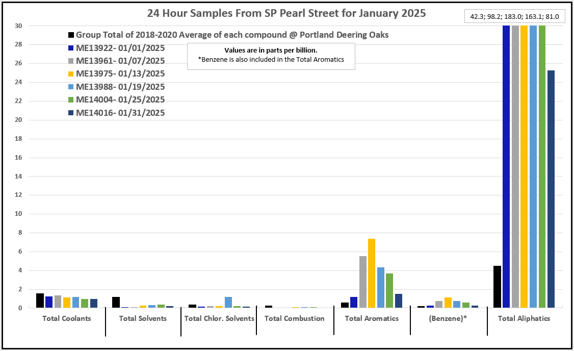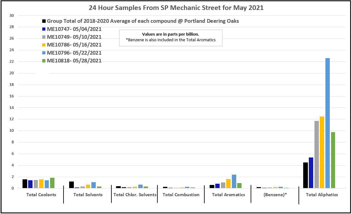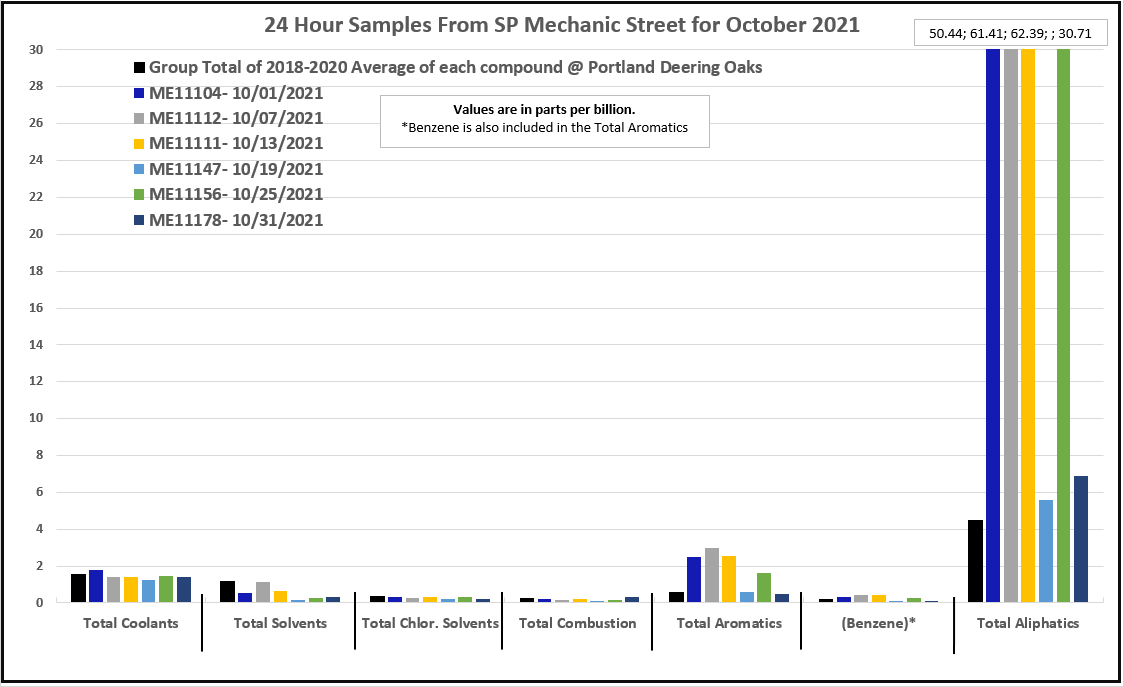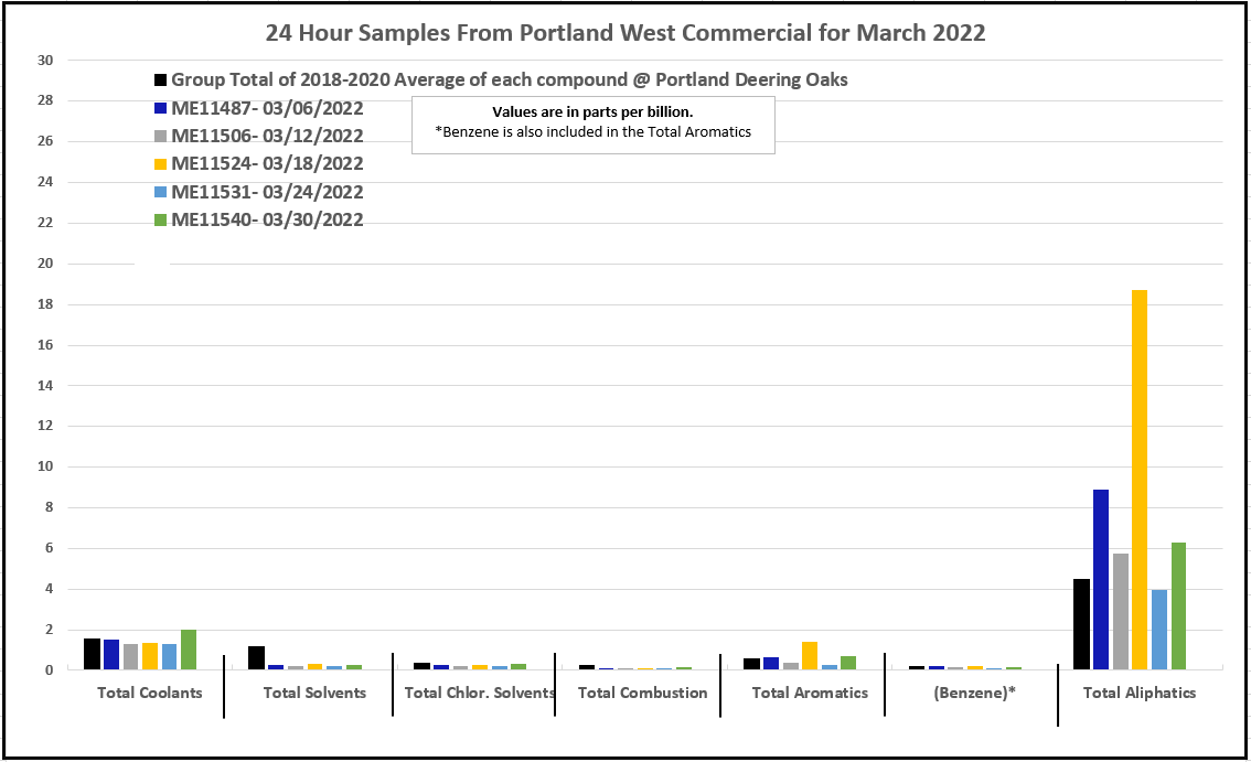 CAUTION to grab sampling data users: It is not appropriate to use grab sample data for any comparison to longer term average (e.g. annual) levels, guidelines or standards for health assessment purposes. Staff from the Maine Center for Disease Control (CDC) gave a presentation (PDF) to the South Portland City Council on November 26, 2019 that describes and illustrates their approach to interpreting this data from a health perspective. The grab sample data charts we’ve created here are intended to simply be a visualization of each sample’s results from an air quality perspective, comparing them to the 2018 annual averages from our Portland Deering Oaks site, which for this purpose are being used as reference or background concentrations for the area.