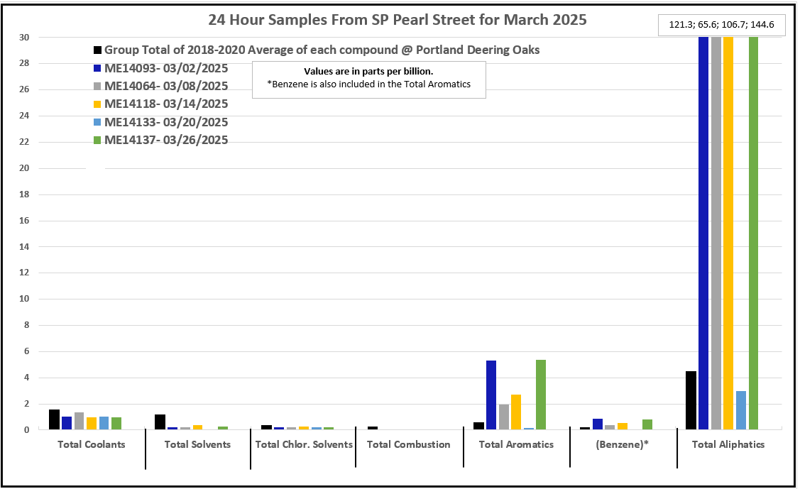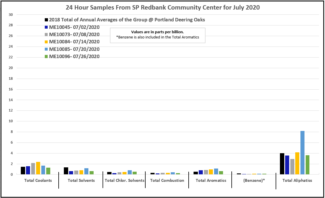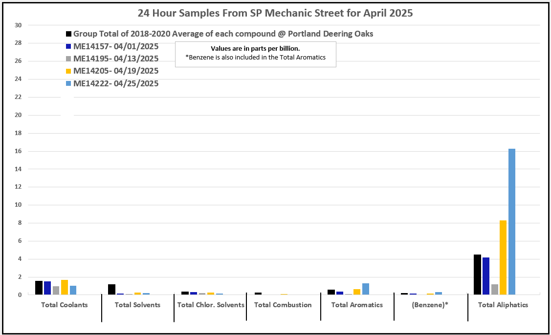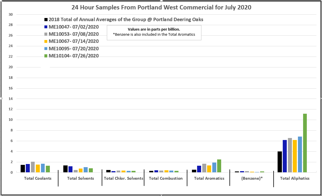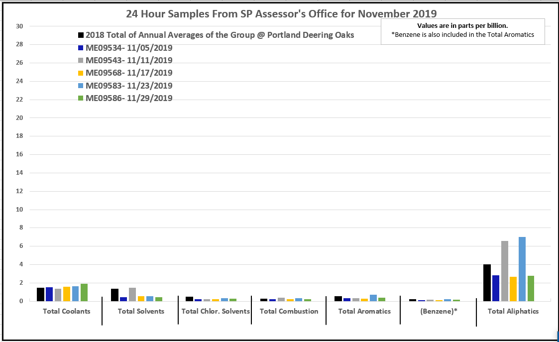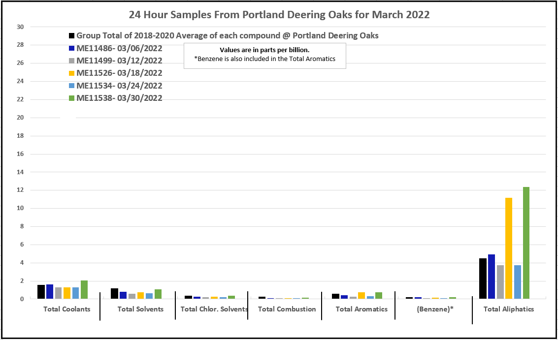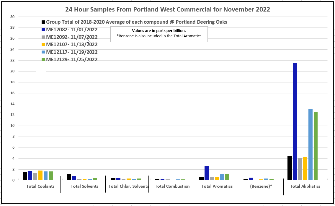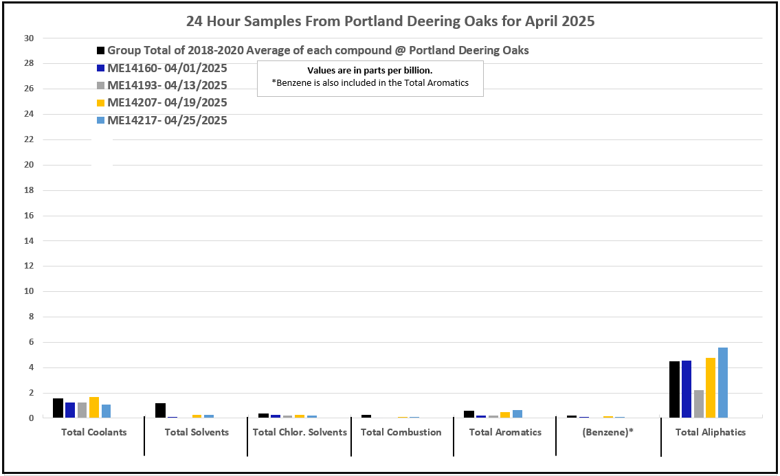 CAUTION to grab sampling data users: It is not appropriate to use grab sample data for any comparison to longer term average (e.g. annual) levels, guidelines or standards for health assessment purposes. Staff from the Maine Center for Disease Control (CDC) gave a presentation (PDF) to the South Portland City Council on November 26, 2019 that describes and illustrates their approach to interpreting this data from a health perspective. The grab sample data charts we’ve created here are intended to simply be a visualization of each sample’s results from an air quality perspective, comparing them to the 2018 annual averages from our Portland Deering Oaks site, which for this purpose are being used as reference or background concentrations for the area.