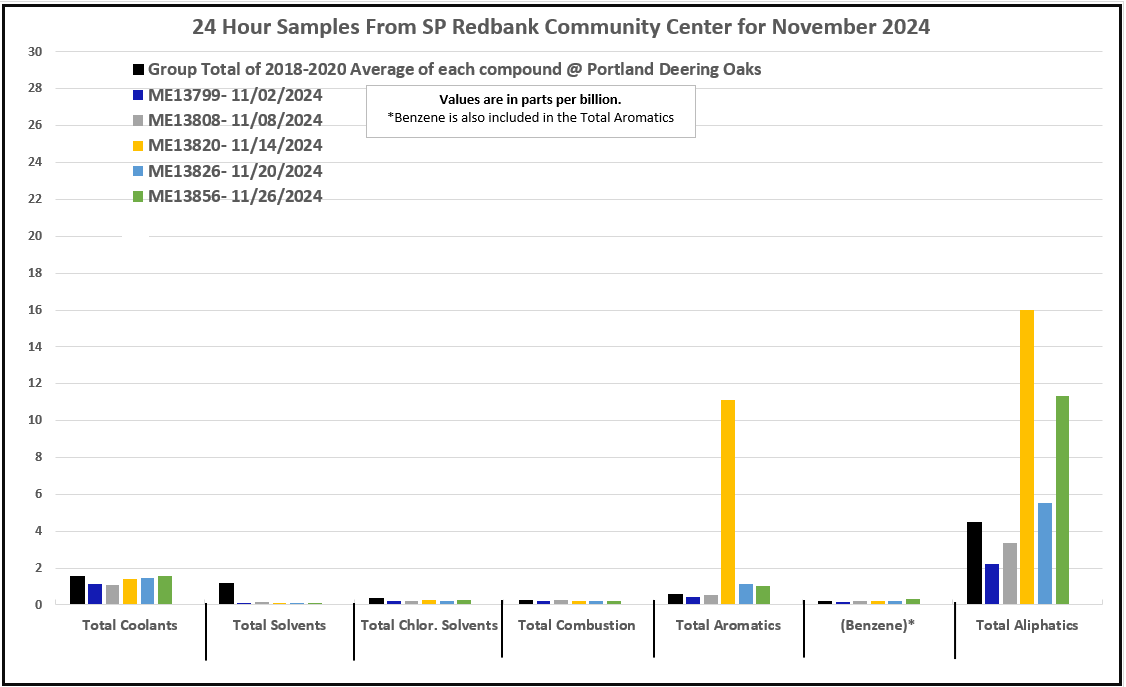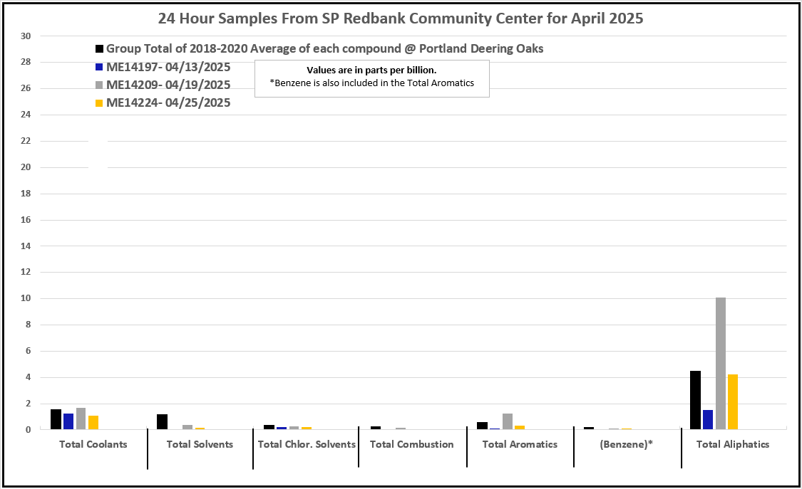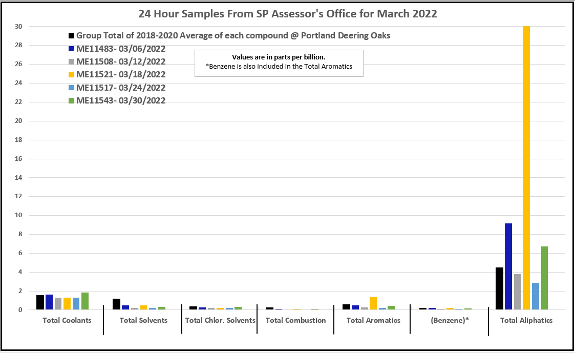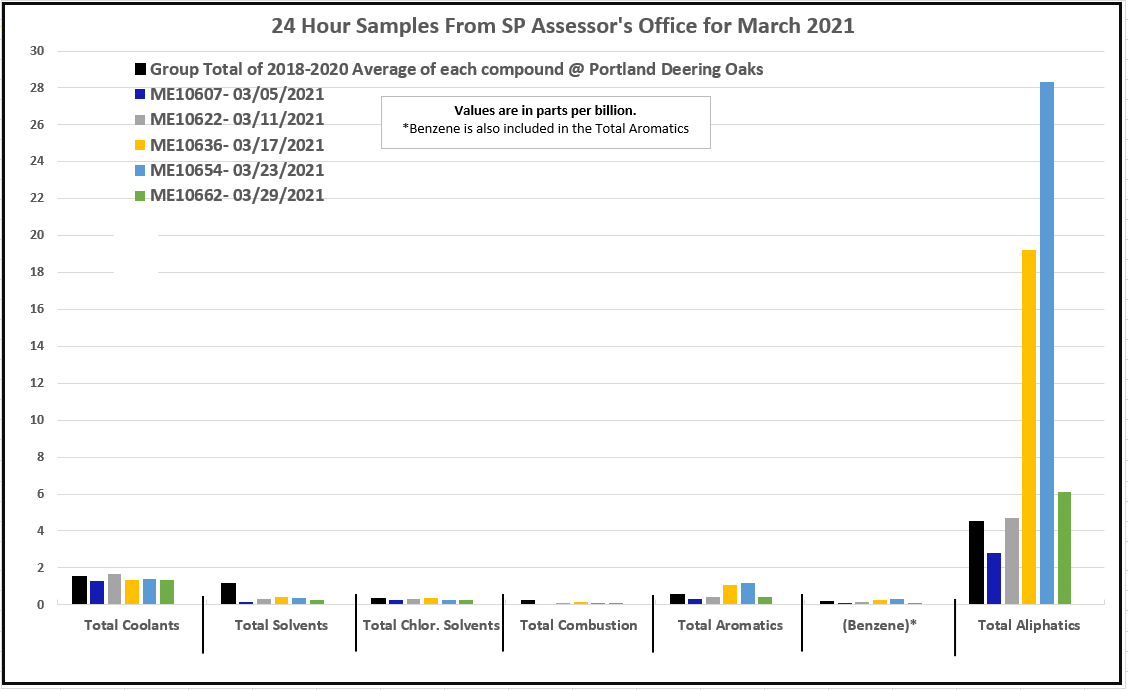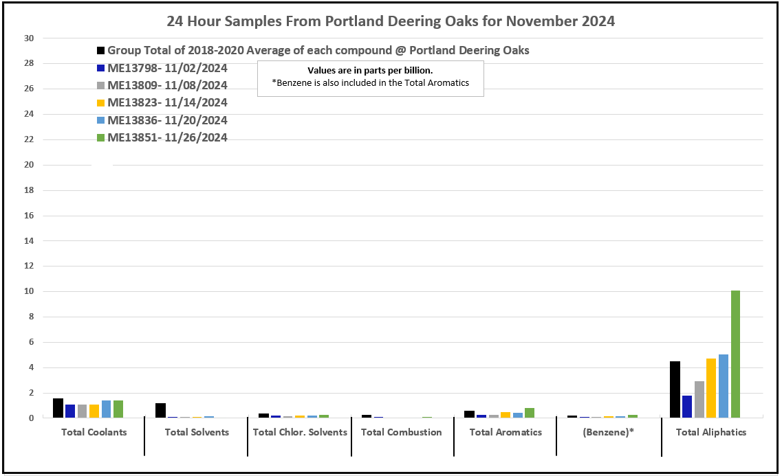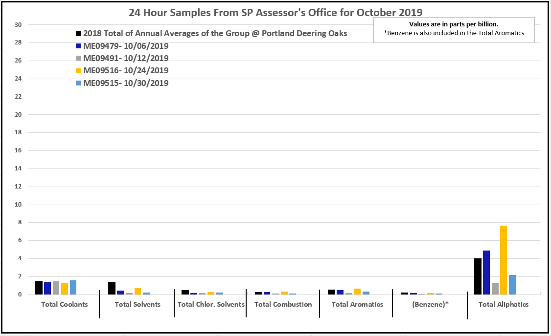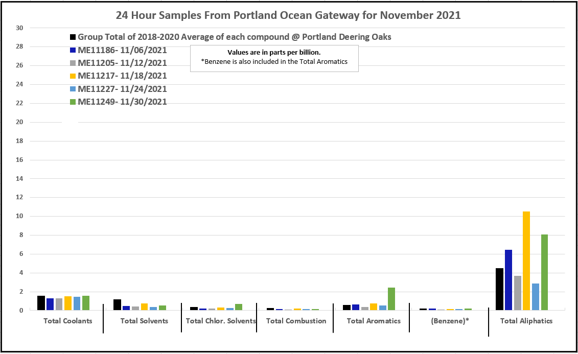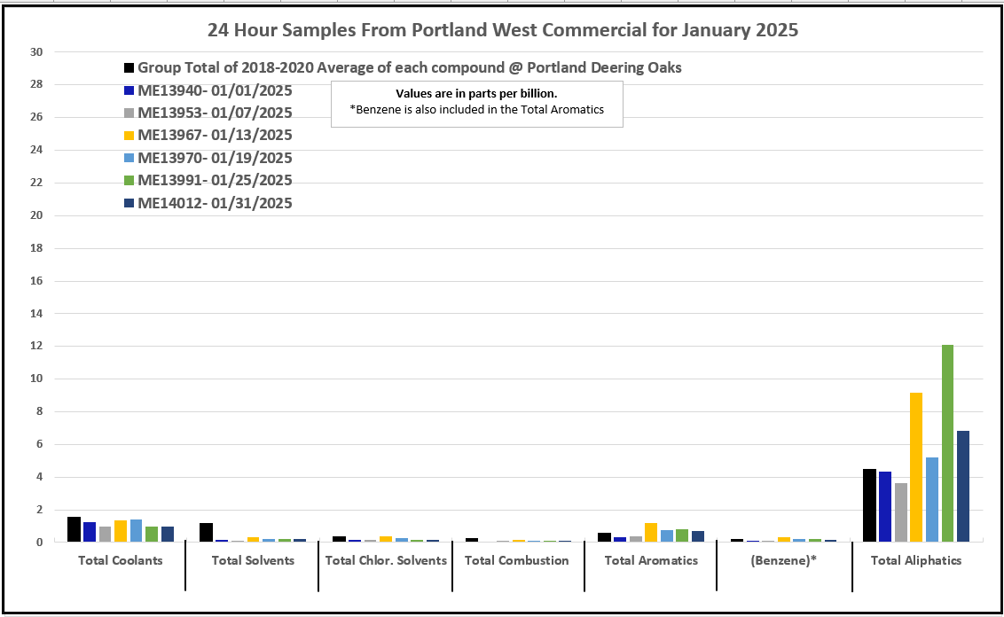 CAUTION to grab sampling data users: It is not appropriate to use grab sample data for any comparison to longer term average (e.g. annual) levels, guidelines or standards for health assessment purposes. Staff from the Maine Center for Disease Control (CDC) gave a presentation (PDF) to the South Portland City Council on November 26, 2019 that describes and illustrates their approach to interpreting this data from a health perspective. The grab sample data charts we’ve created here are intended to simply be a visualization of each sample’s results from an air quality perspective, comparing them to the 2018 annual averages from our Portland Deering Oaks site, which for this purpose are being used as reference or background concentrations for the area.