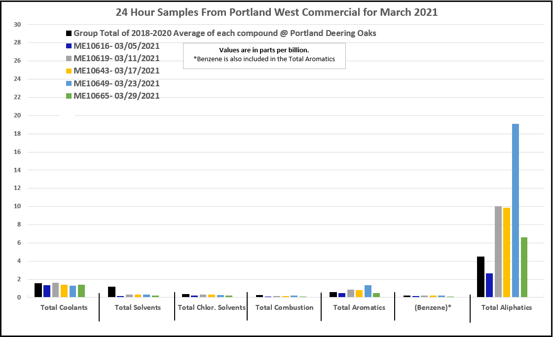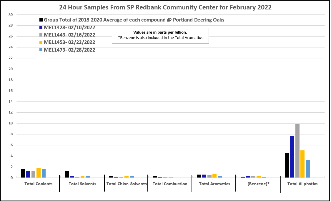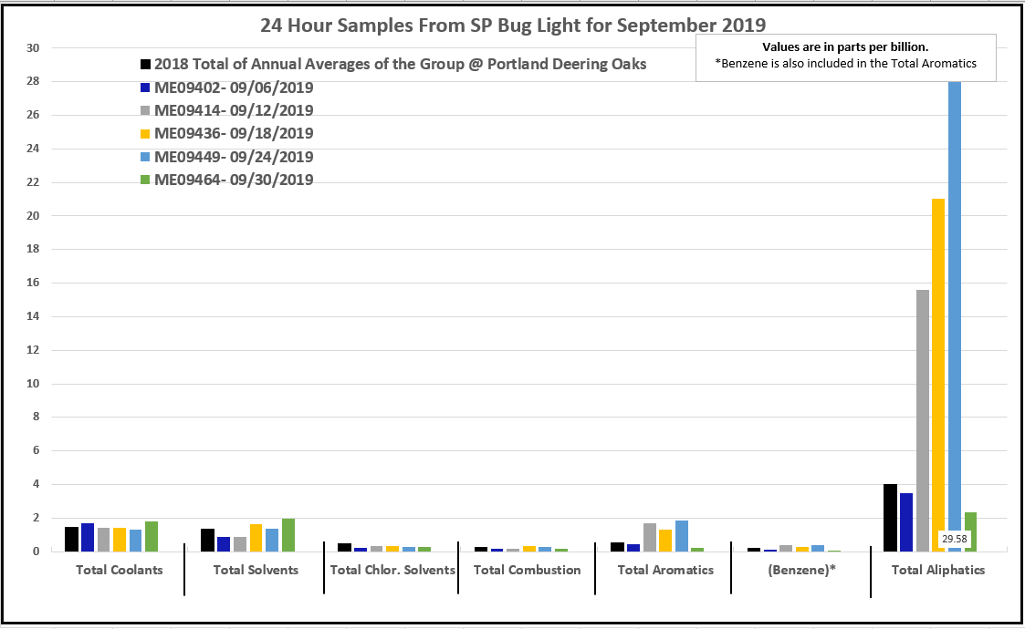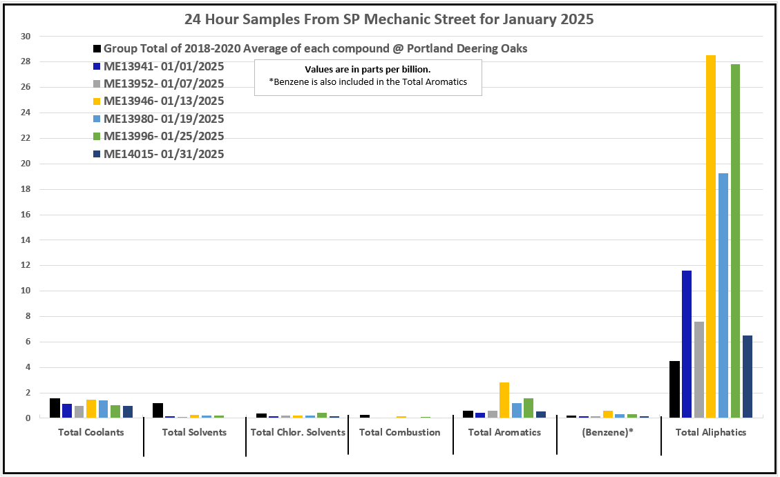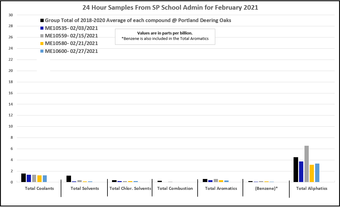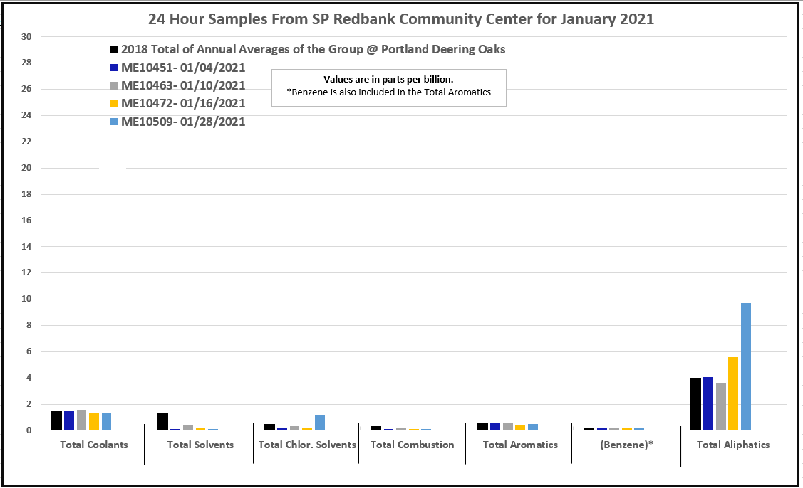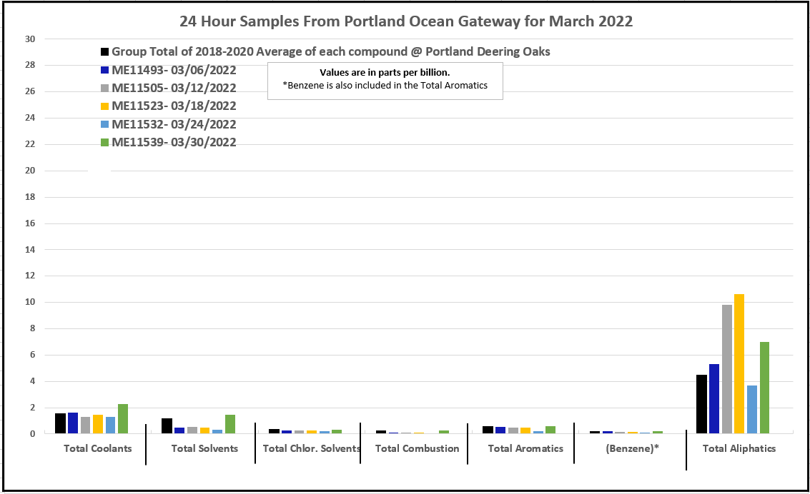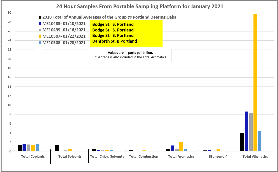 CAUTION to grab sampling data users: It is not appropriate to use grab sample data for any comparison to longer term average (e.g. annual) levels, guidelines or standards for health assessment purposes. Staff from the Maine Center for Disease Control (CDC) gave a presentation (PDF) to the South Portland City Council on November 26, 2019 that describes and illustrates their approach to interpreting this data from a health perspective. The grab sample data charts we’ve created here are intended to simply be a visualization of each sample’s results from an air quality perspective, comparing them to the 2018 annual averages from our Portland Deering Oaks site, which for this purpose are being used as reference or background concentrations for the area.