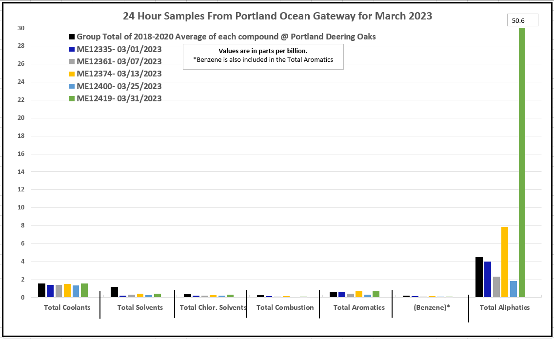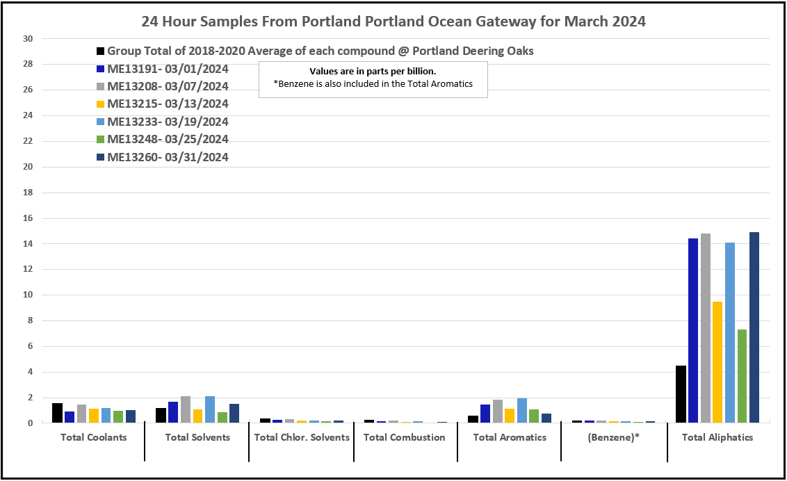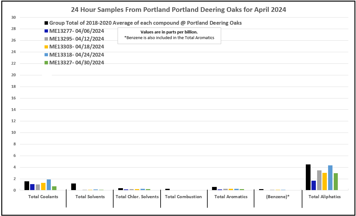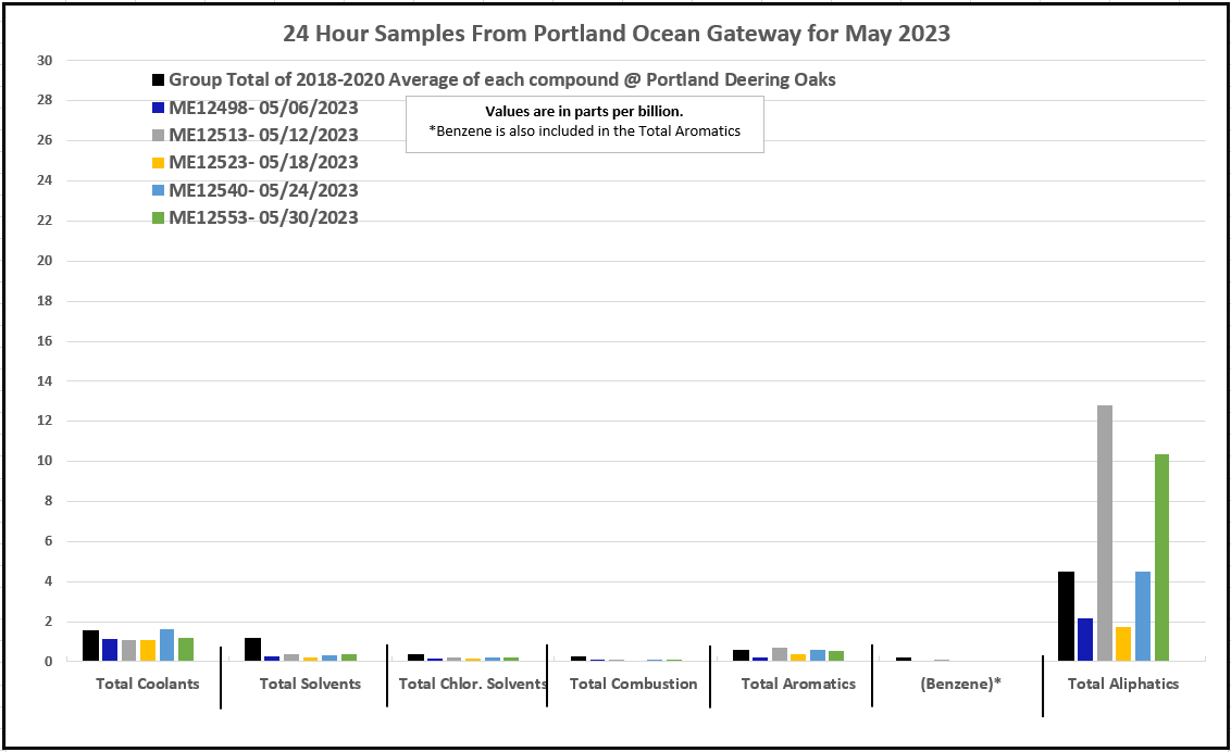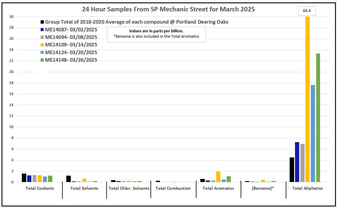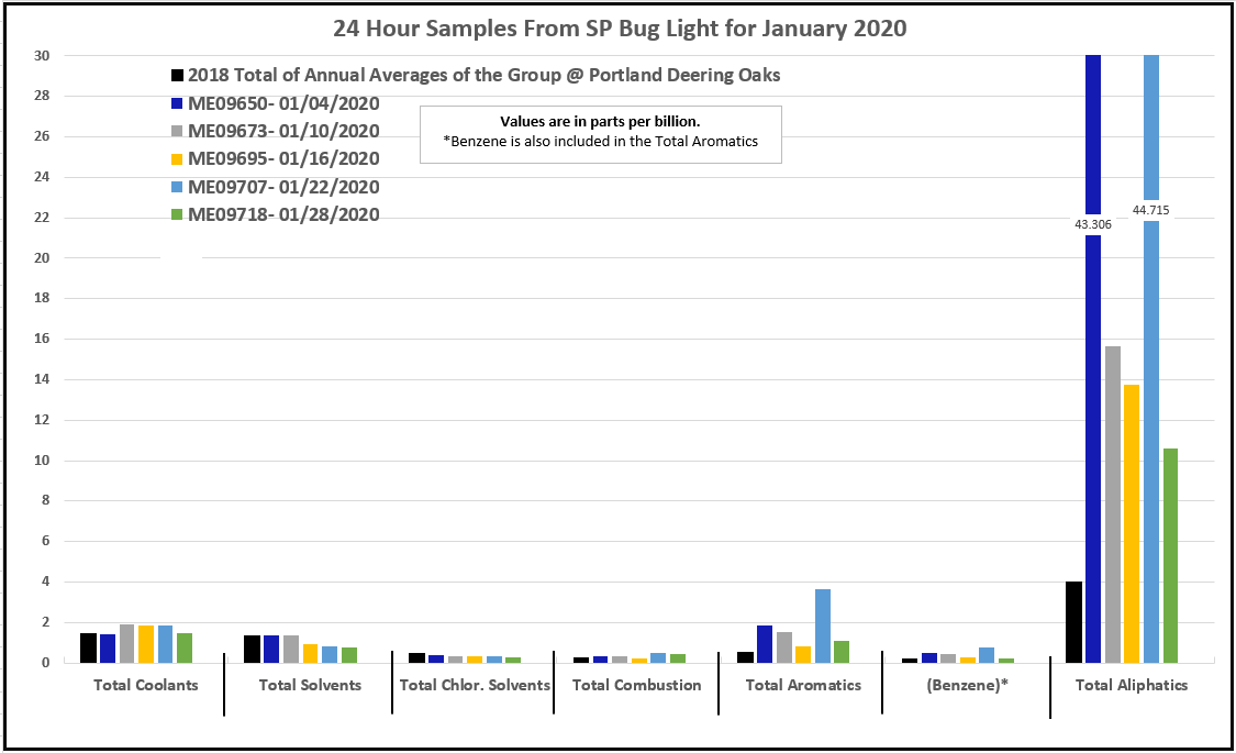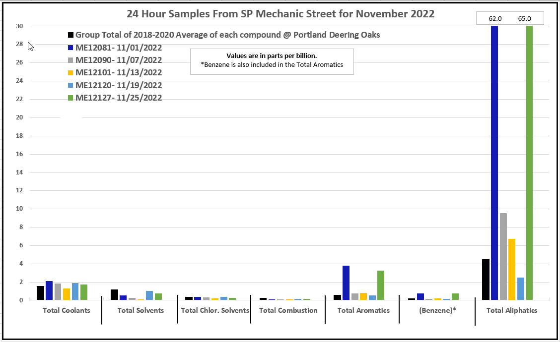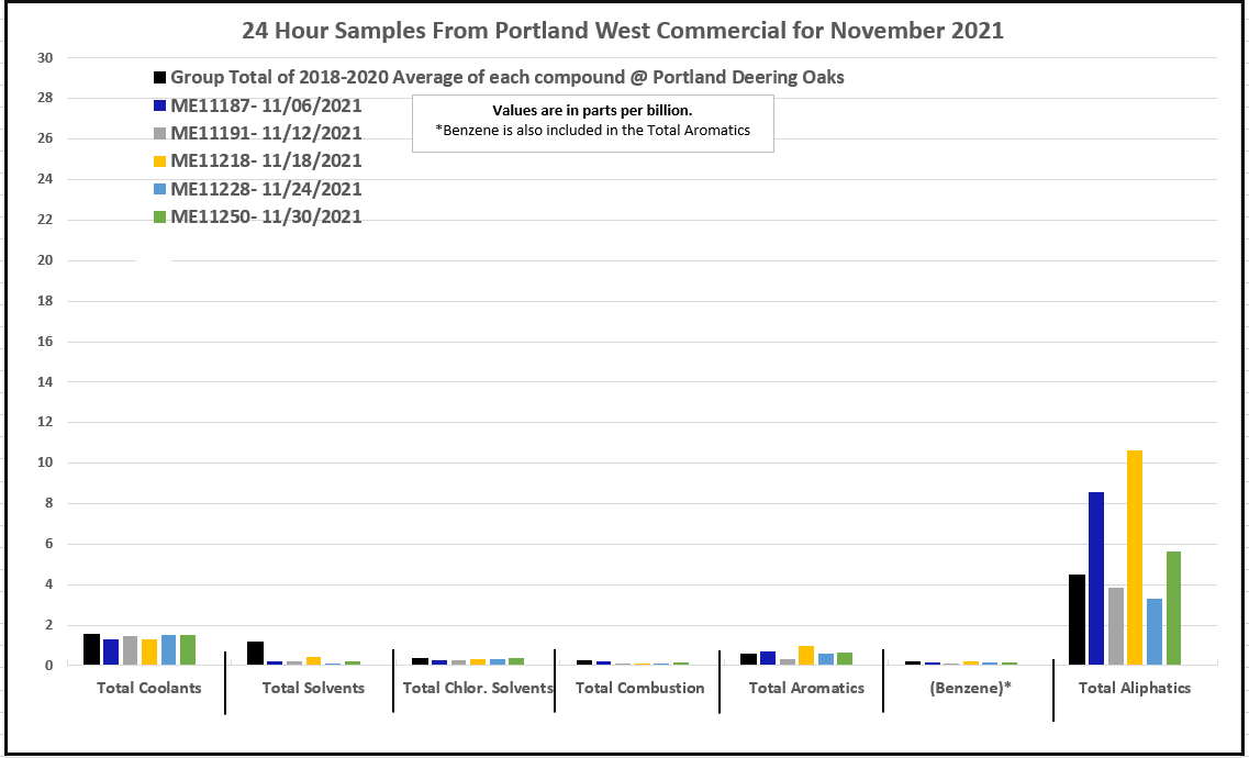 CAUTION to grab sampling data users: It is not appropriate to use grab sample data for any comparison to longer term average (e.g. annual) levels, guidelines or standards for health assessment purposes. Staff from the Maine Center for Disease Control (CDC) gave a presentation (PDF) to the South Portland City Council on November 26, 2019 that describes and illustrates their approach to interpreting this data from a health perspective. The grab sample data charts we’ve created here are intended to simply be a visualization of each sample’s results from an air quality perspective, comparing them to the 2018 annual averages from our Portland Deering Oaks site, which for this purpose are being used as reference or background concentrations for the area.