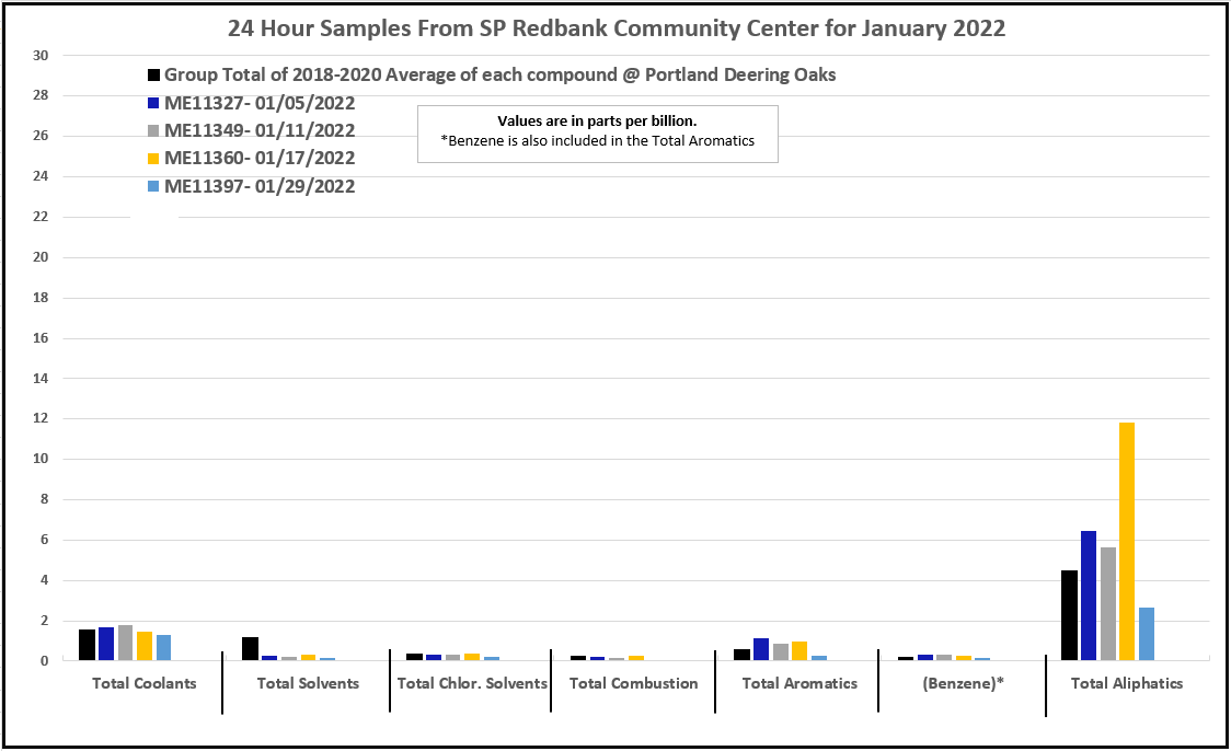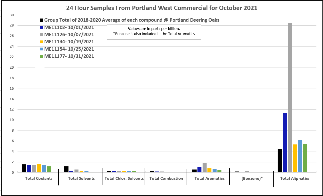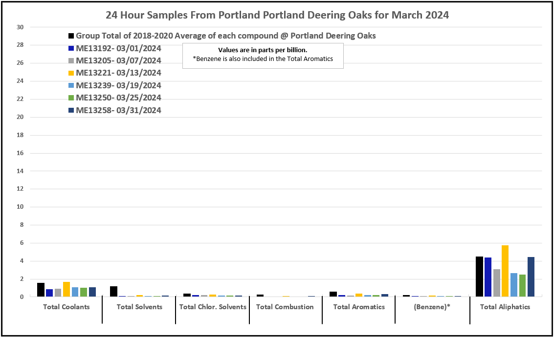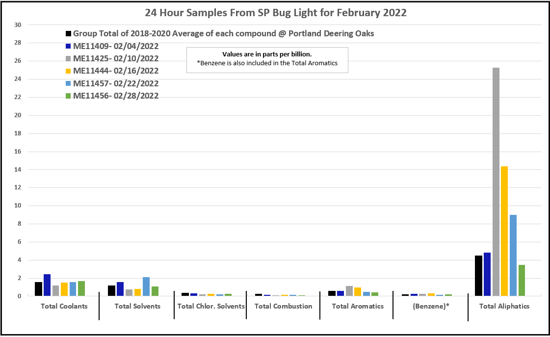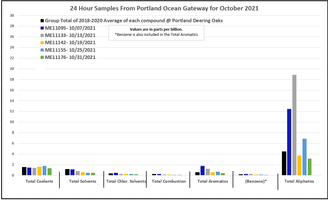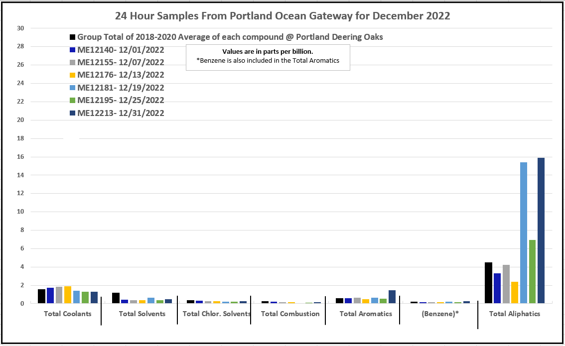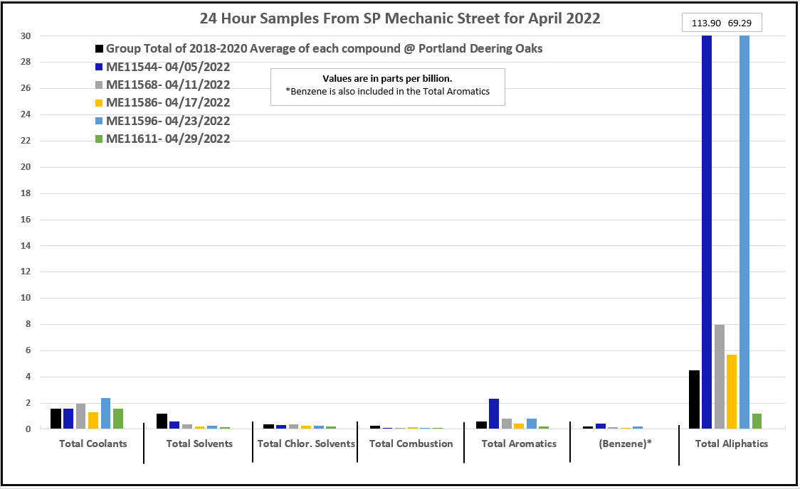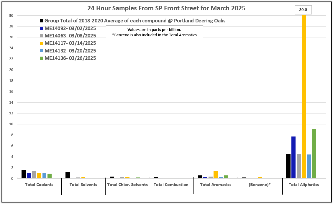CAUTION to grab sampling data users: It is not appropriate to use grab sample data for any comparison to longer term average (e.g. annual) levels, guidelines or standards for health assessment purposes. Staff from the Maine Center for Disease Control (CDC) gave a presentation (PDF) to the South Portland City Council on November 26, 2019 that describes and illustrates their approach to interpreting this data from a health perspective. The grab sample data charts we’ve created here are intended to simply be a visualization of each sample’s results from an air quality perspective, comparing them to the 2018 annual averages from our Portland Deering Oaks site, which for this purpose are being used as reference or background concentrations for the area.