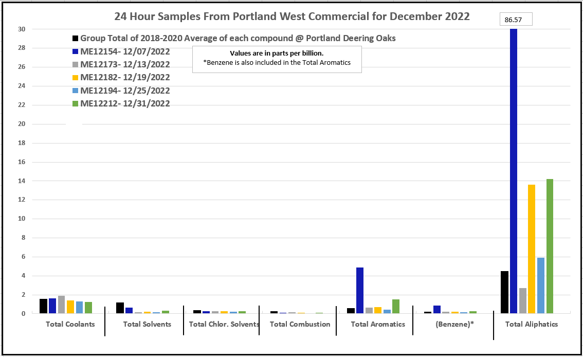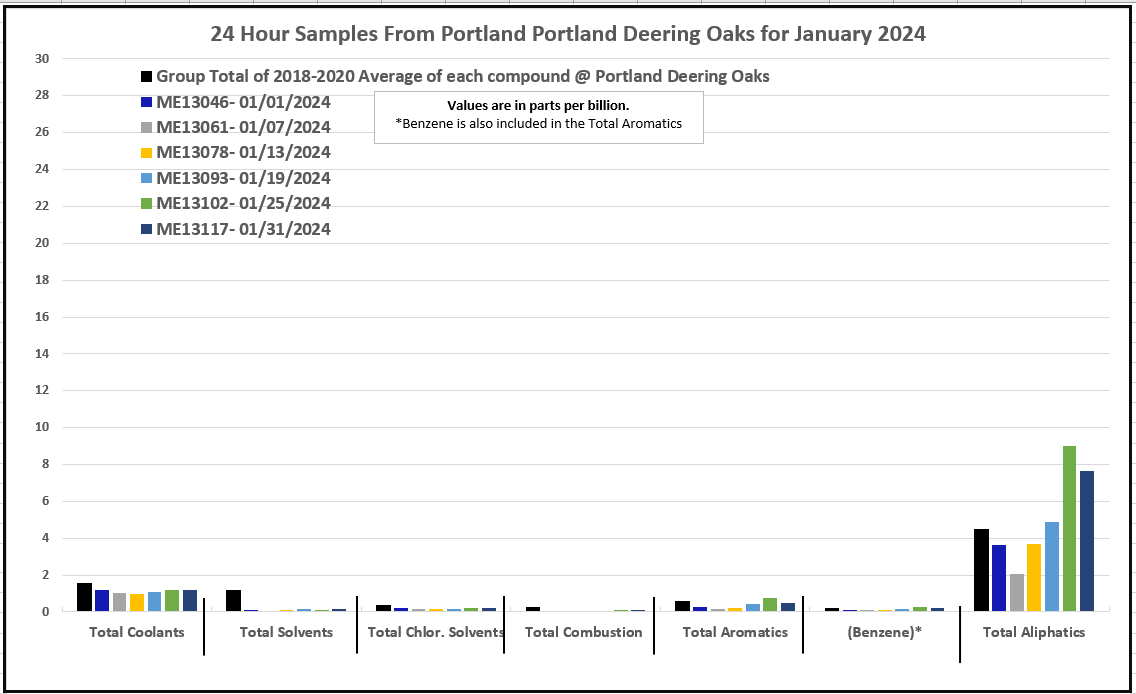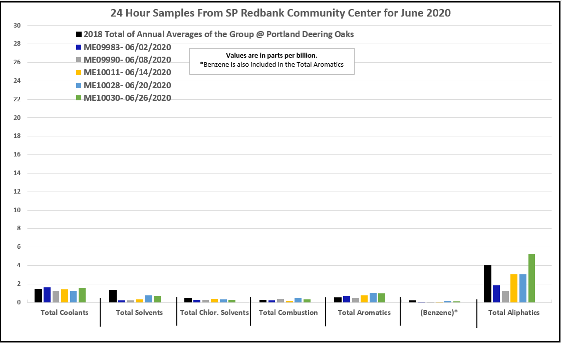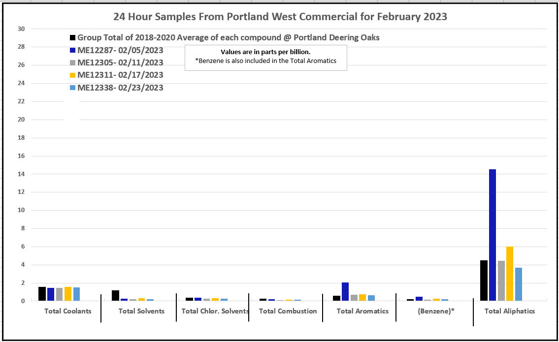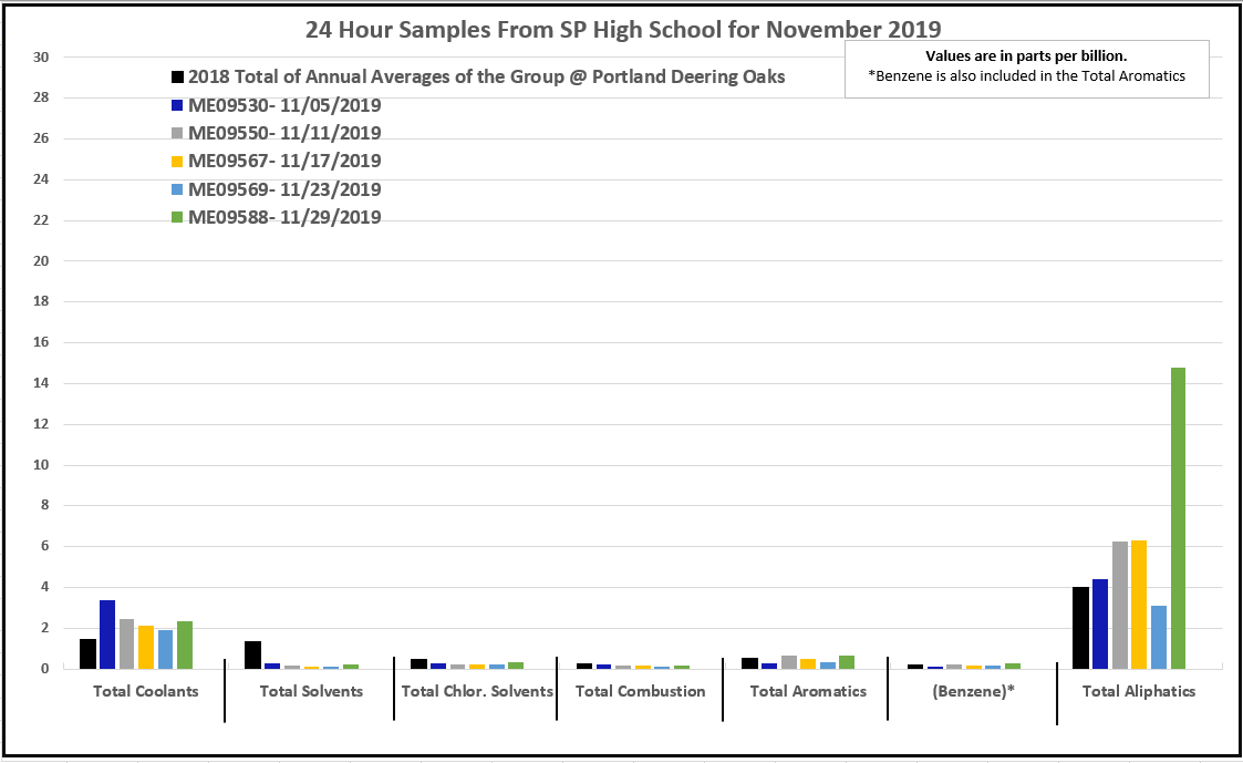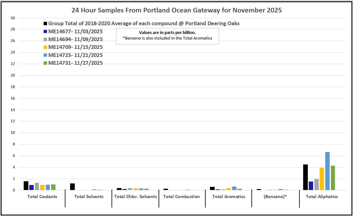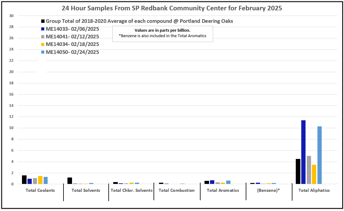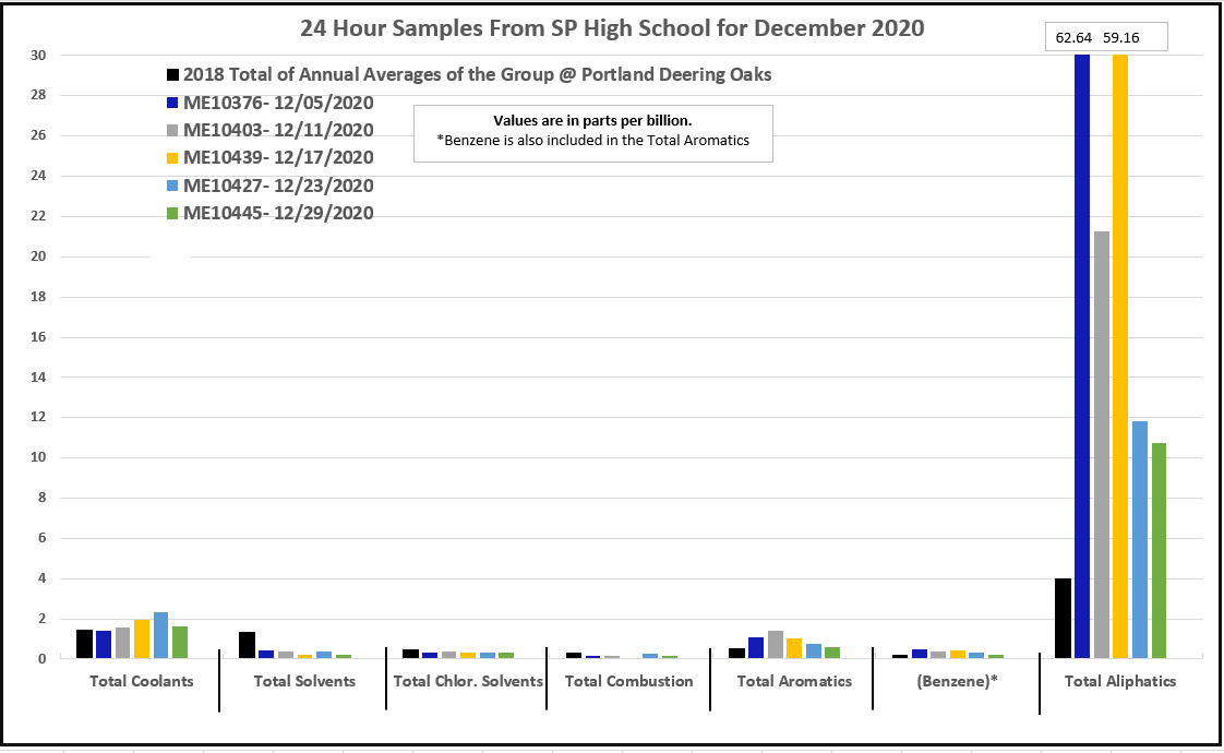 CAUTION to grab sampling data users: It is not appropriate to use grab sample data for any comparison to longer term average (e.g. annual) levels, guidelines or standards for health assessment purposes. Staff from the Maine Center for Disease Control (CDC) gave a presentation (PDF) to the South Portland City Council on November 26, 2019 that describes and illustrates their approach to interpreting this data from a health perspective. The grab sample data charts we’ve created here are intended to simply be a visualization of each sample’s results from an air quality perspective, comparing them to the 2018 annual averages from our Portland Deering Oaks site, which for this purpose are being used as reference or background concentrations for the area.