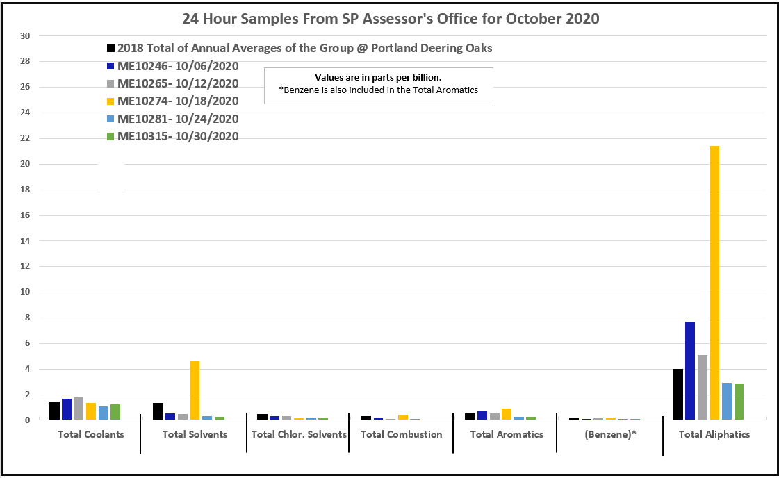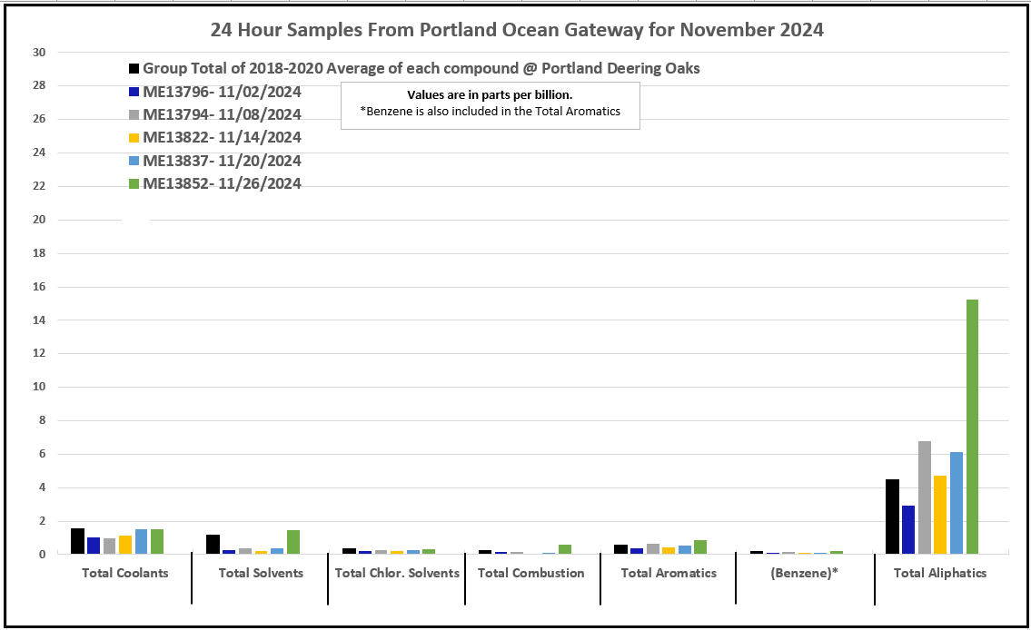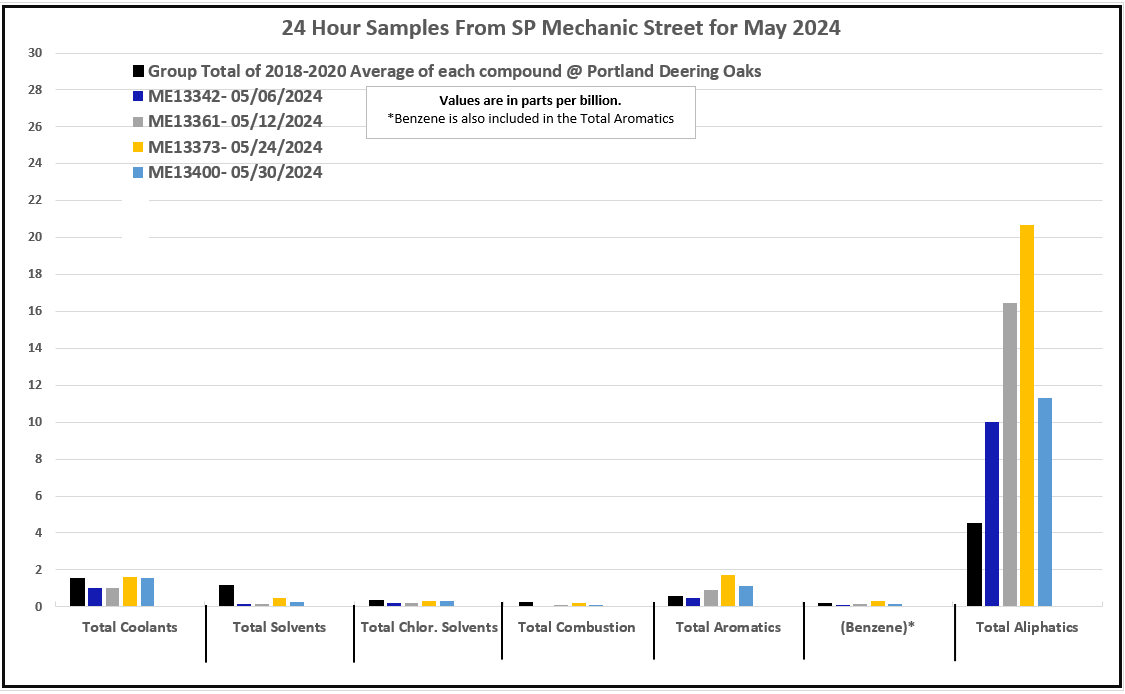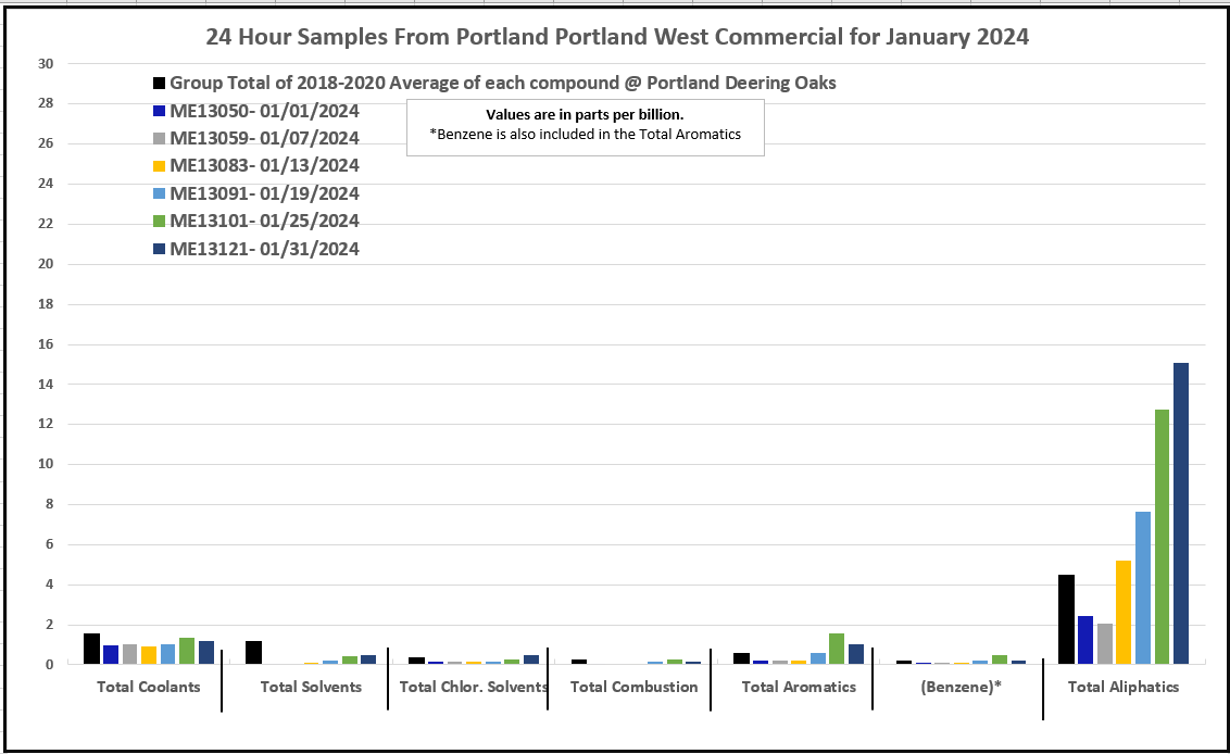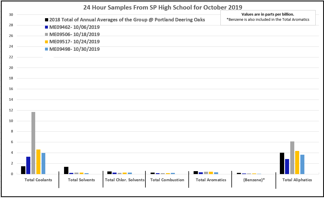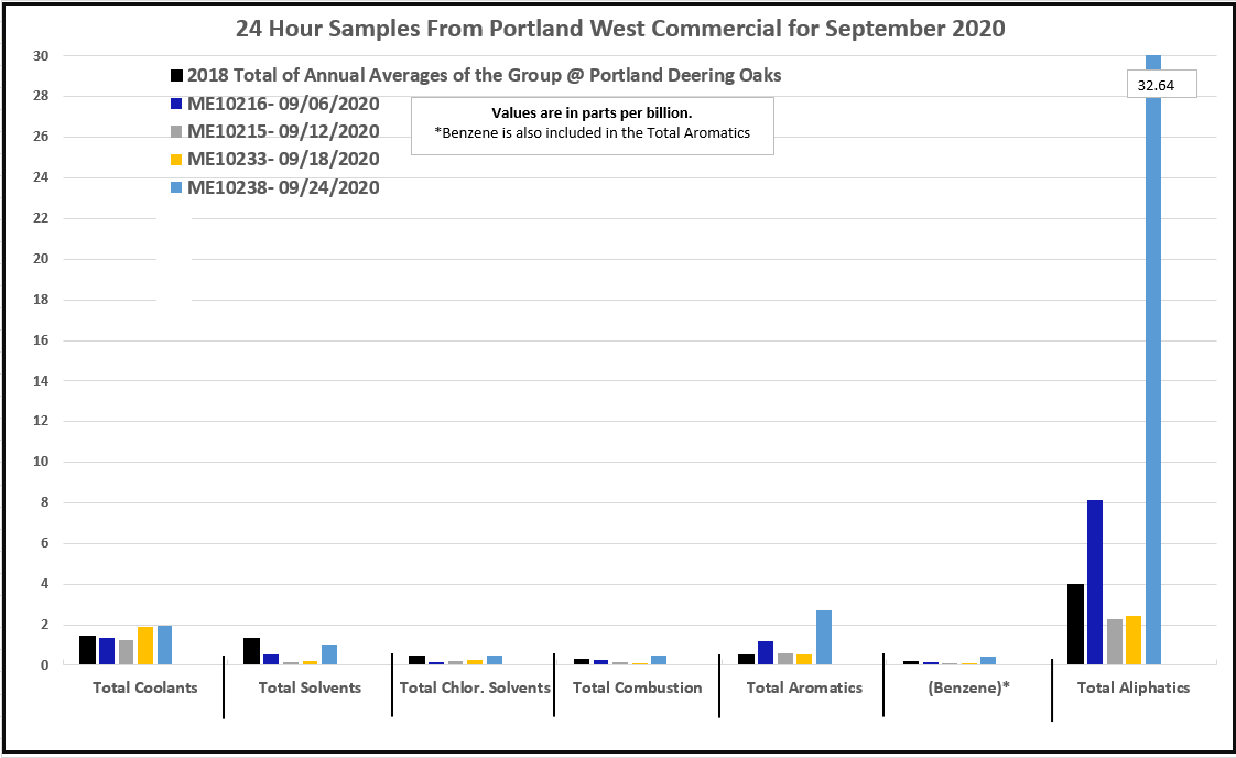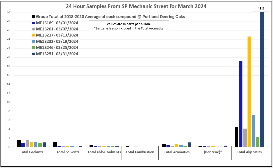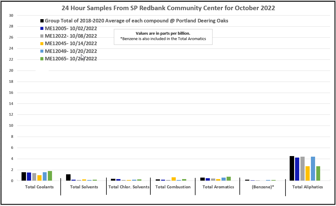 CAUTION to grab sampling data users: It is not appropriate to use grab sample data for any comparison to longer term average (e.g. annual) levels, guidelines or standards for health assessment purposes. Staff from the Maine Center for Disease Control (CDC) gave a presentation (PDF) to the South Portland City Council on November 26, 2019 that describes and illustrates their approach to interpreting this data from a health perspective. The grab sample data charts we’ve created here are intended to simply be a visualization of each sample’s results from an air quality perspective, comparing them to the 2018 annual averages from our Portland Deering Oaks site, which for this purpose are being used as reference or background concentrations for the area.
