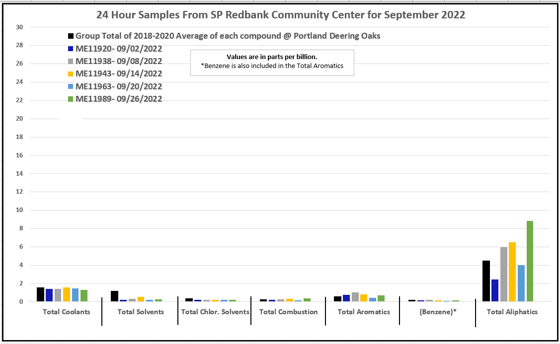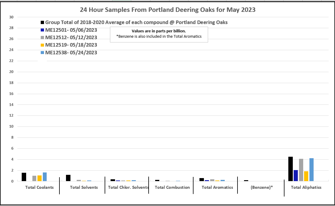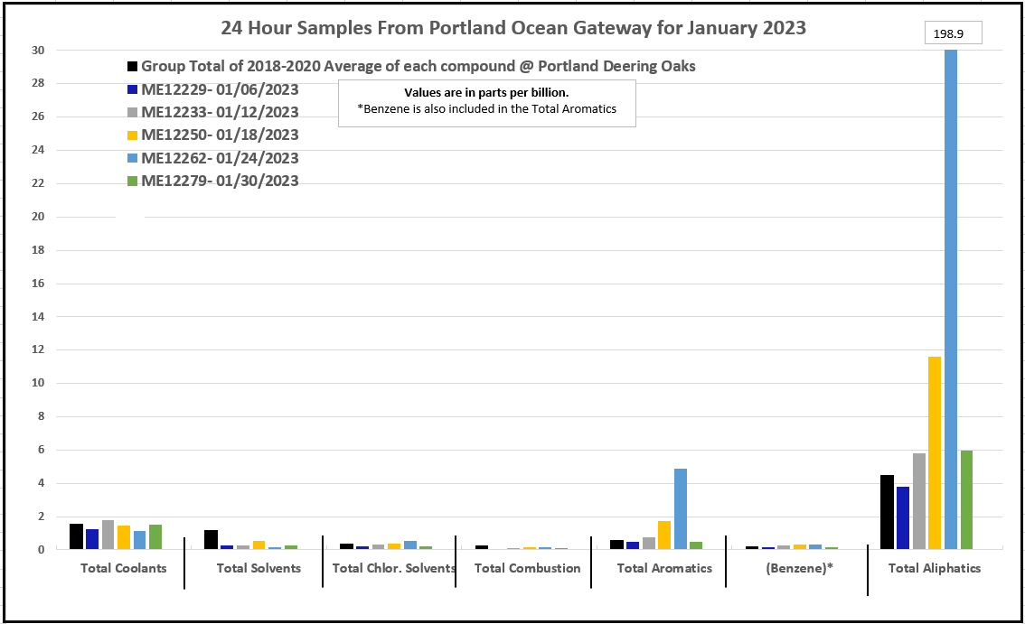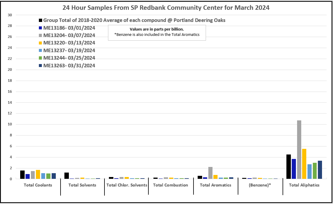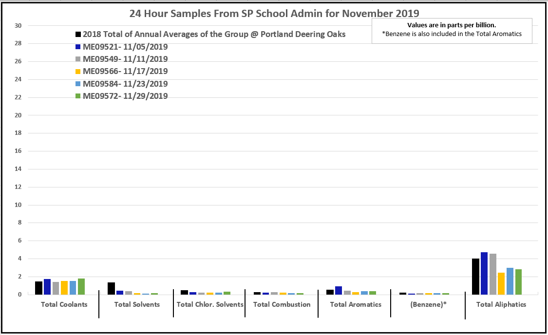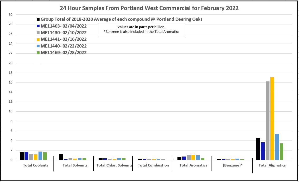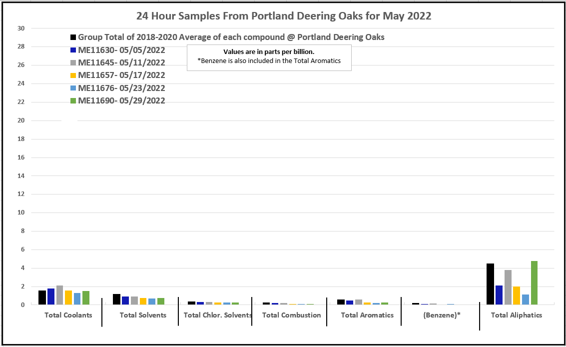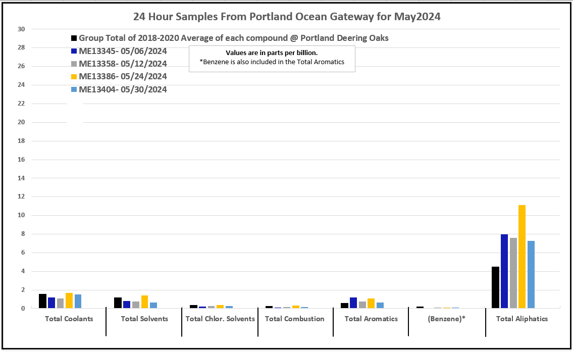 CAUTION to grab sampling data users: It is not appropriate to use grab sample data for any comparison to longer term average (e.g. annual) levels, guidelines or standards for health assessment purposes. Staff from the Maine Center for Disease Control (CDC) gave a presentation (PDF) to the South Portland City Council on November 26, 2019 that describes and illustrates their approach to interpreting this data from a health perspective. The grab sample data charts we’ve created here are intended to simply be a visualization of each sample’s results from an air quality perspective, comparing them to the 2018 annual averages from our Portland Deering Oaks site, which for this purpose are being used as reference or background concentrations for the area.