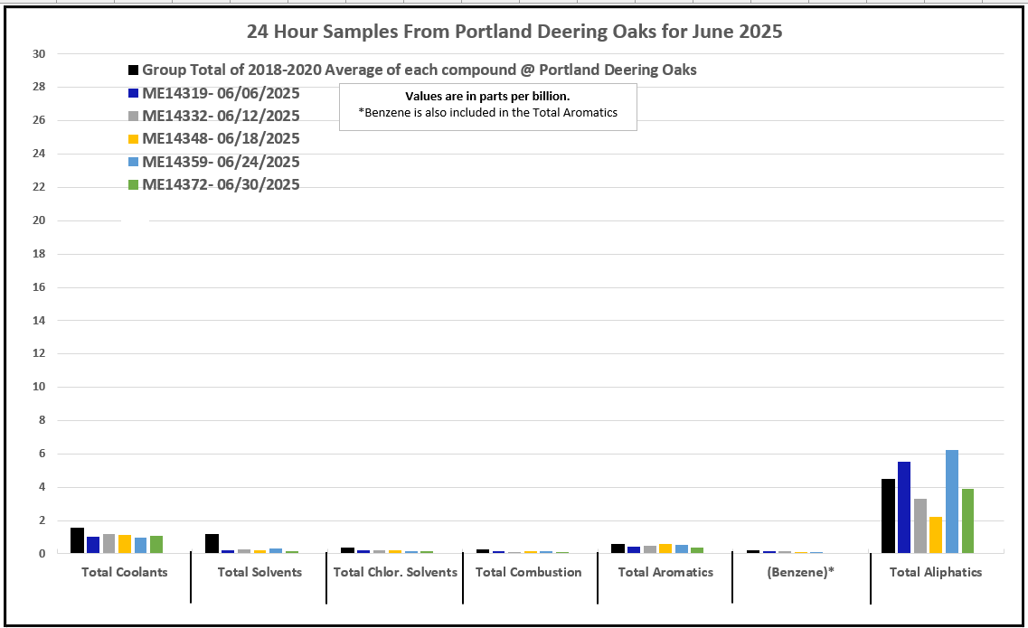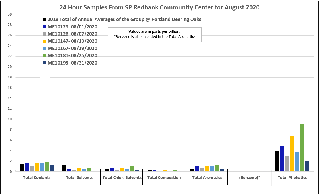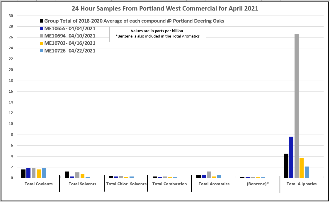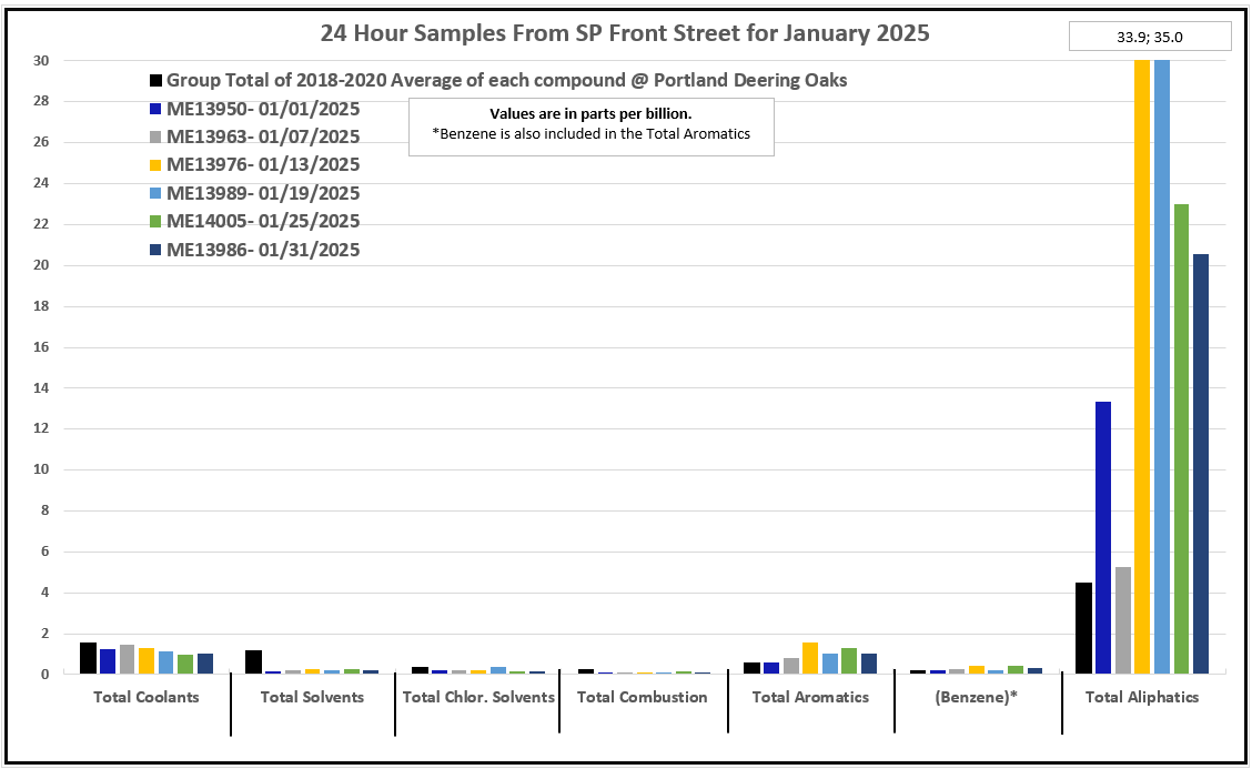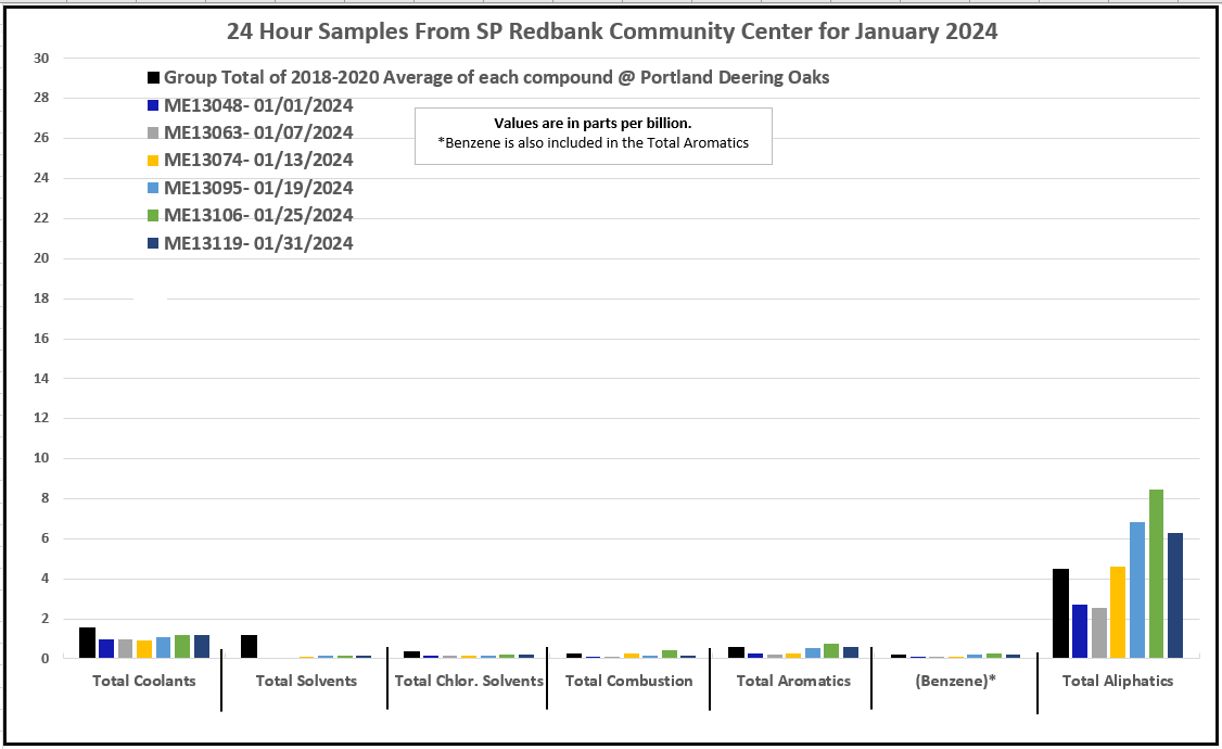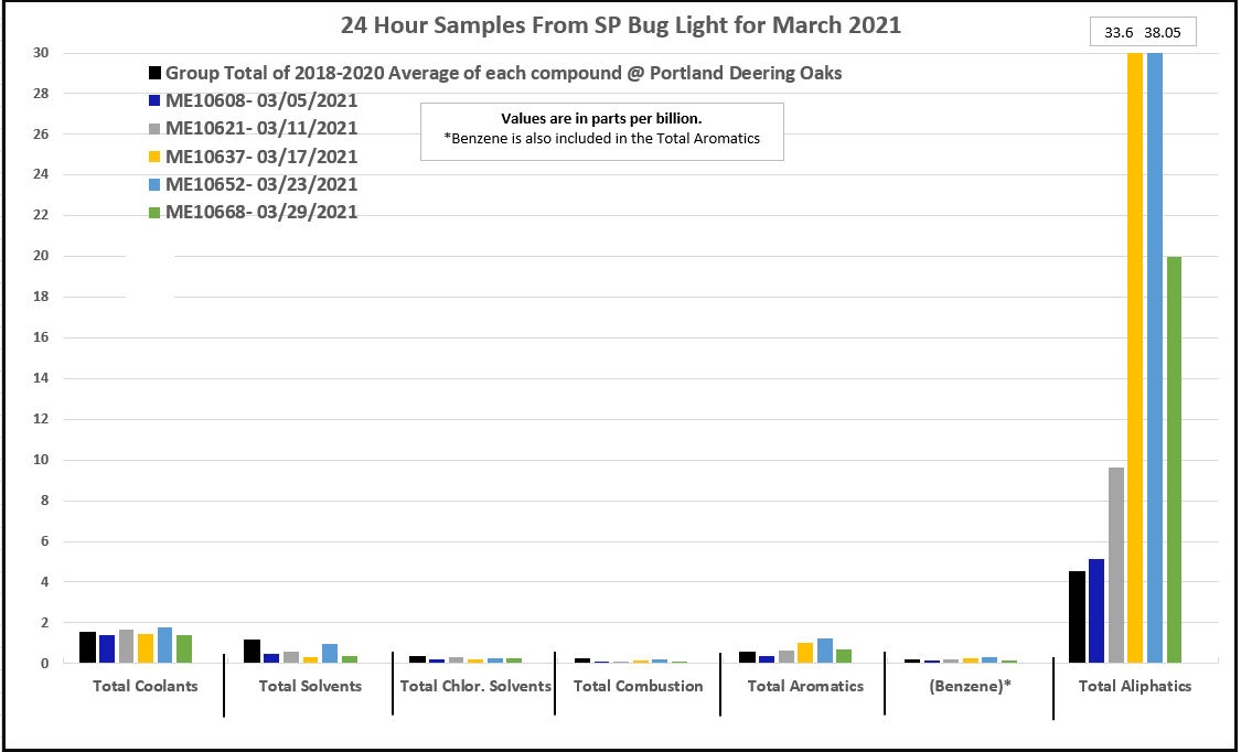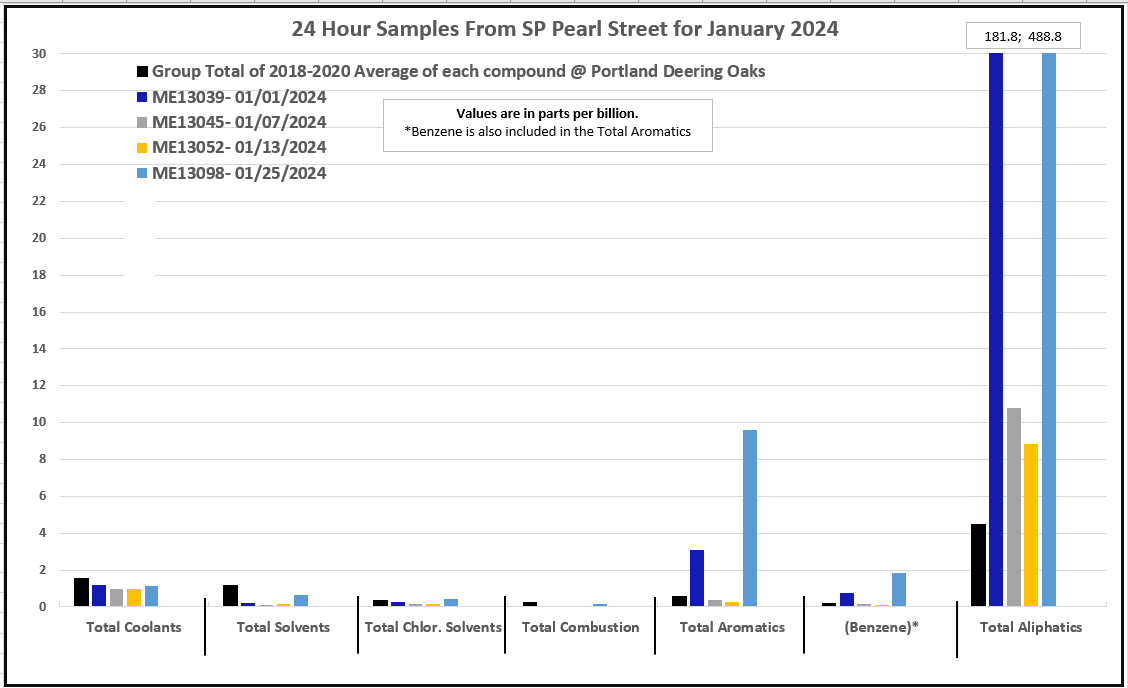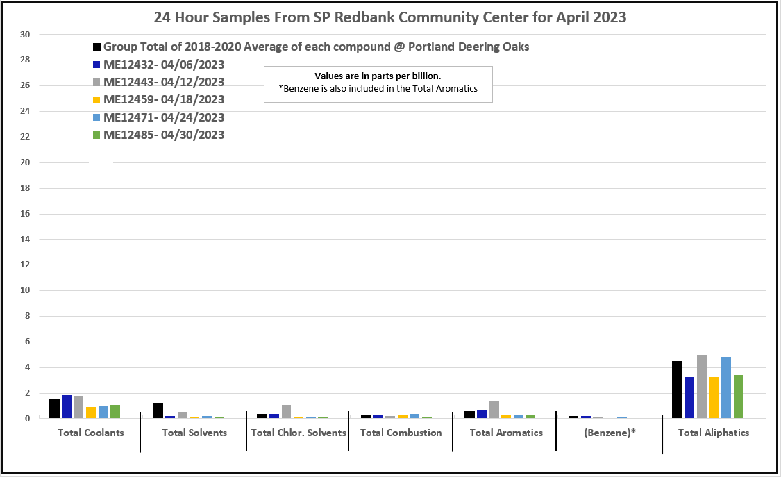 CAUTION to grab sampling data users: It is not appropriate to use grab sample data for any comparison to longer term average (e.g. annual) levels, guidelines or standards for health assessment purposes. Staff from the Maine Center for Disease Control (CDC) gave a presentation (PDF) to the South Portland City Council on November 26, 2019 that describes and illustrates their approach to interpreting this data from a health perspective. The grab sample data charts we’ve created here are intended to simply be a visualization of each sample’s results from an air quality perspective, comparing them to the 2018 annual averages from our Portland Deering Oaks site, which for this purpose are being used as reference or background concentrations for the area.