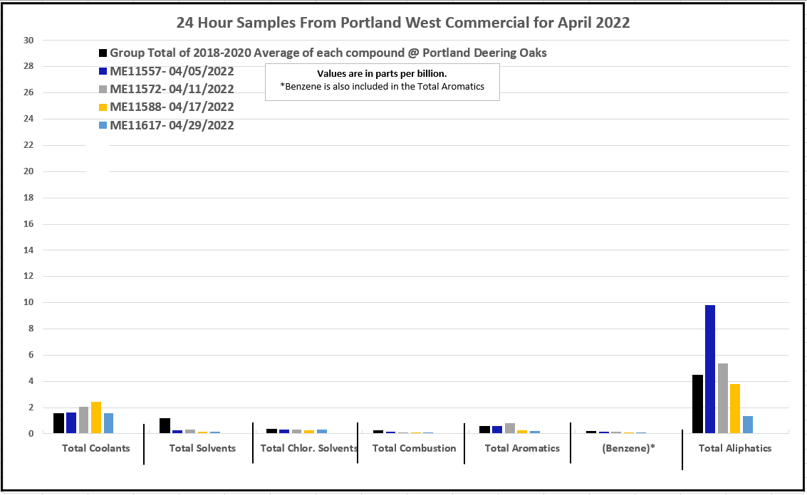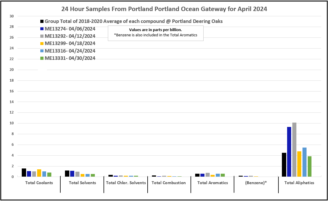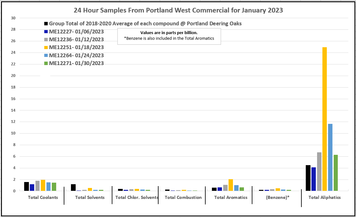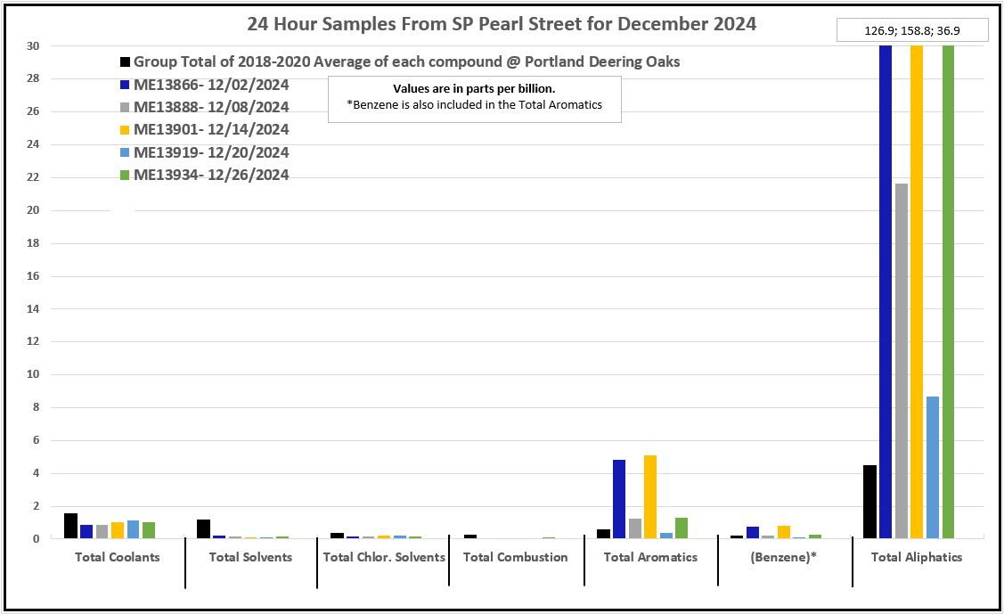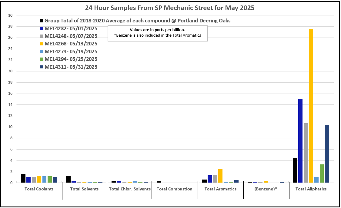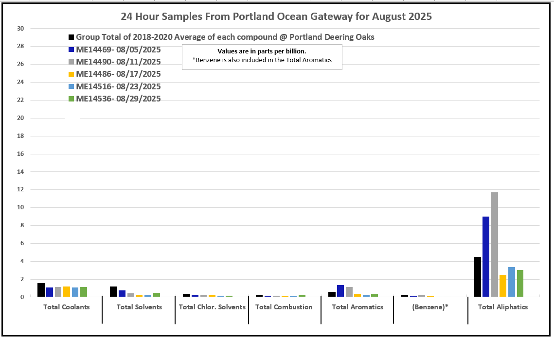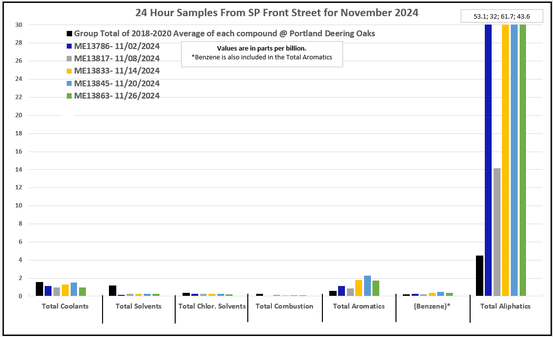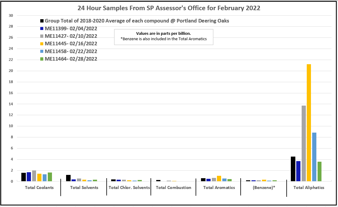CAUTION to grab sampling data users: It is not appropriate to use grab sample data for any comparison to longer term average (e.g. annual) levels, guidelines or standards for health assessment purposes. Staff from the Maine Center for Disease Control (CDC) gave a presentation (PDF) to the South Portland City Council on November 26, 2019 that describes and illustrates their approach to interpreting this data from a health perspective. The grab sample data charts we’ve created here are intended to simply be a visualization of each sample’s results from an air quality perspective, comparing them to the 2018 annual averages from our Portland Deering Oaks site, which for this purpose are being used as reference or background concentrations for the area.