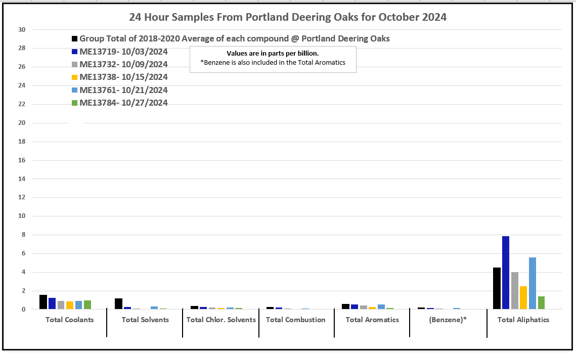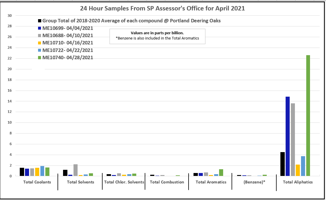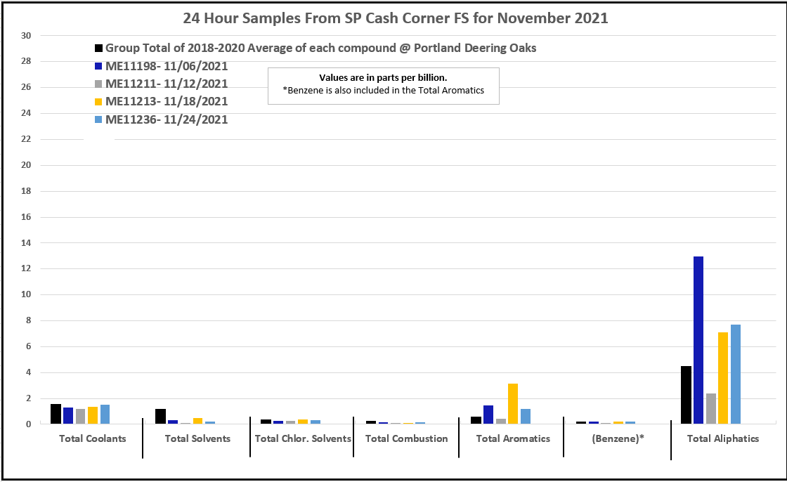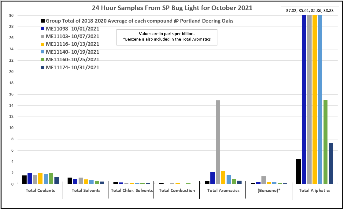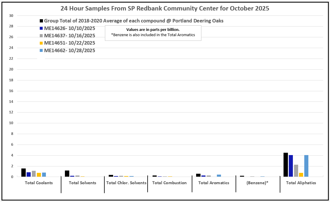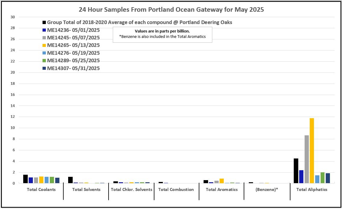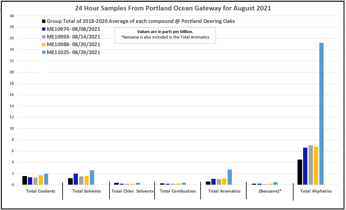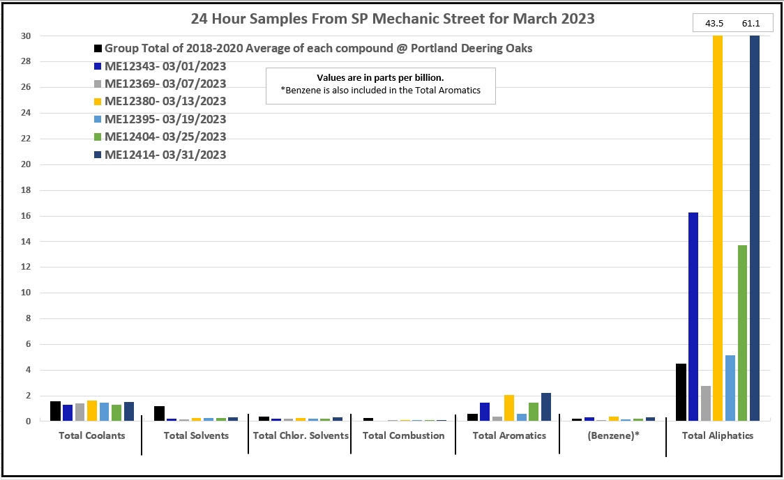 CAUTION to grab sampling data users: It is not appropriate to use grab sample data for any comparison to longer term average (e.g. annual) levels, guidelines or standards for health assessment purposes. Staff from the Maine Center for Disease Control (CDC) gave a presentation (PDF) to the South Portland City Council on November 26, 2019 that describes and illustrates their approach to interpreting this data from a health perspective. The grab sample data charts we’ve created here are intended to simply be a visualization of each sample’s results from an air quality perspective, comparing them to the 2018 annual averages from our Portland Deering Oaks site, which for this purpose are being used as reference or background concentrations for the area.