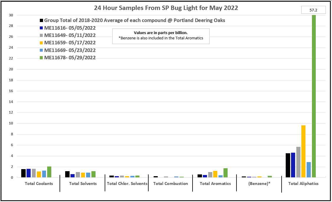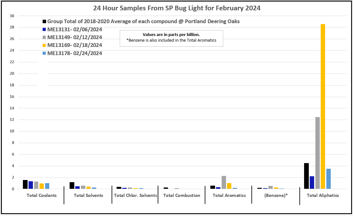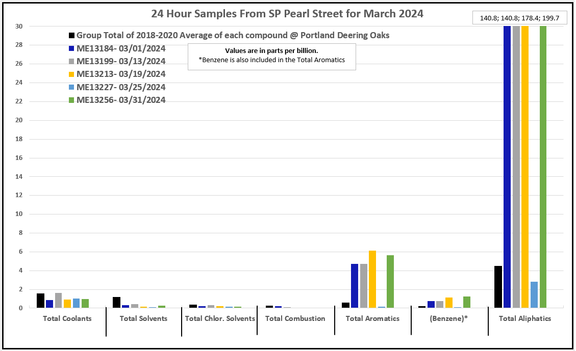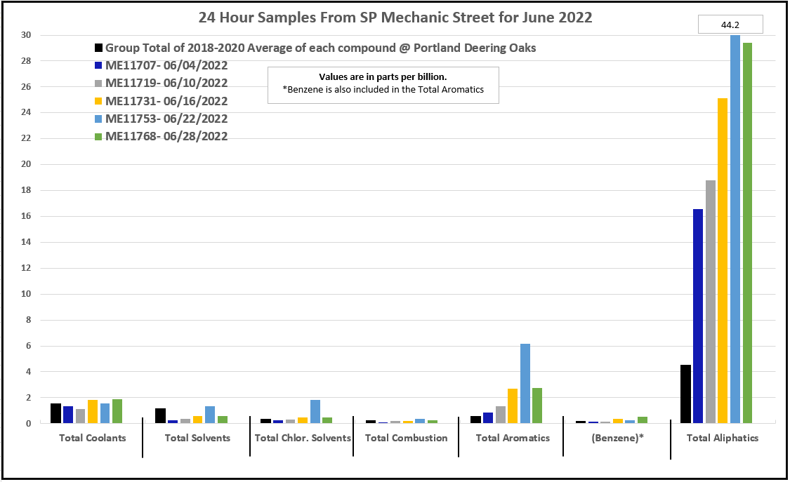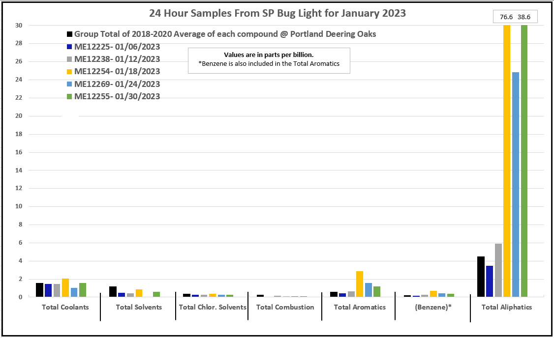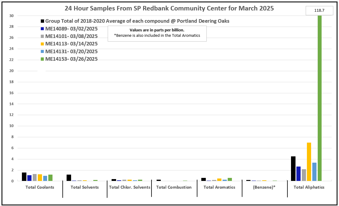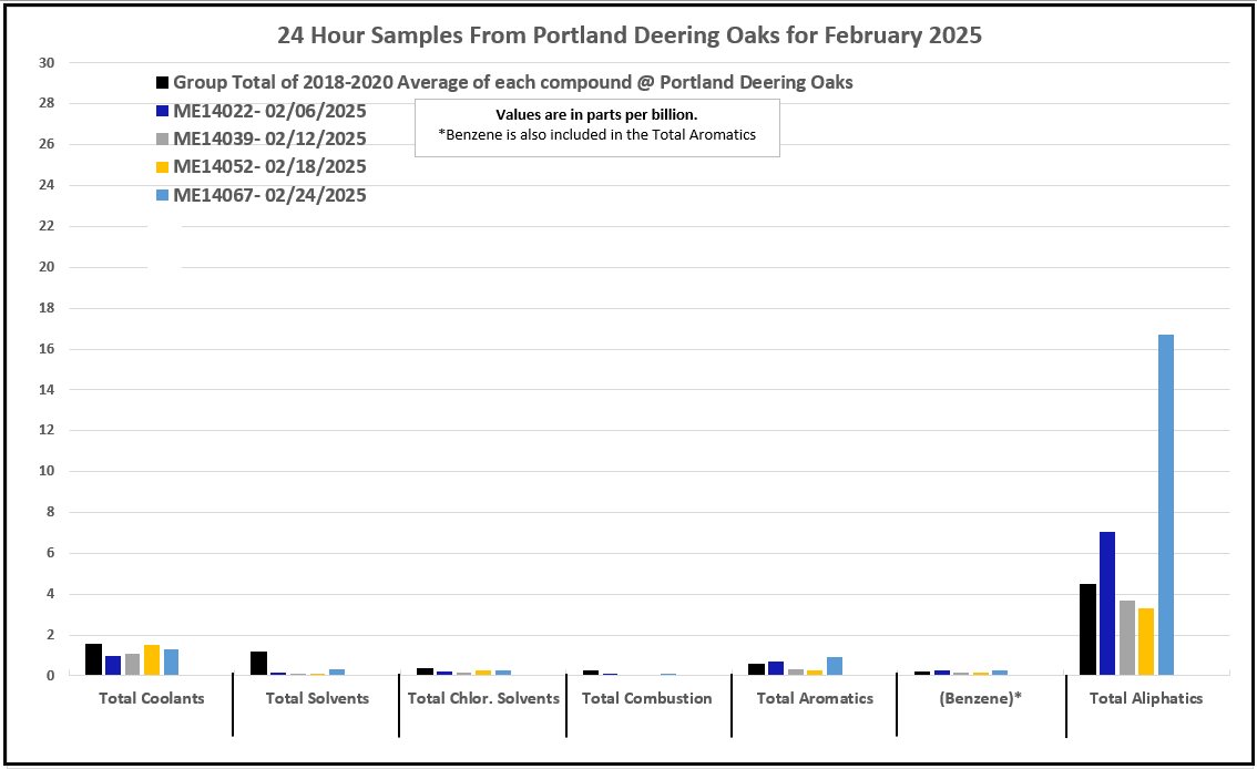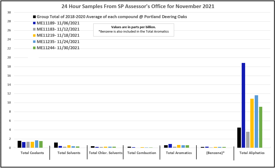 CAUTION to grab sampling data users: It is not appropriate to use grab sample data for any comparison to longer term average (e.g. annual) levels, guidelines or standards for health assessment purposes. Staff from the Maine Center for Disease Control (CDC) gave a presentation (PDF) to the South Portland City Council on November 26, 2019 that describes and illustrates their approach to interpreting this data from a health perspective. The grab sample data charts we’ve created here are intended to simply be a visualization of each sample’s results from an air quality perspective, comparing them to the 2018 annual averages from our Portland Deering Oaks site, which for this purpose are being used as reference or background concentrations for the area.