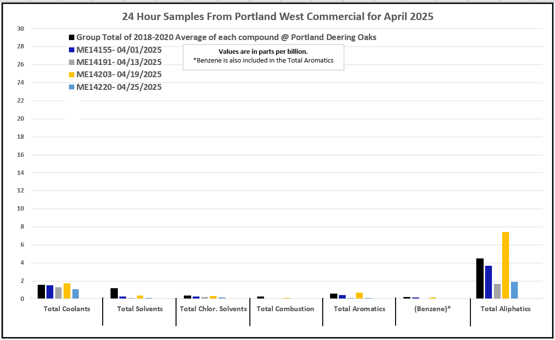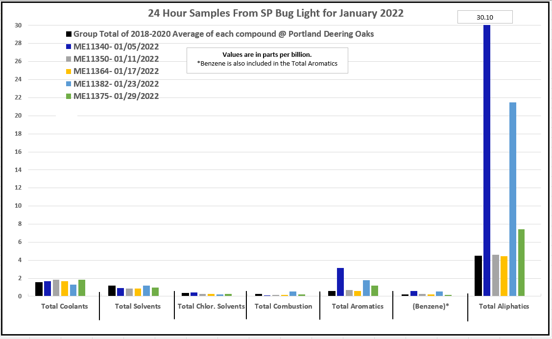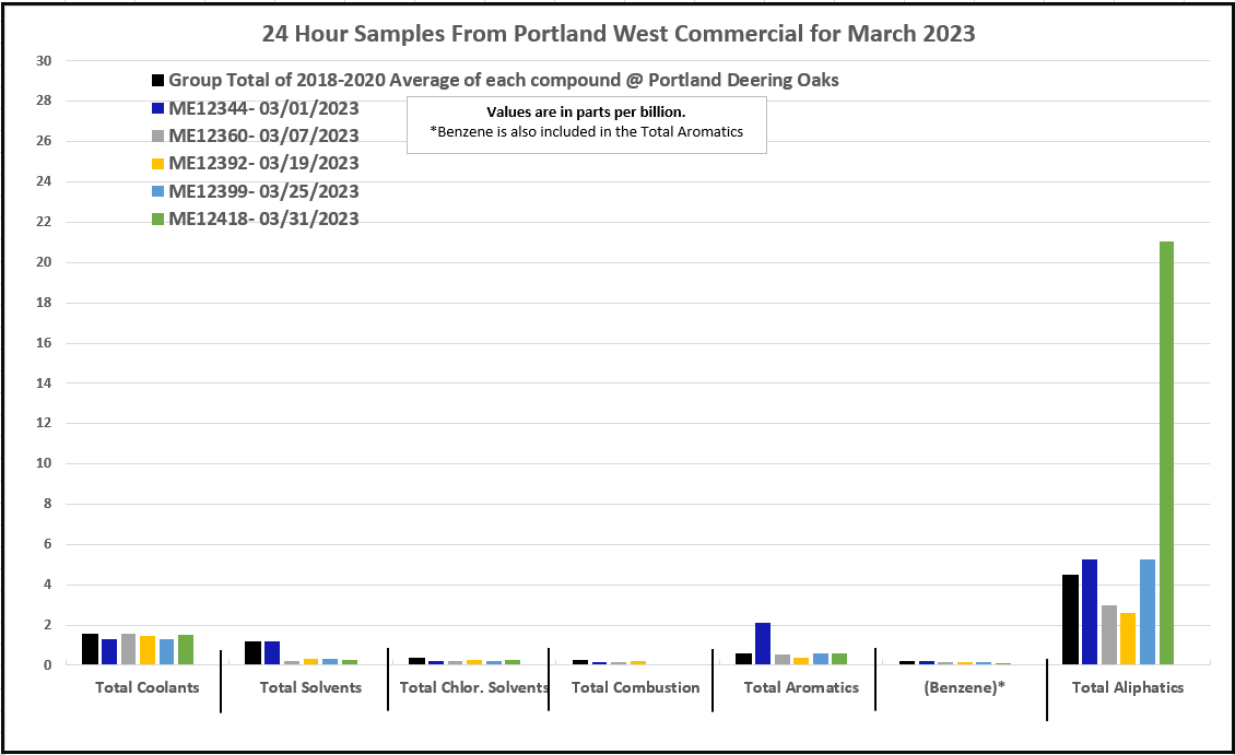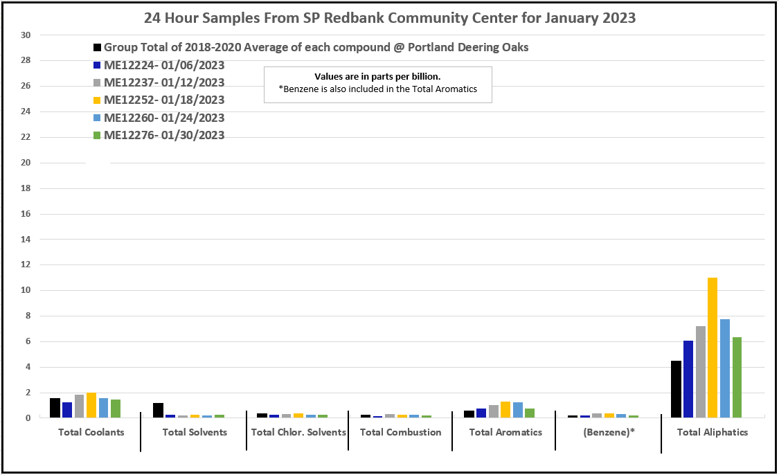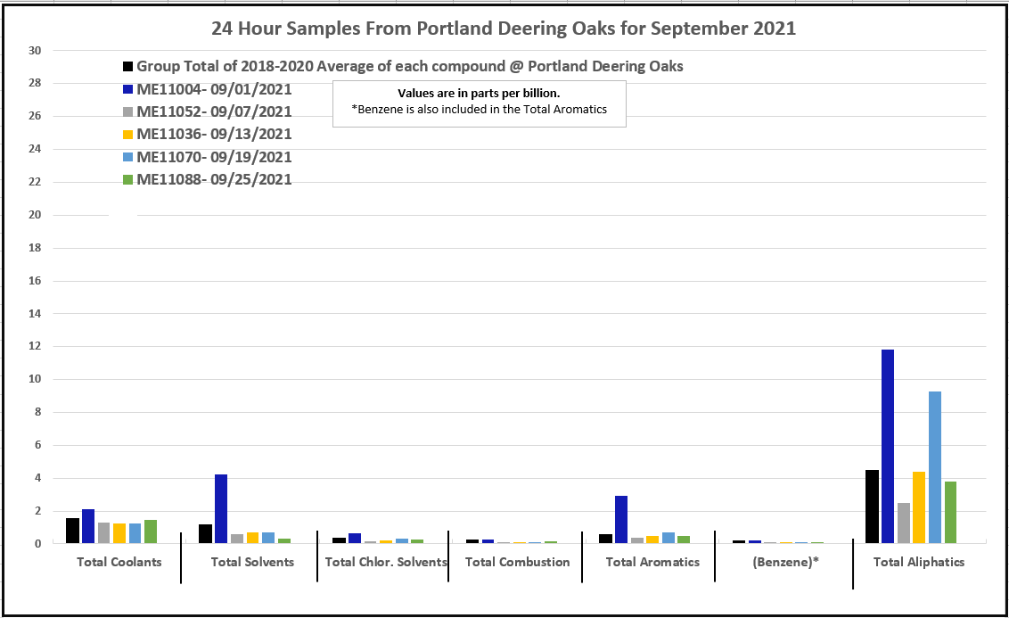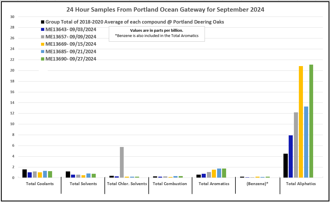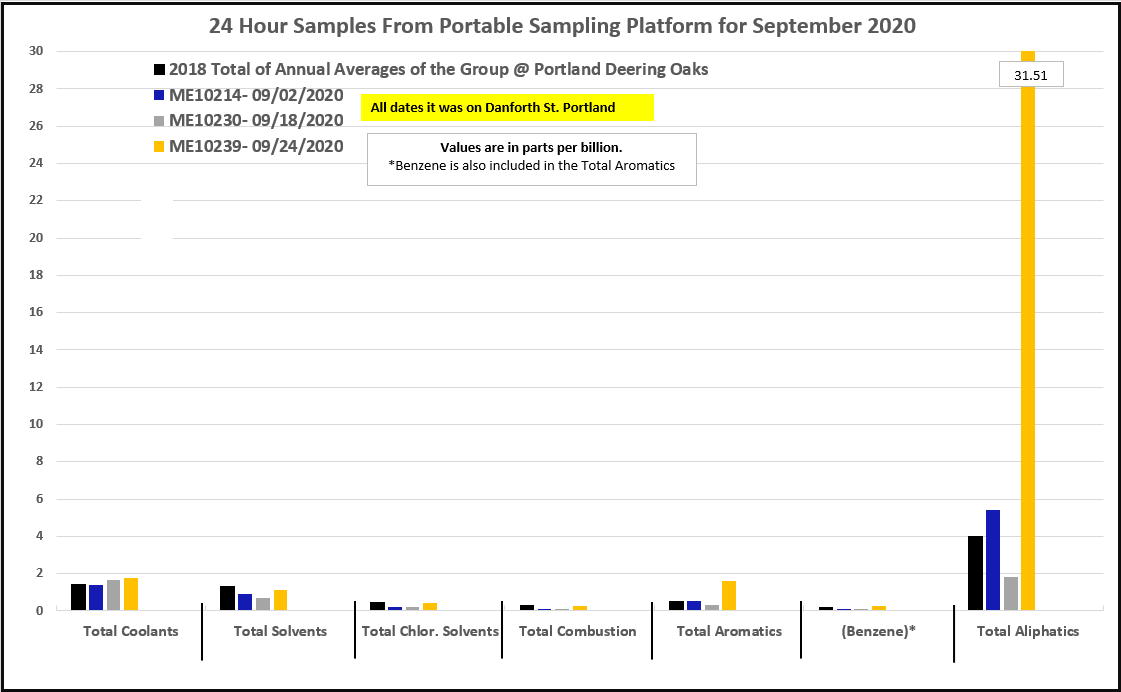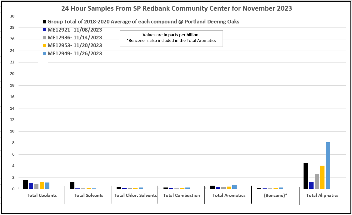 CAUTION to grab sampling data users: It is not appropriate to use grab sample data for any comparison to longer term average (e.g. annual) levels, guidelines or standards for health assessment purposes. Staff from the Maine Center for Disease Control (CDC) gave a presentation (PDF) to the South Portland City Council on November 26, 2019 that describes and illustrates their approach to interpreting this data from a health perspective. The grab sample data charts we’ve created here are intended to simply be a visualization of each sample’s results from an air quality perspective, comparing them to the 2018 annual averages from our Portland Deering Oaks site, which for this purpose are being used as reference or background concentrations for the area.