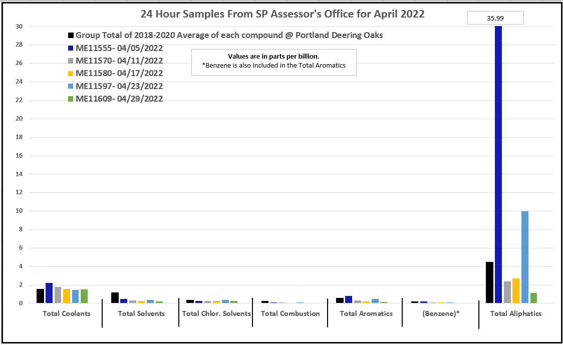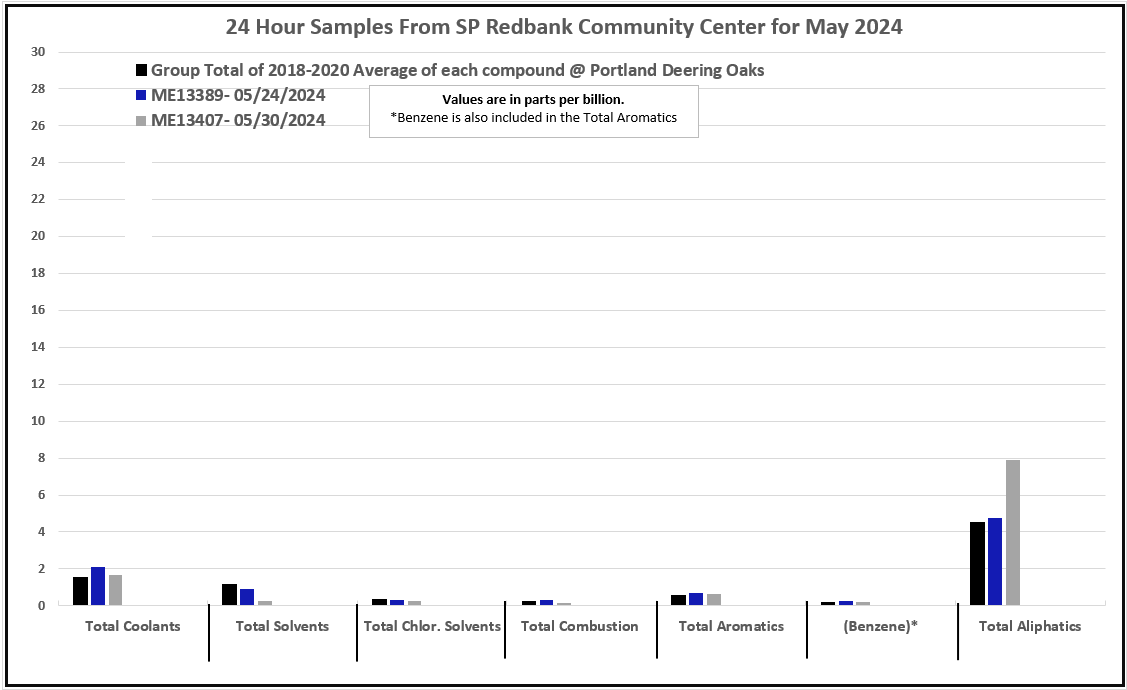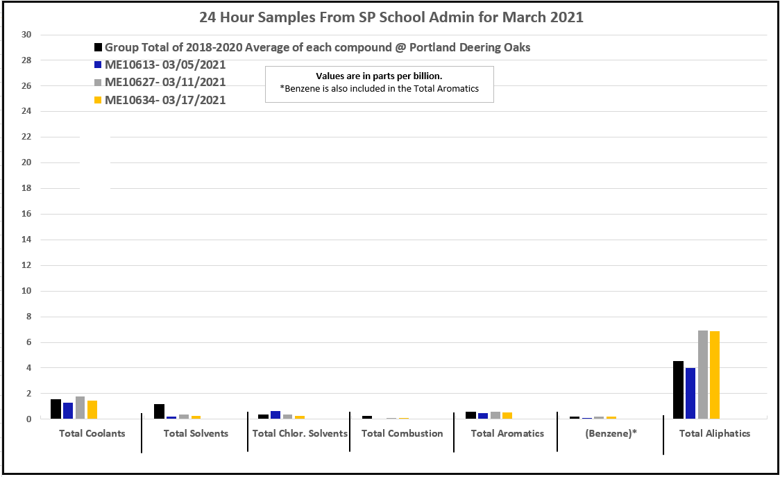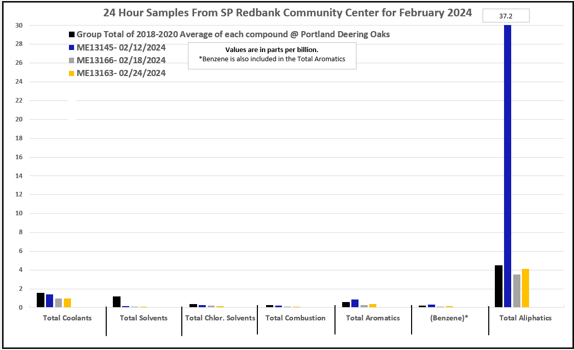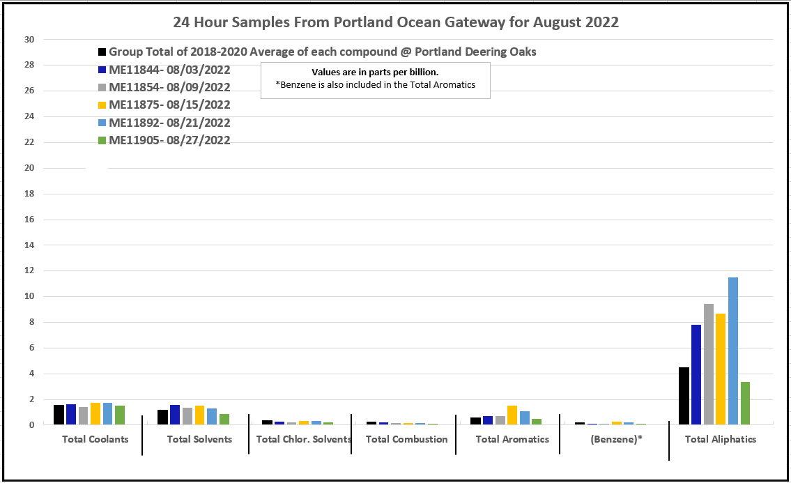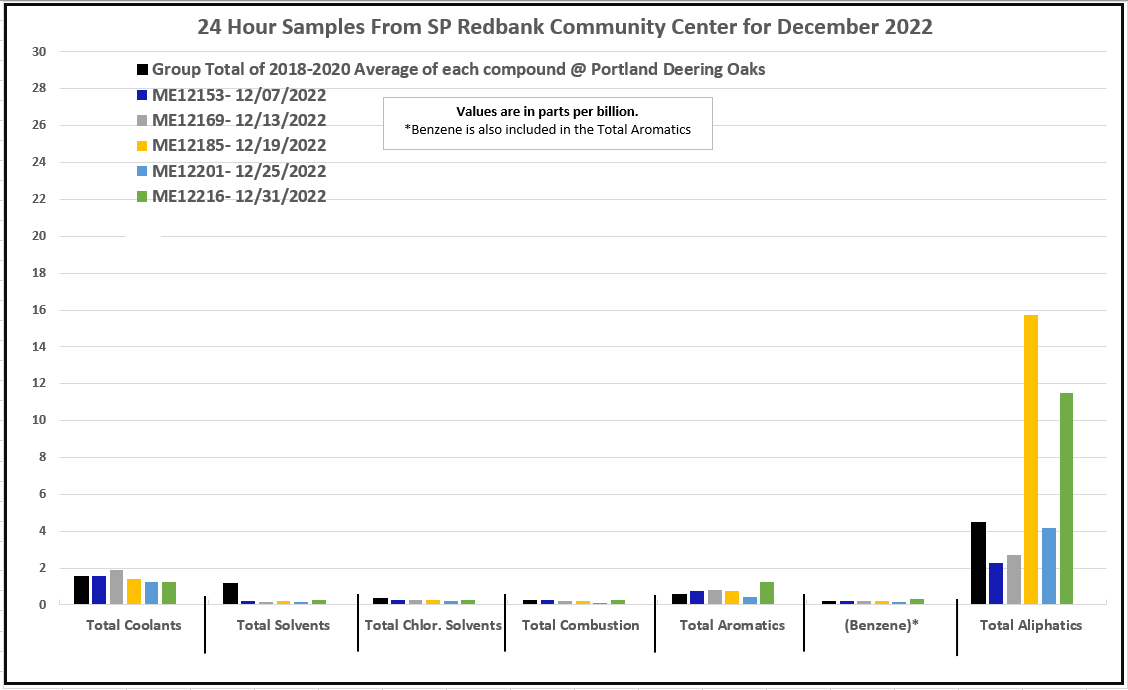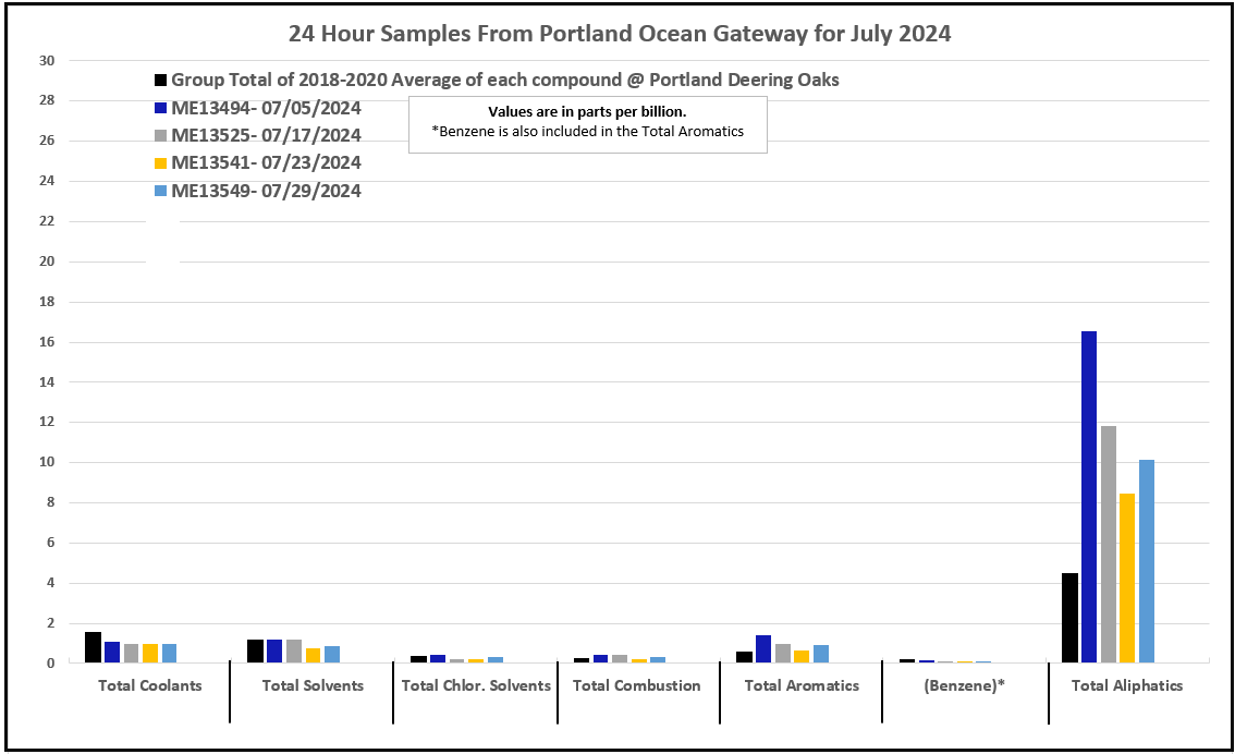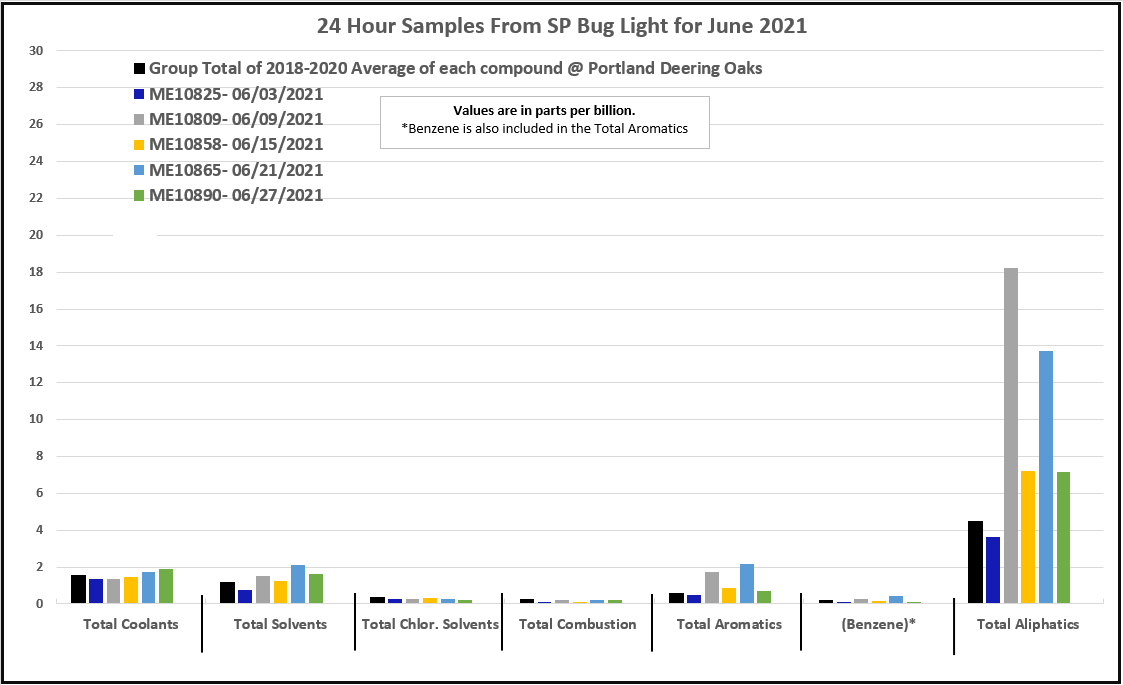 CAUTION to grab sampling data users: It is not appropriate to use grab sample data for any comparison to longer term average (e.g. annual) levels, guidelines or standards for health assessment purposes. Staff from the Maine Center for Disease Control (CDC) gave a presentation (PDF) to the South Portland City Council on November 26, 2019 that describes and illustrates their approach to interpreting this data from a health perspective. The grab sample data charts we’ve created here are intended to simply be a visualization of each sample’s results from an air quality perspective, comparing them to the 2018 annual averages from our Portland Deering Oaks site, which for this purpose are being used as reference or background concentrations for the area.