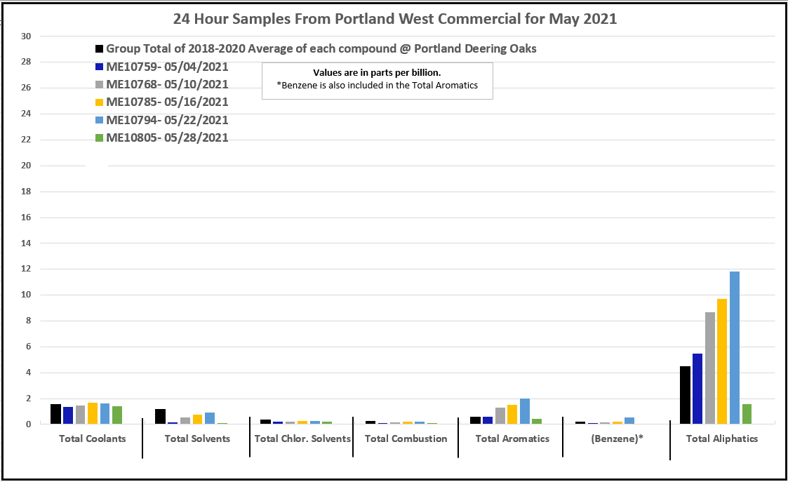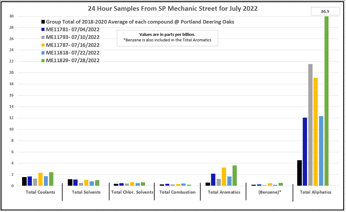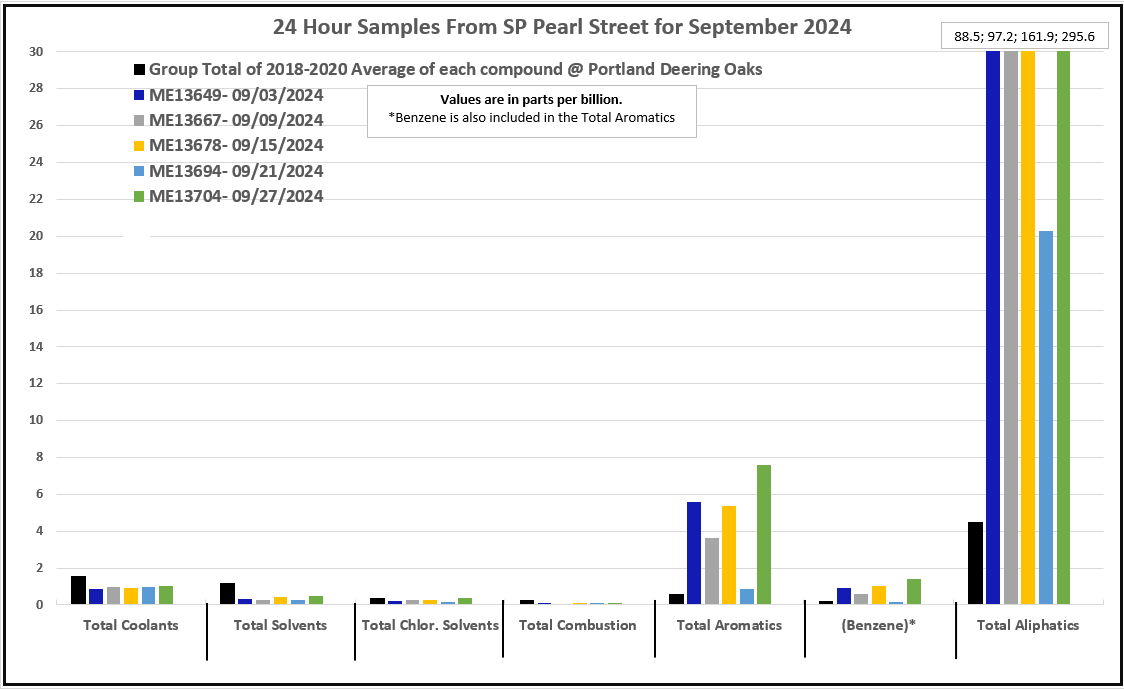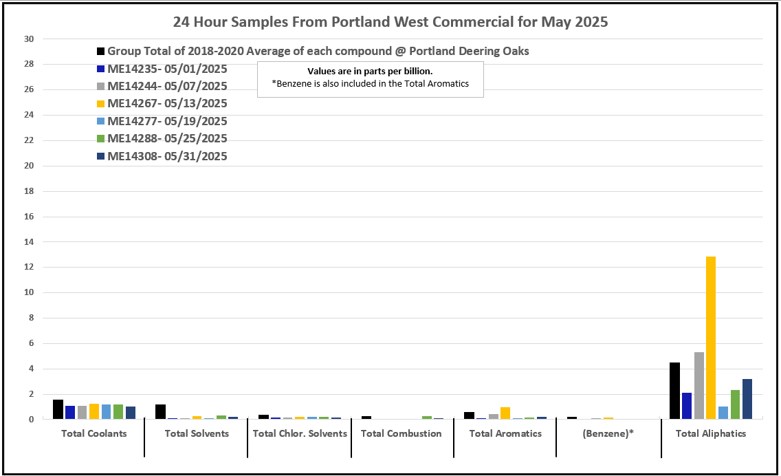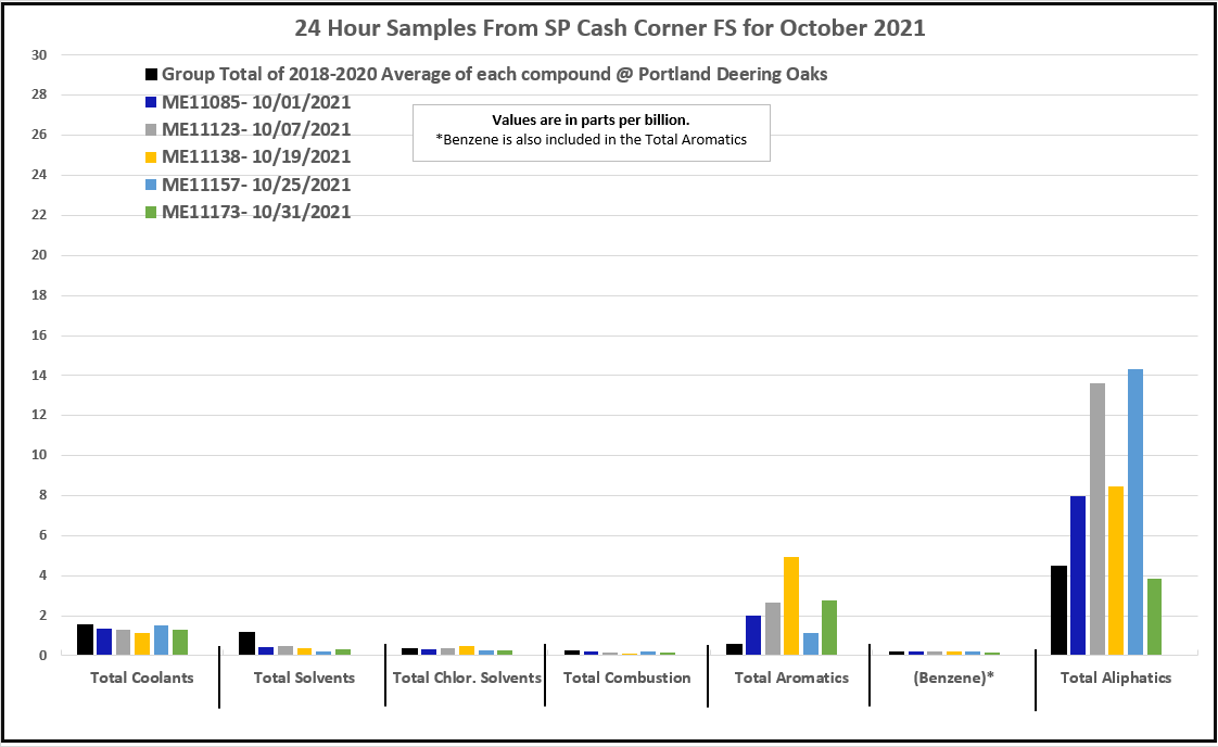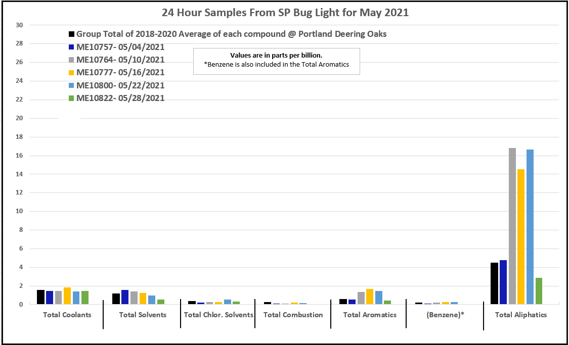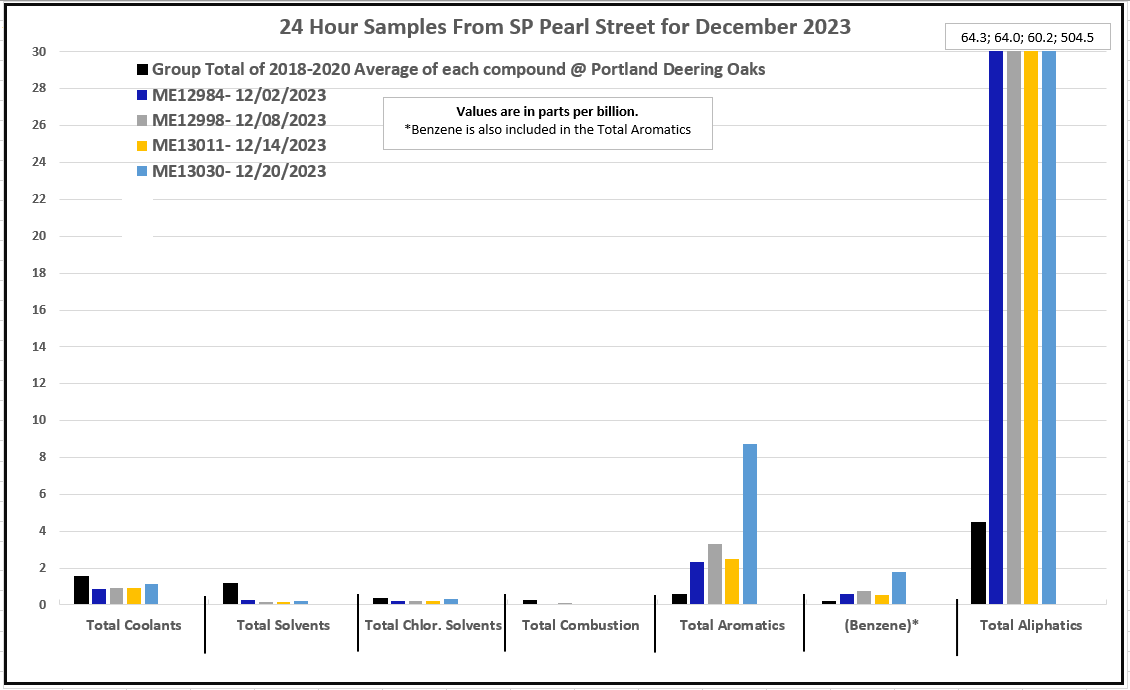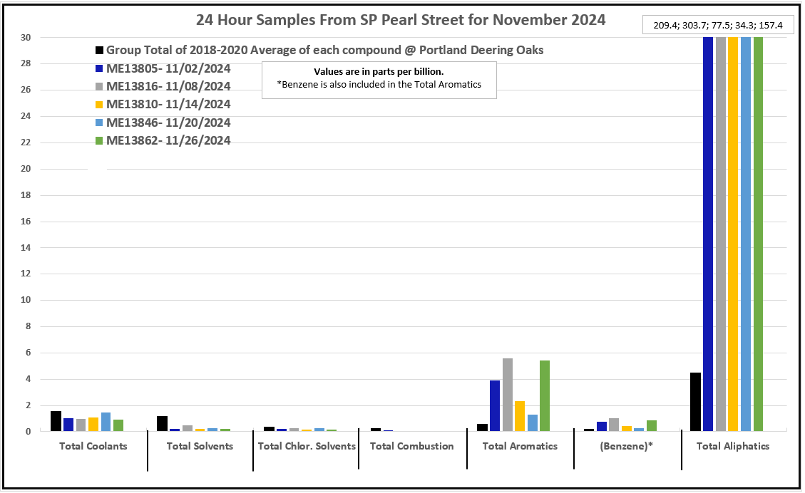 CAUTION to grab sampling data users: It is not appropriate to use grab sample data for any comparison to longer term average (e.g. annual) levels, guidelines or standards for health assessment purposes. Staff from the Maine Center for Disease Control (CDC) gave a presentation (PDF) to the South Portland City Council on November 26, 2019 that describes and illustrates their approach to interpreting this data from a health perspective. The grab sample data charts we’ve created here are intended to simply be a visualization of each sample’s results from an air quality perspective, comparing them to the 2018 annual averages from our Portland Deering Oaks site, which for this purpose are being used as reference or background concentrations for the area.