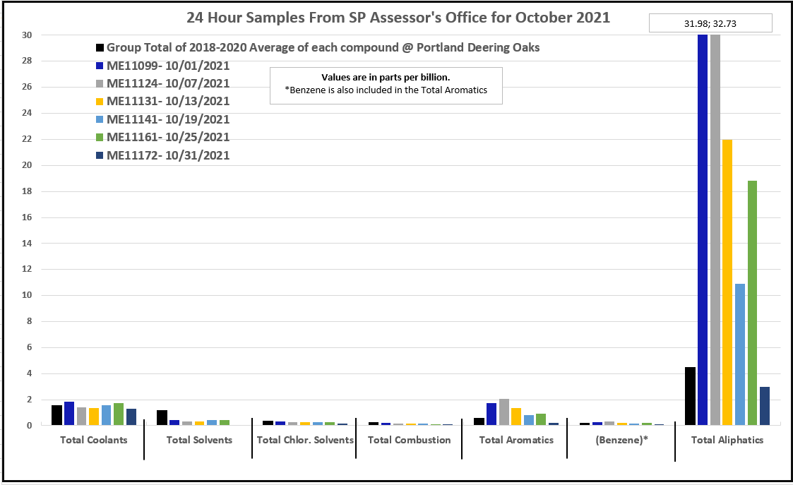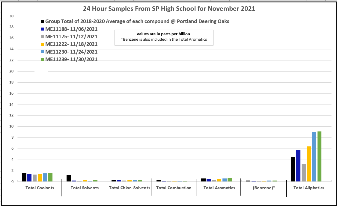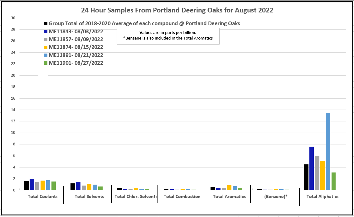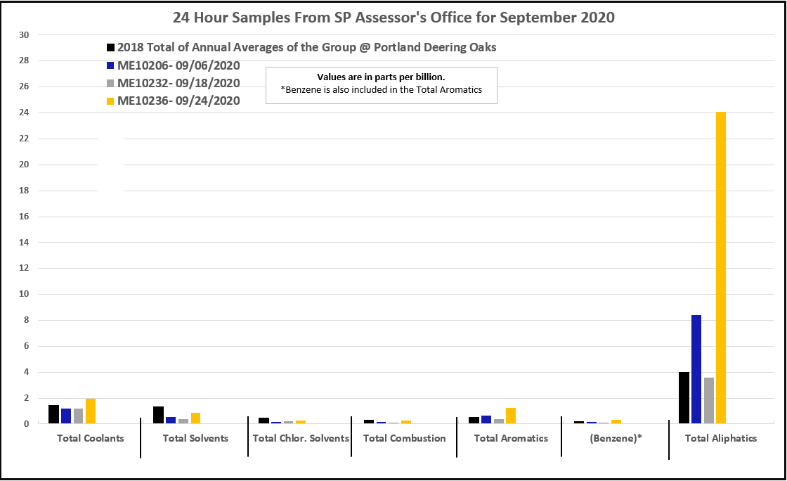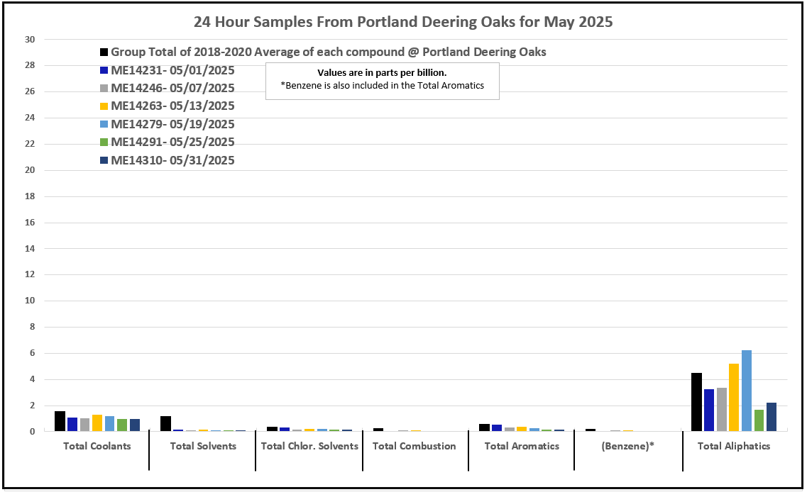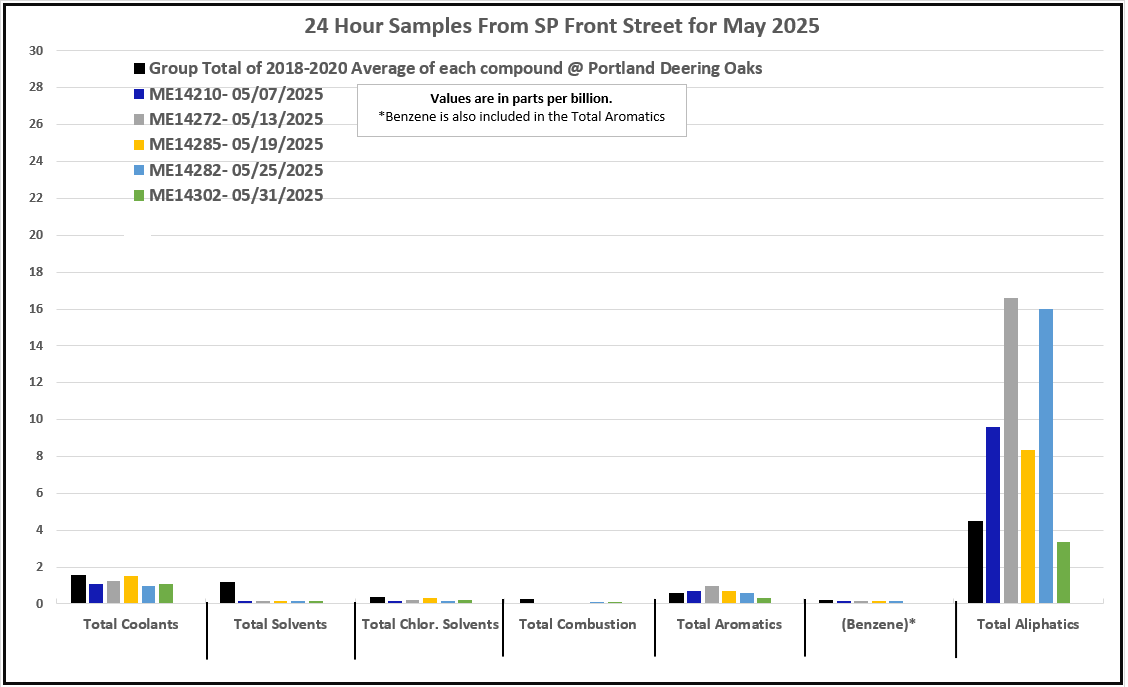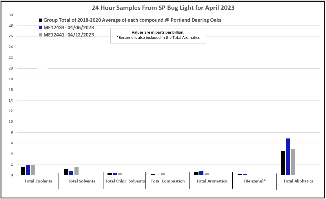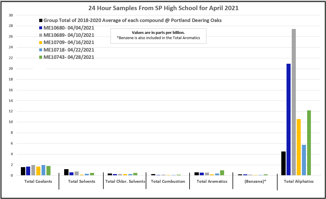 CAUTION to grab sampling data users: It is not appropriate to use grab sample data for any comparison to longer term average (e.g. annual) levels, guidelines or standards for health assessment purposes. Staff from the Maine Center for Disease Control (CDC) gave a presentation (PDF) to the South Portland City Council on November 26, 2019 that describes and illustrates their approach to interpreting this data from a health perspective. The grab sample data charts we’ve created here are intended to simply be a visualization of each sample’s results from an air quality perspective, comparing them to the 2018 annual averages from our Portland Deering Oaks site, which for this purpose are being used as reference or background concentrations for the area.