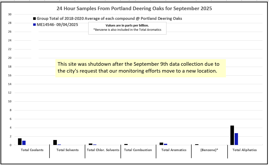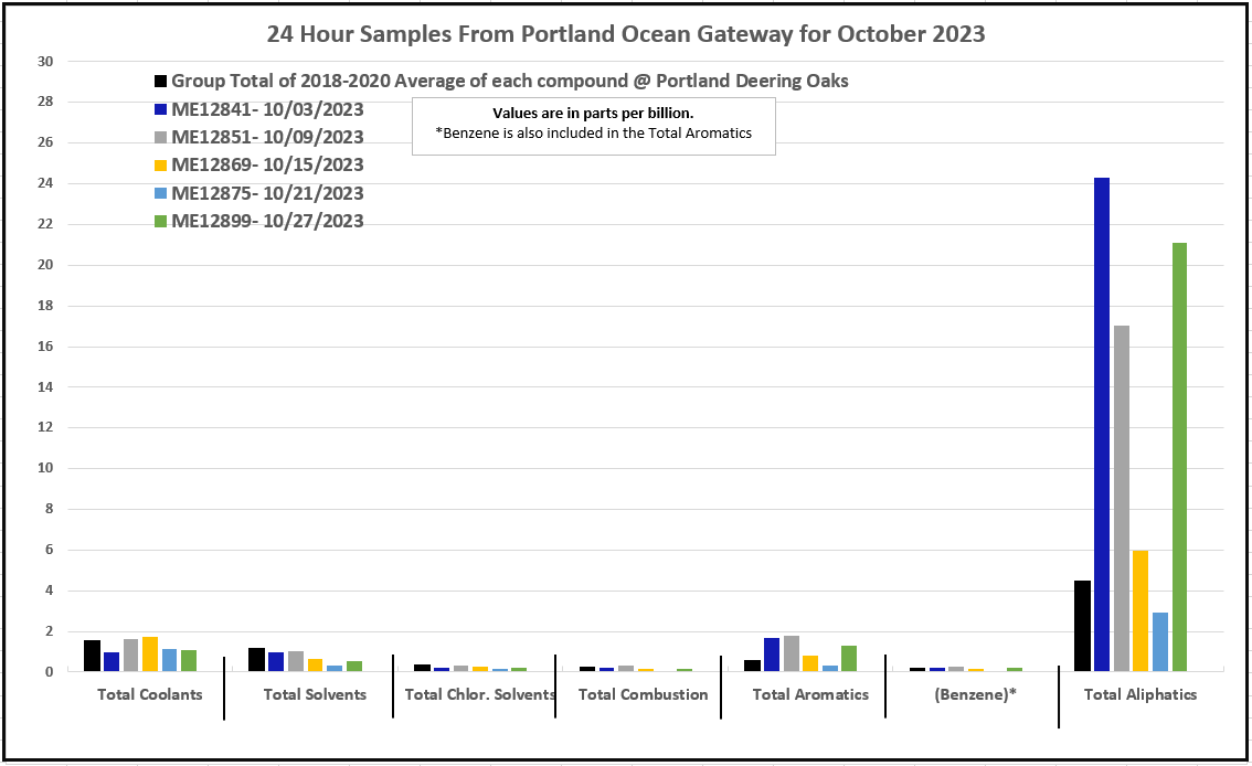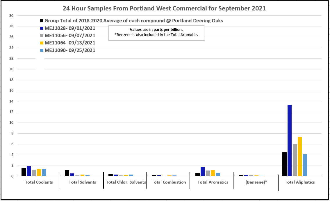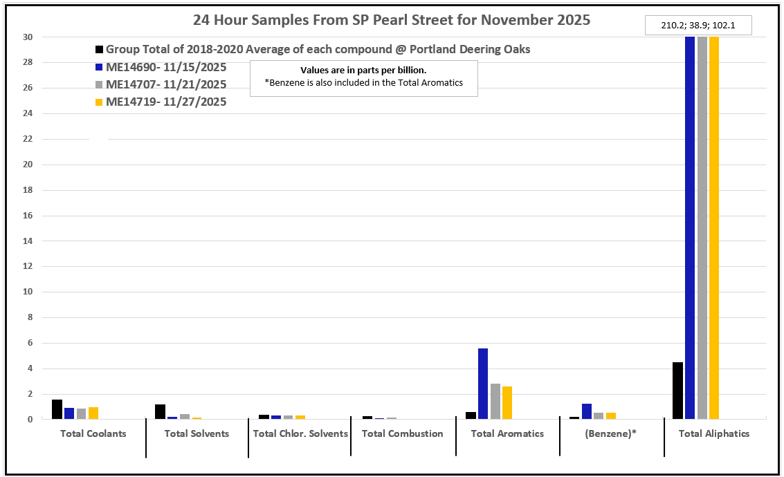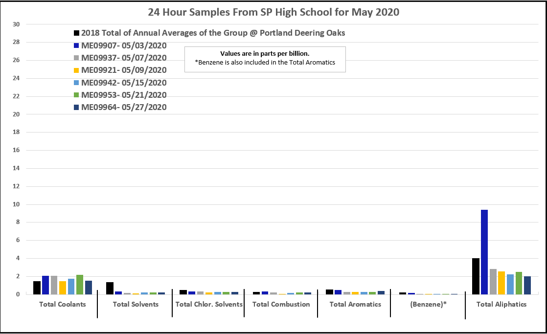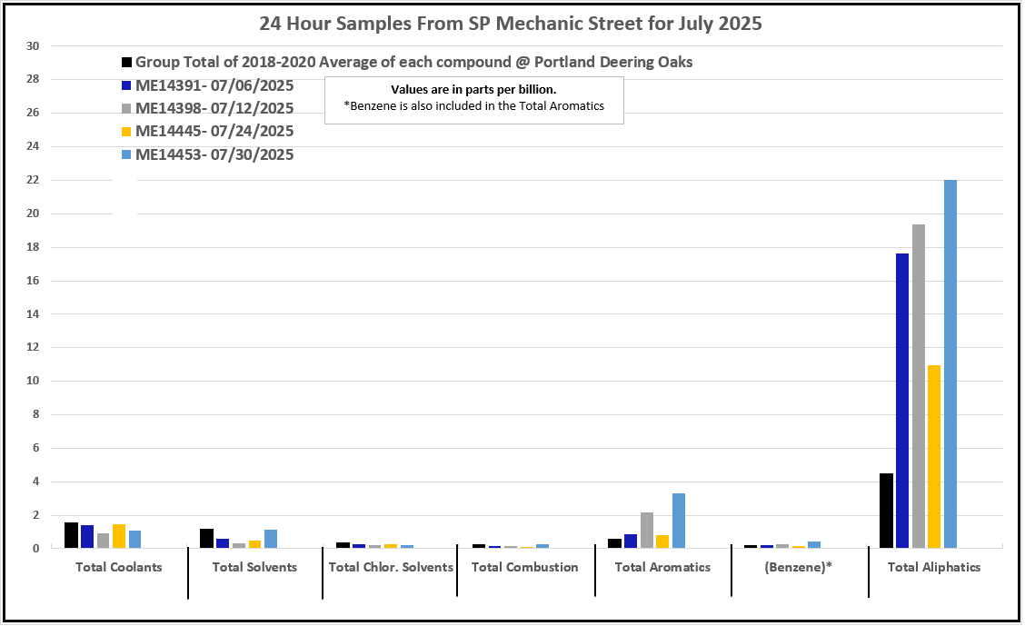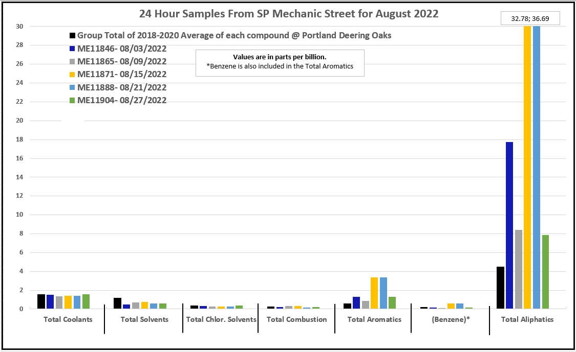 CAUTION to grab sampling data users: It is not appropriate to use grab sample data for any comparison to longer term average (e.g. annual) levels, guidelines or standards for health assessment purposes. Staff from the Maine Center for Disease Control (CDC) gave a presentation (PDF) to the South Portland City Council on November 26, 2019 that describes and illustrates their approach to interpreting this data from a health perspective. The grab sample data charts we’ve created here are intended to simply be a visualization of each sample’s results from an air quality perspective, comparing them to the 2018 annual averages from our Portland Deering Oaks site, which for this purpose are being used as reference or background concentrations for the area.