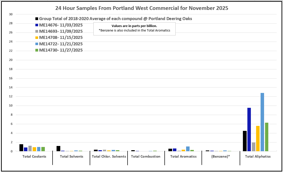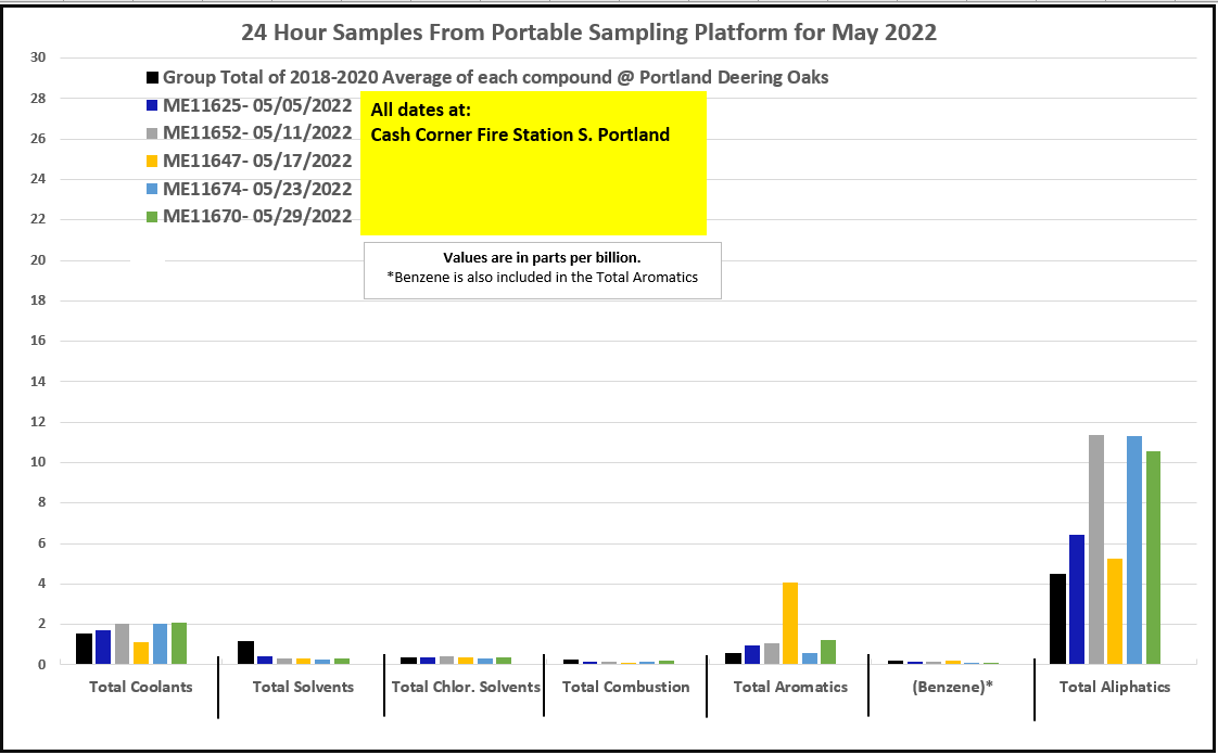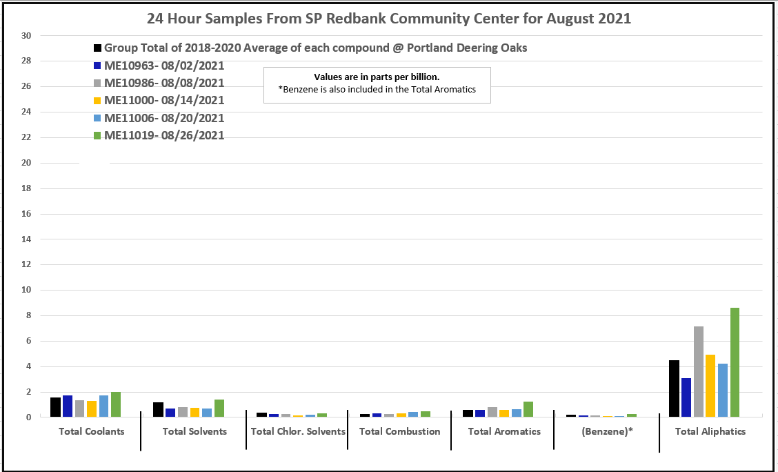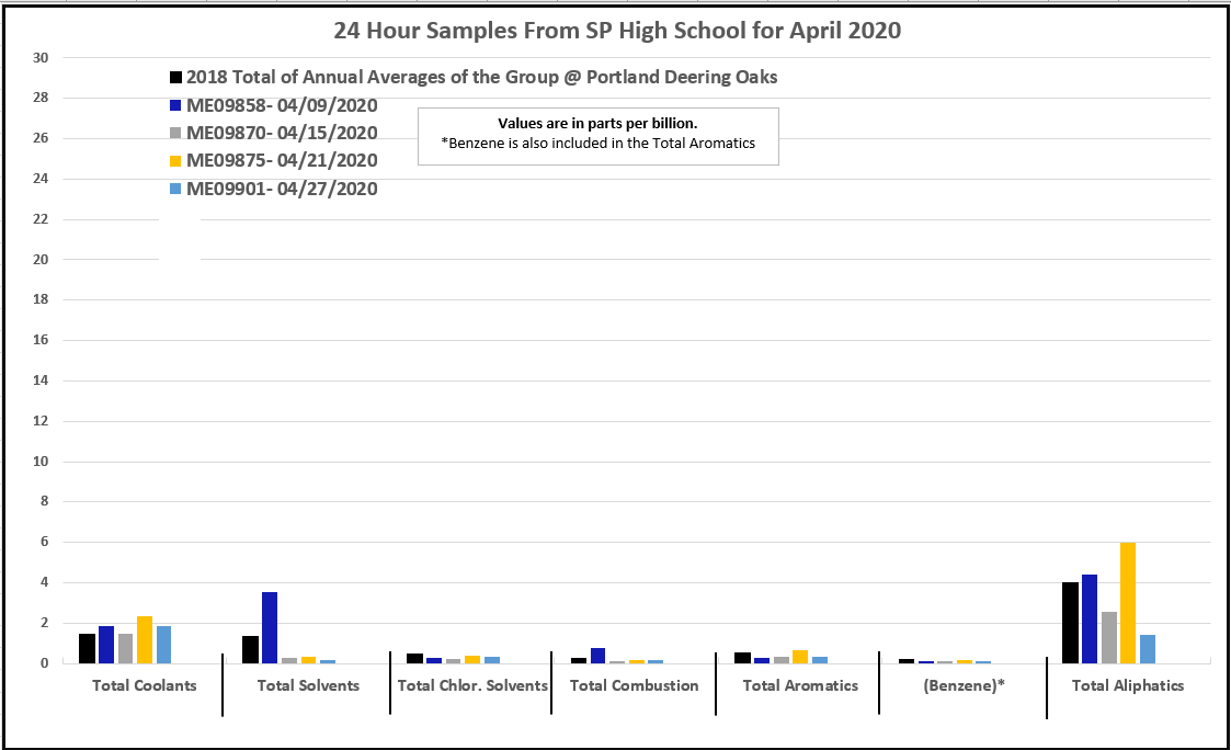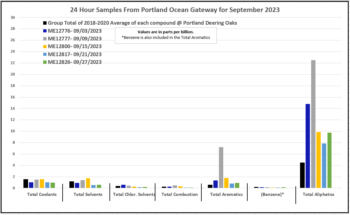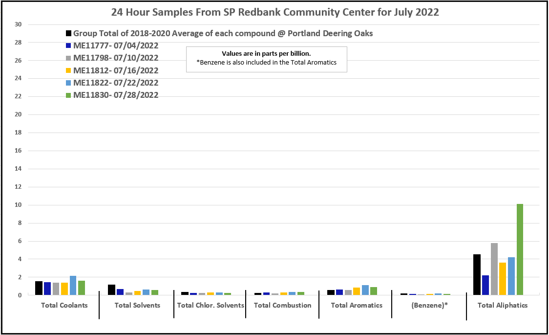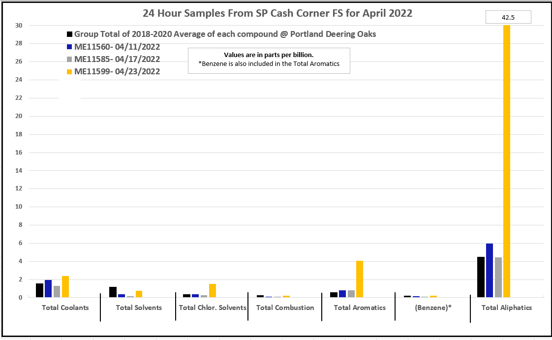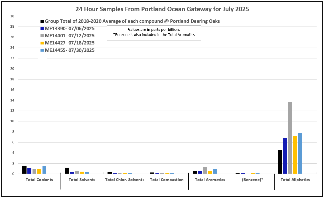 CAUTION to grab sampling data users: It is not appropriate to use grab sample data for any comparison to longer term average (e.g. annual) levels, guidelines or standards for health assessment purposes. Staff from the Maine Center for Disease Control (CDC) gave a presentation (PDF) to the South Portland City Council on November 26, 2019 that describes and illustrates their approach to interpreting this data from a health perspective. The grab sample data charts we’ve created here are intended to simply be a visualization of each sample’s results from an air quality perspective, comparing them to the 2018 annual averages from our Portland Deering Oaks site, which for this purpose are being used as reference or background concentrations for the area.