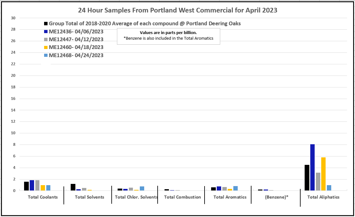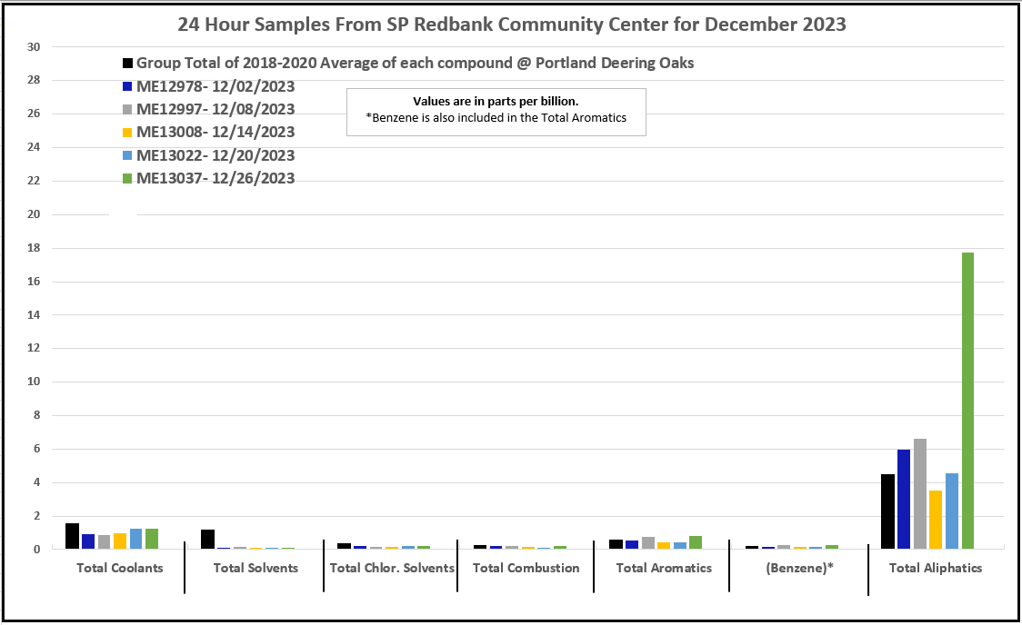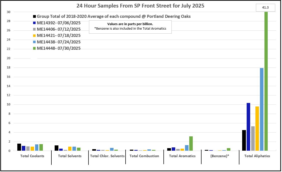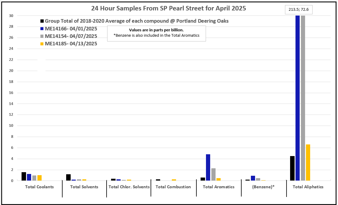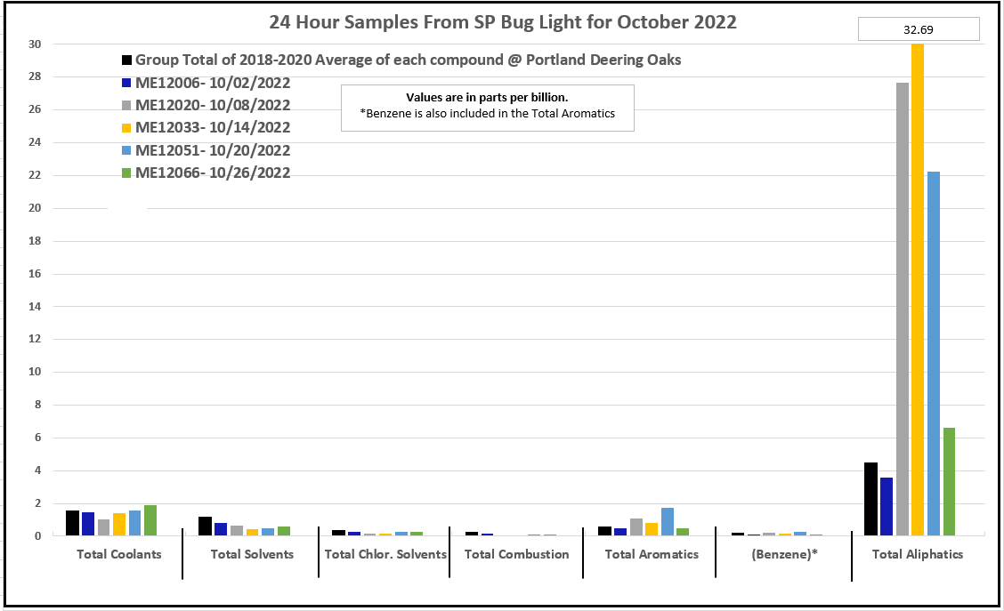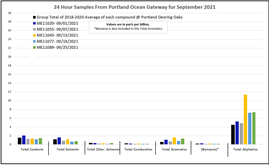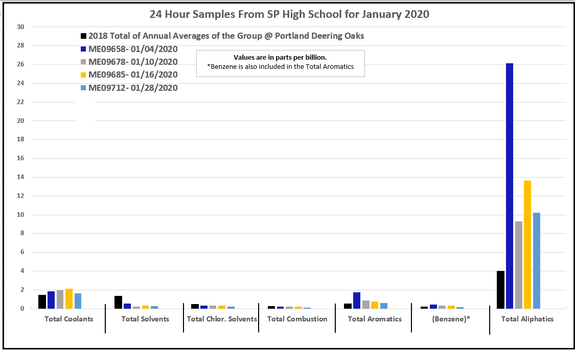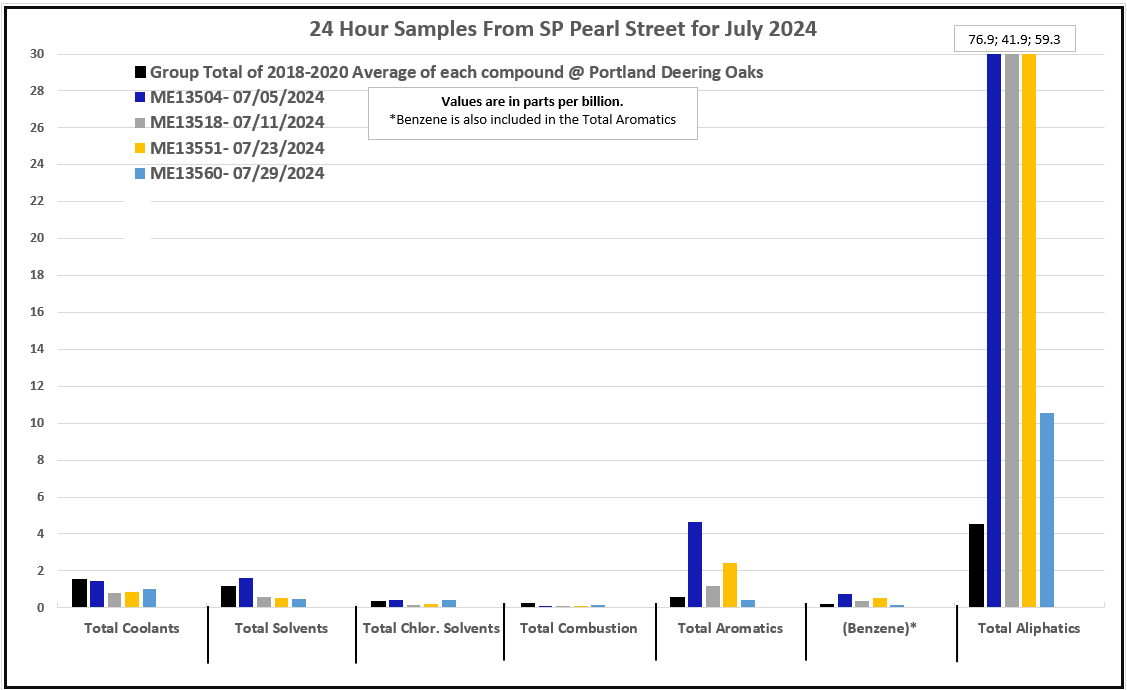 CAUTION to grab sampling data users: It is not appropriate to use grab sample data for any comparison to longer term average (e.g. annual) levels, guidelines or standards for health assessment purposes. Staff from the Maine Center for Disease Control (CDC) gave a presentation (PDF) to the South Portland City Council on November 26, 2019 that describes and illustrates their approach to interpreting this data from a health perspective. The grab sample data charts we’ve created here are intended to simply be a visualization of each sample’s results from an air quality perspective, comparing them to the 2018 annual averages from our Portland Deering Oaks site, which for this purpose are being used as reference or background concentrations for the area.