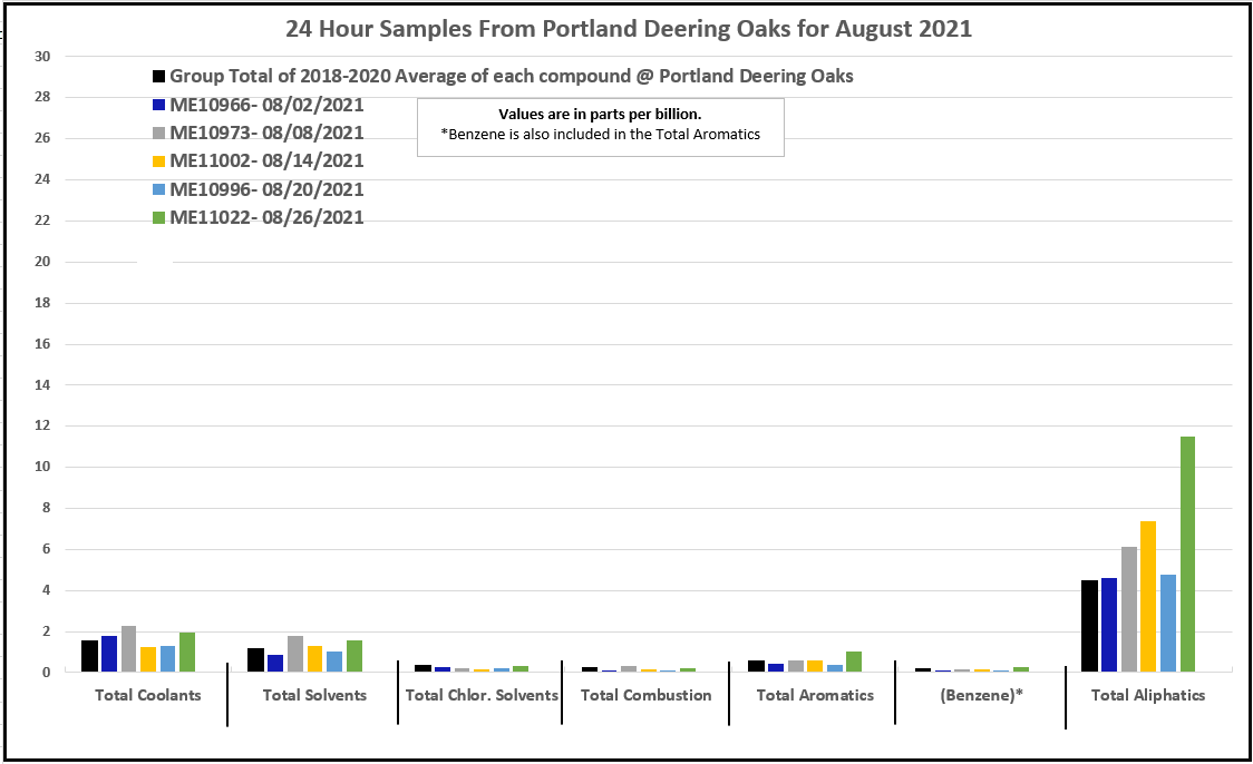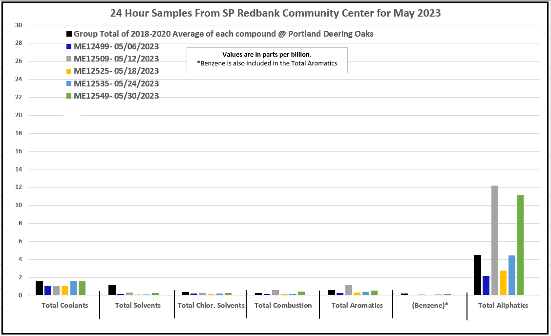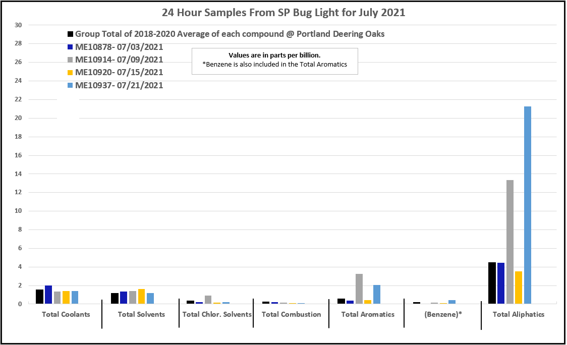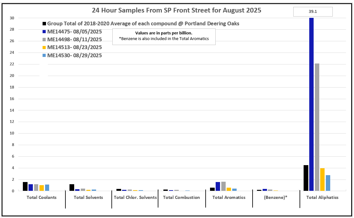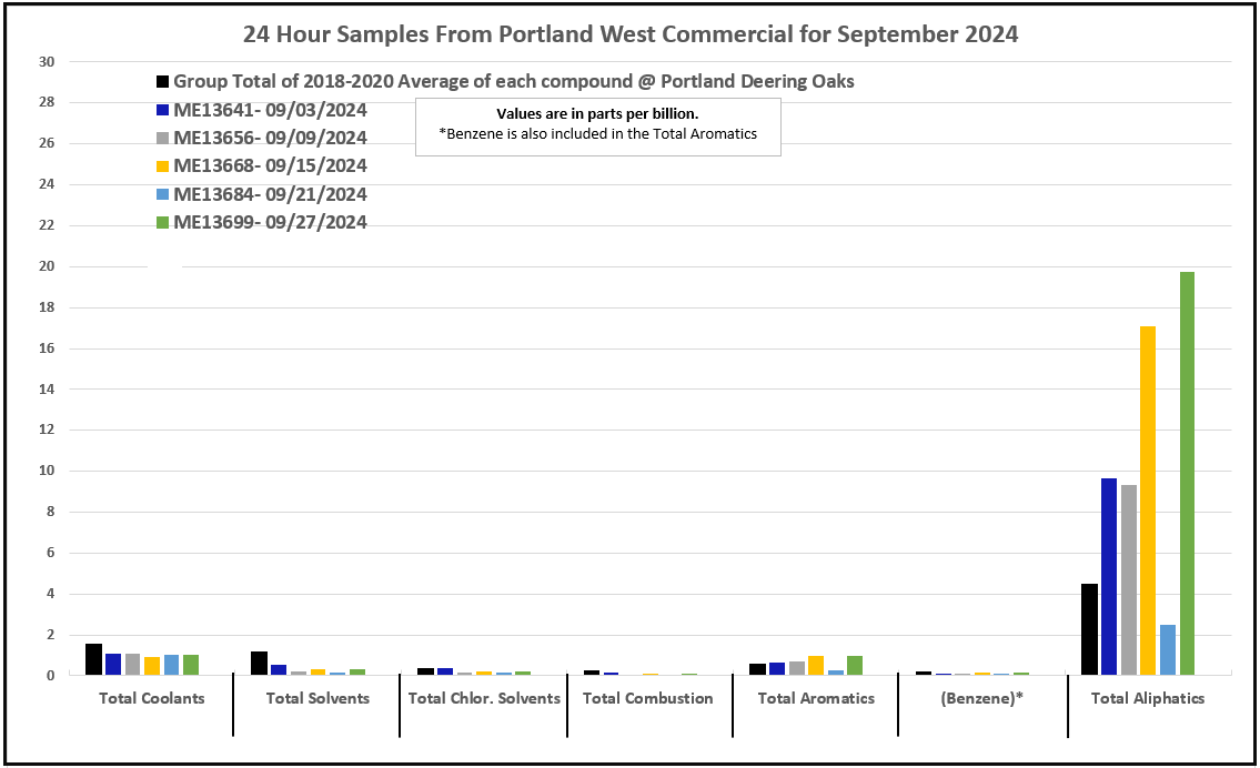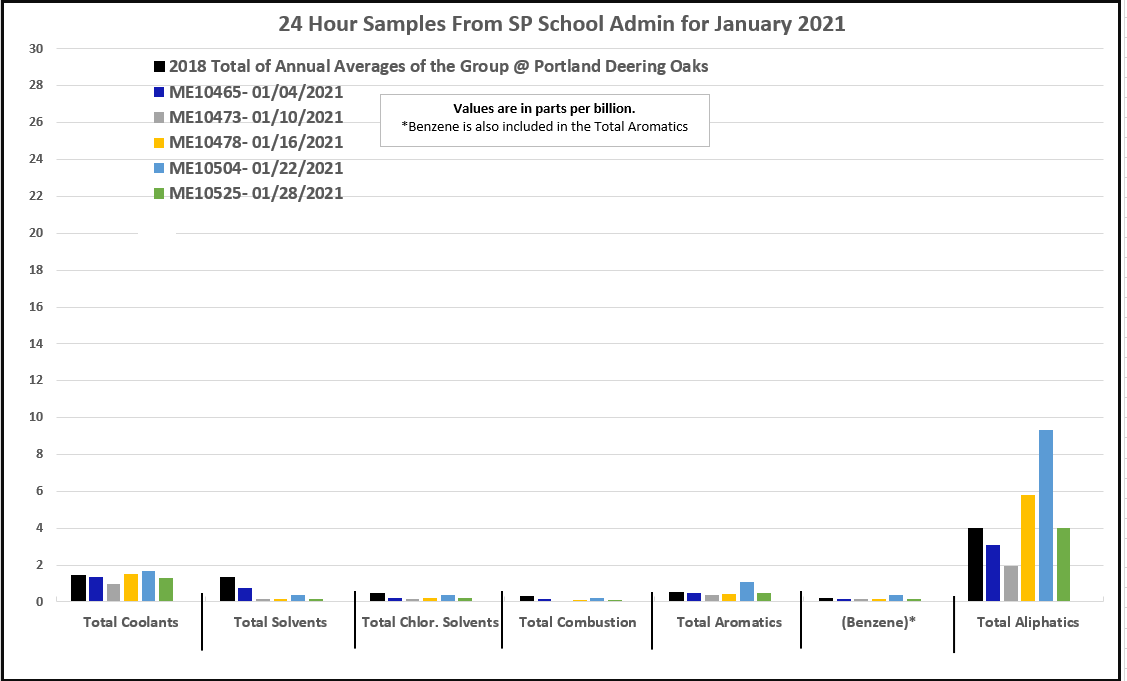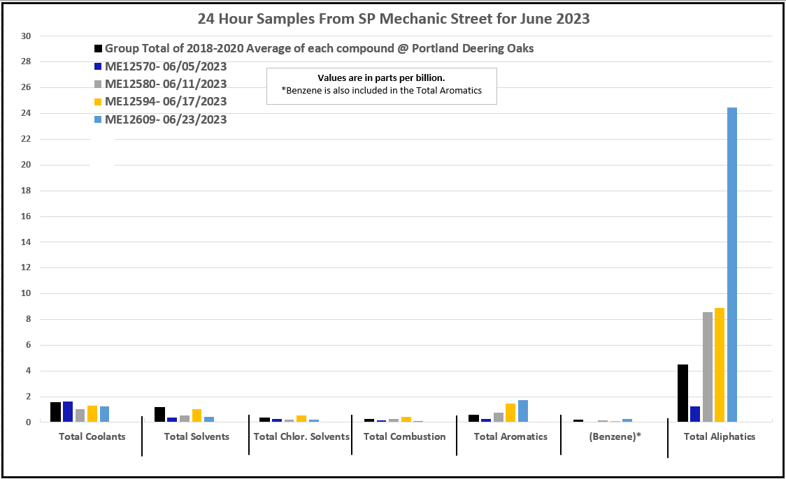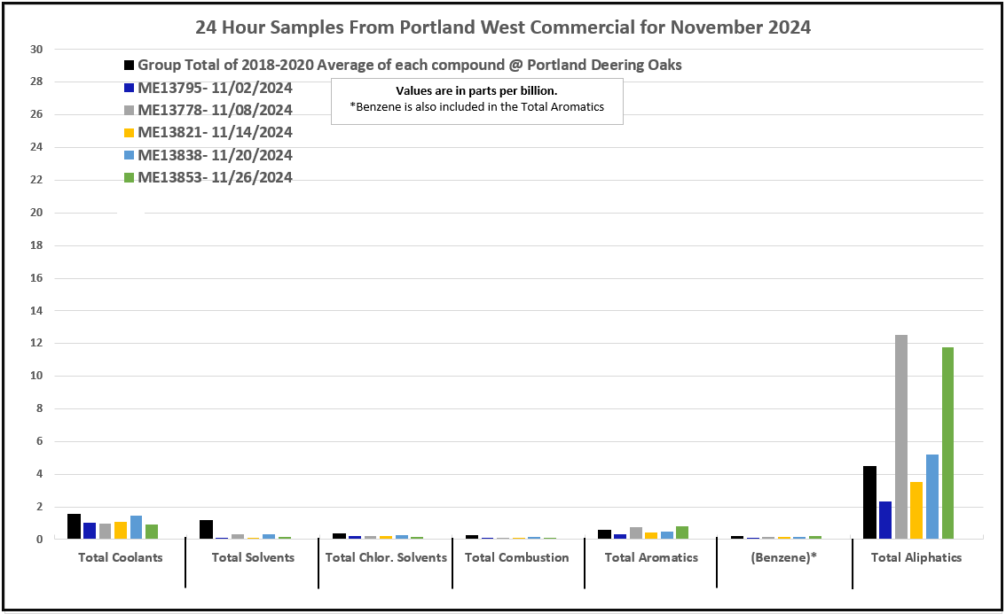 CAUTION to grab sampling data users: It is not appropriate to use grab sample data for any comparison to longer term average (e.g. annual) levels, guidelines or standards for health assessment purposes. Staff from the Maine Center for Disease Control (CDC) gave a presentation (PDF) to the South Portland City Council on November 26, 2019 that describes and illustrates their approach to interpreting this data from a health perspective. The grab sample data charts we’ve created here are intended to simply be a visualization of each sample’s results from an air quality perspective, comparing them to the 2018 annual averages from our Portland Deering Oaks site, which for this purpose are being used as reference or background concentrations for the area.