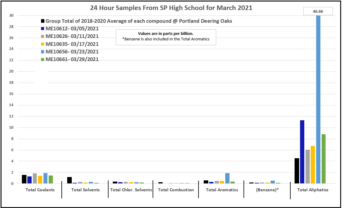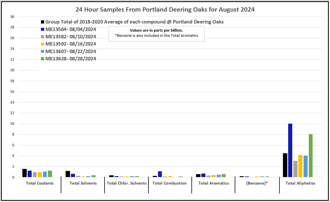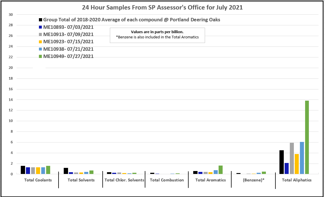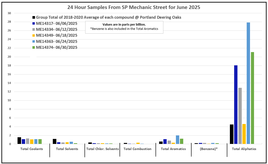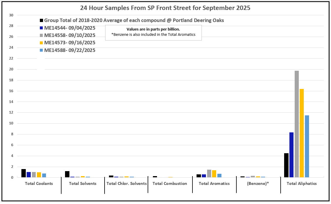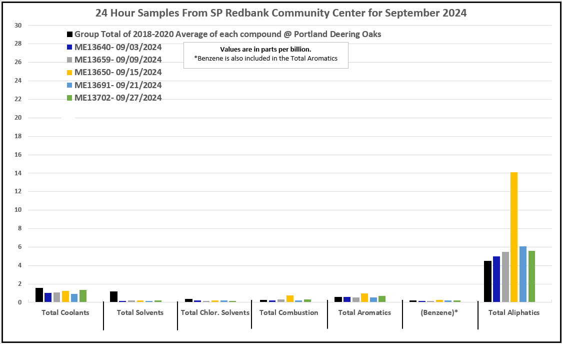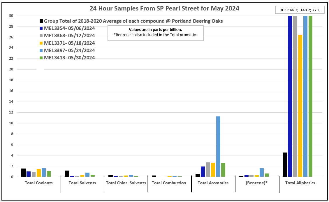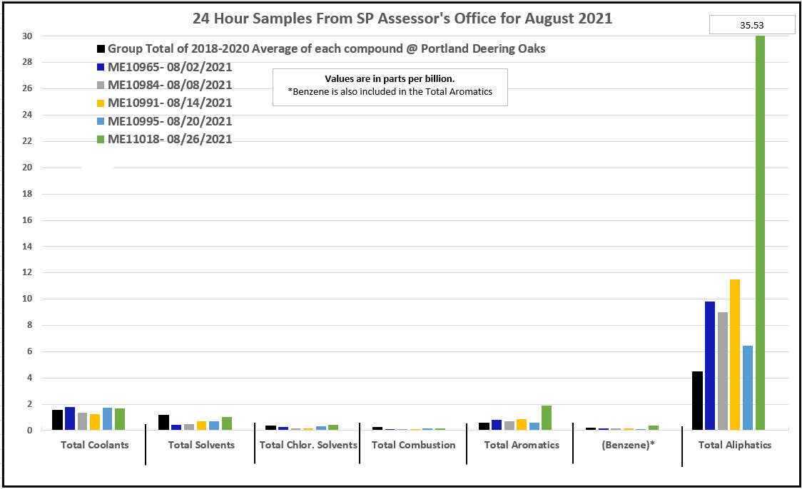 CAUTION to grab sampling data users: It is not appropriate to use grab sample data for any comparison to longer term average (e.g. annual) levels, guidelines or standards for health assessment purposes. Staff from the Maine Center for Disease Control (CDC) gave a presentation (PDF) to the South Portland City Council on November 26, 2019 that describes and illustrates their approach to interpreting this data from a health perspective. The grab sample data charts we’ve created here are intended to simply be a visualization of each sample’s results from an air quality perspective, comparing them to the 2018 annual averages from our Portland Deering Oaks site, which for this purpose are being used as reference or background concentrations for the area.
