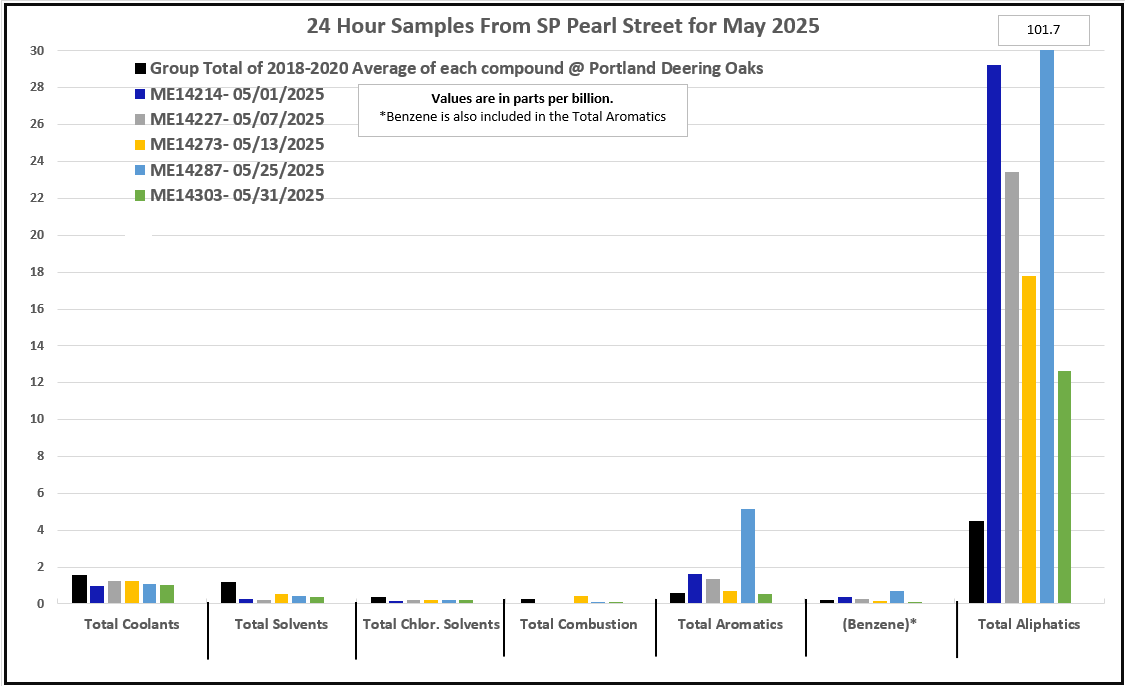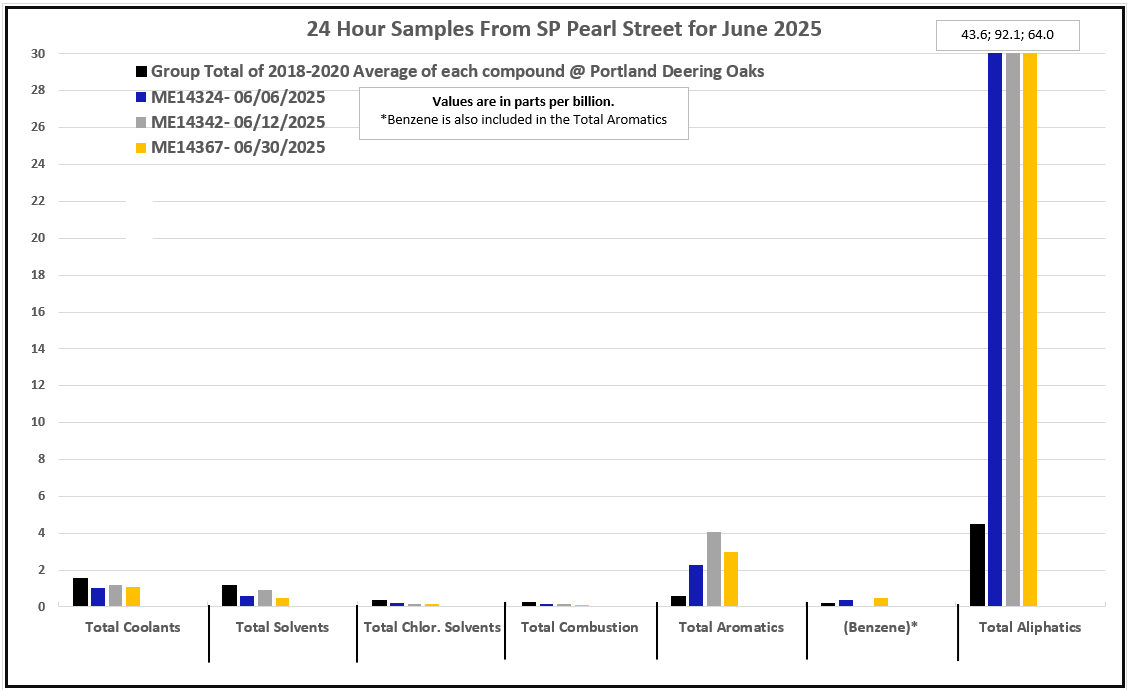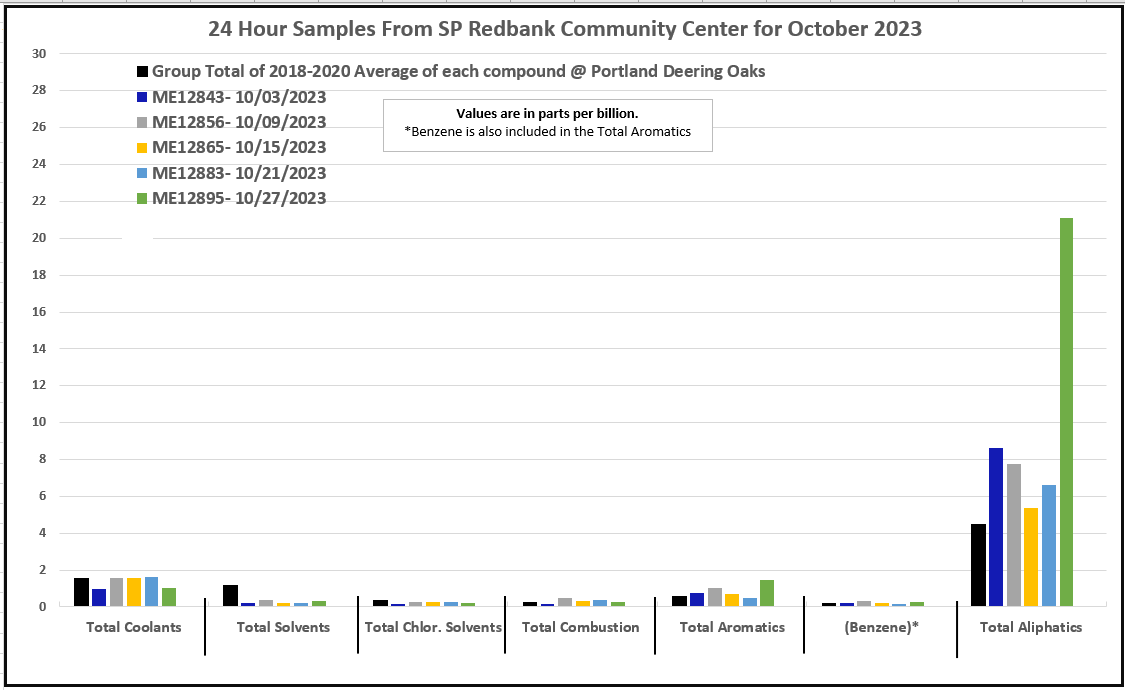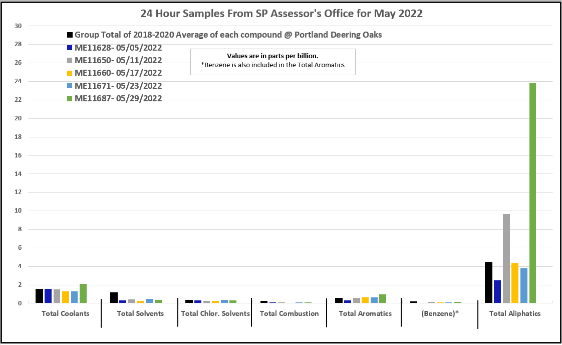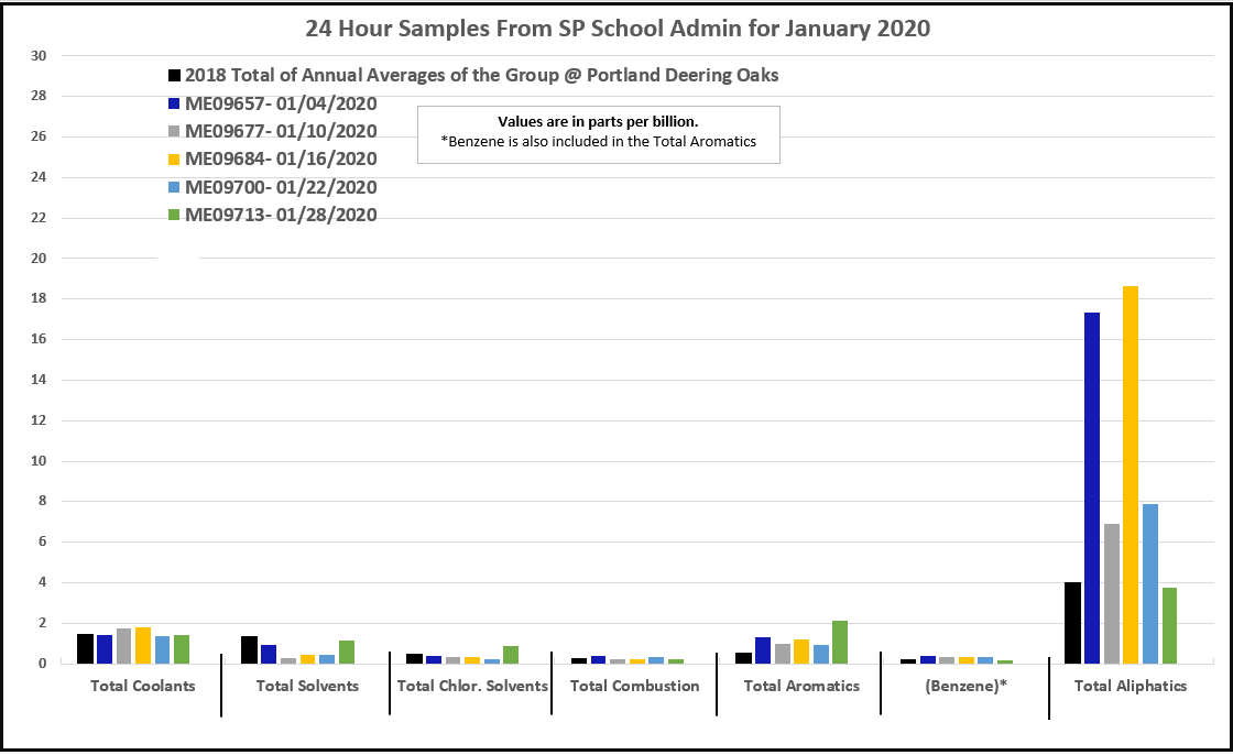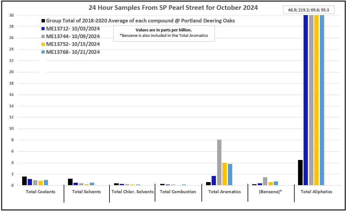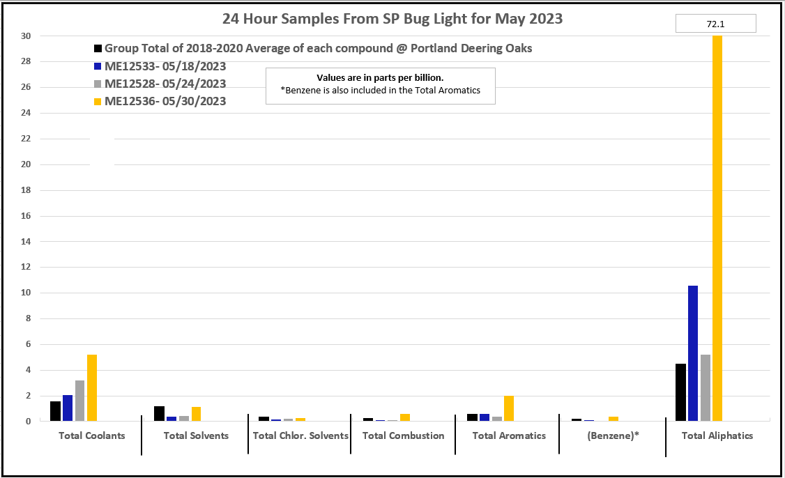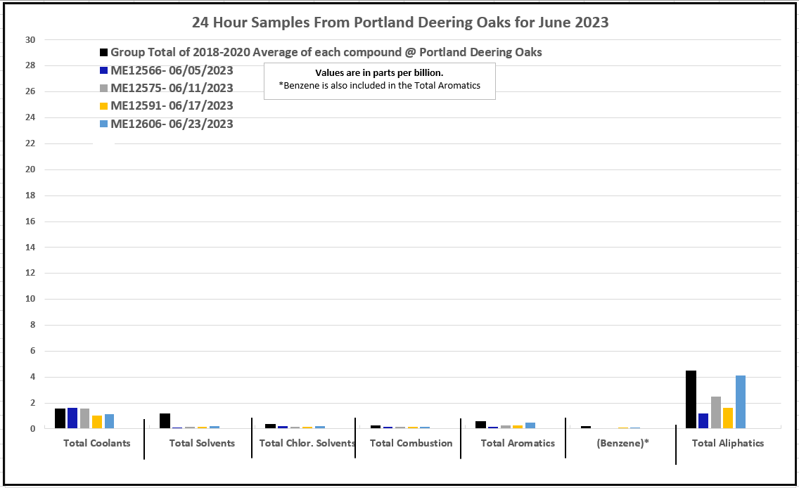 CAUTION to grab sampling data users: It is not appropriate to use grab sample data for any comparison to longer term average (e.g. annual) levels, guidelines or standards for health assessment purposes. Staff from the Maine Center for Disease Control (CDC) gave a presentation (PDF) to the South Portland City Council on November 26, 2019 that describes and illustrates their approach to interpreting this data from a health perspective. The grab sample data charts we’ve created here are intended to simply be a visualization of each sample’s results from an air quality perspective, comparing them to the 2018 annual averages from our Portland Deering Oaks site, which for this purpose are being used as reference or background concentrations for the area.