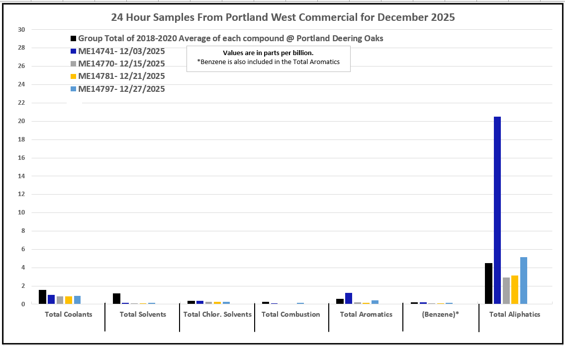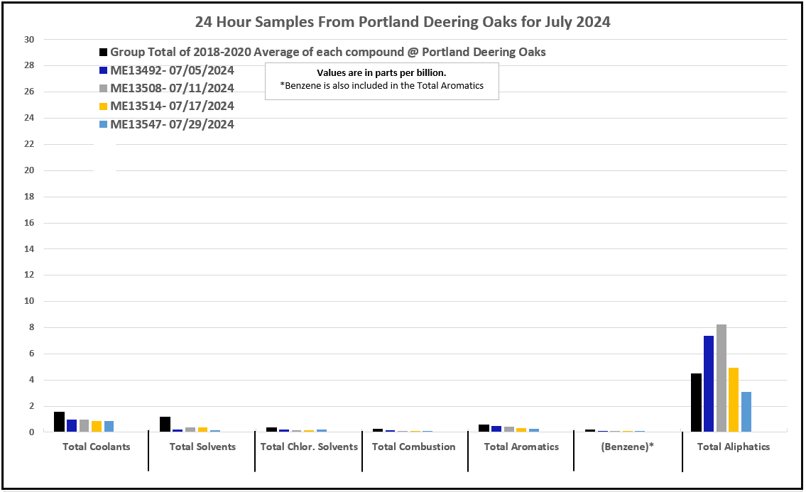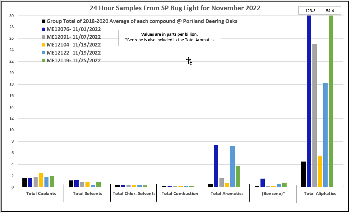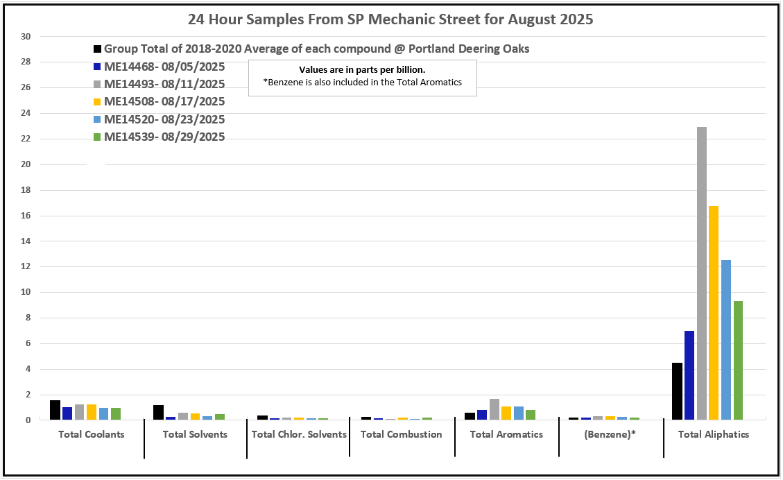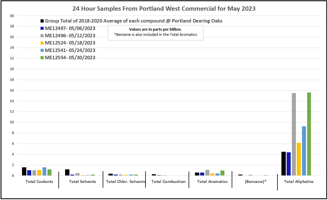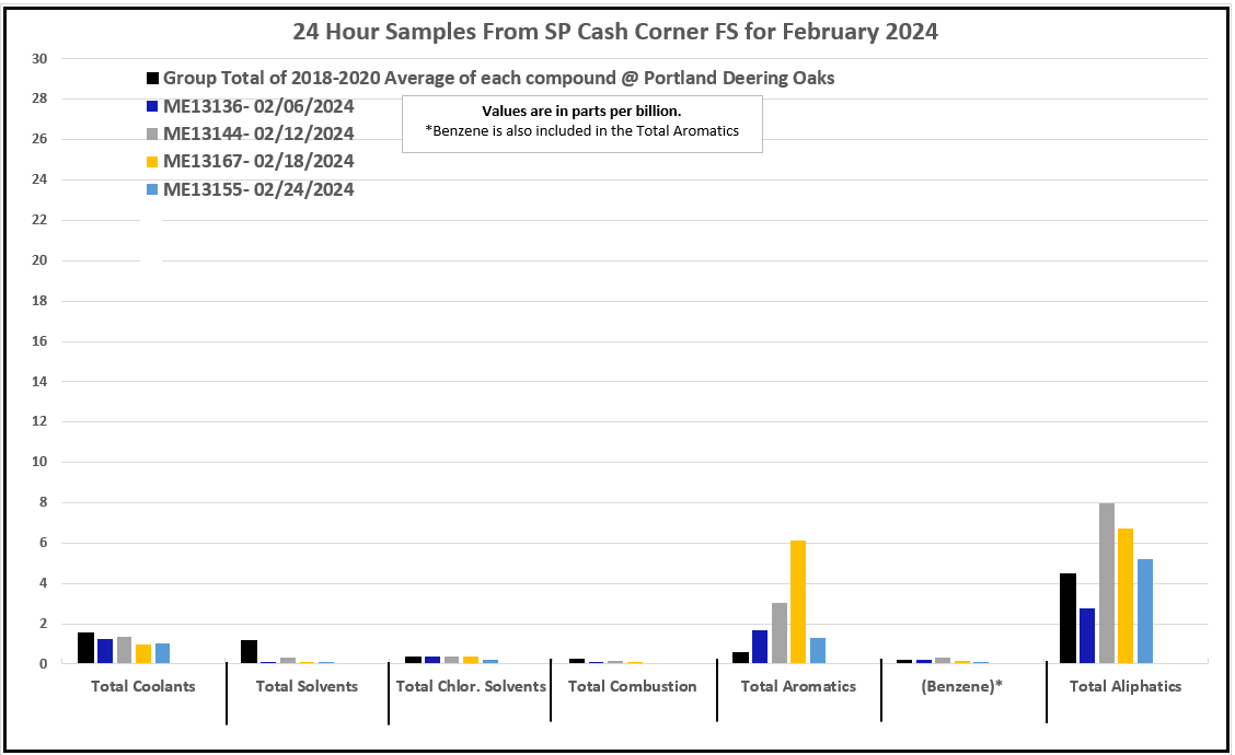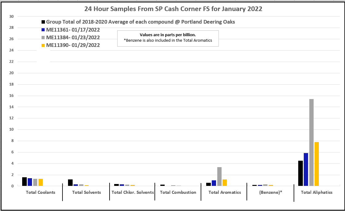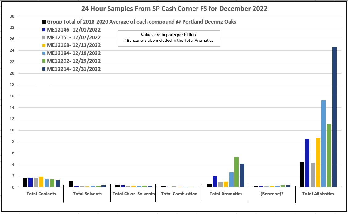 CAUTION to grab sampling data users: It is not appropriate to use grab sample data for any comparison to longer term average (e.g. annual) levels, guidelines or standards for health assessment purposes. Staff from the Maine Center for Disease Control (CDC) gave a presentation (PDF) to the South Portland City Council on November 26, 2019 that describes and illustrates their approach to interpreting this data from a health perspective. The grab sample data charts we’ve created here are intended to simply be a visualization of each sample’s results from an air quality perspective, comparing them to the 2018 annual averages from our Portland Deering Oaks site, which for this purpose are being used as reference or background concentrations for the area.