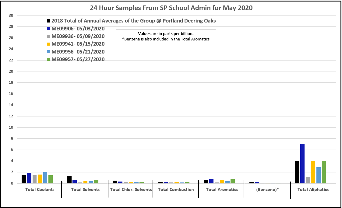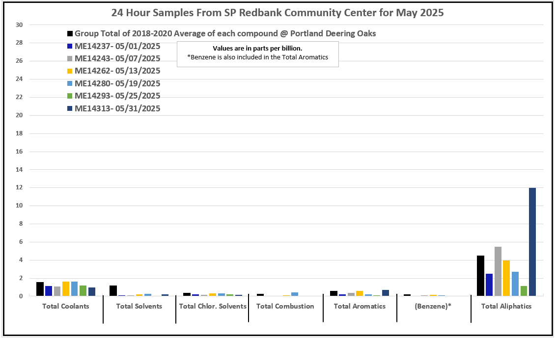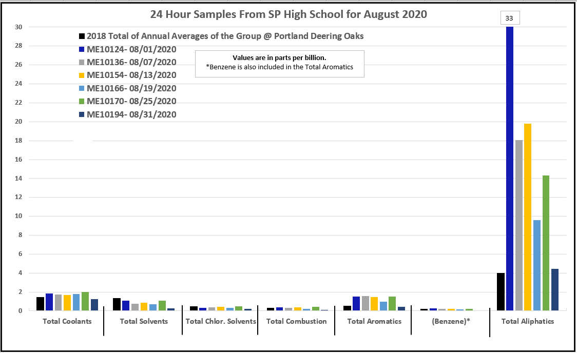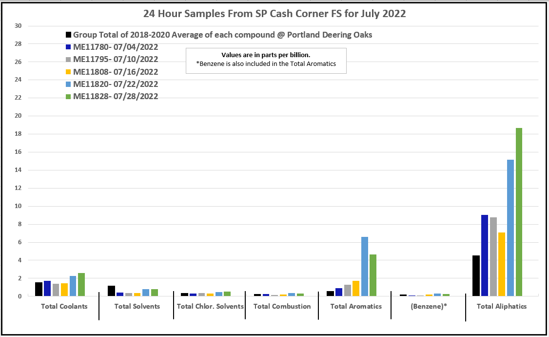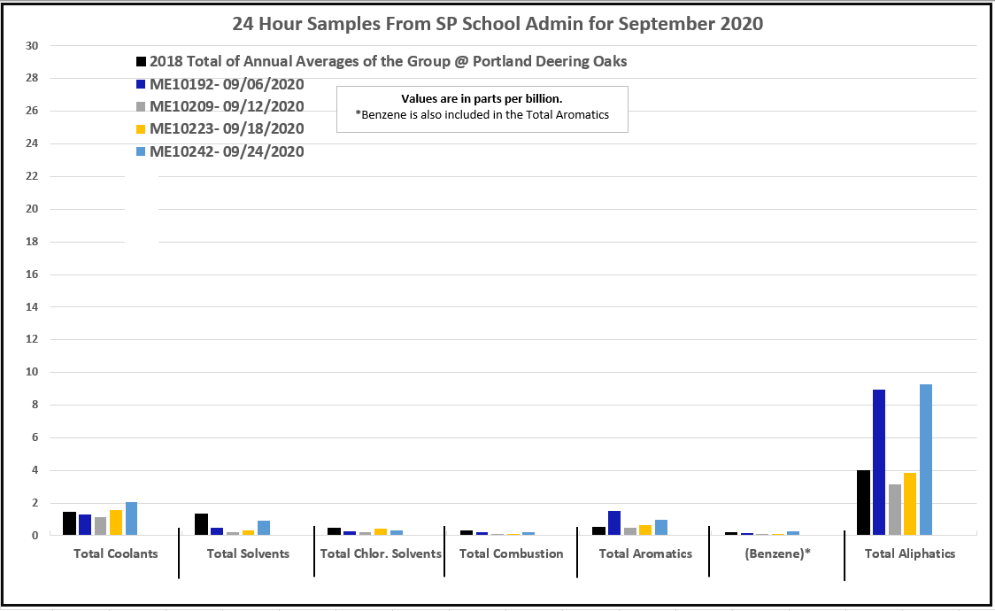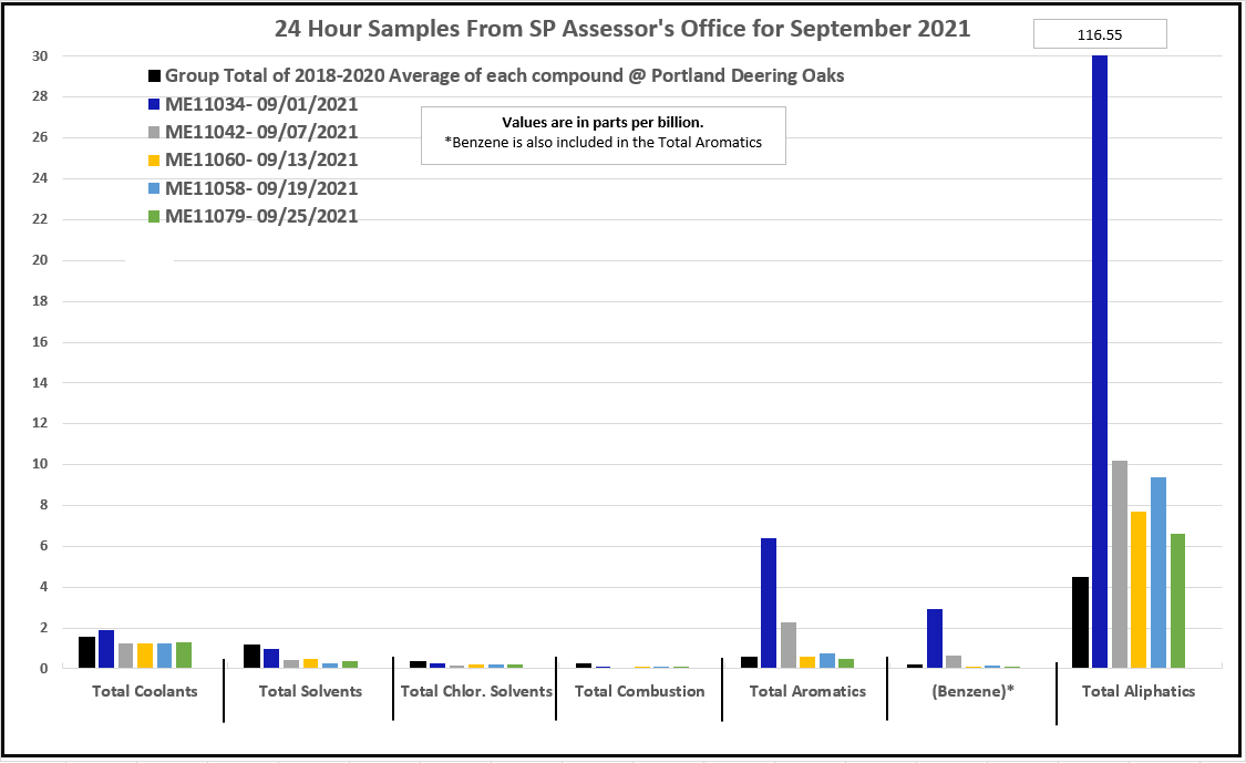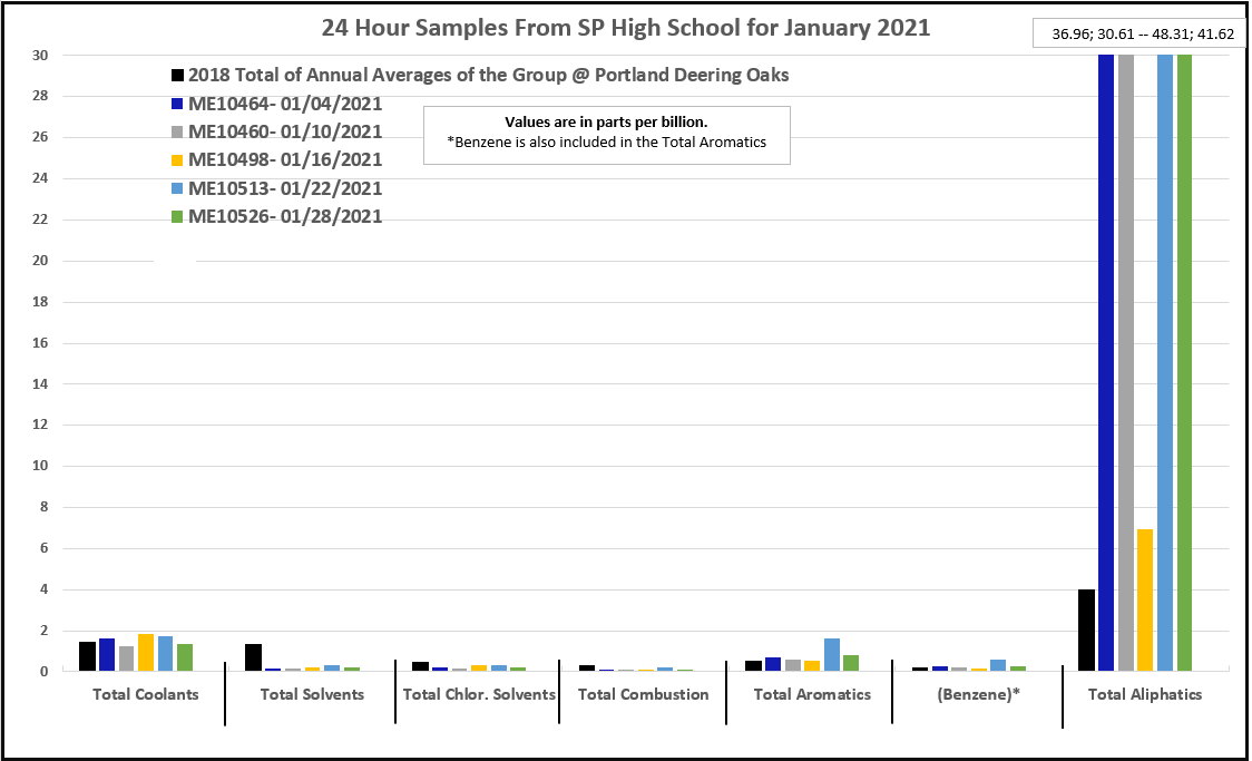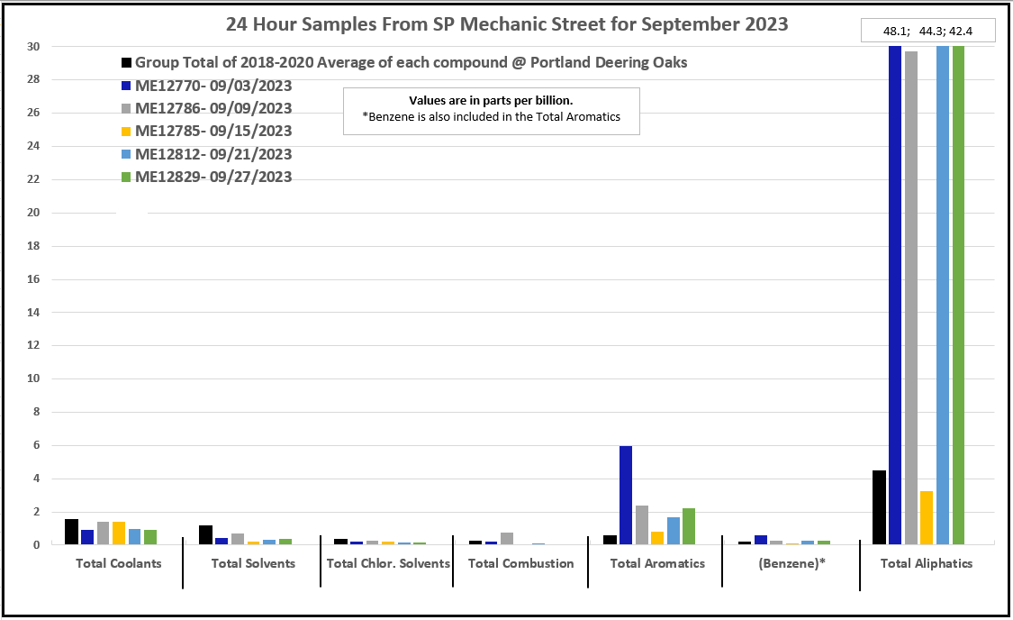 CAUTION to grab sampling data users: It is not appropriate to use grab sample data for any comparison to longer term average (e.g. annual) levels, guidelines or standards for health assessment purposes. Staff from the Maine Center for Disease Control (CDC) gave a presentation (PDF) to the South Portland City Council on November 26, 2019 that describes and illustrates their approach to interpreting this data from a health perspective. The grab sample data charts we’ve created here are intended to simply be a visualization of each sample’s results from an air quality perspective, comparing them to the 2018 annual averages from our Portland Deering Oaks site, which for this purpose are being used as reference or background concentrations for the area.
