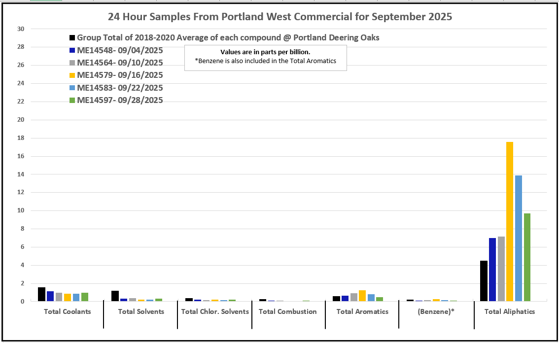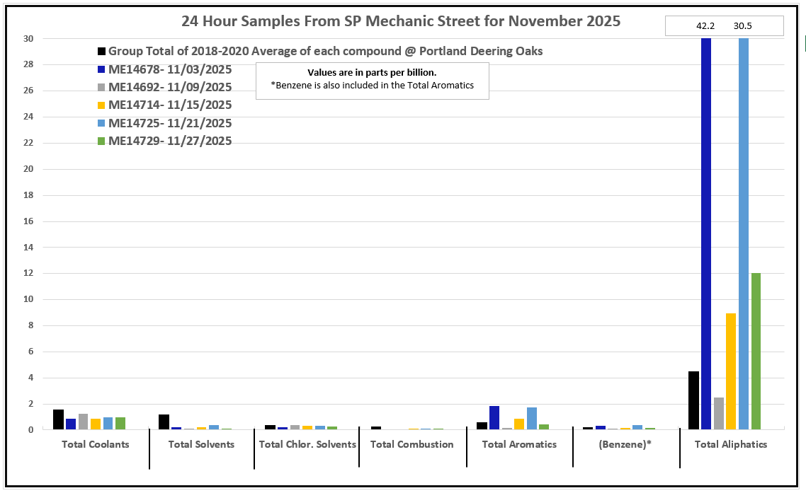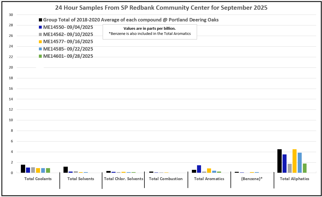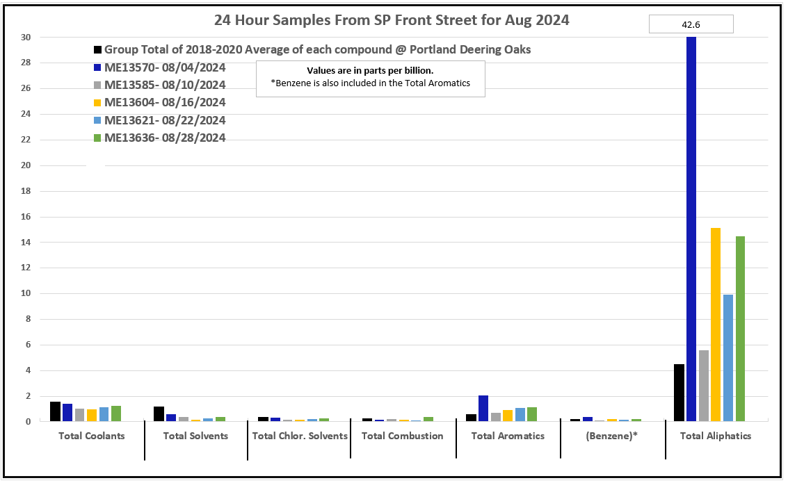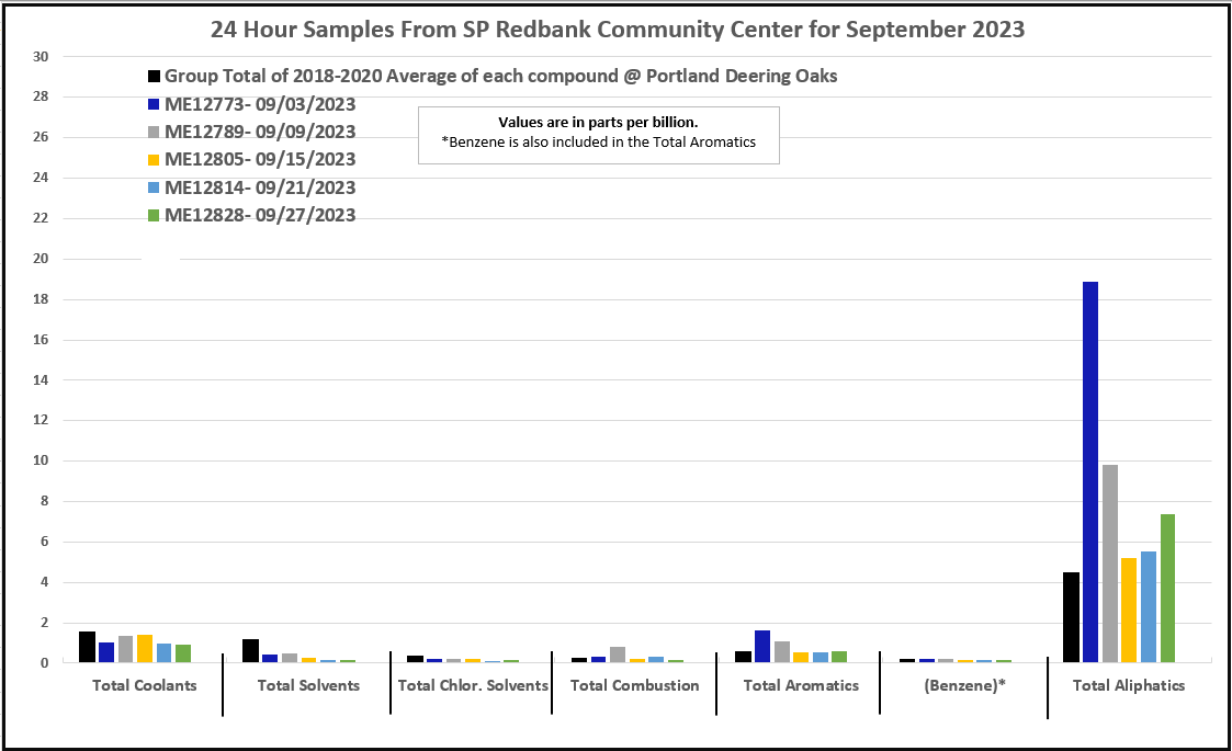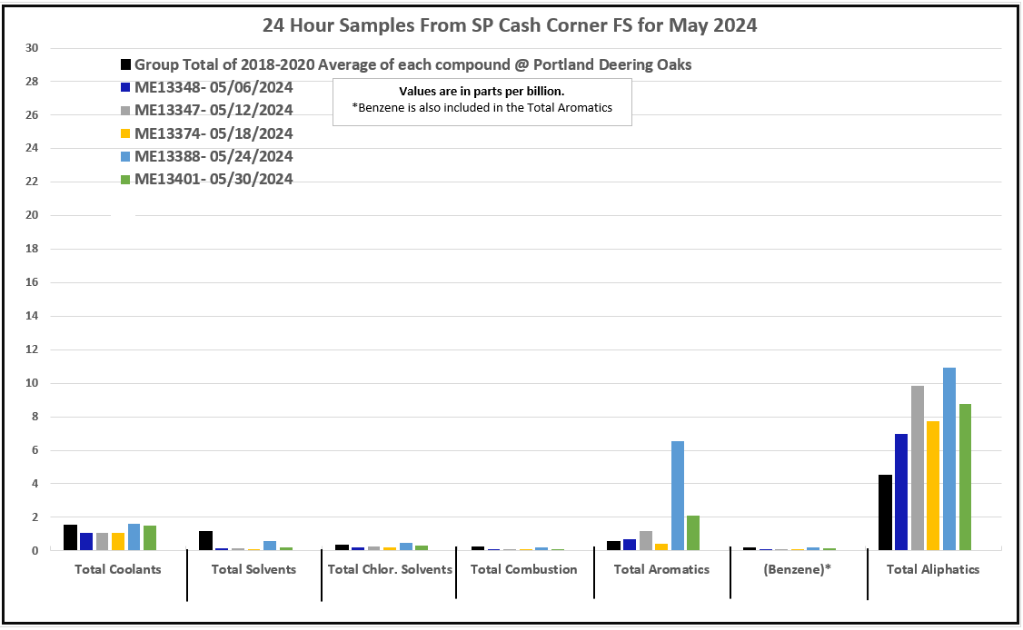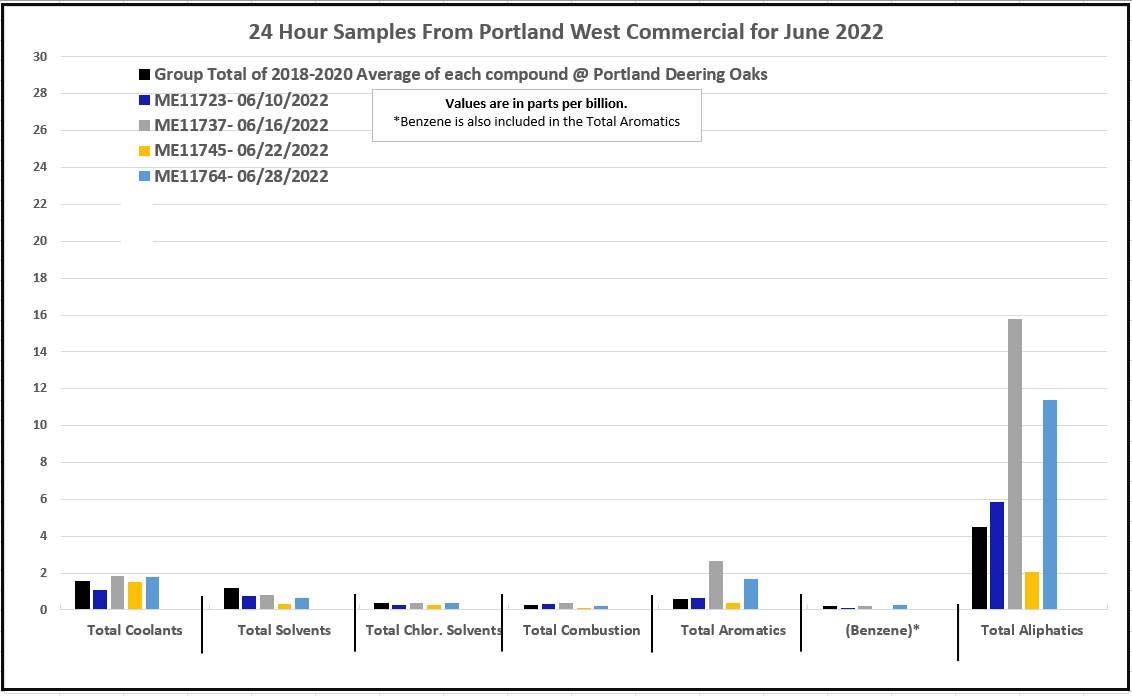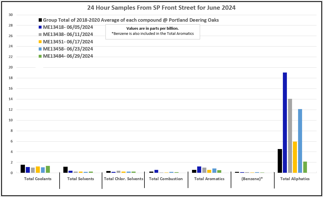 CAUTION to grab sampling data users: It is not appropriate to use grab sample data for any comparison to longer term average (e.g. annual) levels, guidelines or standards for health assessment purposes. Staff from the Maine Center for Disease Control (CDC) gave a presentation (PDF) to the South Portland City Council on November 26, 2019 that describes and illustrates their approach to interpreting this data from a health perspective. The grab sample data charts we’ve created here are intended to simply be a visualization of each sample’s results from an air quality perspective, comparing them to the 2018 annual averages from our Portland Deering Oaks site, which for this purpose are being used as reference or background concentrations for the area.