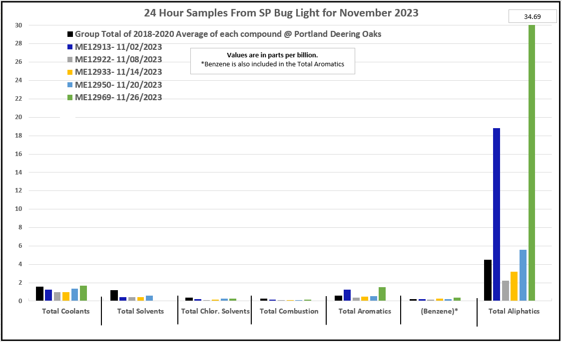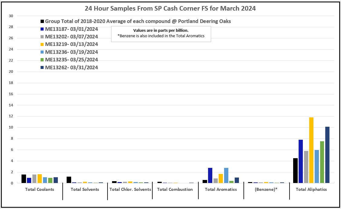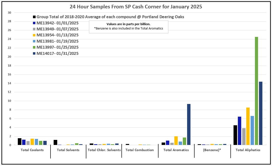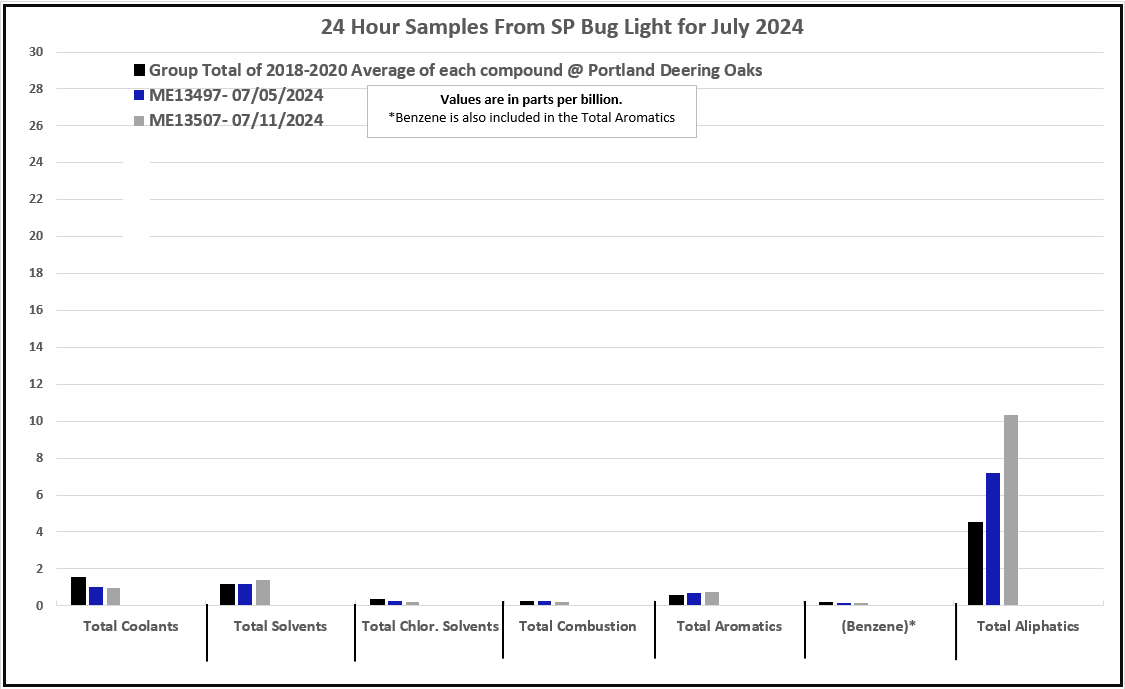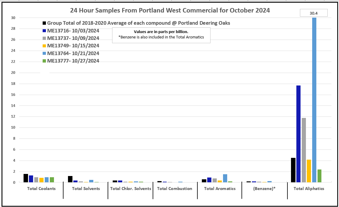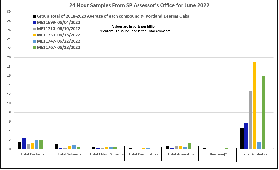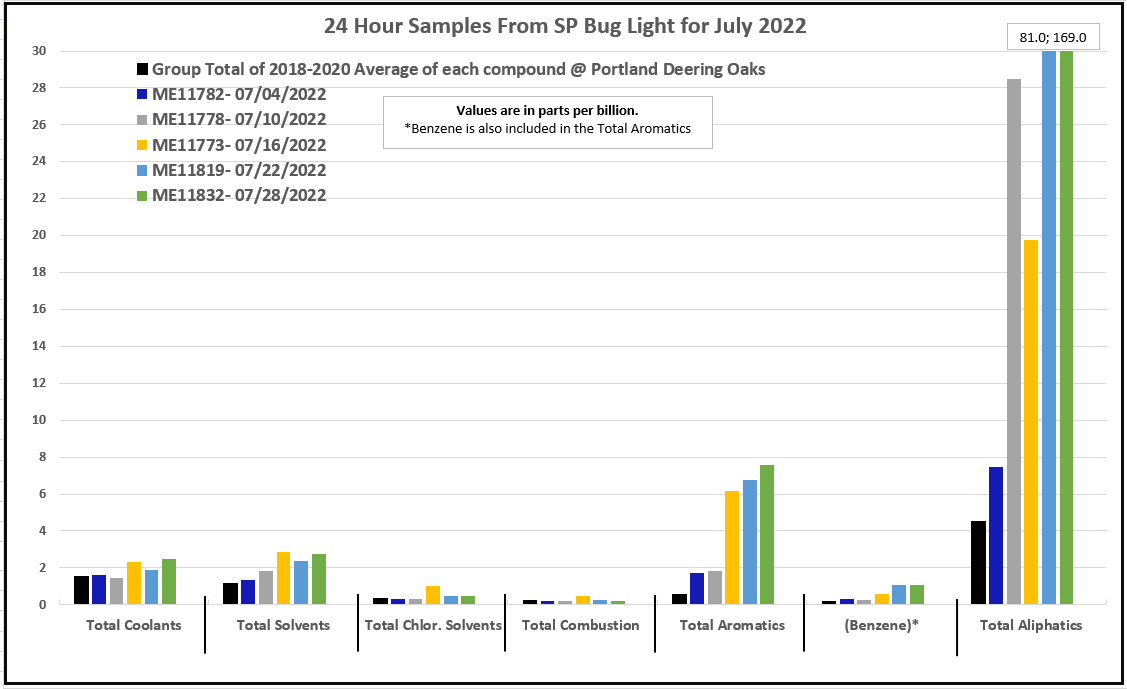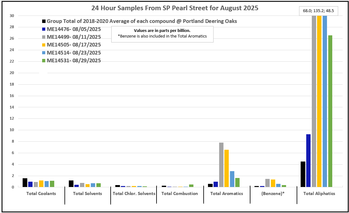 CAUTION to grab sampling data users: It is not appropriate to use grab sample data for any comparison to longer term average (e.g. annual) levels, guidelines or standards for health assessment purposes. Staff from the Maine Center for Disease Control (CDC) gave a presentation (PDF) to the South Portland City Council on November 26, 2019 that describes and illustrates their approach to interpreting this data from a health perspective. The grab sample data charts we’ve created here are intended to simply be a visualization of each sample’s results from an air quality perspective, comparing them to the 2018 annual averages from our Portland Deering Oaks site, which for this purpose are being used as reference or background concentrations for the area.