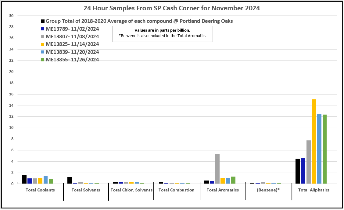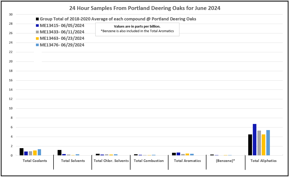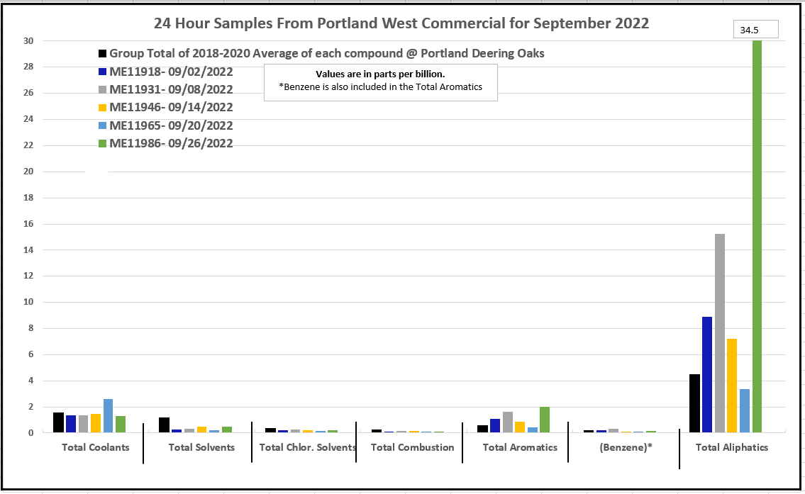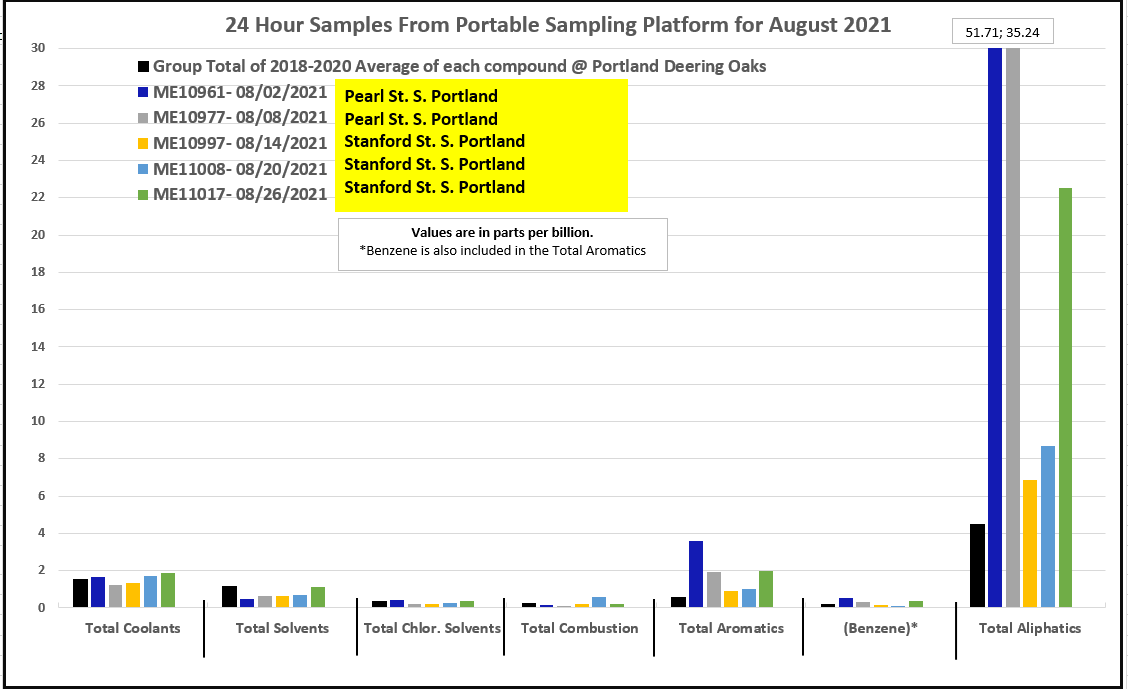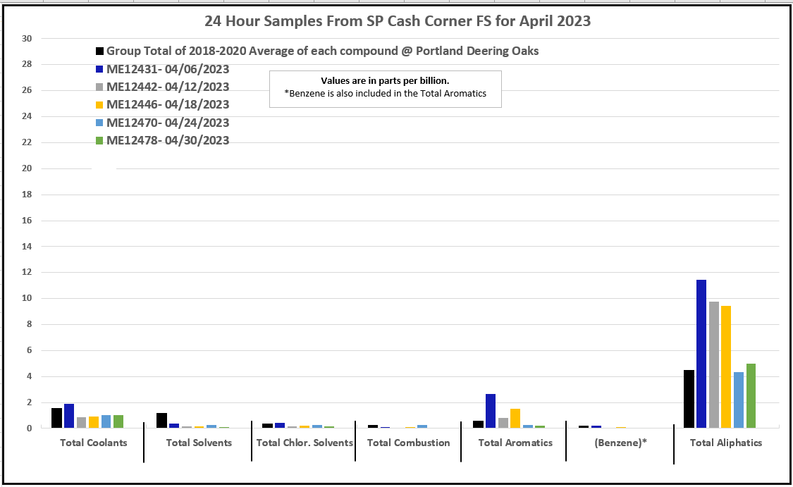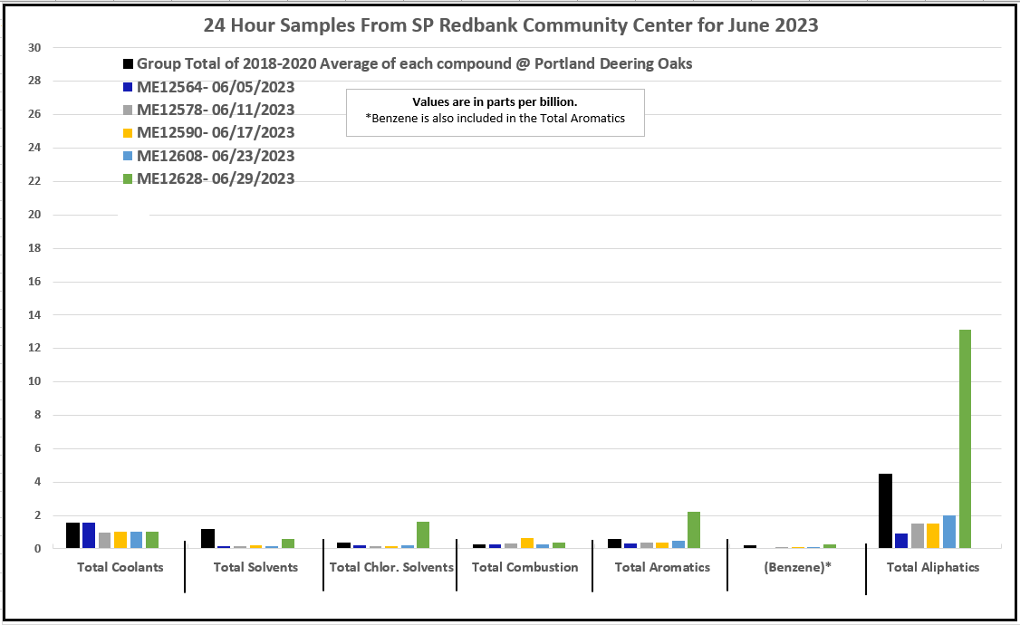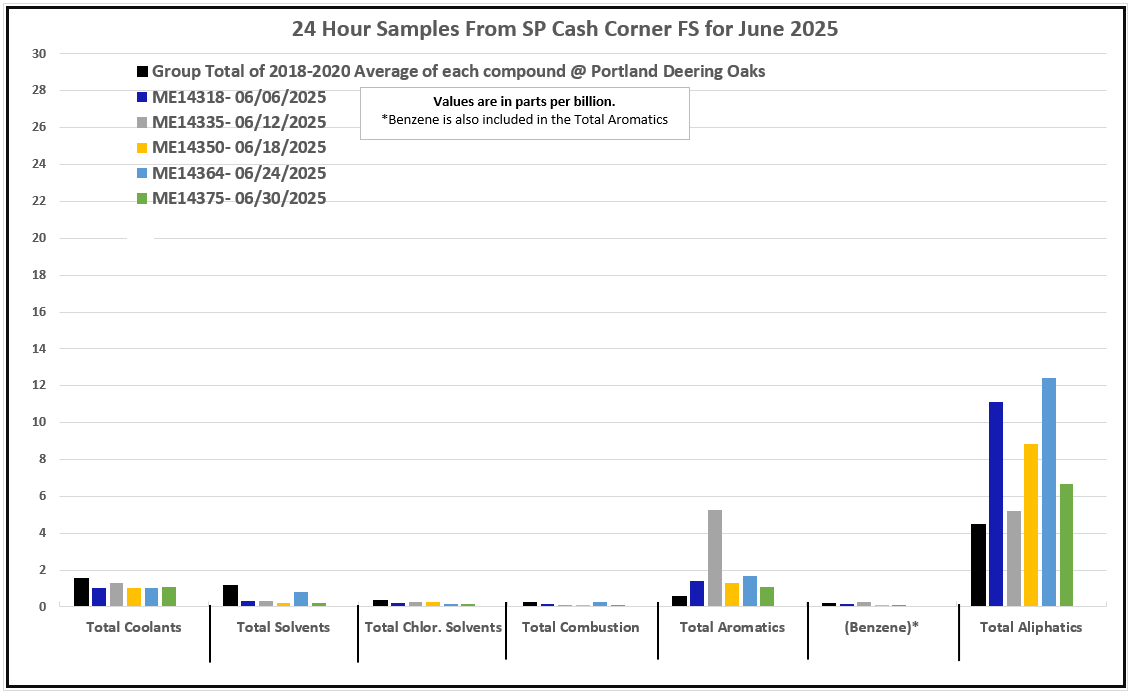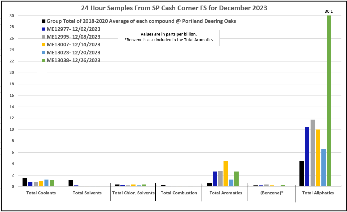 CAUTION to grab sampling data users: It is not appropriate to use grab sample data for any comparison to longer term average (e.g. annual) levels, guidelines or standards for health assessment purposes. Staff from the Maine Center for Disease Control (CDC) gave a presentation (PDF) to the South Portland City Council on November 26, 2019 that describes and illustrates their approach to interpreting this data from a health perspective. The grab sample data charts we’ve created here are intended to simply be a visualization of each sample’s results from an air quality perspective, comparing them to the 2018 annual averages from our Portland Deering Oaks site, which for this purpose are being used as reference or background concentrations for the area.