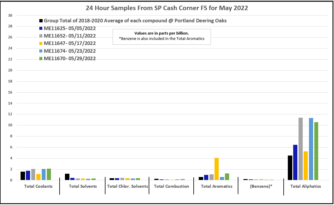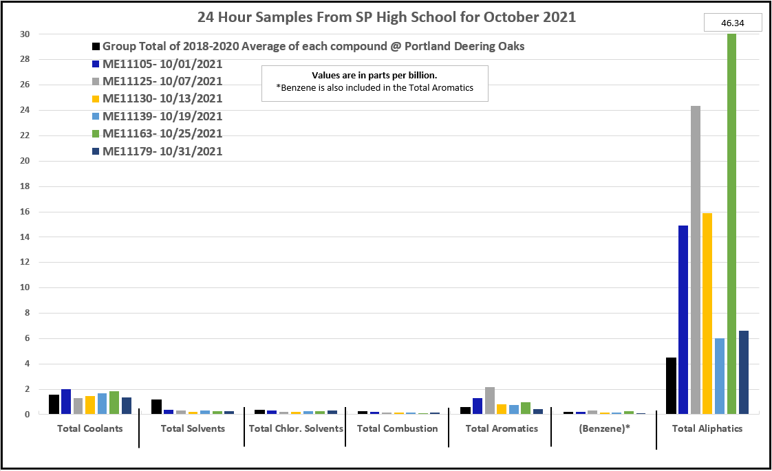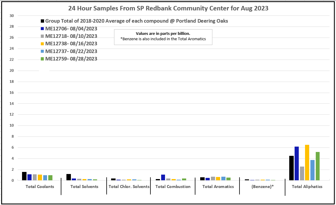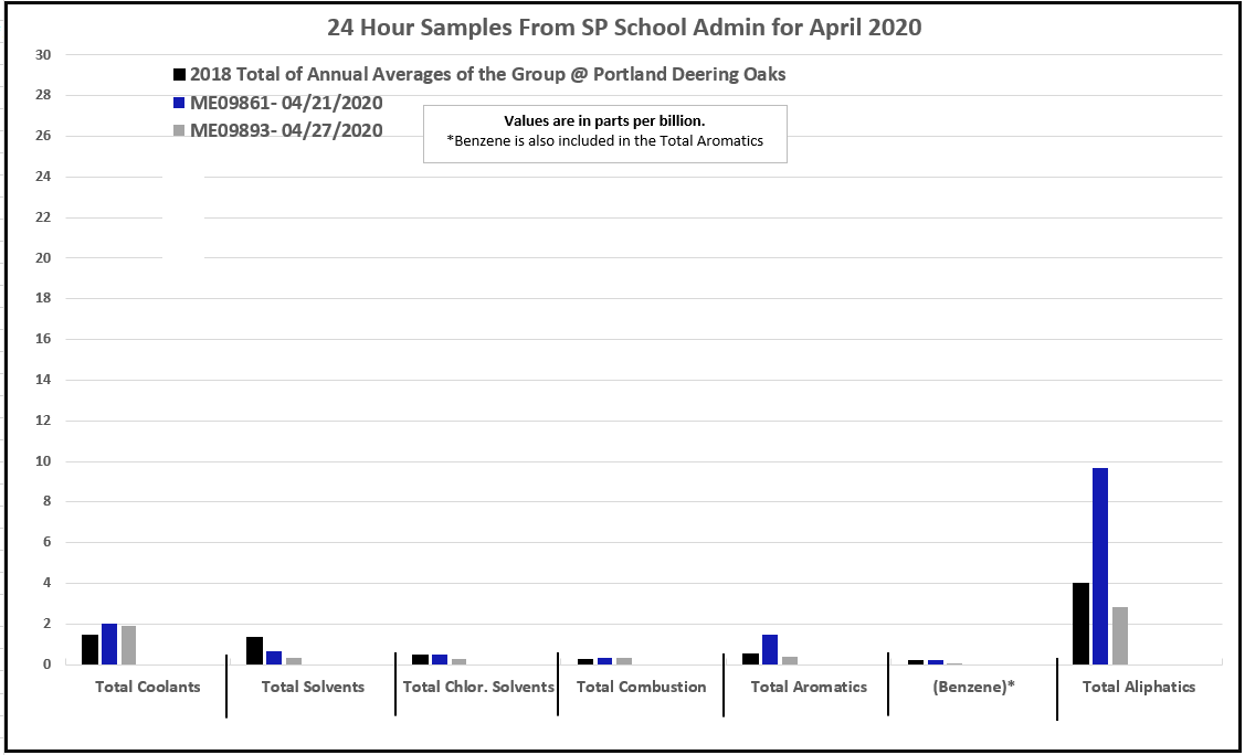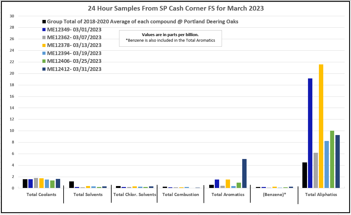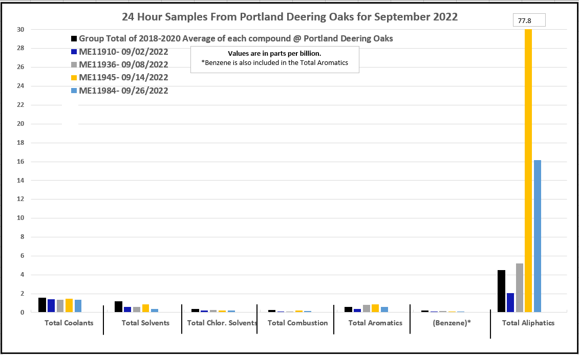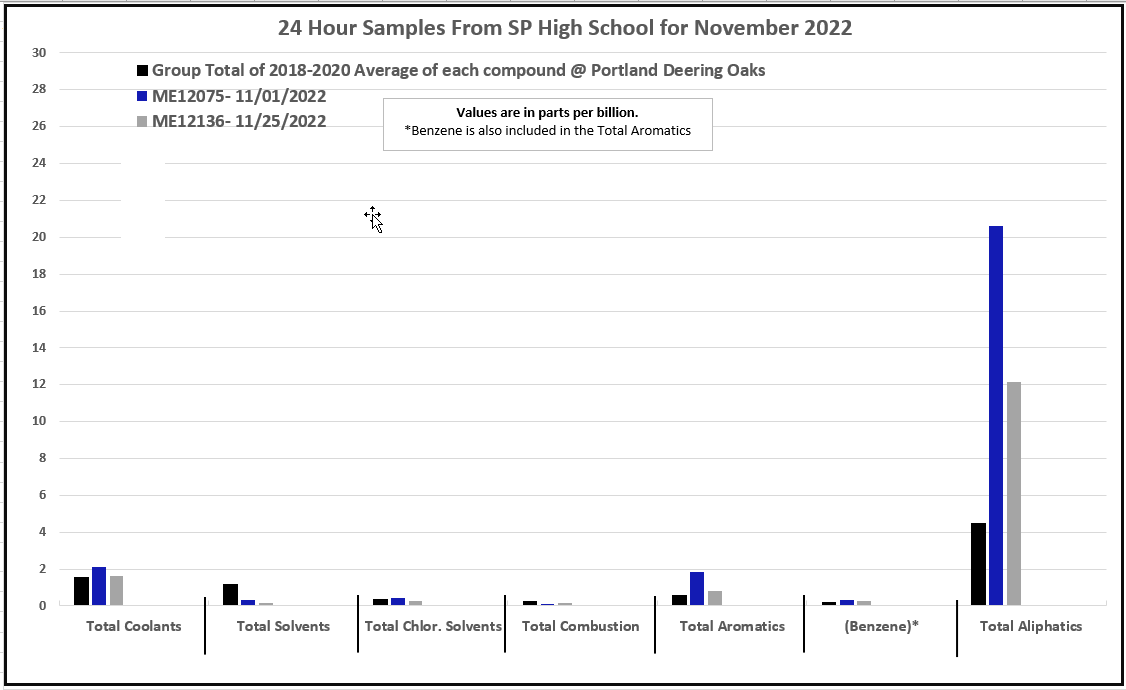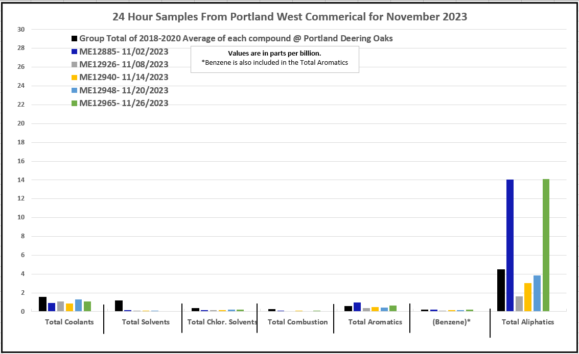 CAUTION to grab sampling data users: It is not appropriate to use grab sample data for any comparison to longer term average (e.g. annual) levels, guidelines or standards for health assessment purposes. Staff from the Maine Center for Disease Control (CDC) gave a presentation (PDF) to the South Portland City Council on November 26, 2019 that describes and illustrates their approach to interpreting this data from a health perspective. The grab sample data charts we’ve created here are intended to simply be a visualization of each sample’s results from an air quality perspective, comparing them to the 2018 annual averages from our Portland Deering Oaks site, which for this purpose are being used as reference or background concentrations for the area.