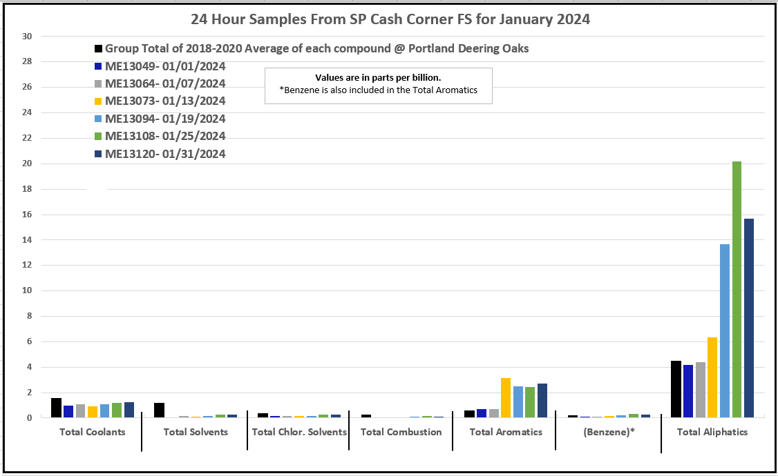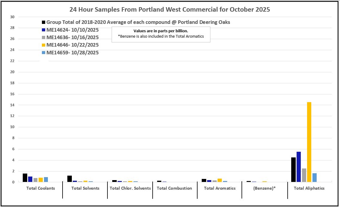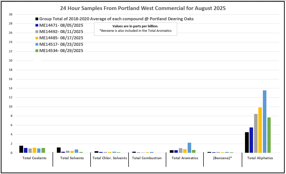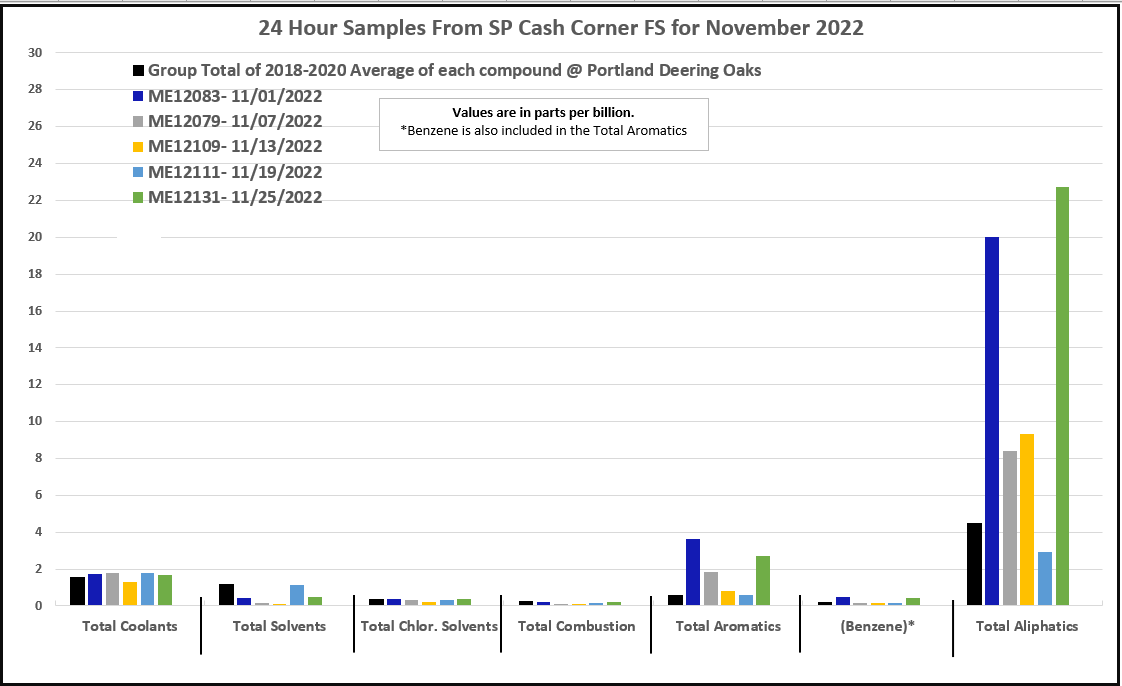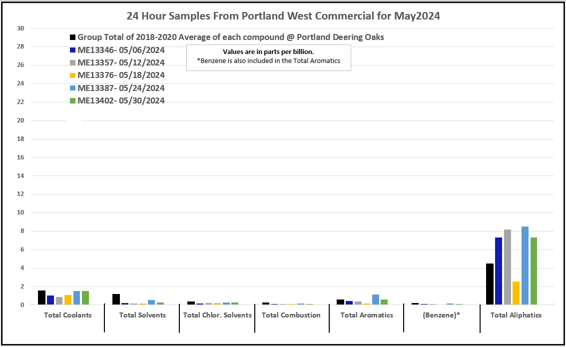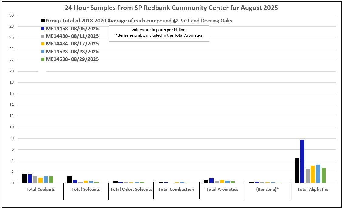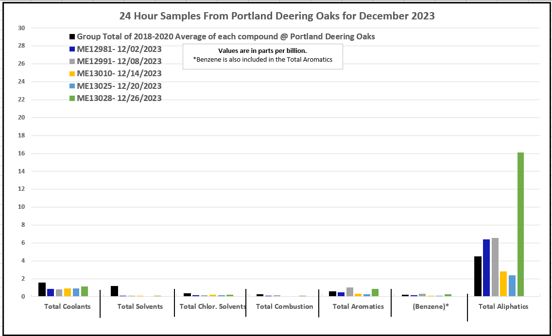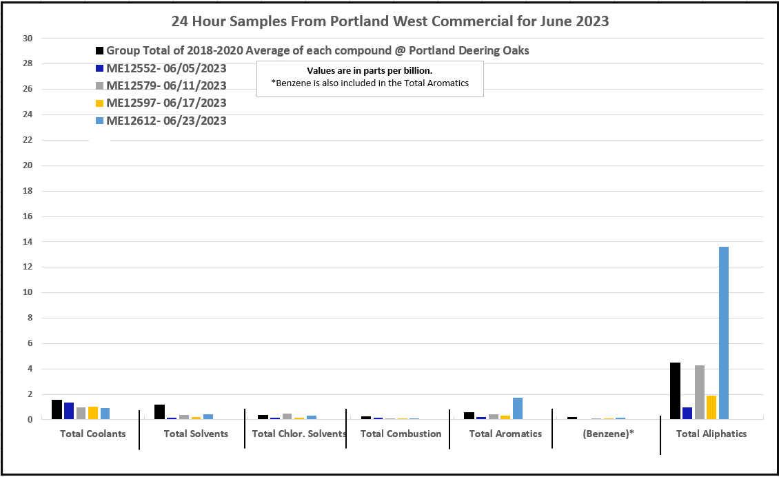 CAUTION to grab sampling data users: It is not appropriate to use grab sample data for any comparison to longer term average (e.g. annual) levels, guidelines or standards for health assessment purposes. Staff from the Maine Center for Disease Control (CDC) gave a presentation (PDF) to the South Portland City Council on November 26, 2019 that describes and illustrates their approach to interpreting this data from a health perspective. The grab sample data charts we’ve created here are intended to simply be a visualization of each sample’s results from an air quality perspective, comparing them to the 2018 annual averages from our Portland Deering Oaks site, which for this purpose are being used as reference or background concentrations for the area.