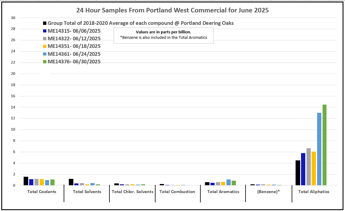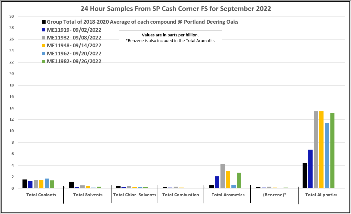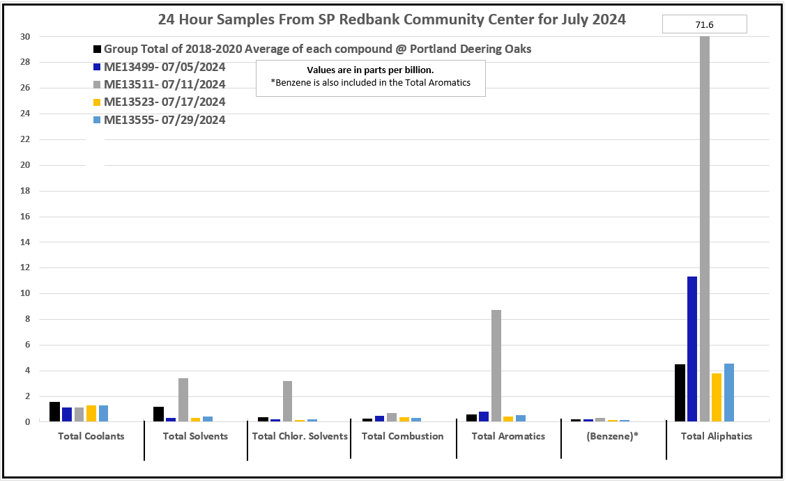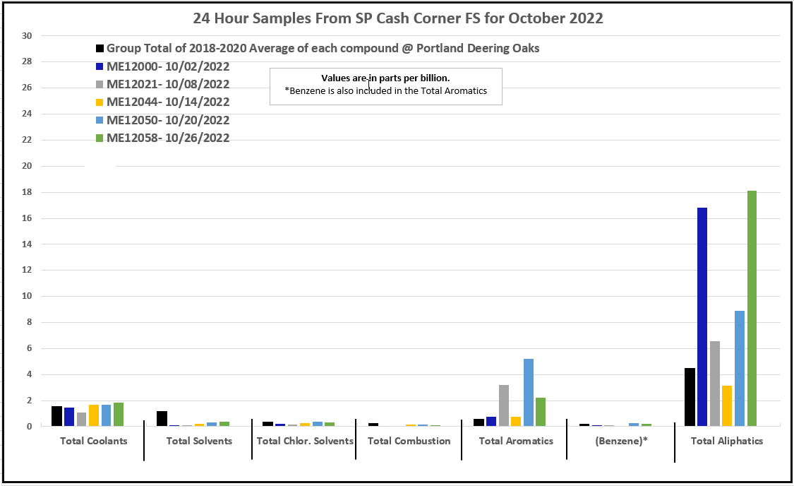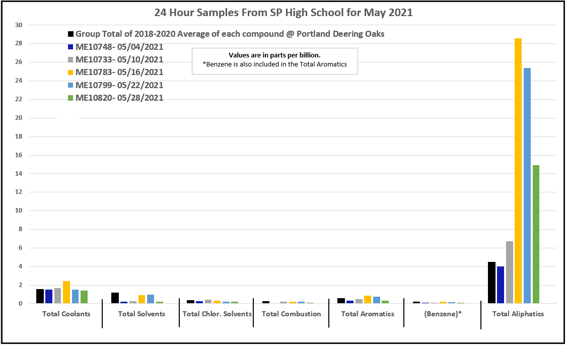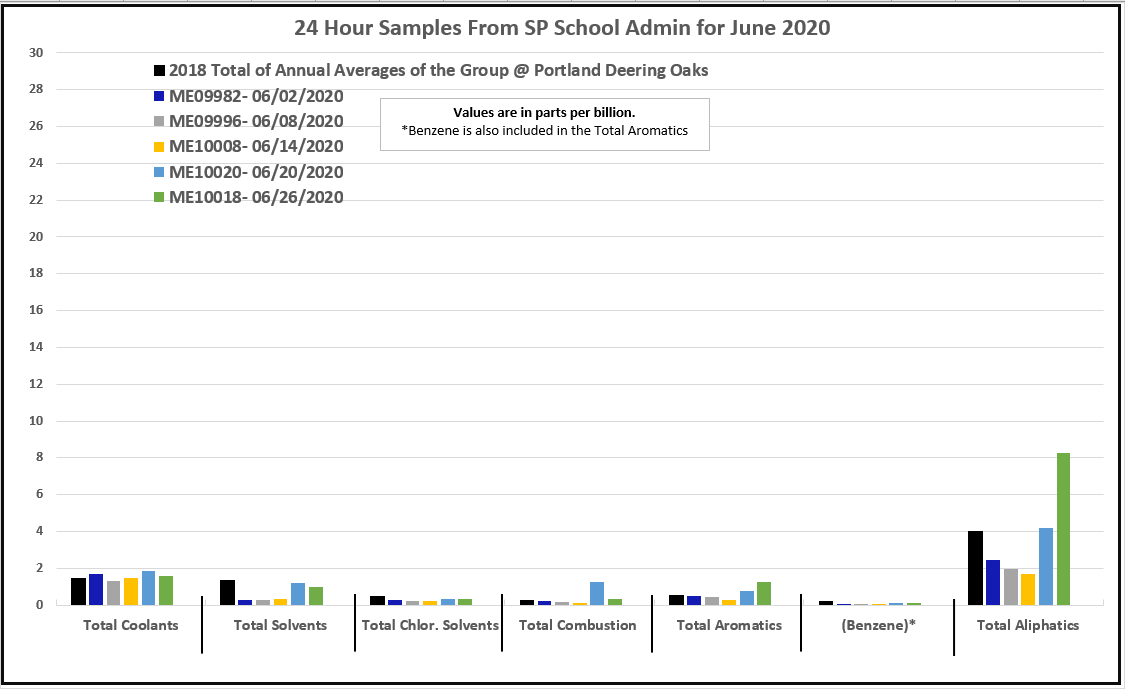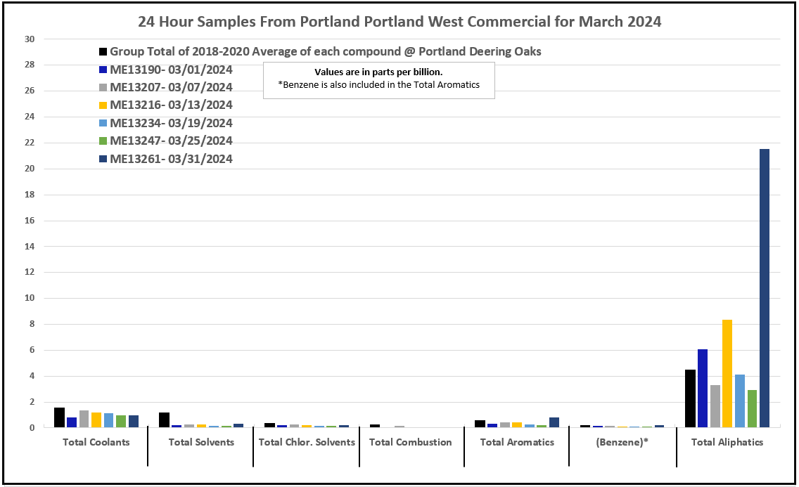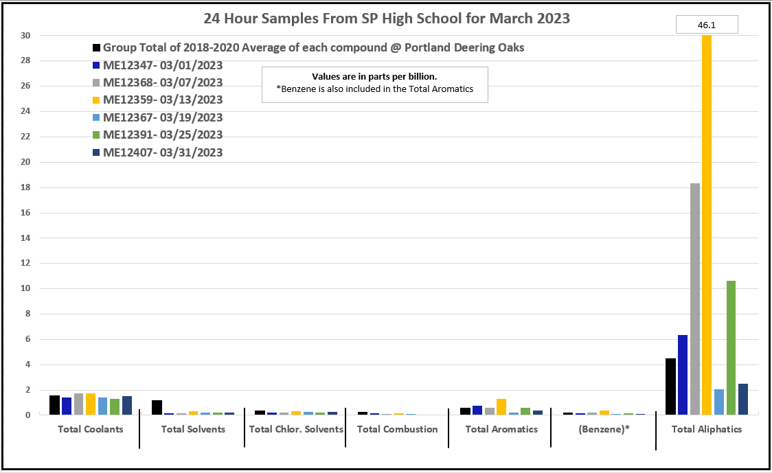 CAUTION to grab sampling data users: It is not appropriate to use grab sample data for any comparison to longer term average (e.g. annual) levels, guidelines or standards for health assessment purposes. Staff from the Maine Center for Disease Control (CDC) gave a presentation (PDF) to the South Portland City Council on November 26, 2019 that describes and illustrates their approach to interpreting this data from a health perspective. The grab sample data charts we’ve created here are intended to simply be a visualization of each sample’s results from an air quality perspective, comparing them to the 2018 annual averages from our Portland Deering Oaks site, which for this purpose are being used as reference or background concentrations for the area.