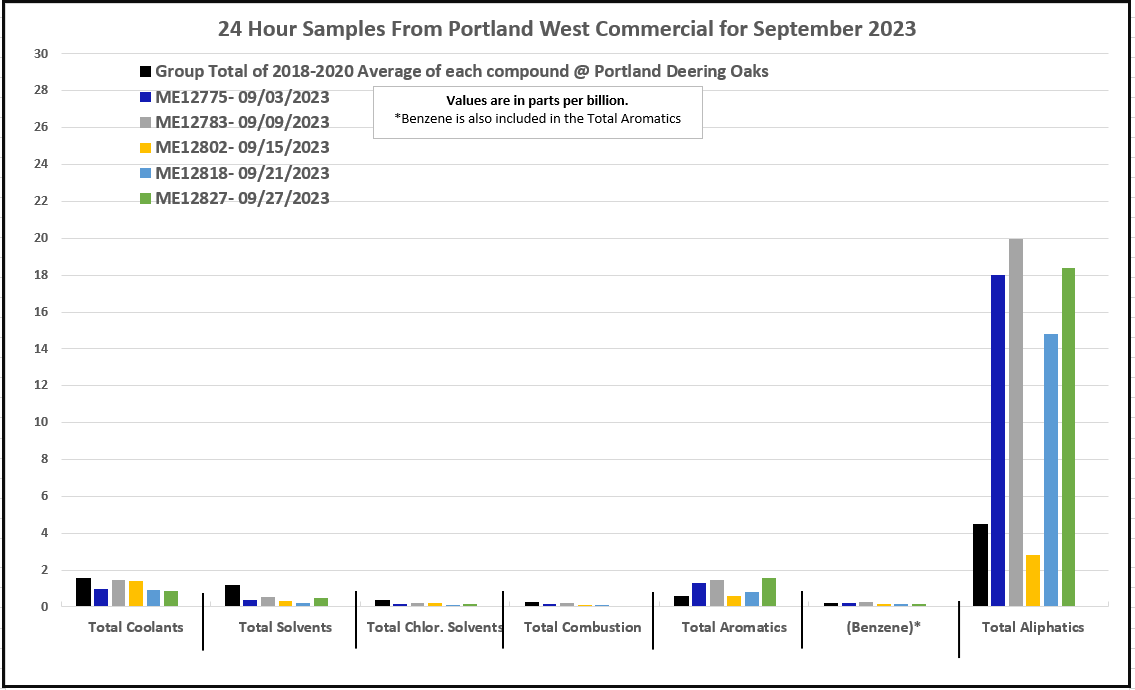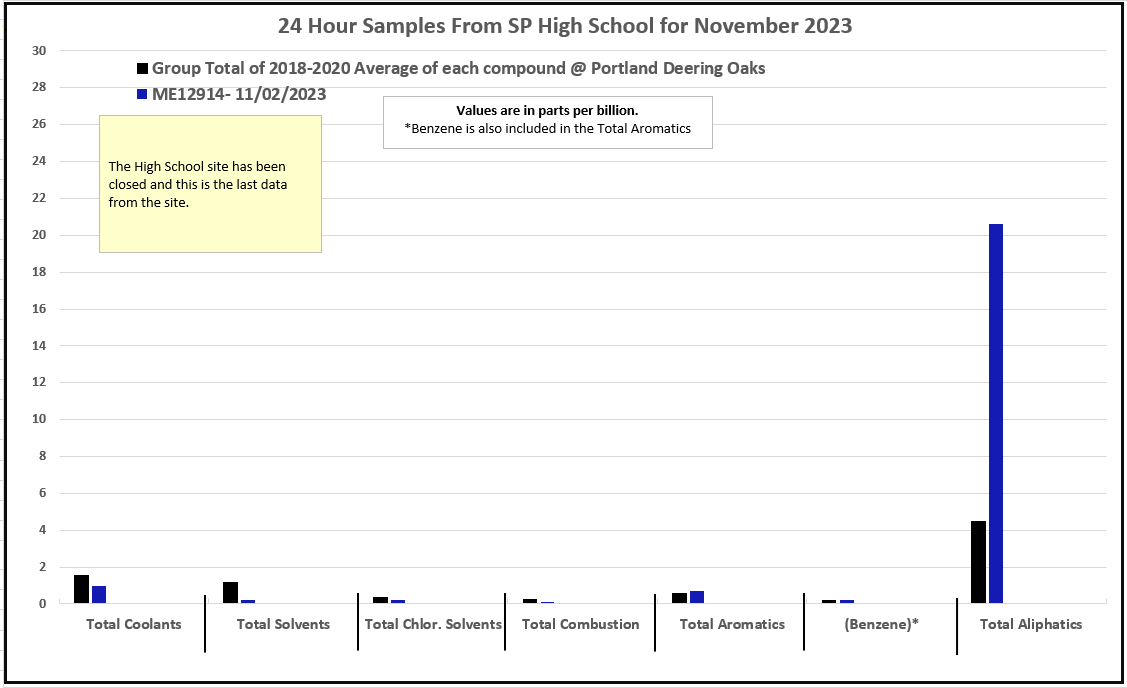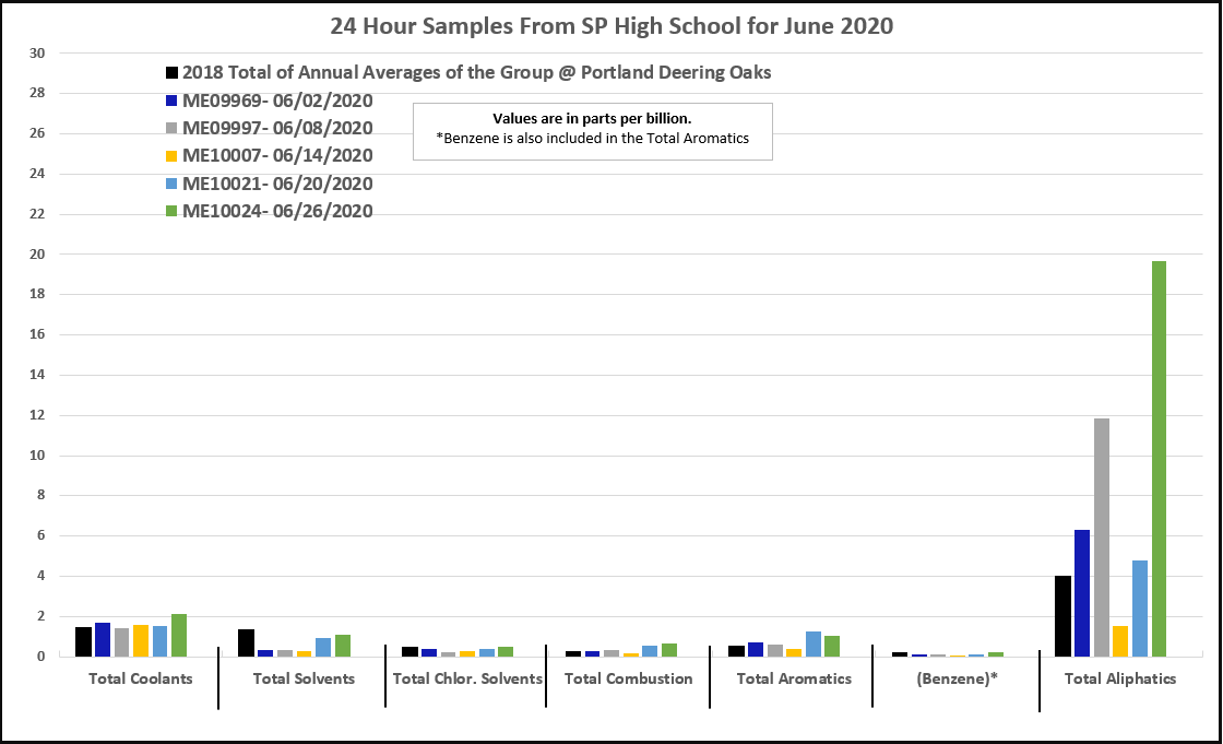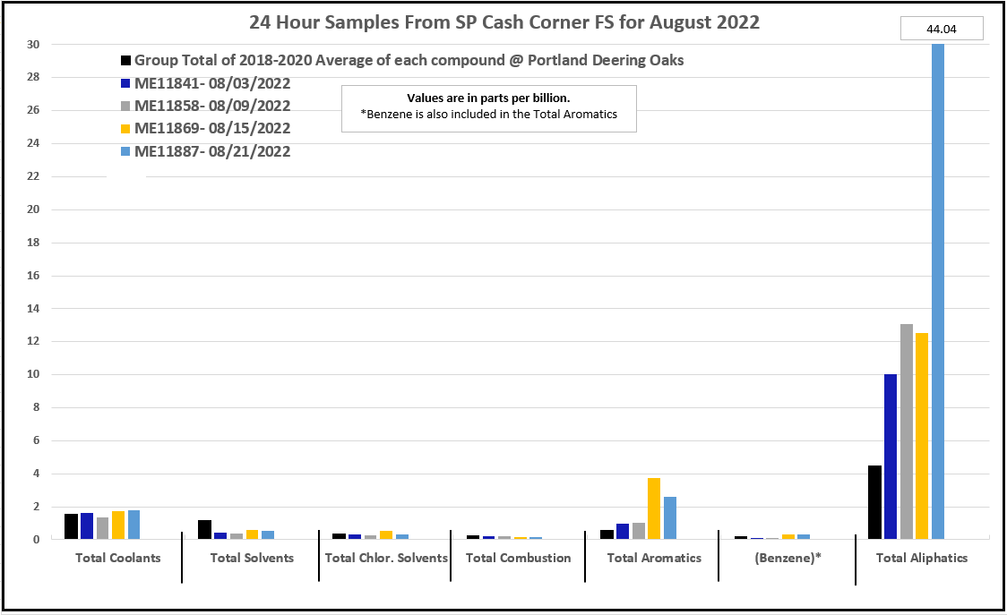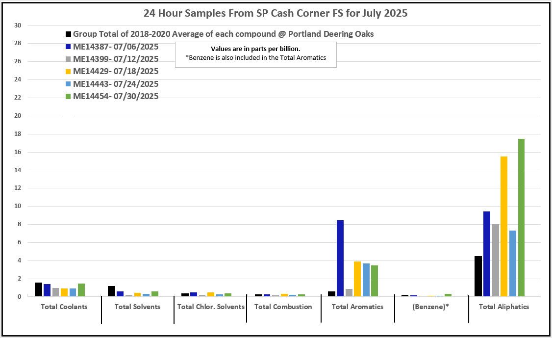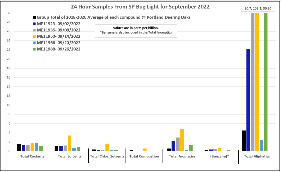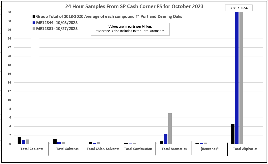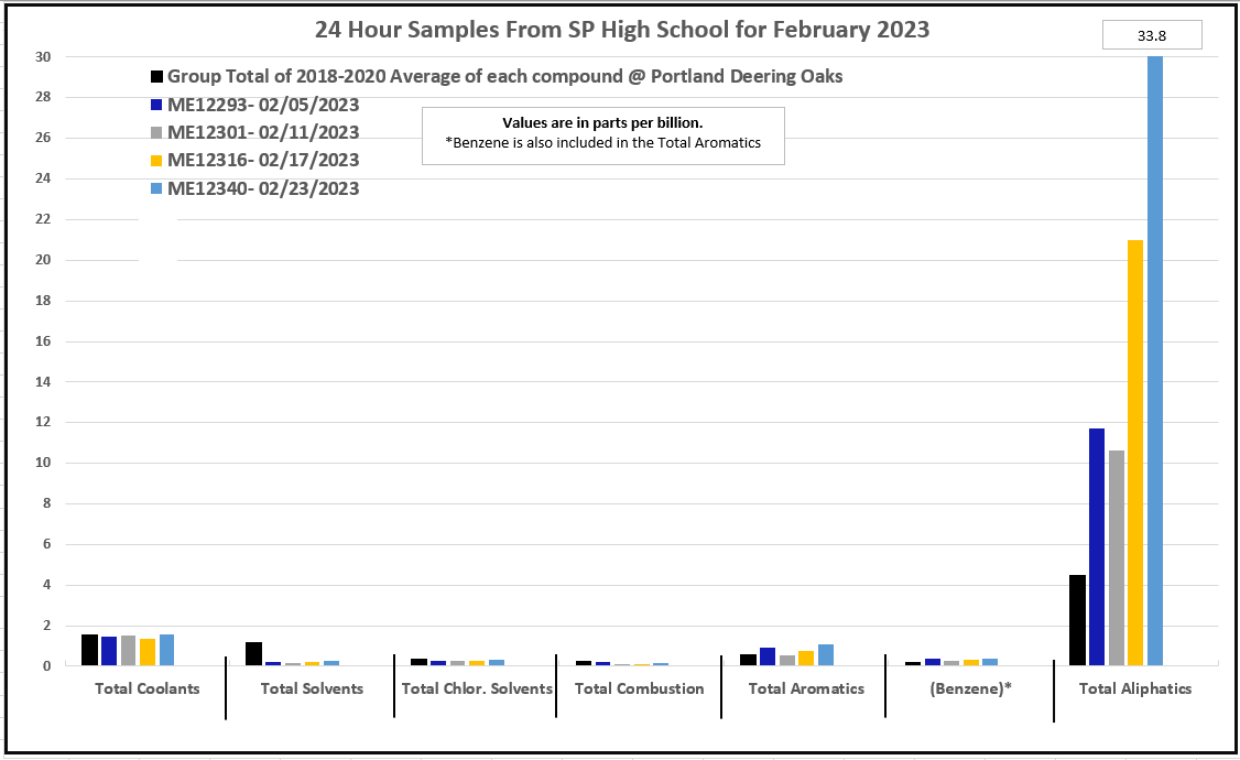 CAUTION to grab sampling data users: It is not appropriate to use grab sample data for any comparison to longer term average (e.g. annual) levels, guidelines or standards for health assessment purposes. Staff from the Maine Center for Disease Control (CDC) gave a presentation (PDF) to the South Portland City Council on November 26, 2019 that describes and illustrates their approach to interpreting this data from a health perspective. The grab sample data charts we’ve created here are intended to simply be a visualization of each sample’s results from an air quality perspective, comparing them to the 2018 annual averages from our Portland Deering Oaks site, which for this purpose are being used as reference or background concentrations for the area.