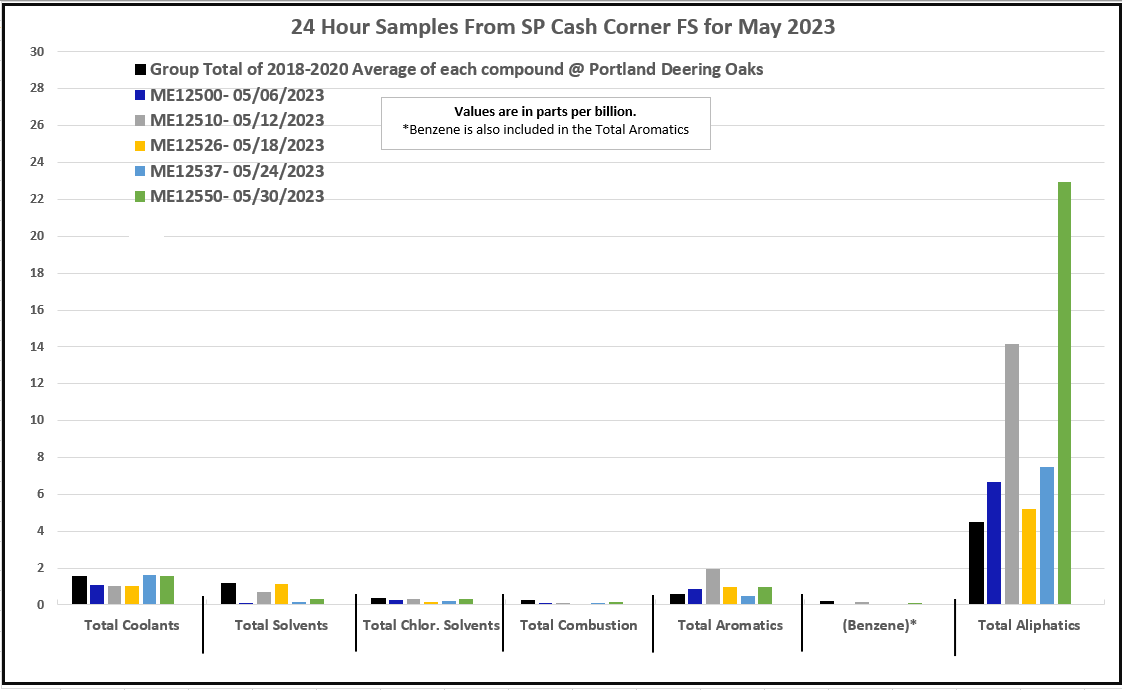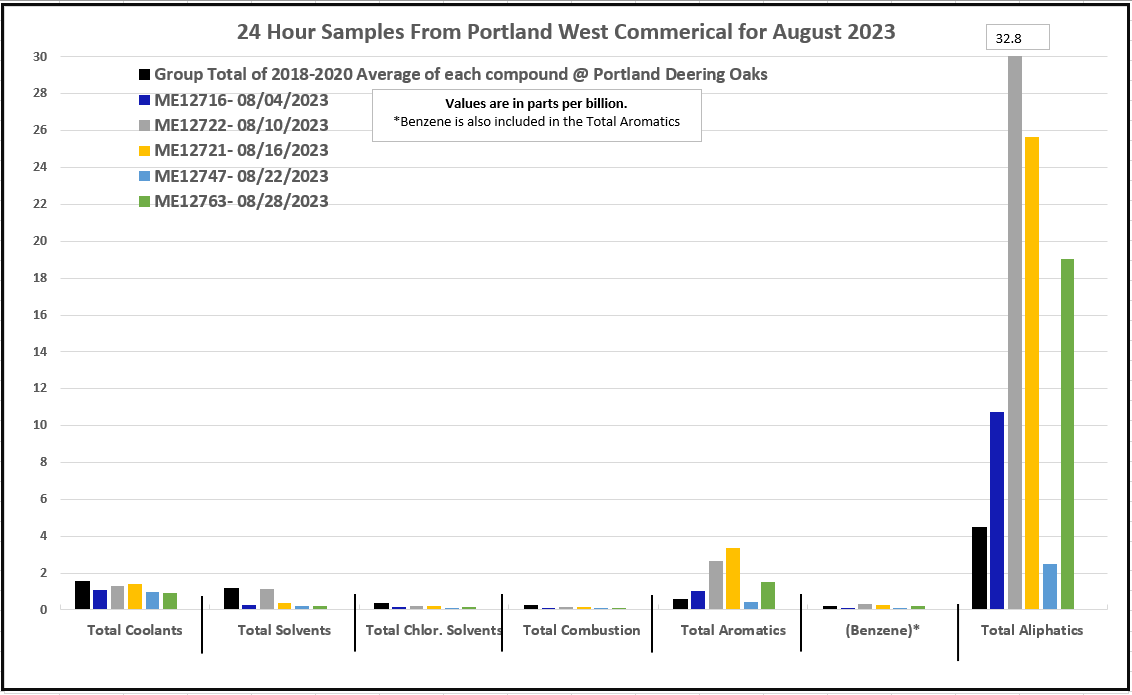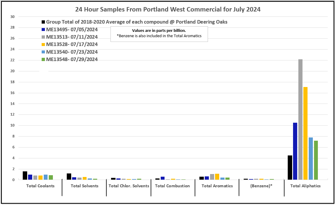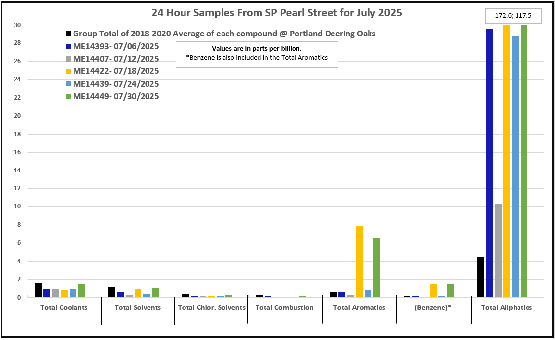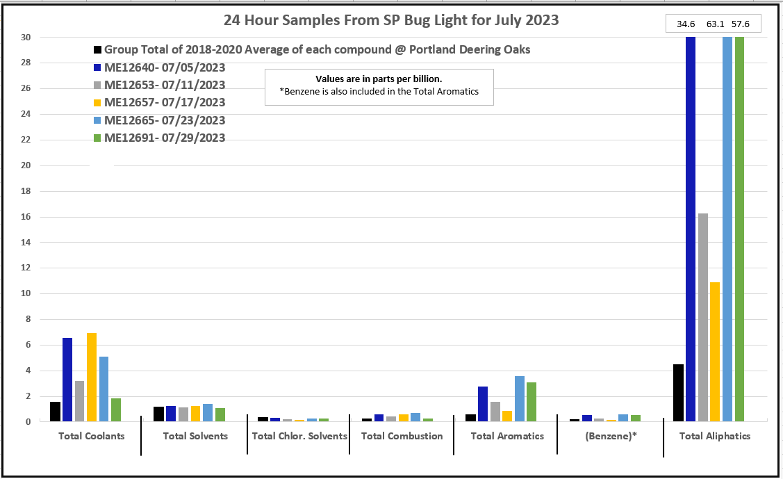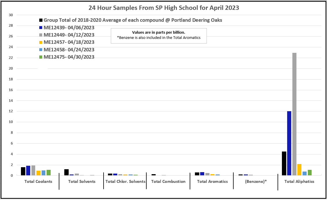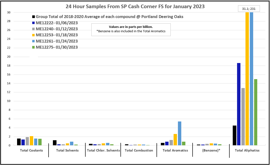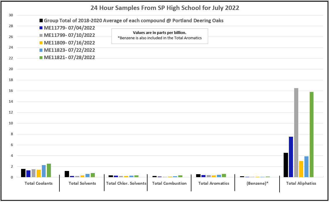 CAUTION to grab sampling data users: It is not appropriate to use grab sample data for any comparison to longer term average (e.g. annual) levels, guidelines or standards for health assessment purposes. Staff from the Maine Center for Disease Control (CDC) gave a presentation (PDF) to the South Portland City Council on November 26, 2019 that describes and illustrates their approach to interpreting this data from a health perspective. The grab sample data charts we’ve created here are intended to simply be a visualization of each sample’s results from an air quality perspective, comparing them to the 2018 annual averages from our Portland Deering Oaks site, which for this purpose are being used as reference or background concentrations for the area.