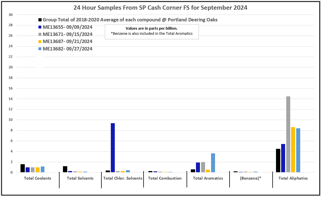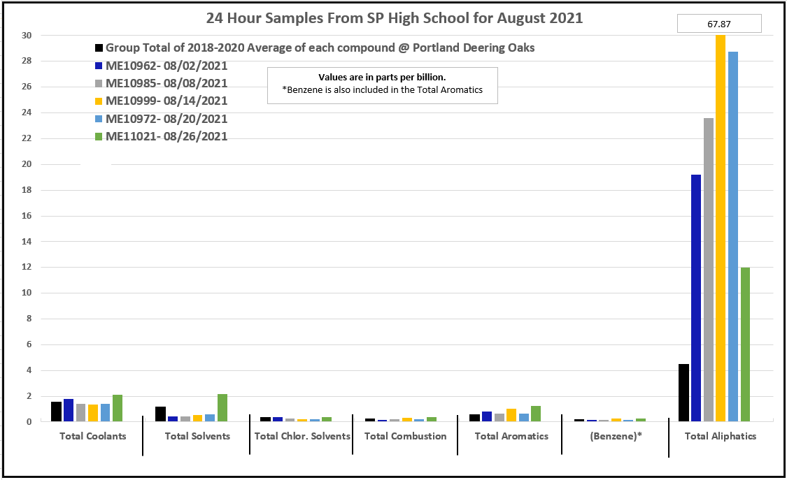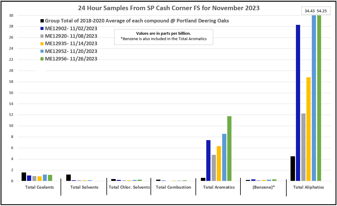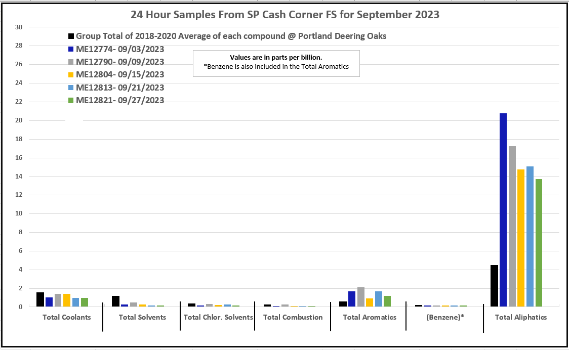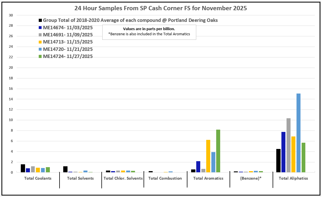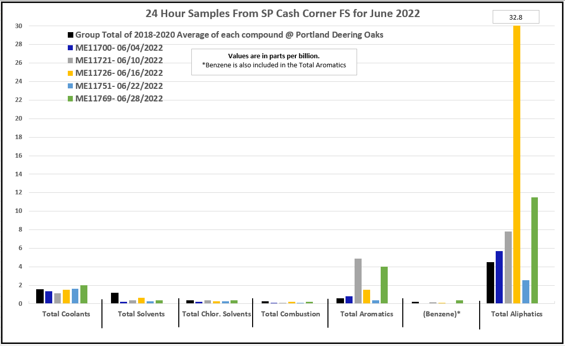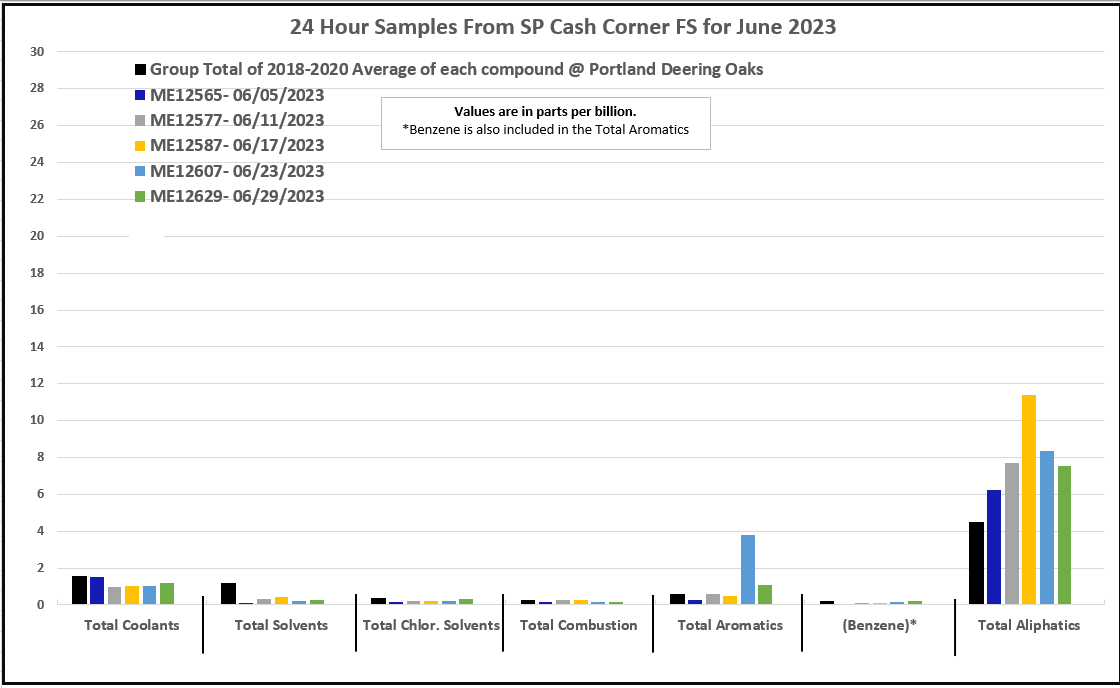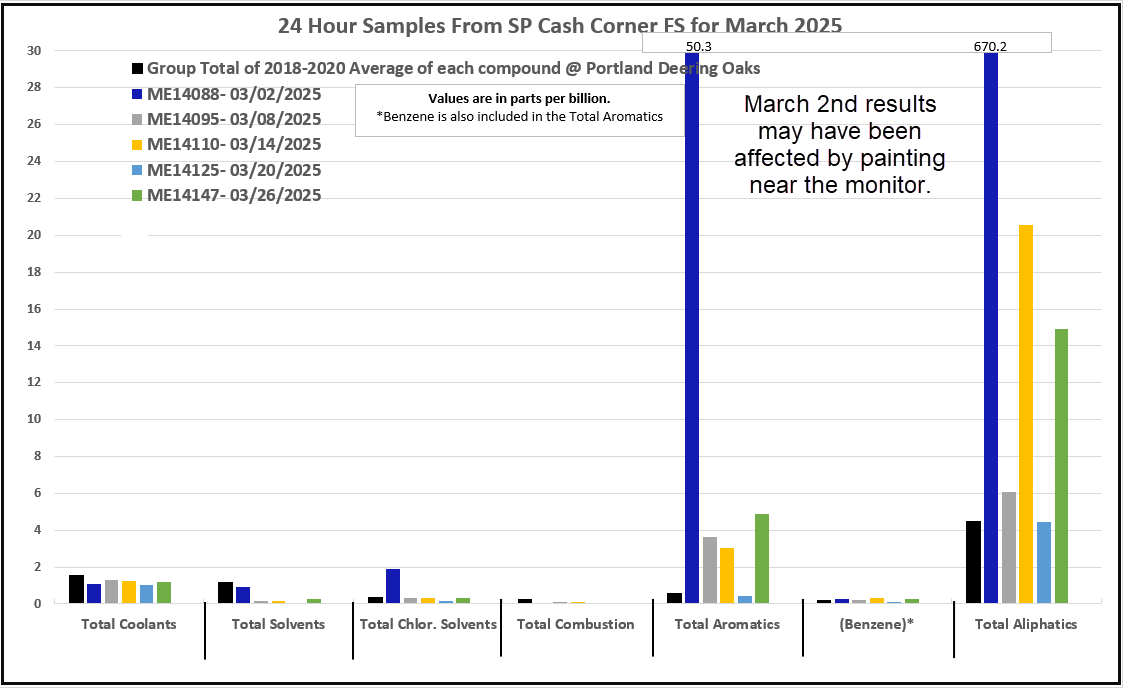CAUTION to grab sampling data users: It is not appropriate to use grab sample data for any comparison to longer term average (e.g. annual) levels, guidelines or standards for health assessment purposes. Staff from the Maine Center for Disease Control (CDC) gave a presentation (PDF) to the South Portland City Council on November 26, 2019 that describes and illustrates their approach to interpreting this data from a health perspective. The grab sample data charts we’ve created here are intended to simply be a visualization of each sample’s results from an air quality perspective, comparing them to the 2018 annual averages from our Portland Deering Oaks site, which for this purpose are being used as reference or background concentrations for the area.