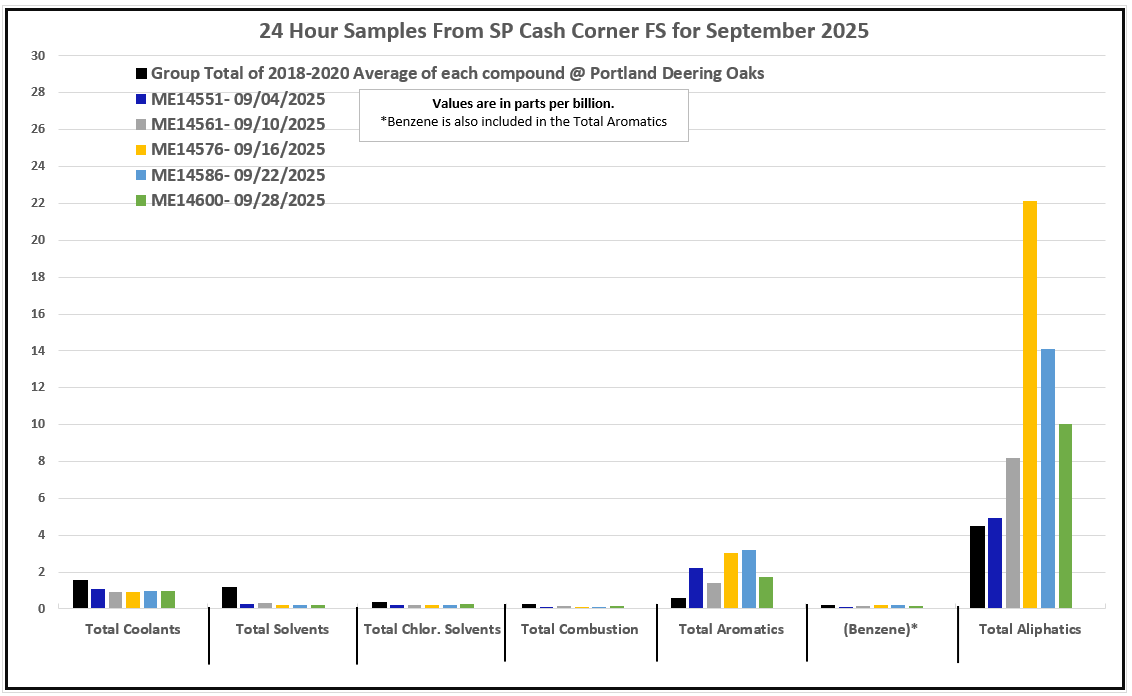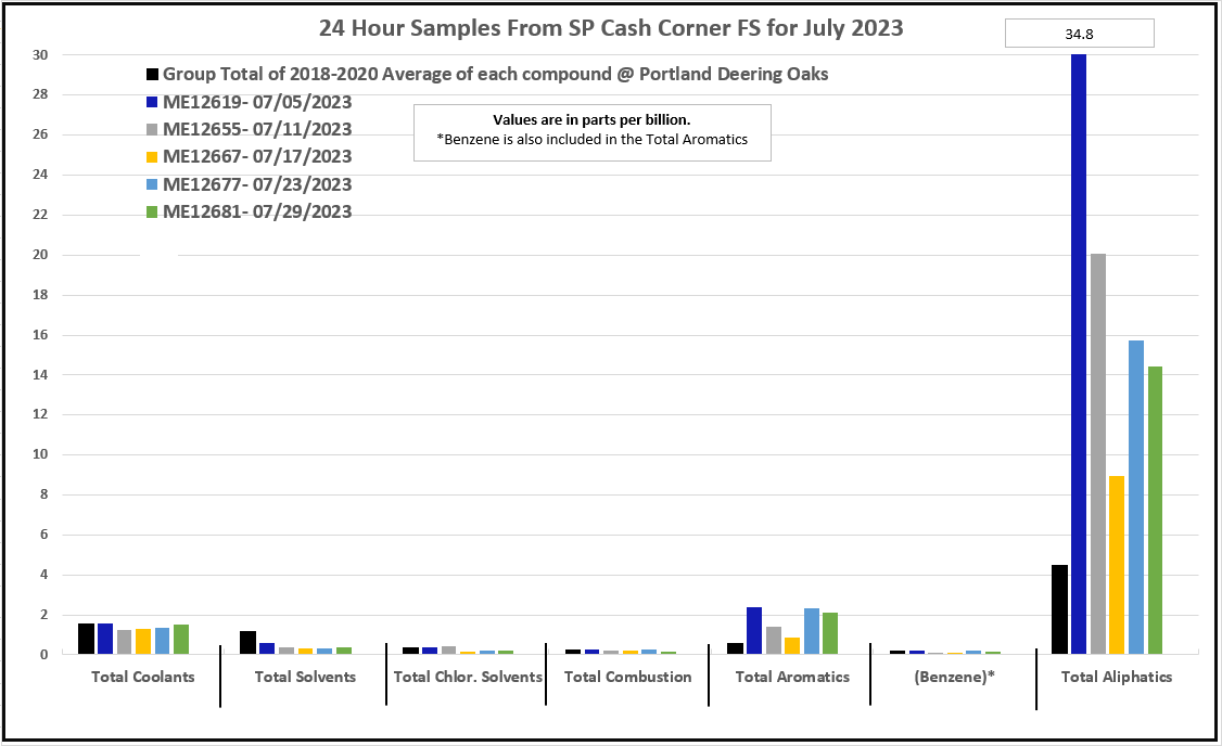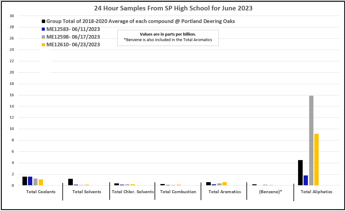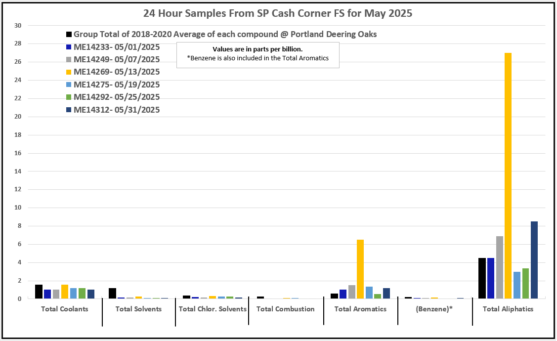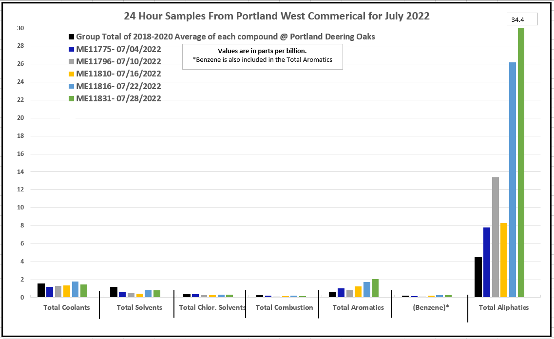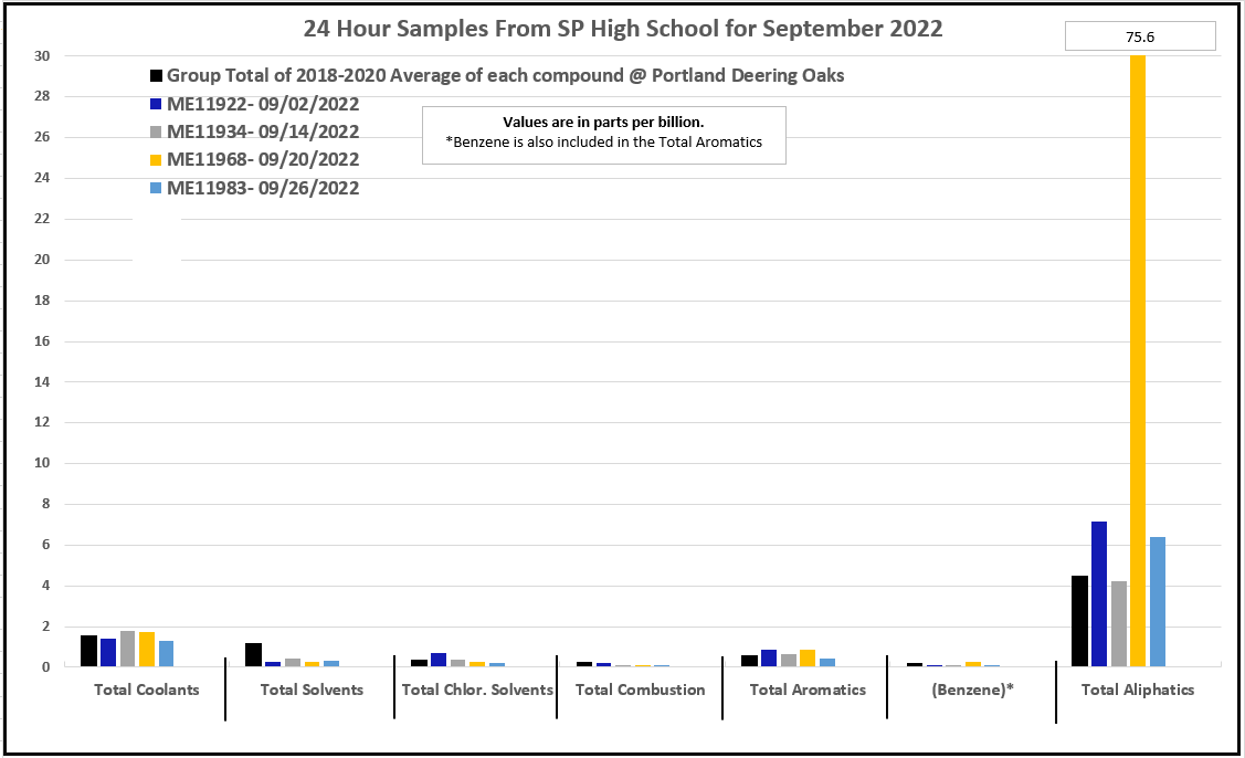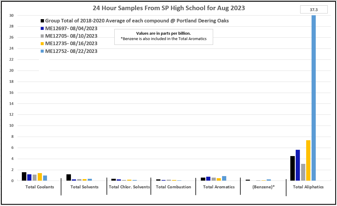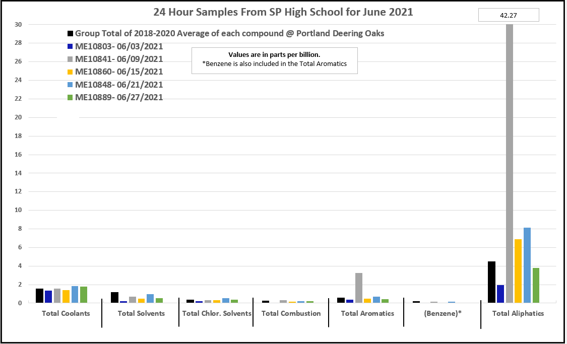 CAUTION to grab sampling data users: It is not appropriate to use grab sample data for any comparison to longer term average (e.g. annual) levels, guidelines or standards for health assessment purposes. Staff from the Maine Center for Disease Control (CDC) gave a presentation (PDF) to the South Portland City Council on November 26, 2019 that describes and illustrates their approach to interpreting this data from a health perspective. The grab sample data charts we’ve created here are intended to simply be a visualization of each sample’s results from an air quality perspective, comparing them to the 2018 annual averages from our Portland Deering Oaks site, which for this purpose are being used as reference or background concentrations for the area.