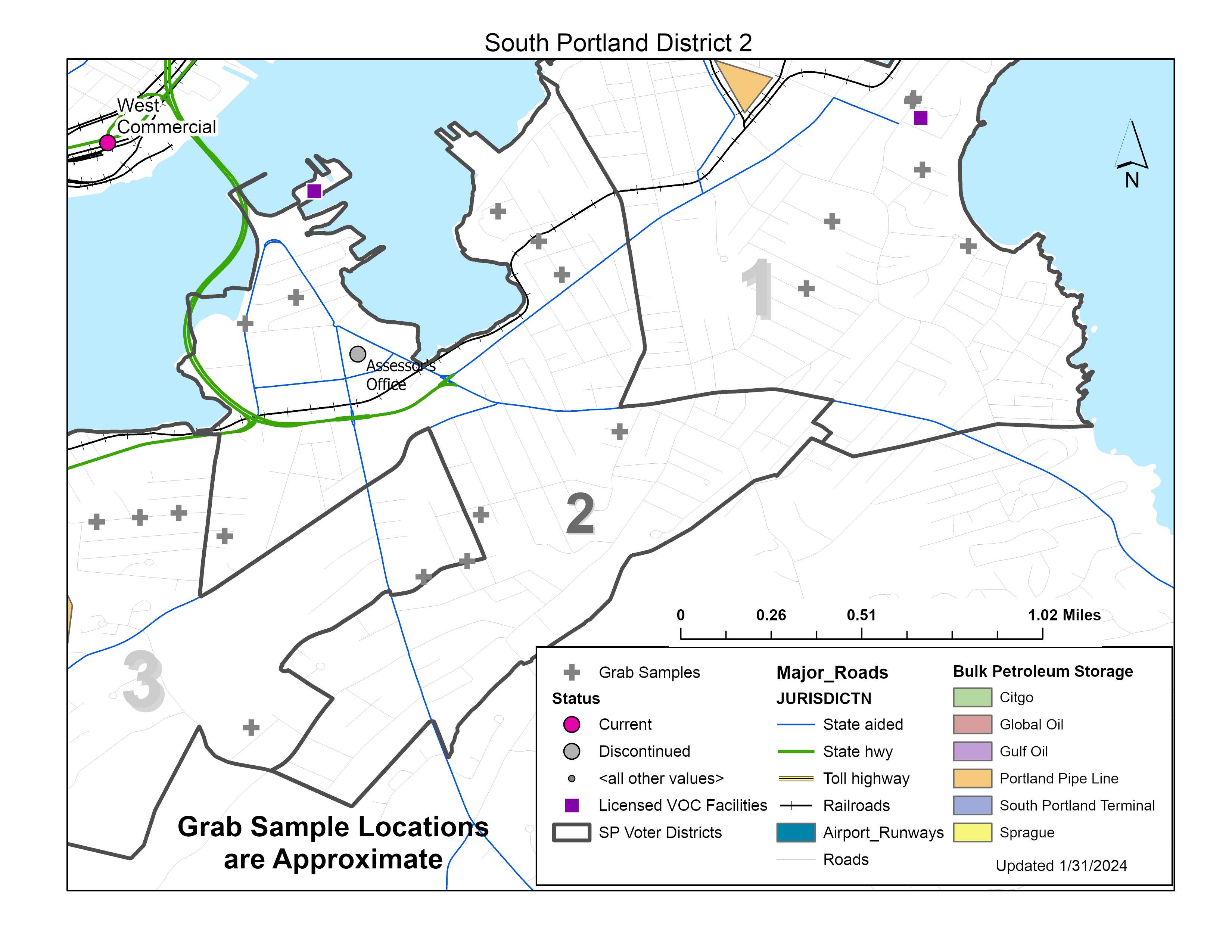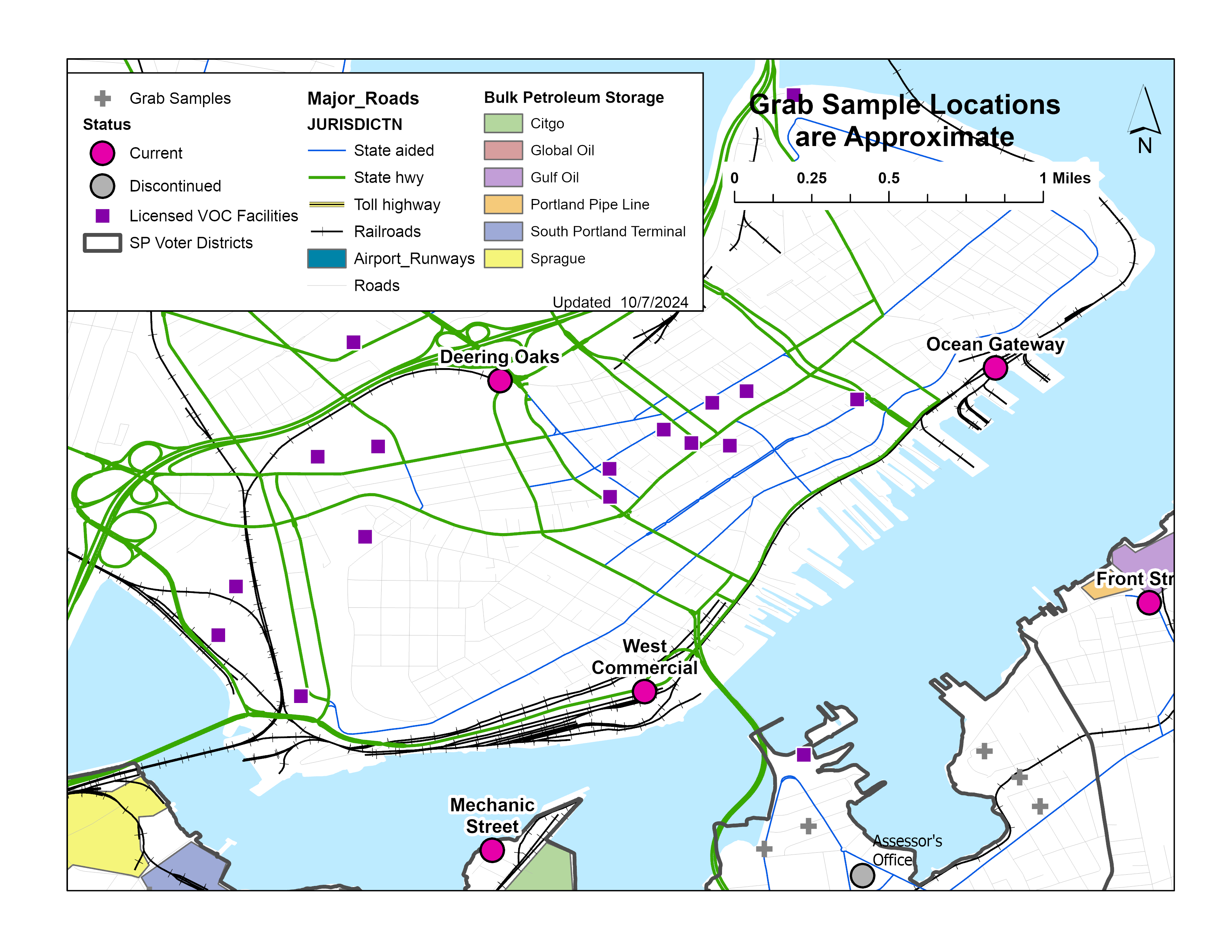 Click on the location map and scroll through "zoomed-in" versions, one for each South Portland district and Portland. The larger scale maps allow us to better depict spatially where a grab sample was taken within each district. While no grab samples were taken in Portland, a zoomed-in map of their 24-hour stationary sampling sites area is provided to help show the proximity of them to the South Portland grab sample locations.