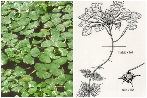 Water Chestnut has submerged leaves that are feather-like in appearance and are oppositely-paired along the stem. The floating leaves are triangular in shape.Its cord-like plant stems can reach lengths of up to 16 feet. Flowers appear in mid to late July, and the plant also produces a horned fruit, the "chestnut".