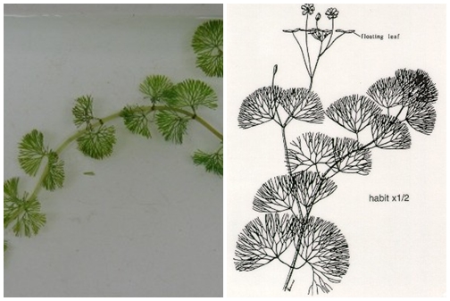 Fanwort is a submerged plant with narrow leaves which resemble a fan arranged on a narrow stem. The majority of the plant is submerged. The small white flowers of fanwort emerge from the waters surface. Also characteristic to fanwort are the small lily-like leaves that float on the surface below the flowers.