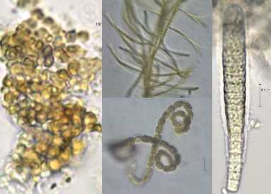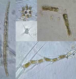 Similar to red algae, green algae are thought to have evolved from a primitive, unicellular organism that engulphed and incorporated a cyanobacteria into its cellular structure. They have a nucleus and and two membranes around their chloroplasts. Green algae are similar to plants because they share similar chloroplast structure, photosynthetic pigments, and metobolic storage products (e.g. starch). As their name implies, most green algae are green but there are exceptions. Different types of green algae may have unicellular, colonial, sheet, or filamentous forms. Some species have complex life cycles. Unlike red algae, there are many types of freshwater green algae in Maine.